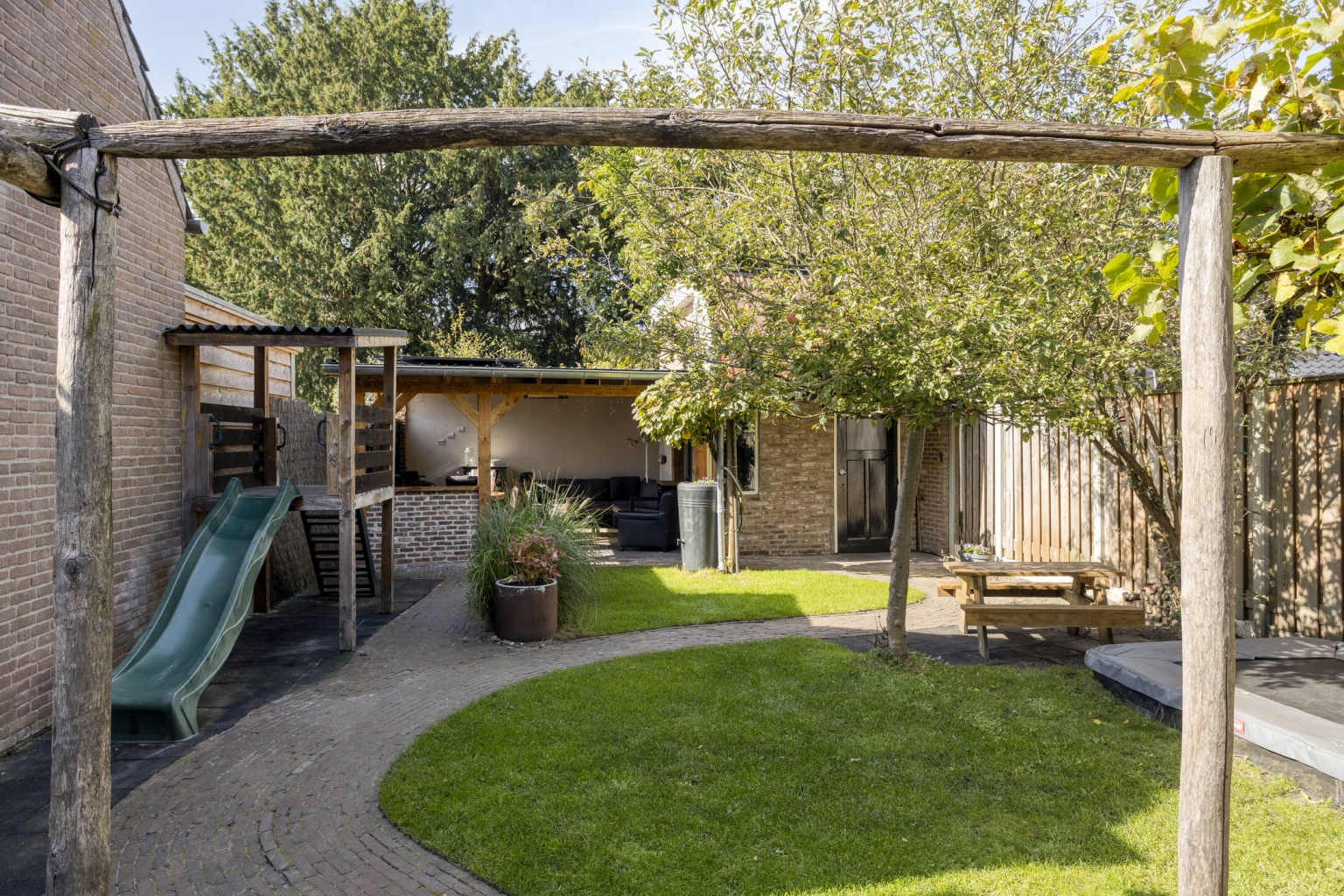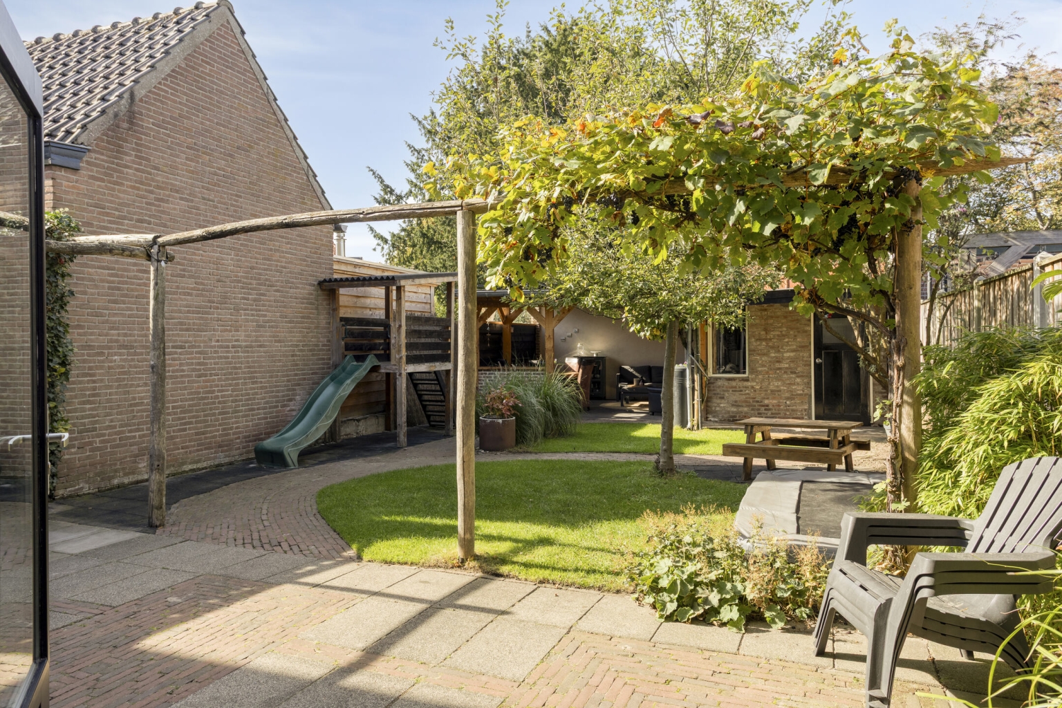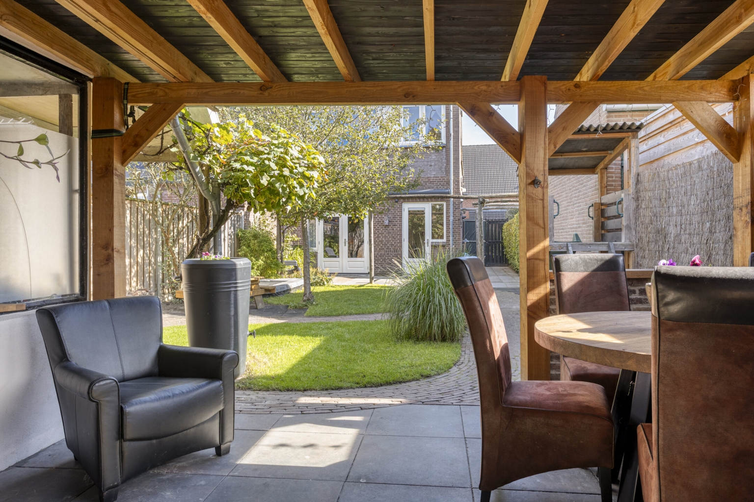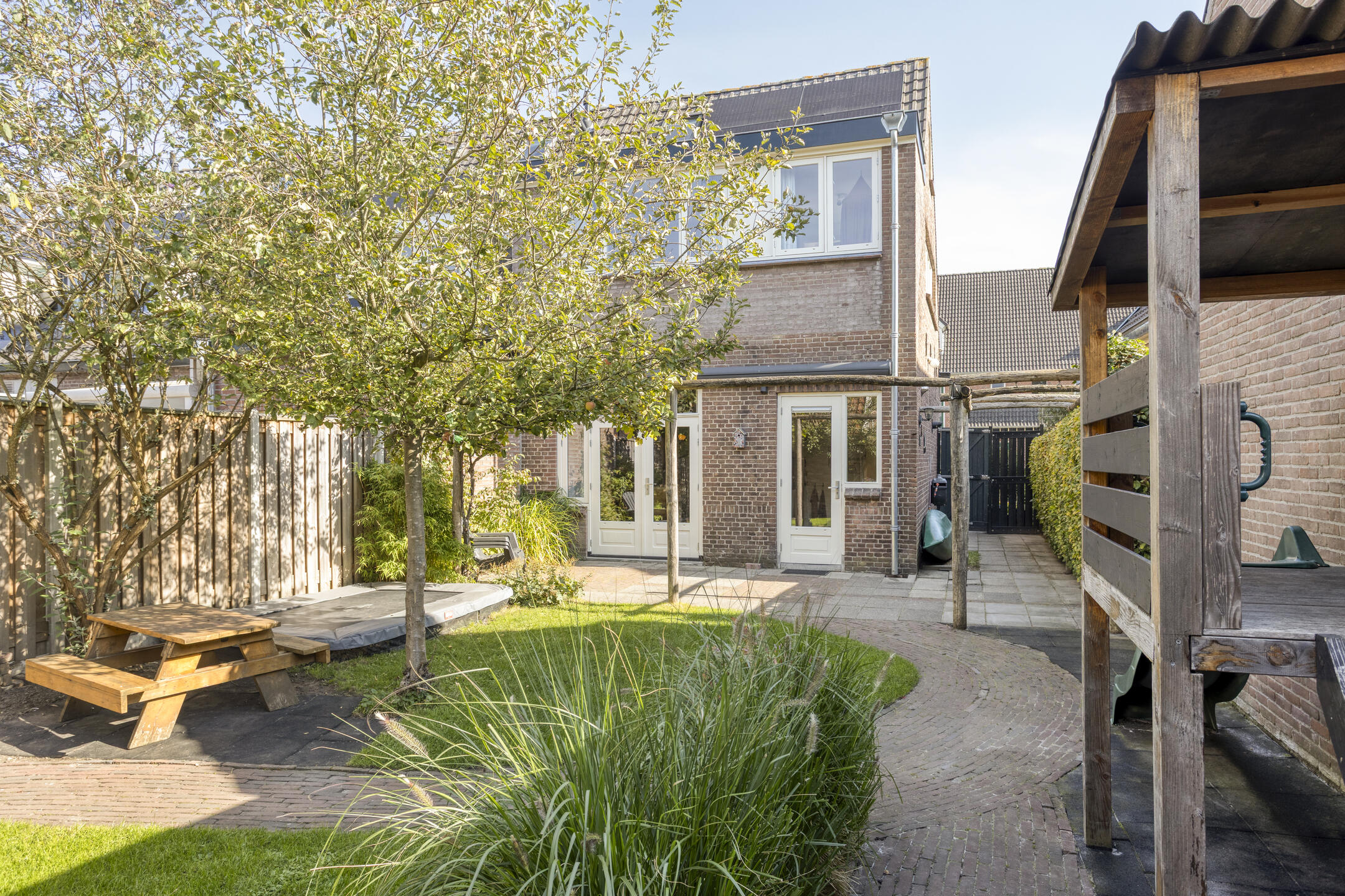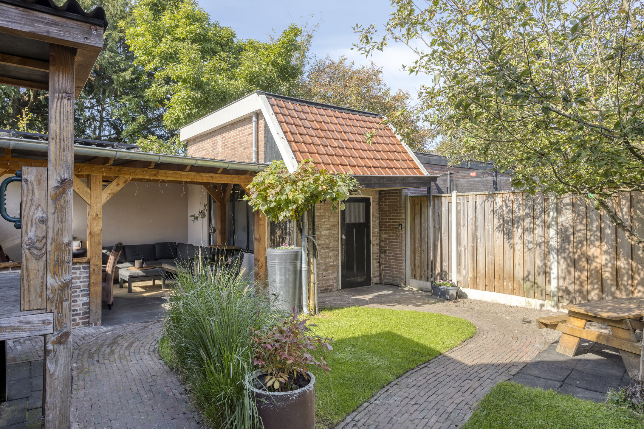 Fraai aangelegde achtertuin op het westen, voorzien van terras met elektrisch zonnescherm aan de achtergevel, gazon, sierbestrating, riante overkapping achterin en een stenen berging met verdieping. De tuin is achterom te bereiken langs de woning. Aan de voorzijde is een nette siertuin aanwezig. Parkeren is mogelijk op de openbare parkeervoorzieningen in de straat.