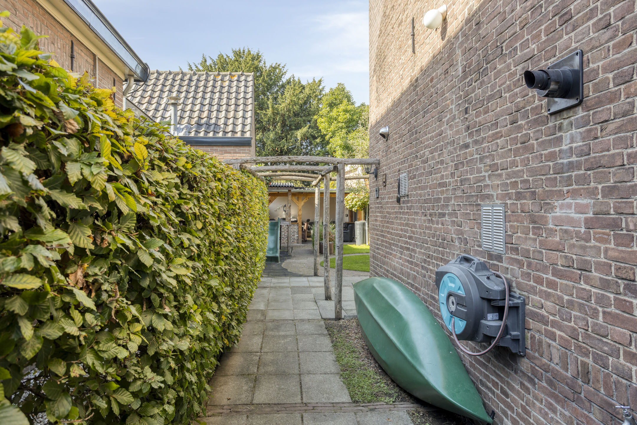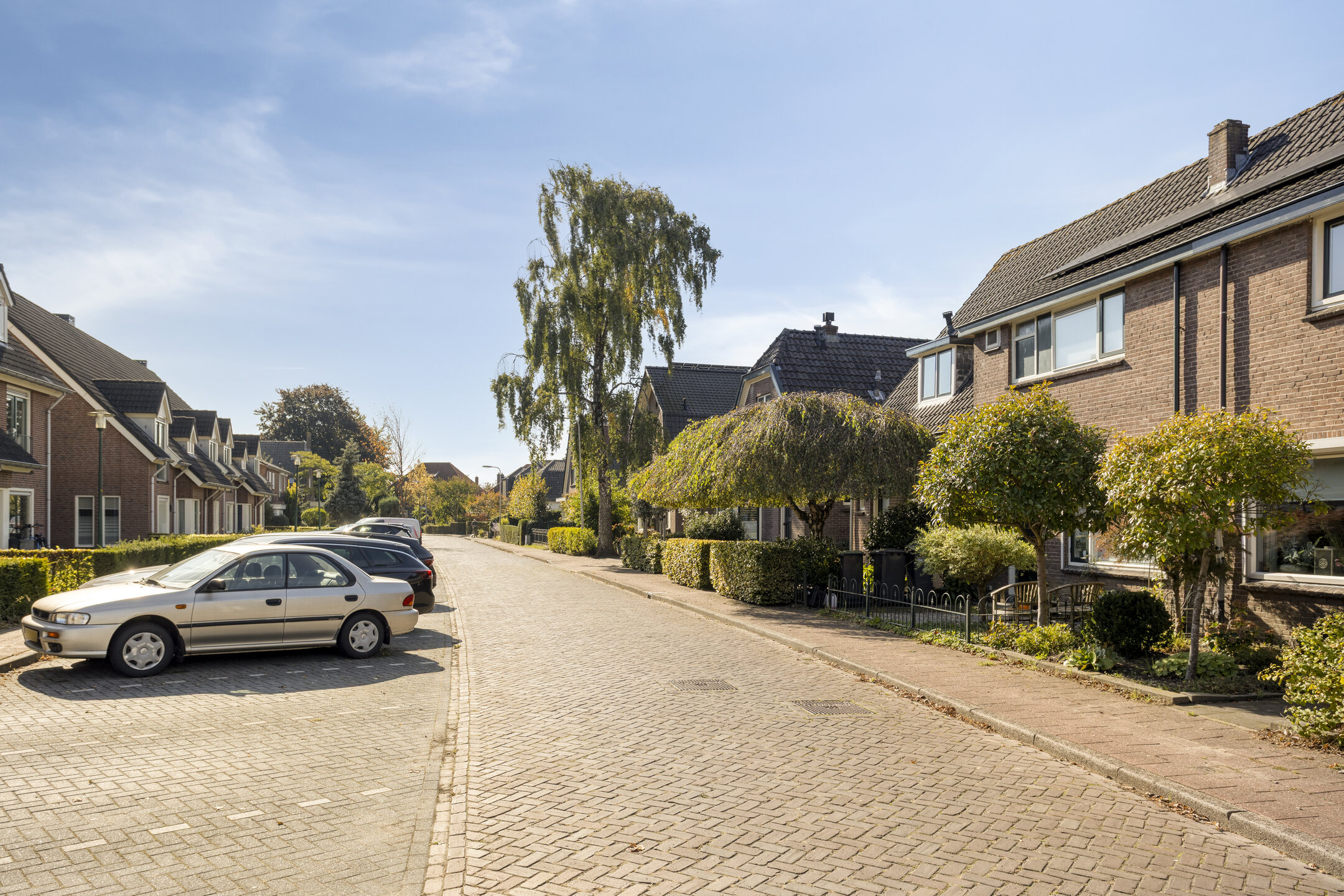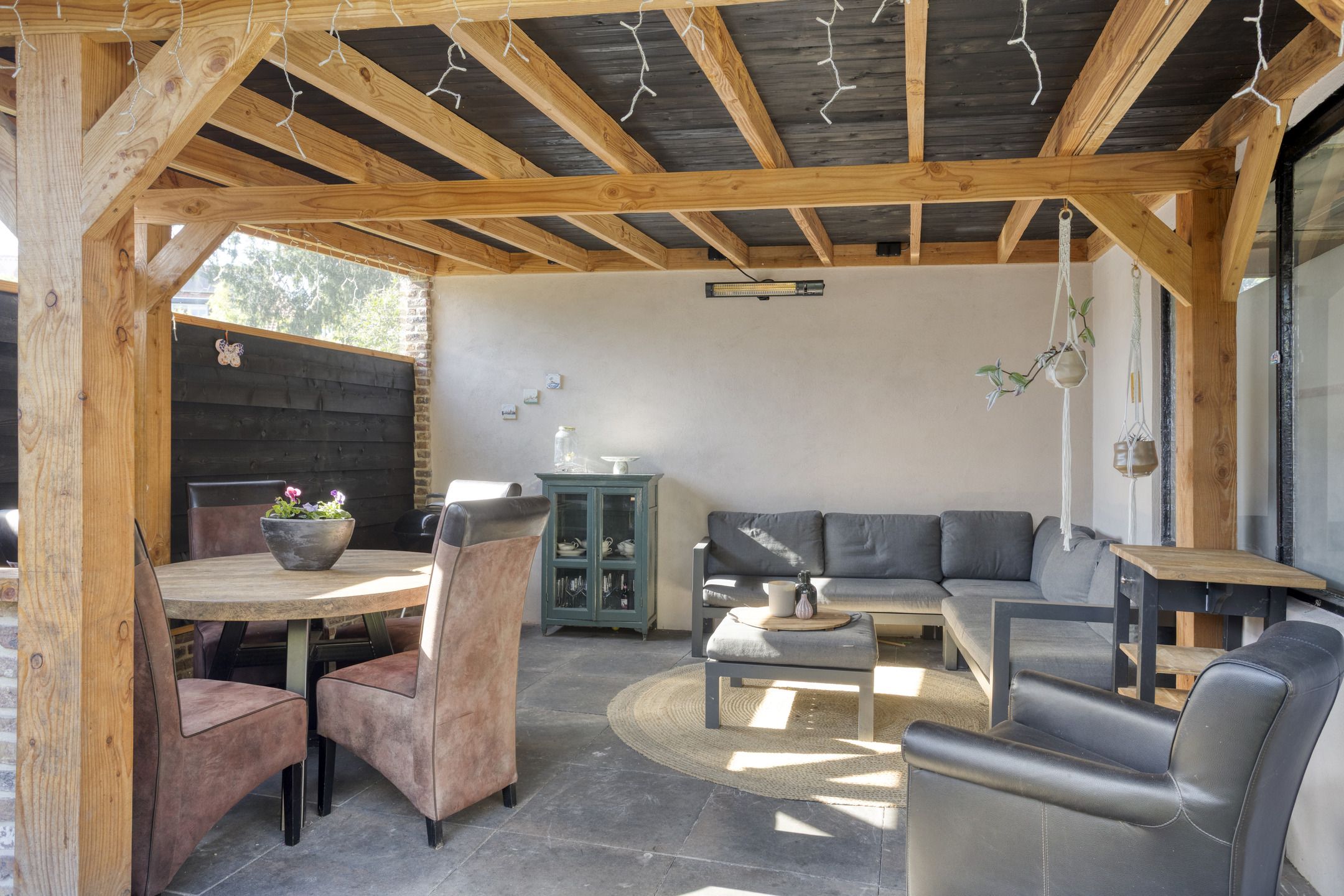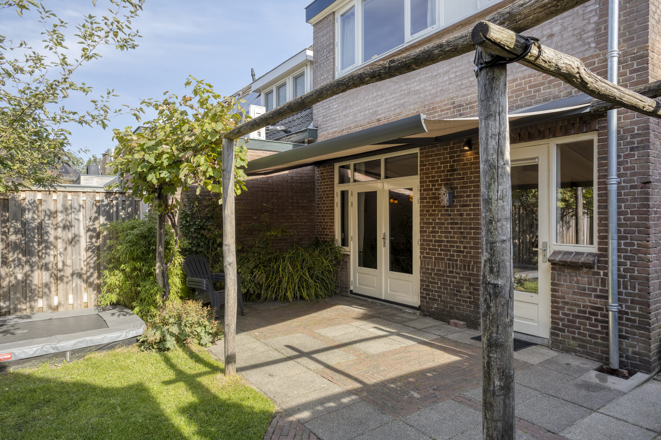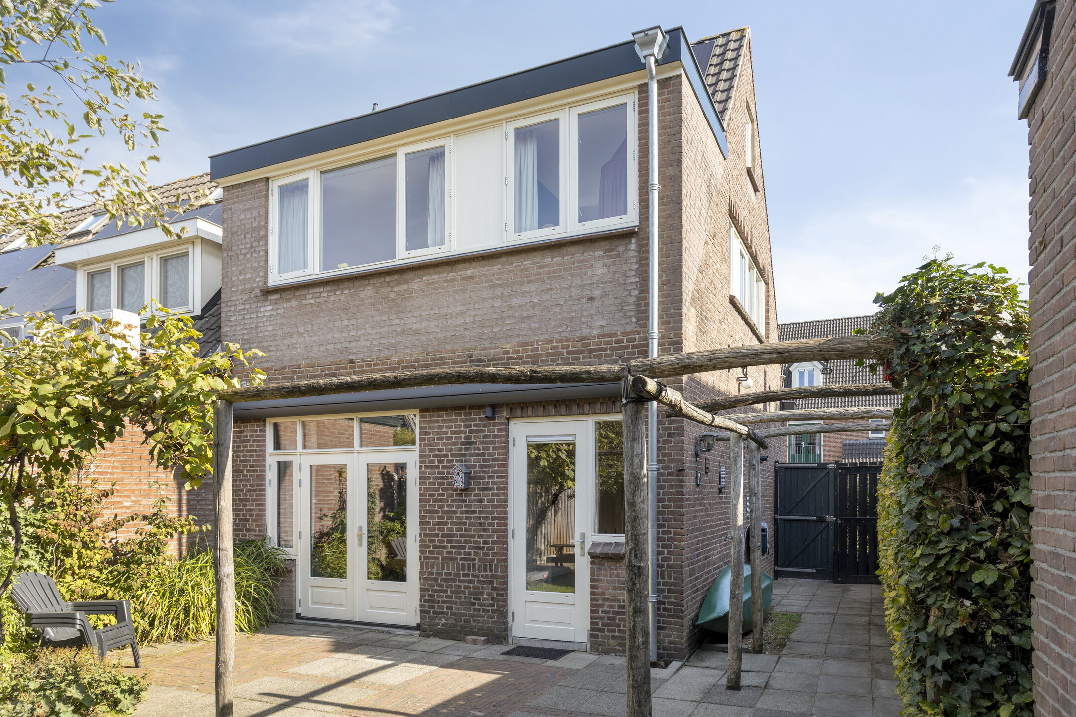 Fraai aangelegde achtertuin op het westen, voorzien van terras met elektrisch zonnescherm aan de achtergevel, gazon, sierbestrating, riante overkapping achterin en een stenen berging met verdieping. De tuin is achterom te bereiken langs de woning. Aan de voorzijde is een nette siertuin aanwezig. Parkeren is mogelijk op de openbare parkeervoorzieningen in de straat.