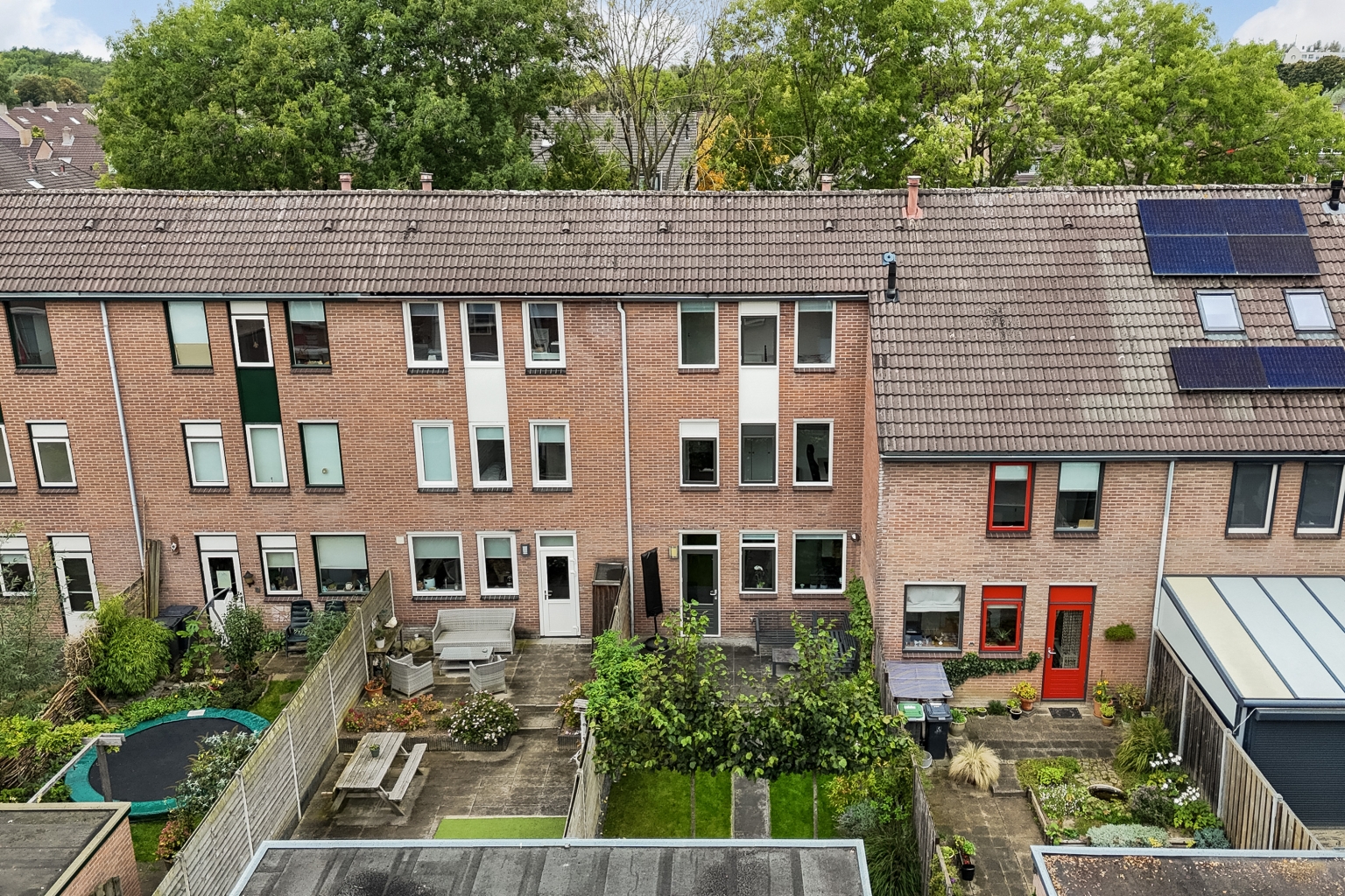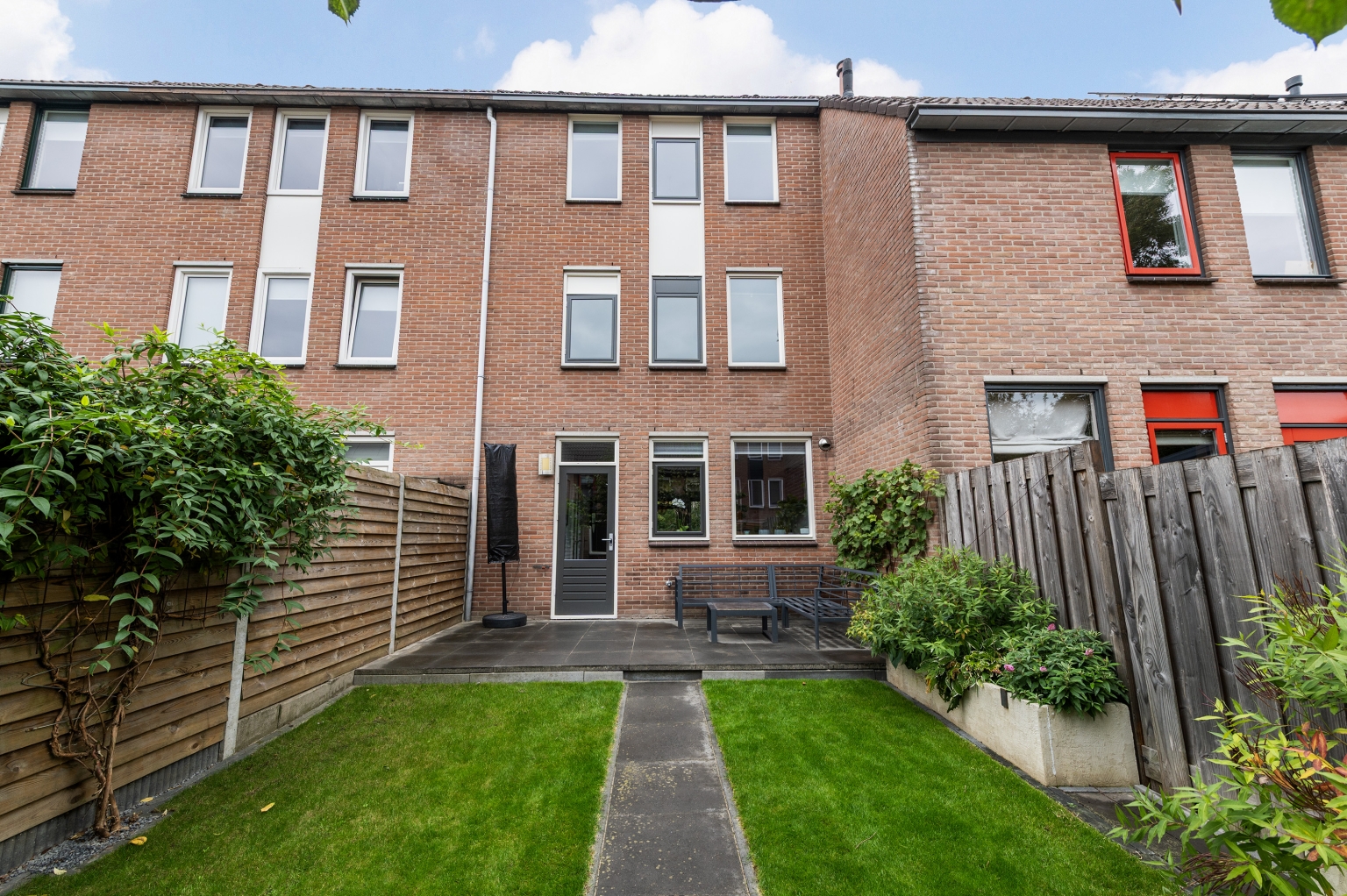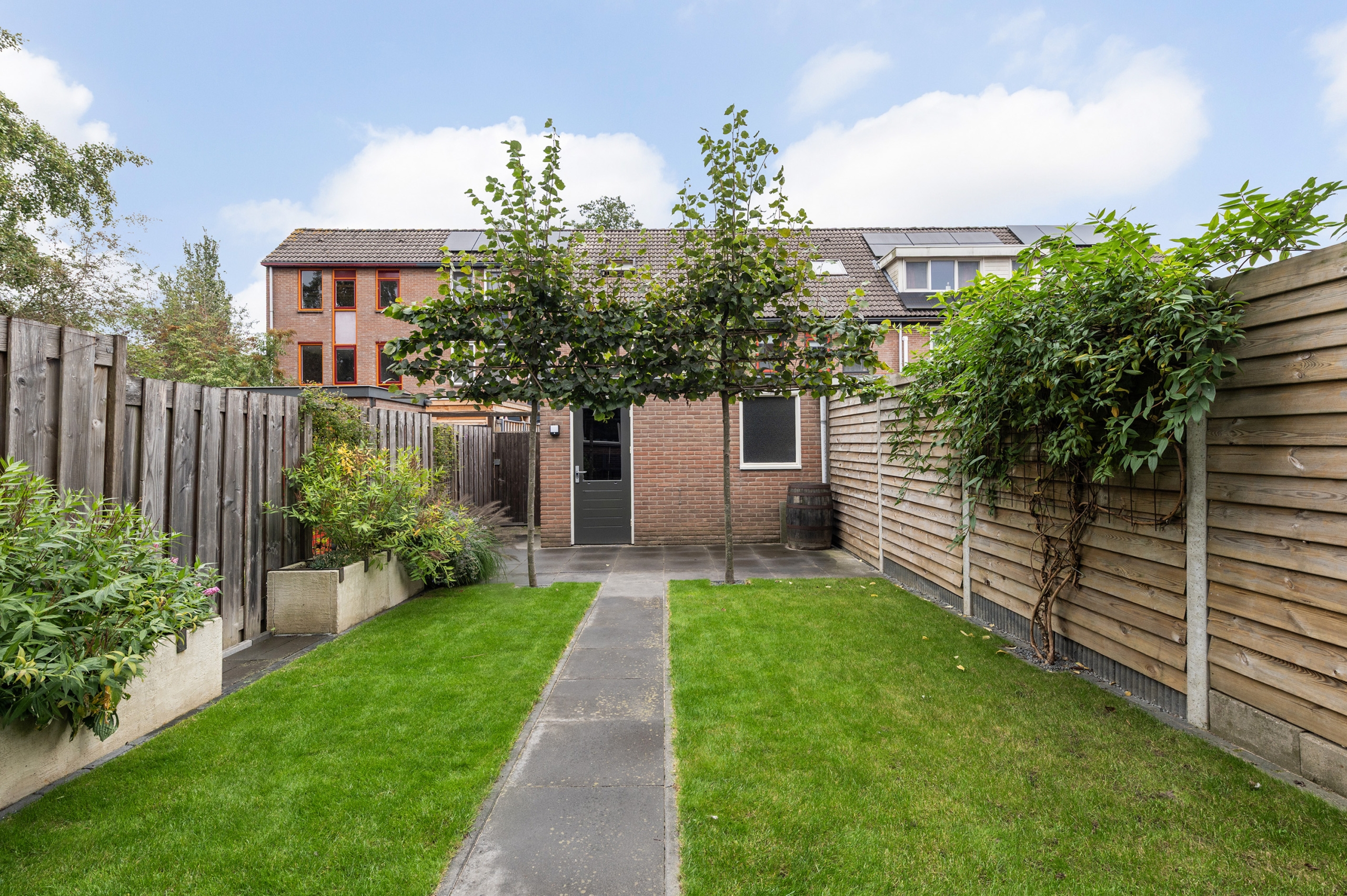 Keurige achtertuin op het oosten met terras aan de achtergevel, leibomen, gazon, stenen berging en achterom. Voortuin met sierbeplanting en looppad naar de entree. Parkeren is mogelijk op de openbare parkeervoorzieningen in de straat.
