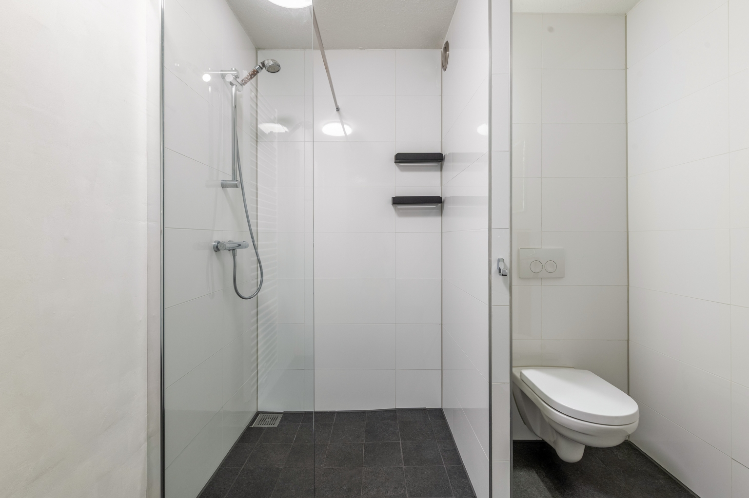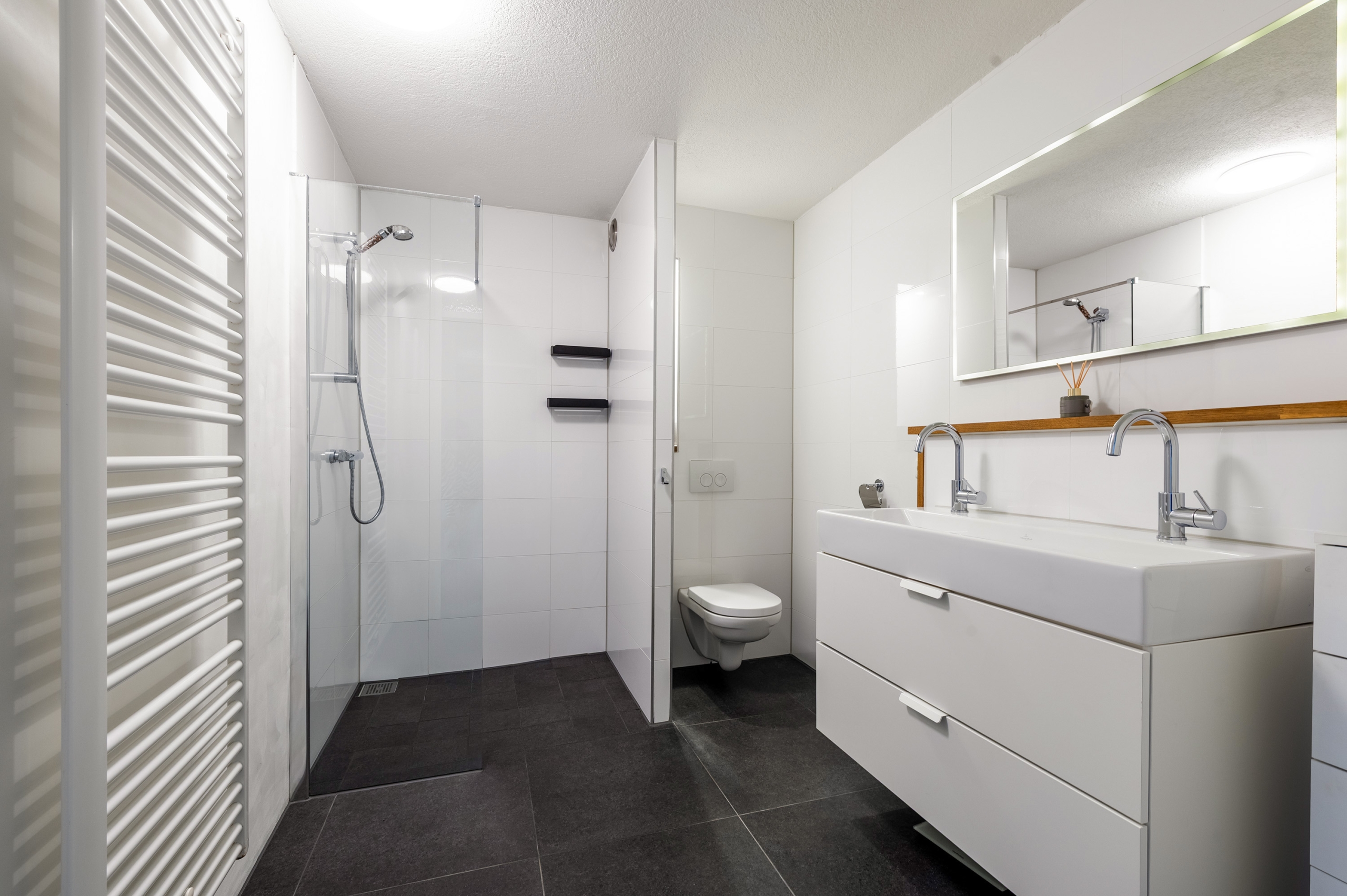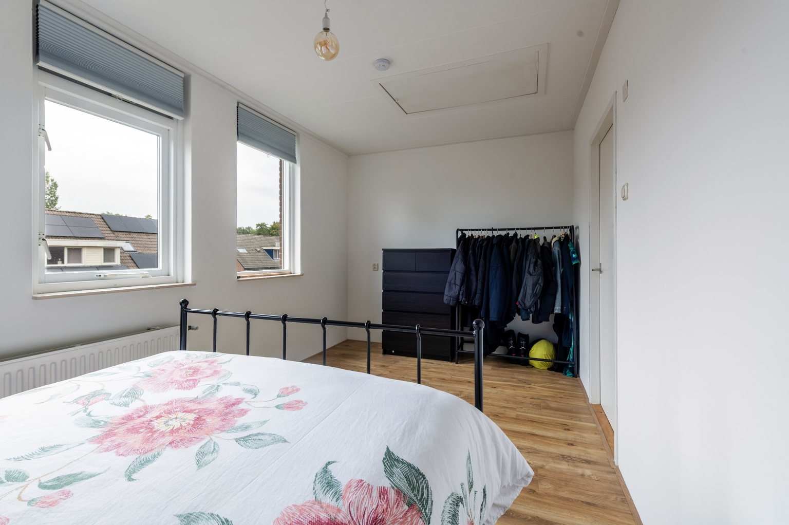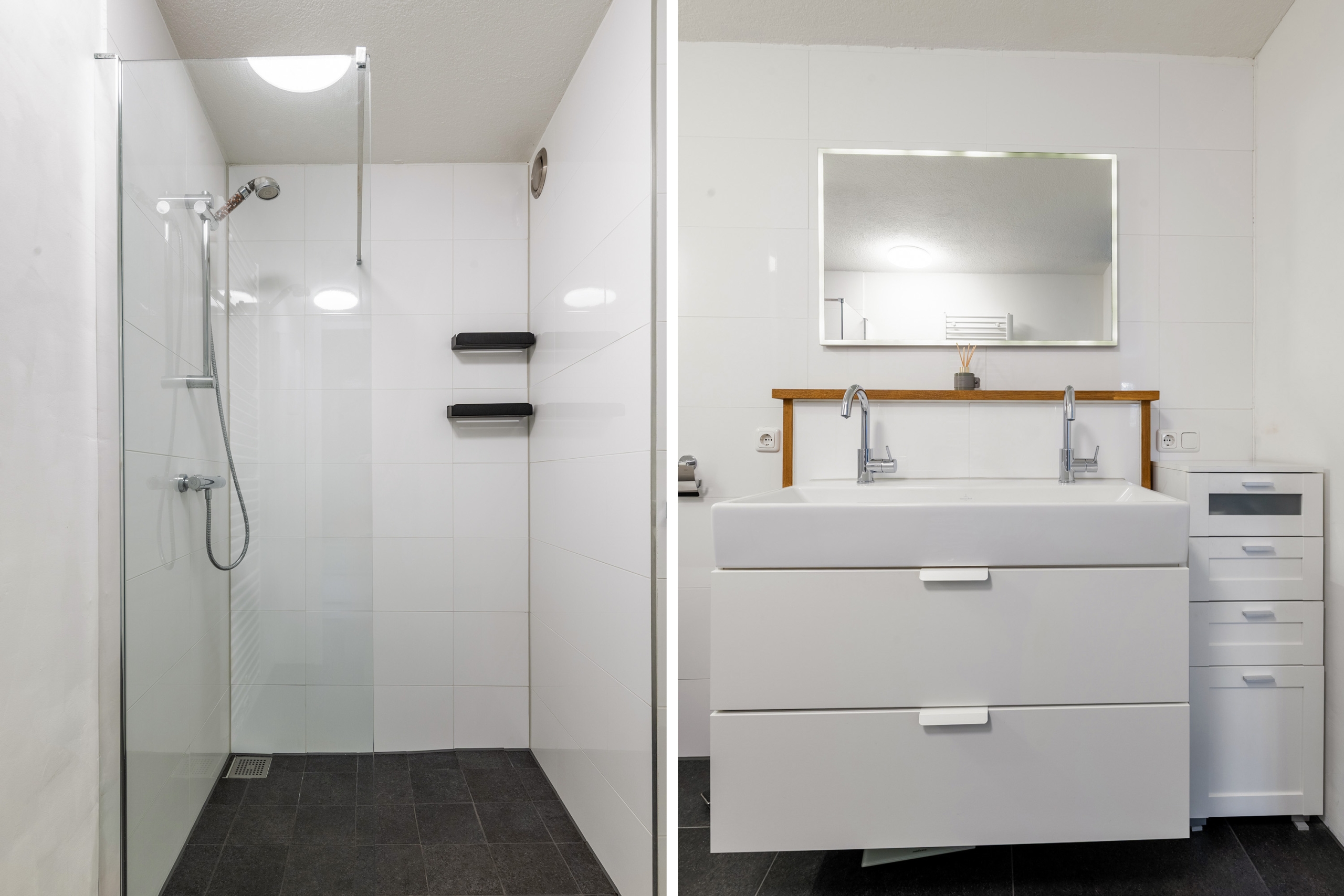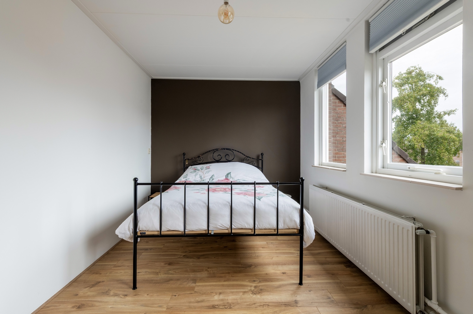 1e Verdieping: overloop. Twee ruime slaapkamers ter grootte van circa 15 m² en 14 m², beide keurig afgewerkt en voorzien van laminaatvloer. Strak afgewerkte badkamer met ruime inloopdouche, wandcloset, wastafelmeubel en handdoeken radiator.