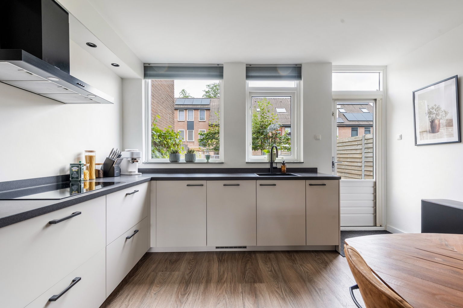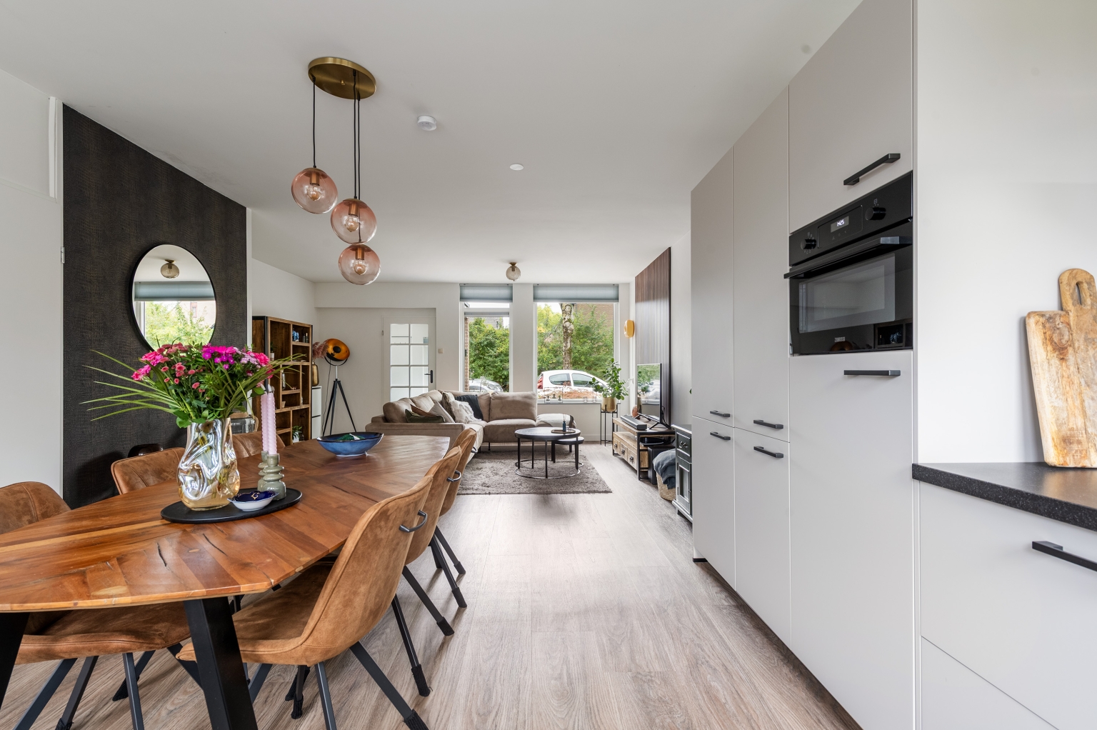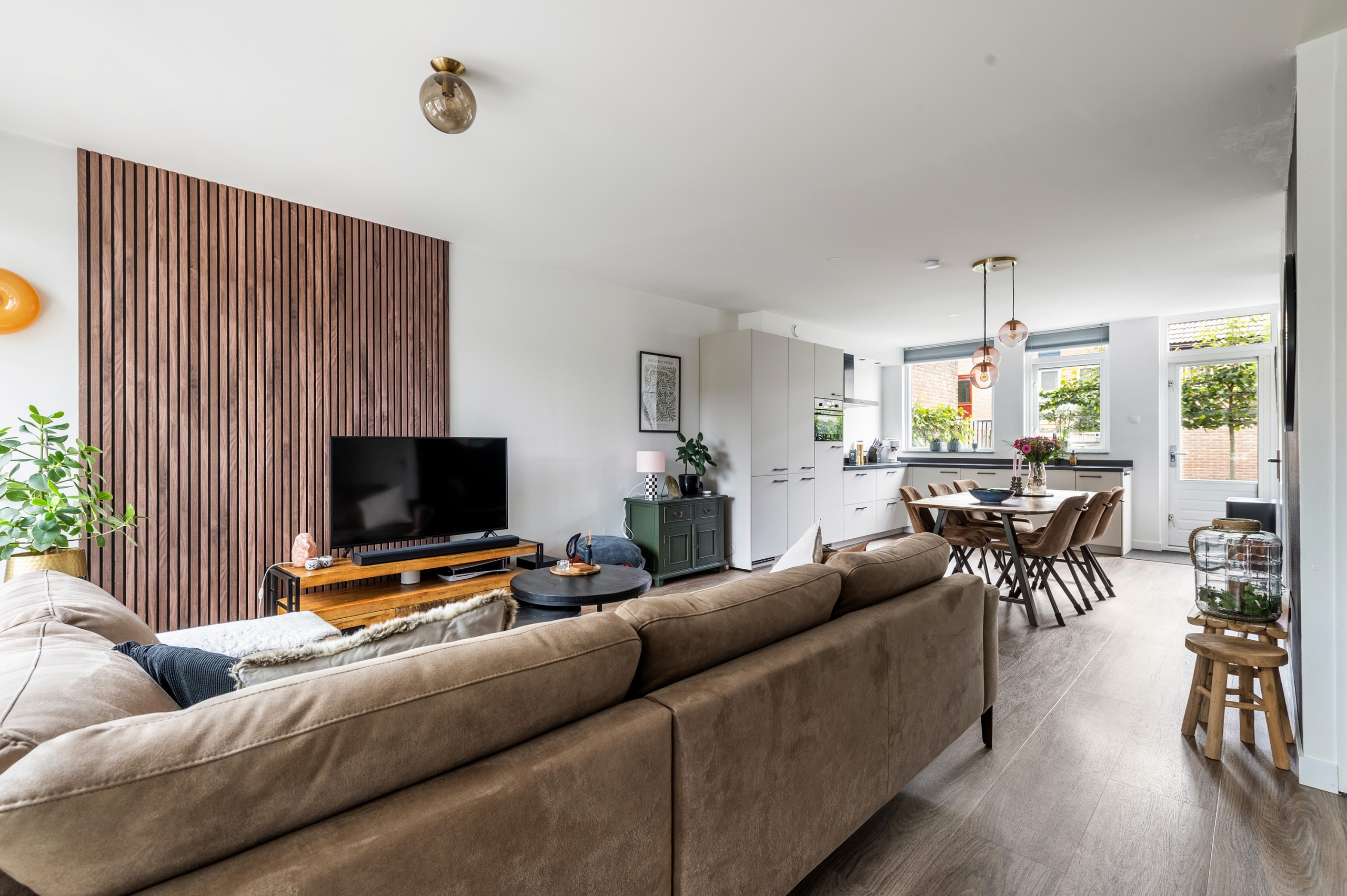 Begane grond: entree met meterkast. Keurig afgewerkte woonkamer voorzien van wandpanelen, trapkast en deur naar de trapopgang. Riante open keuken in L-opstelling met ruimte voor grote eettafel, voorzien van natuurstenen werkblad, koelkast, vriezer, inductiekookplaat, afzuigkap, combi-oven, quooker, vaatwasser en deur naar de achtertuin. Deze ruimtes zijn voorzien van PVC-vloer met vloerverwarming. Tussenhal met toegang tot het toilet voorzien van wandcloset en fonteintje.