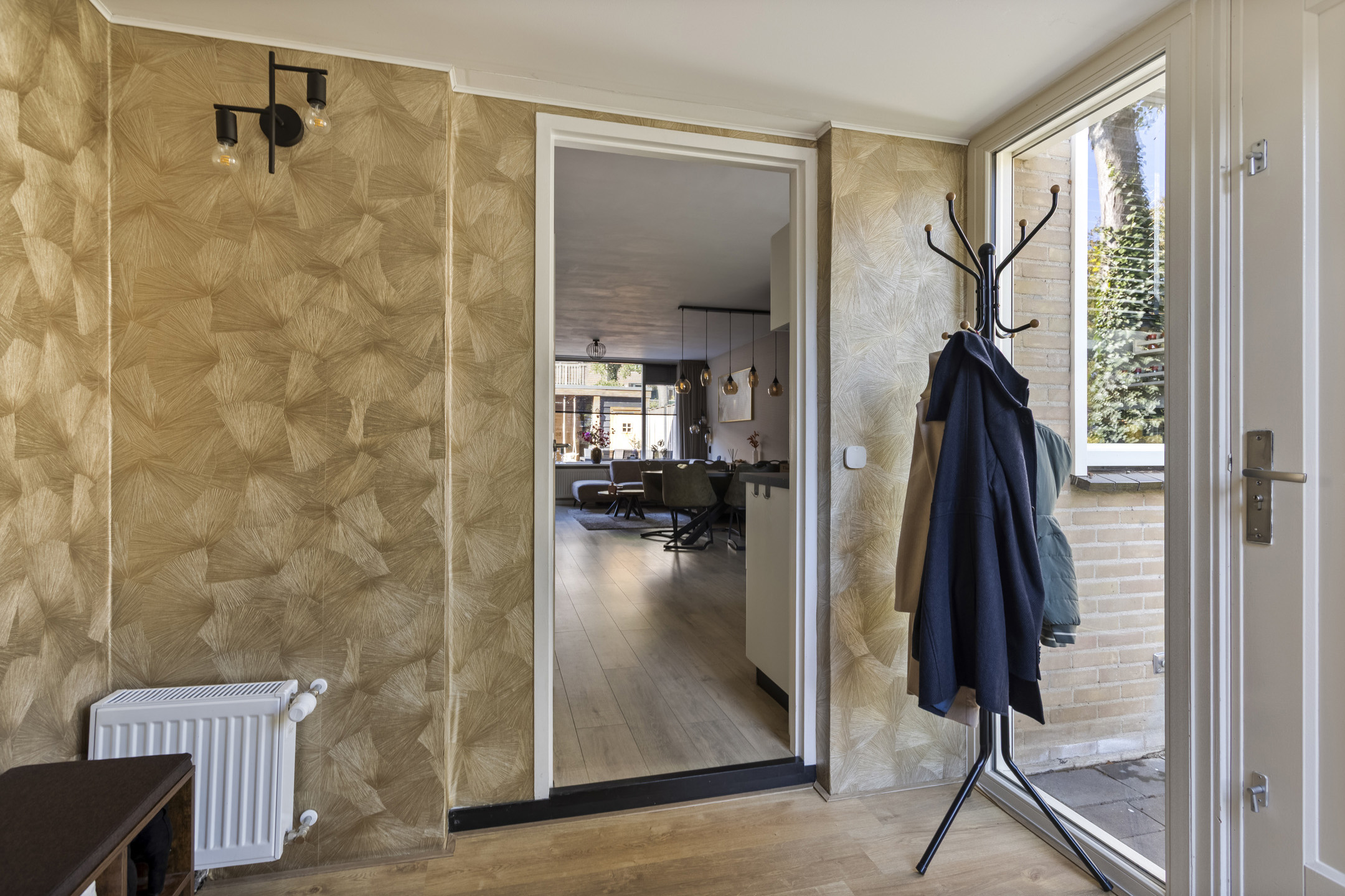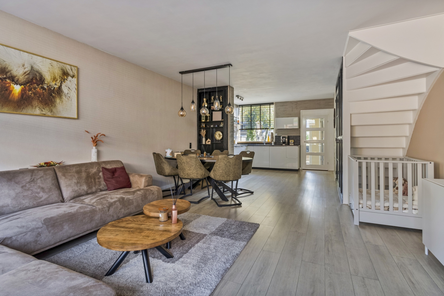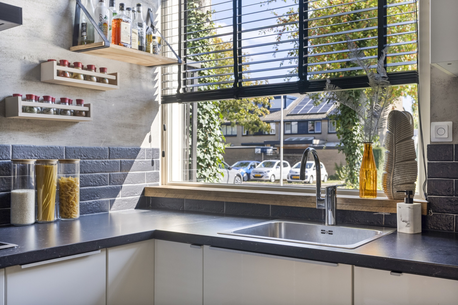 Begane grond: entree, ruime hal met toegang tot de berging/bijkeuken. Keurig afgewerkte, tuingerichte woonkamer voorzien van laminaatvloer. Moderne keuken in L-opstelling, voorzien van 5-pits gaskookplaat, afzuigkap, vaatwasser en close-in boiler. Tussenhal met trapopgang naar de 1e verdieping en toilet voorzien van wandcloset.
