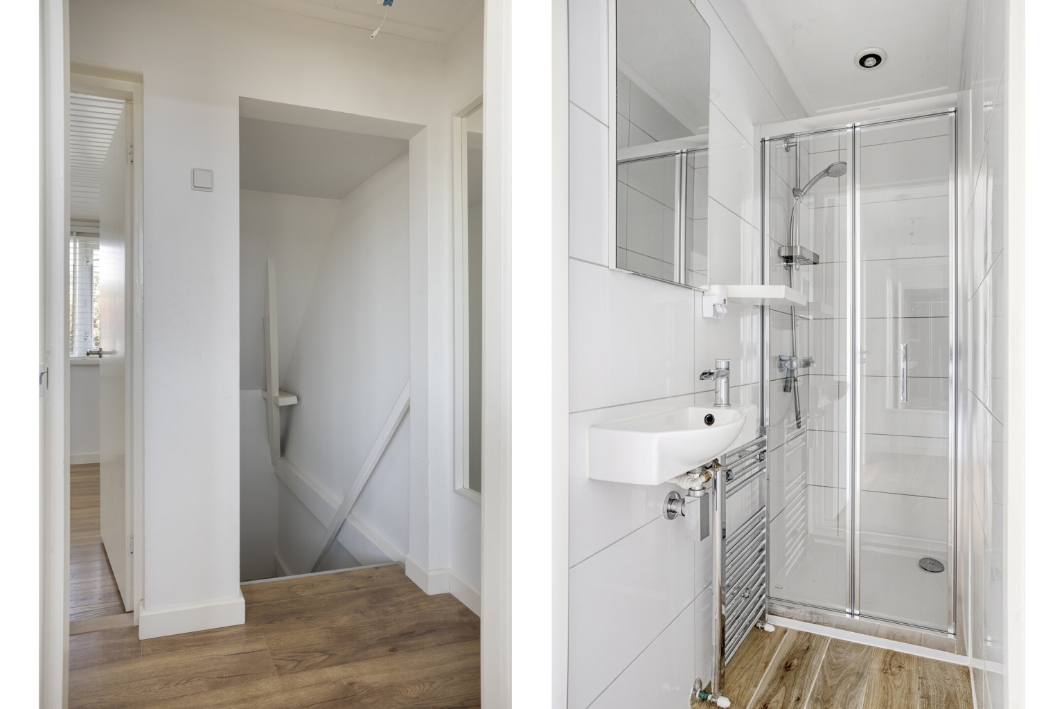 1e Verdieping: overloop. Twee nette slaapkamers ter grootte van circa 7 m² en 10 m², beide voorzien van dakkapel. Compacte badkamer met wastafel en douche.
