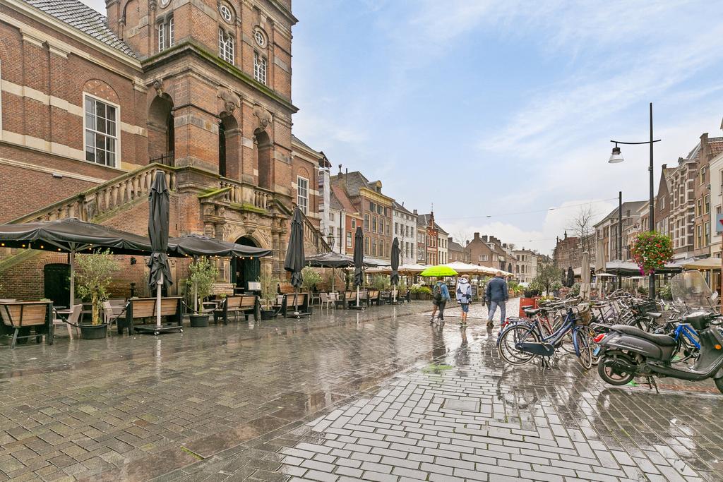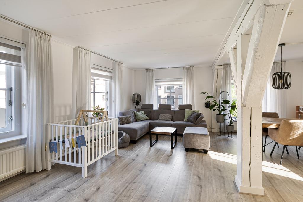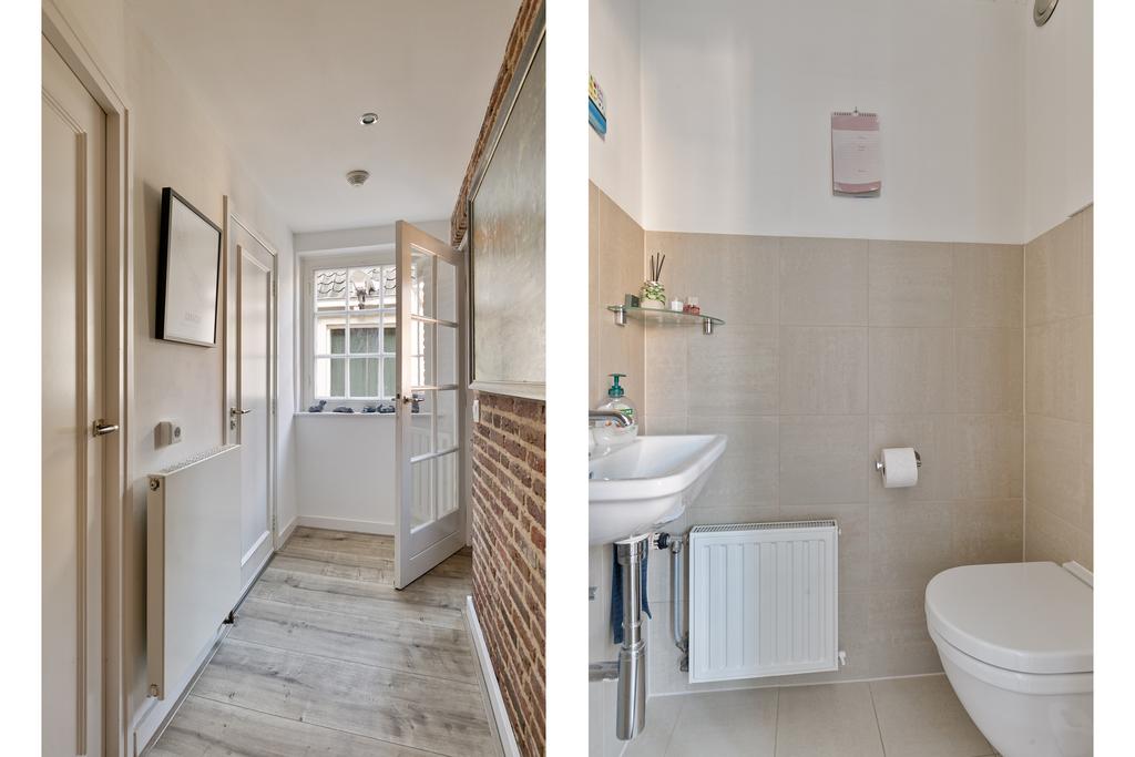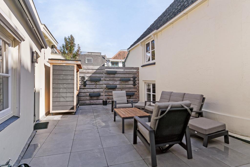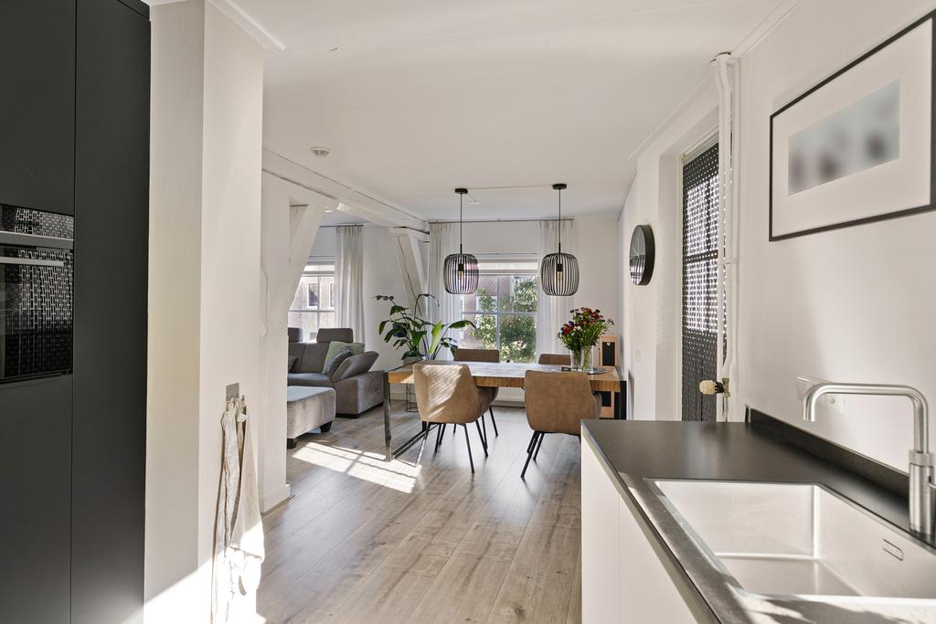 1e Verdieping: entree, hal met toegang tot het trappenhuis, garderobe en toilet voorzien van wandcloset en fonteintje. Fraai afgewerkte en lichte woonkamer met oude balken in het zicht. Luxe half open keuken voorzien van inductiekookplaat met afzuigkap, stoomoven, combi-oven, koelkast, vriezer, vaatwasser, Quooker en composiet aanrechtblad. Ruime slaapkamer ter grootte van circa 19,5 m², voorzien van vaste kasten. Badkamer voorzien van inloopdouche, dubbel-wastafelmeubel en wasmachine- en drogeraansluiting. Vanuit de woonkamer is het maar liefst 45 m² ruime dakterras te bereiken, wat een heerlijk rustig buiten biedt middenin de stad!