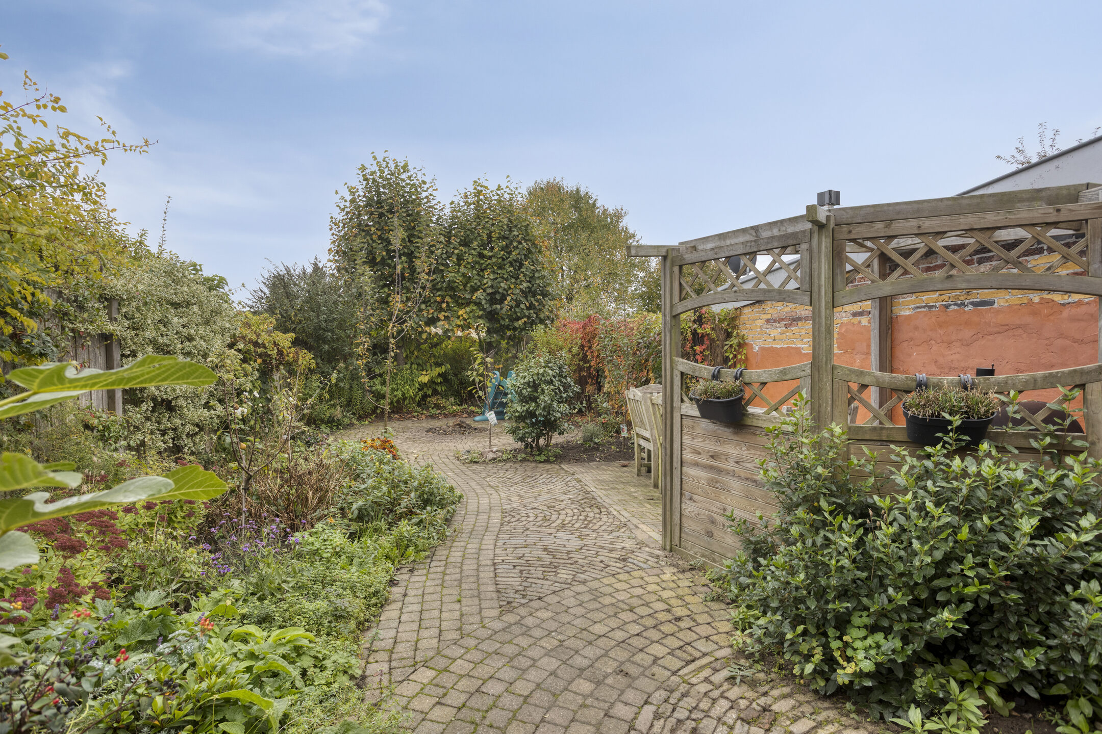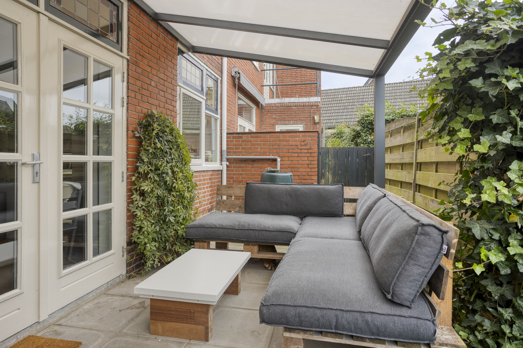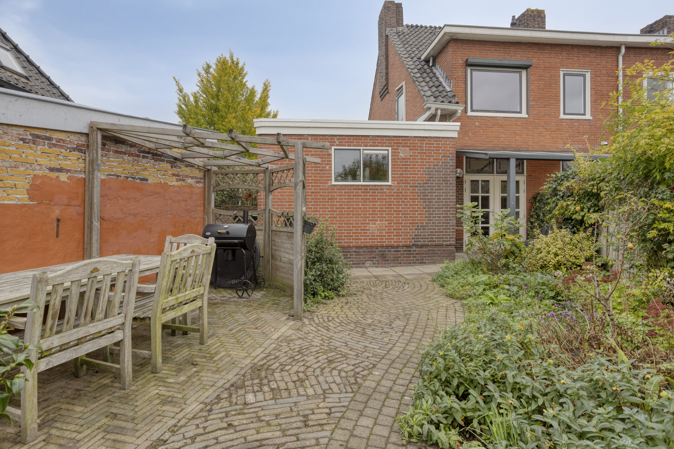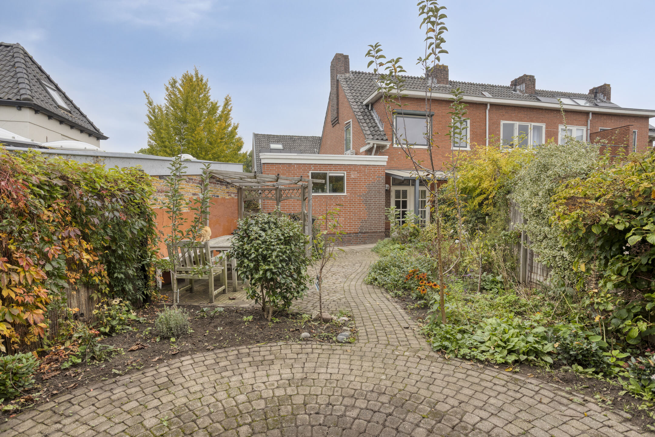 Nette achtertuin op het zuidoosten, met overdekt terras tegen de achtergevel, sierbestrating, borders en ruime aangebouwde garage met oprit aan de voorzijde. De tuin is langs de garage achterom te bereiken.