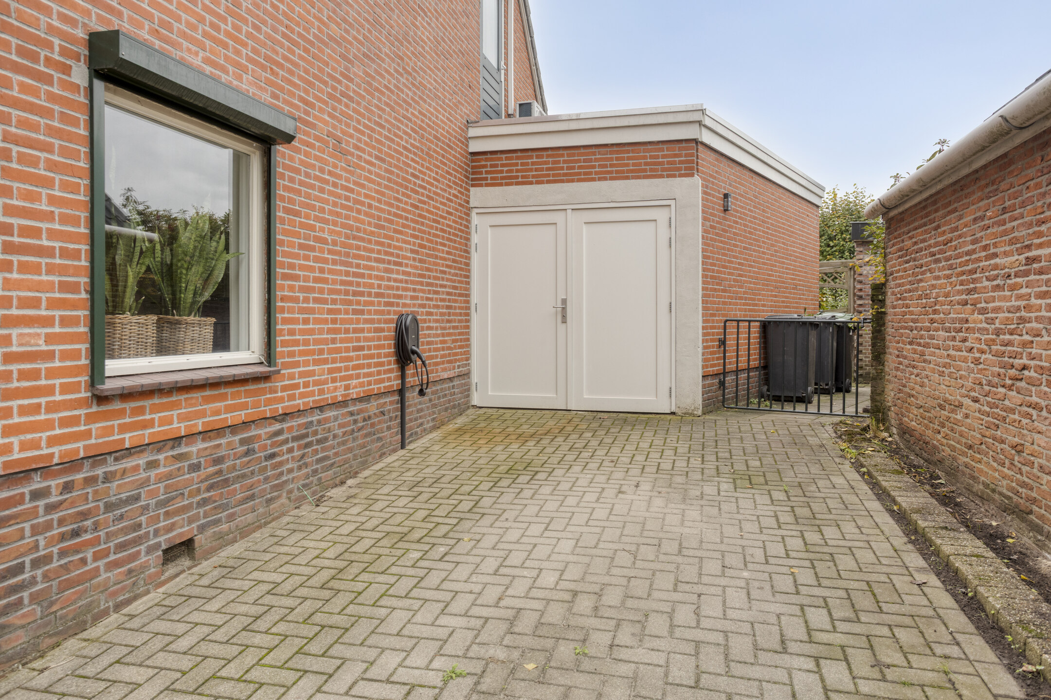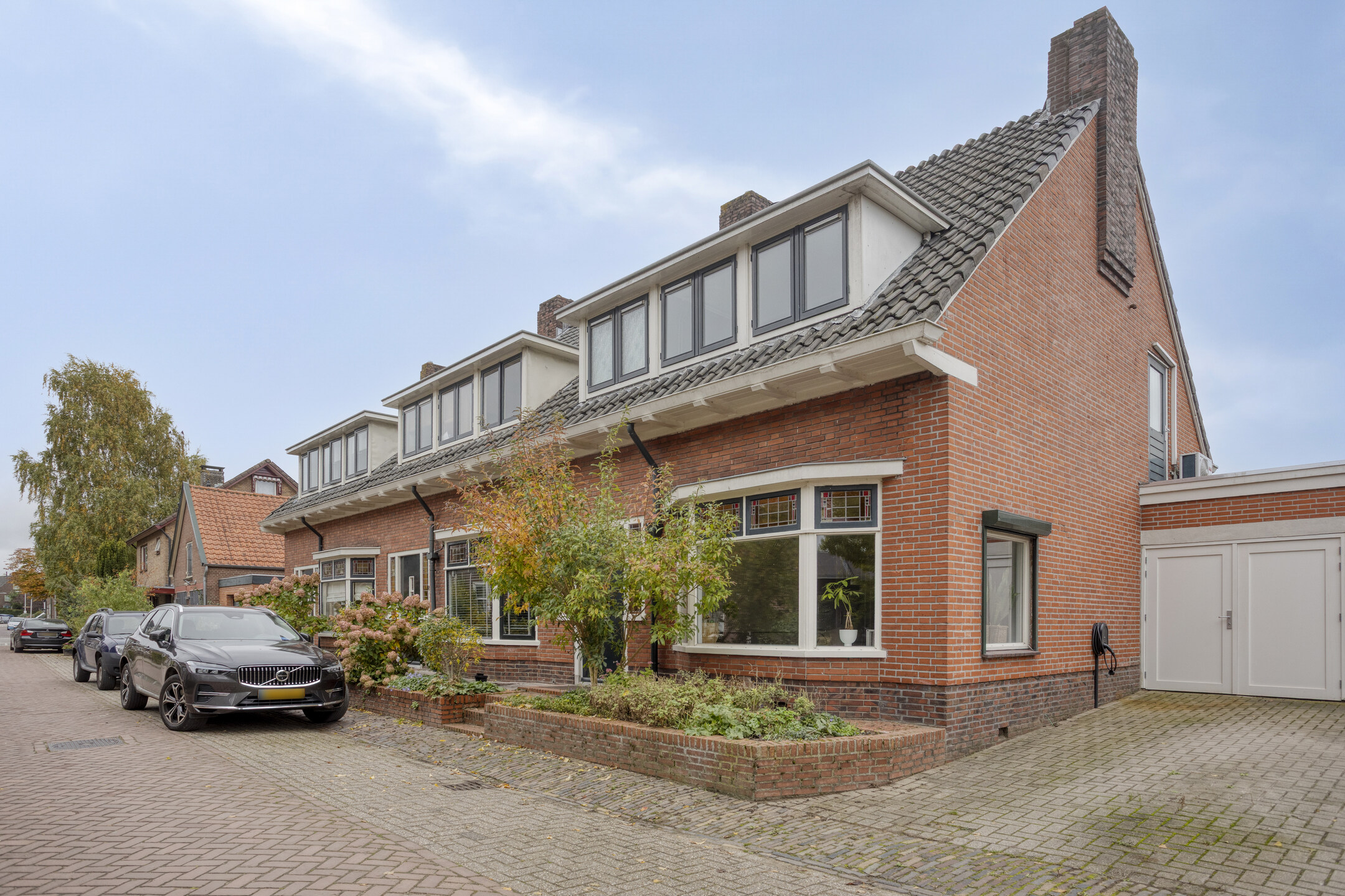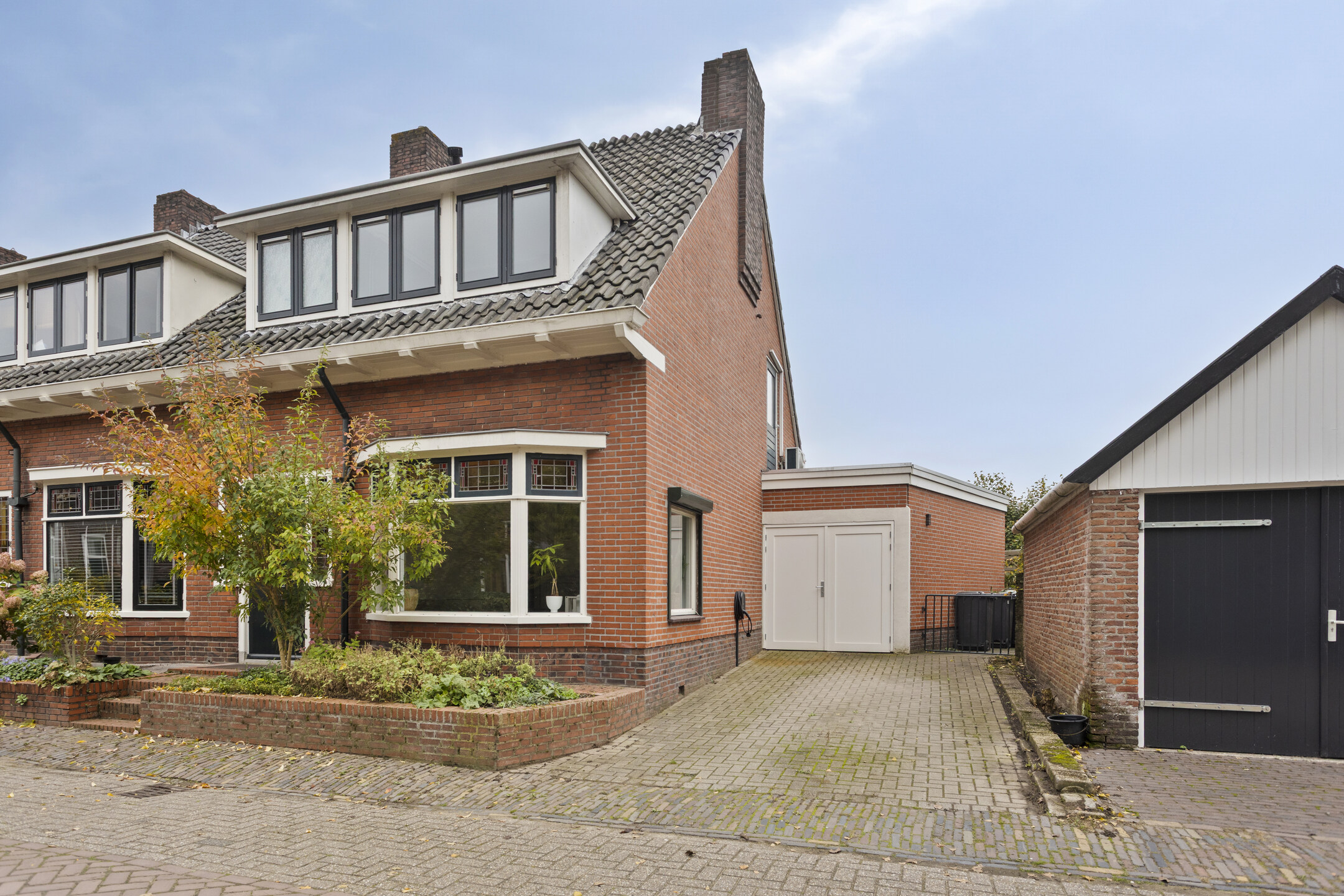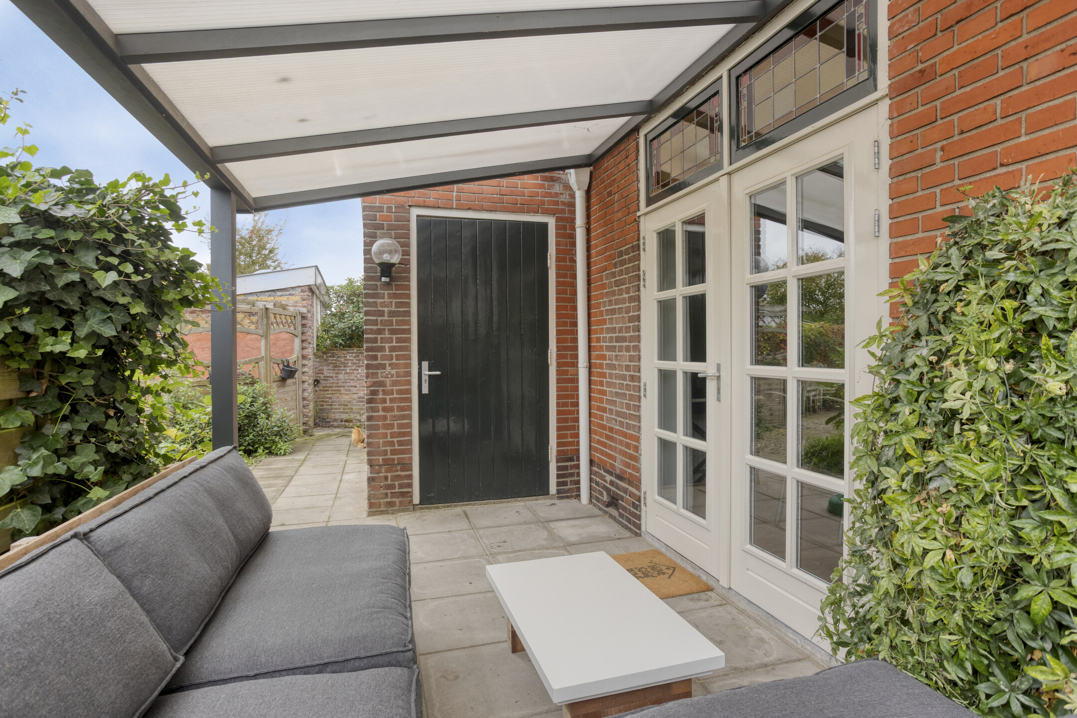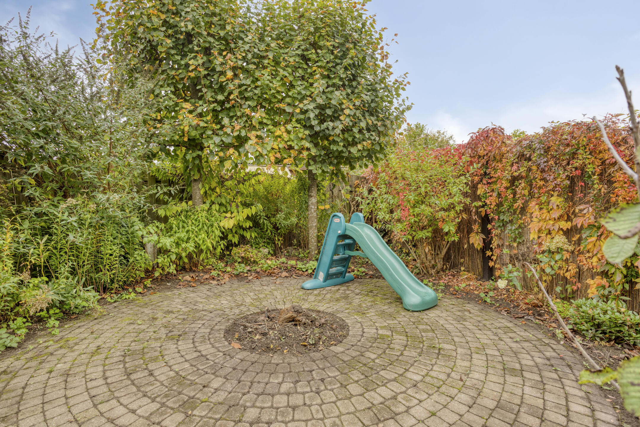 Nette achtertuin op het zuidoosten, met overdekt terras tegen de achtergevel, sierbestrating, borders en ruime aangebouwde garage met oprit aan de voorzijde. De tuin is langs de garage achterom te bereiken.