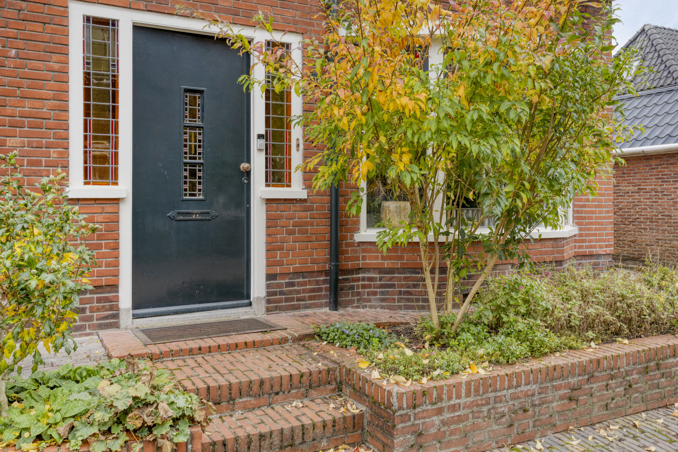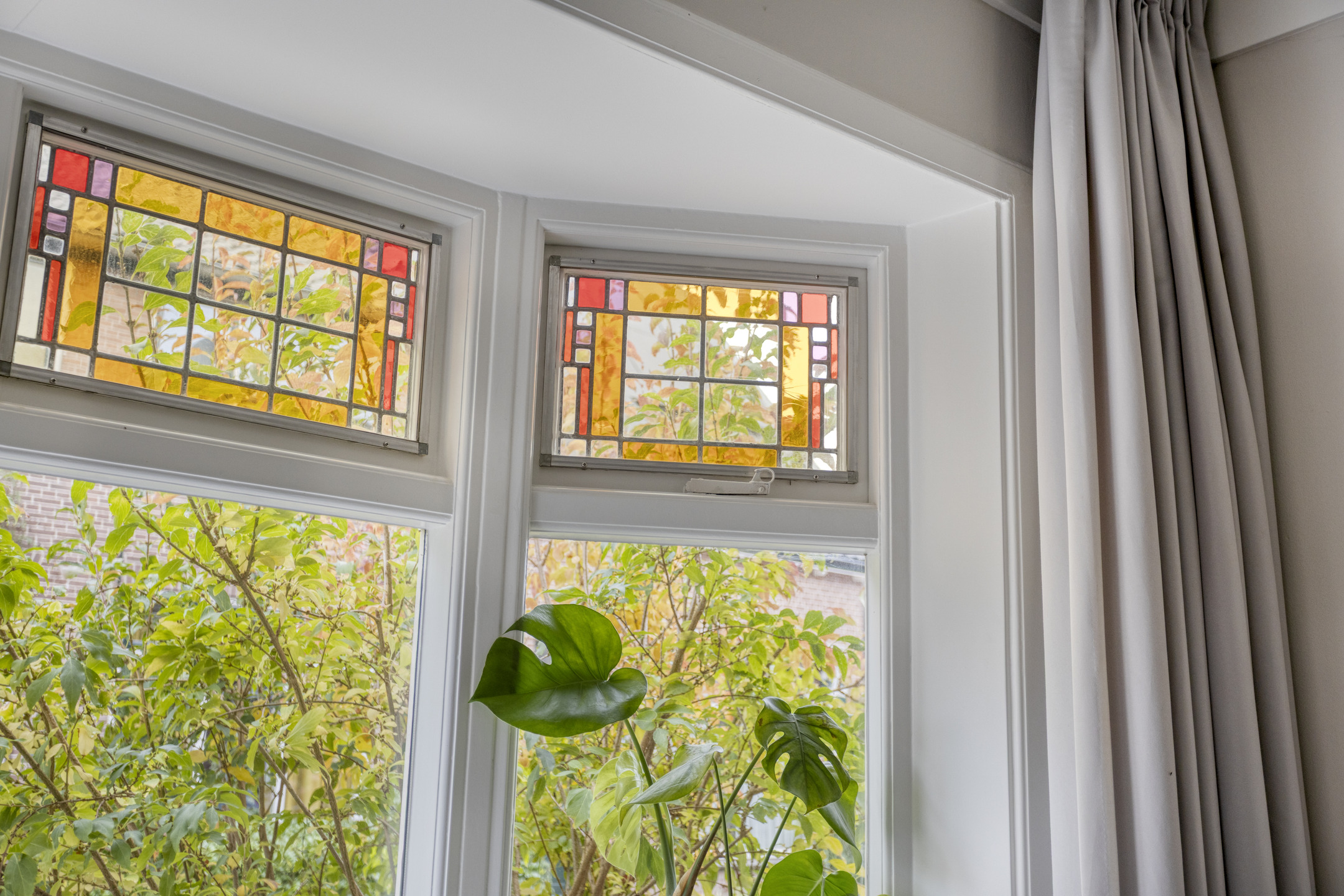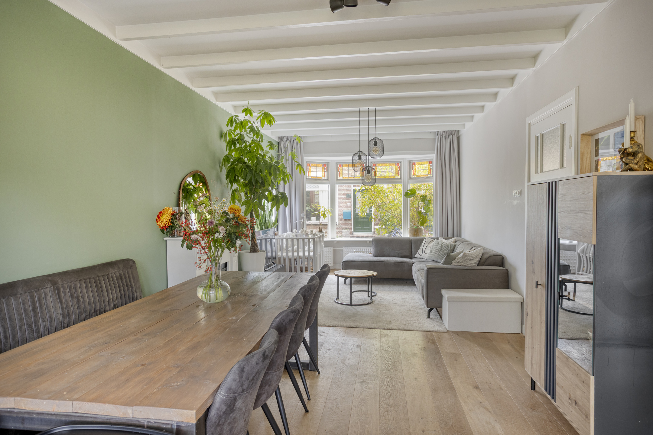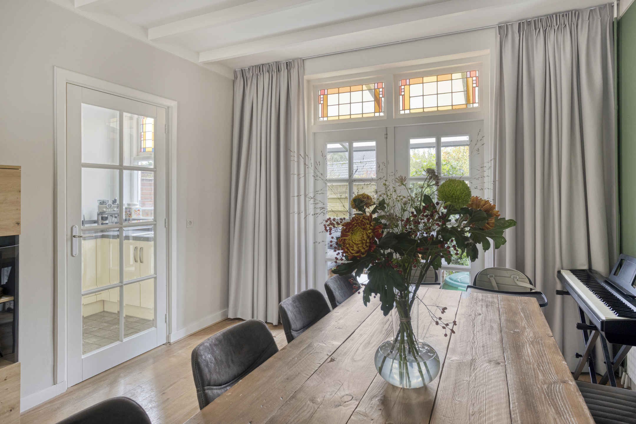 Begane grond: entree met glas-in-loodwerk, ruime hal met toegang tot de kelder, trapopgang naar de 1e verdieping, fonteintje en toilet voorzien van wandcloset. Keurig afgewerkte doorzonwoonkamer, met erker aan de voorzijde en openslaande deuren aan de achterzijde naar het terras. Dichte keuken voorzien van 5-pits gaskookplaat, afzuigkap, oven, koel-vriescombinatie en vaatwasser.