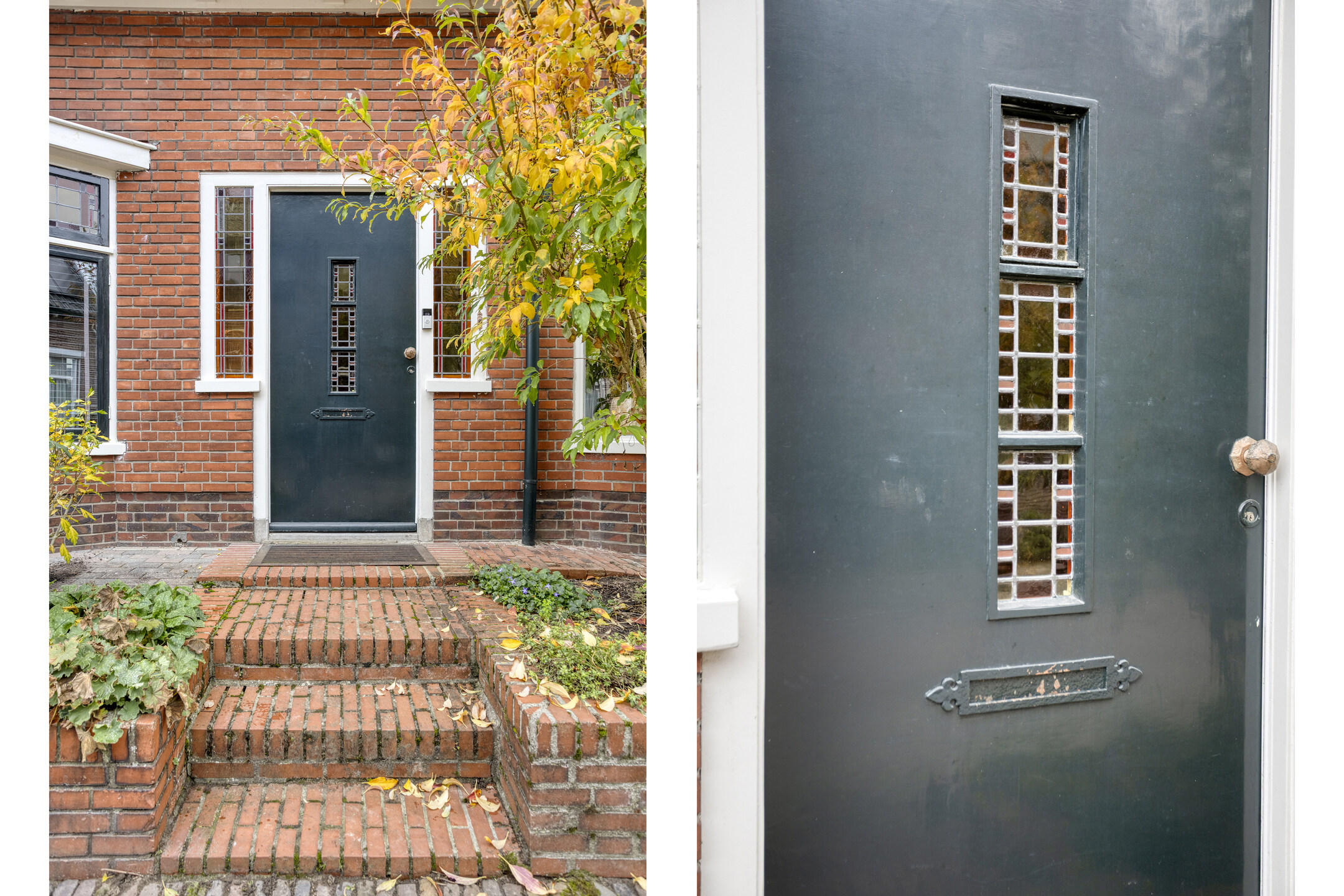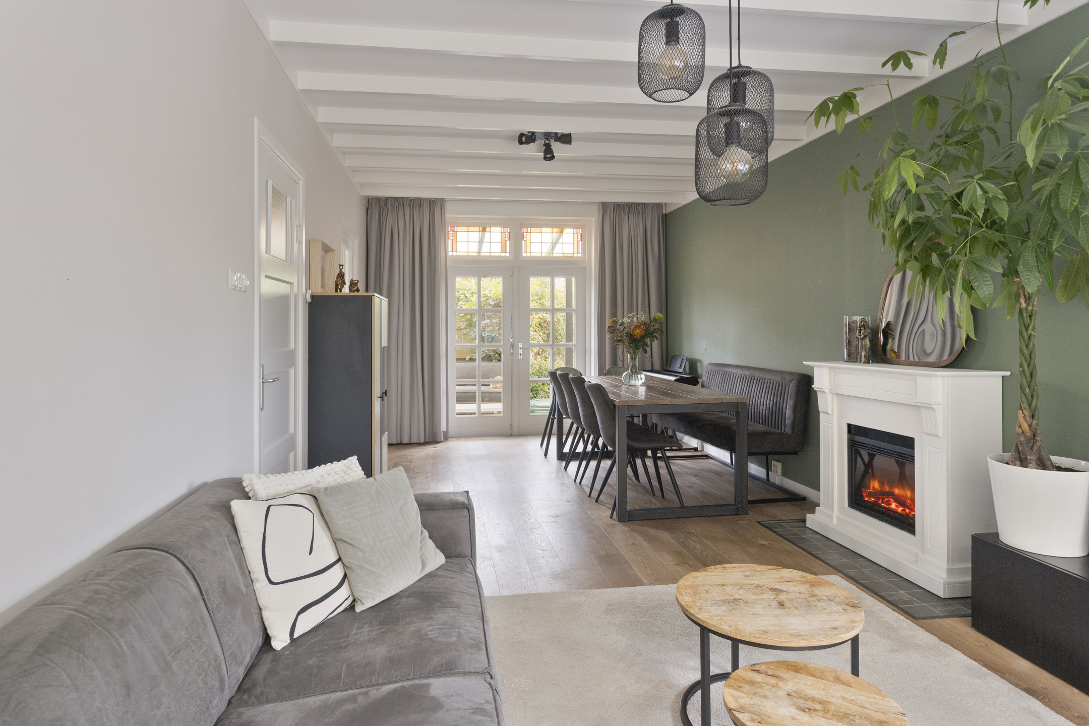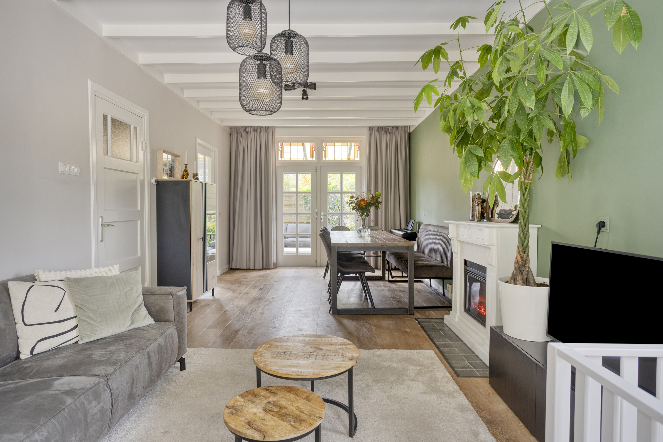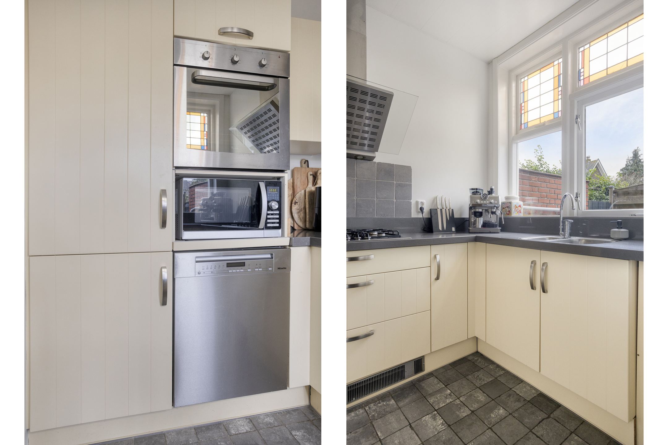 Begane grond: entree met glas-in-loodwerk, ruime hal met toegang tot de kelder, trapopgang naar de 1e verdieping, fonteintje en toilet voorzien van wandcloset. Keurig afgewerkte doorzonwoonkamer, met erker aan de voorzijde en openslaande deuren aan de achterzijde naar het terras. Dichte keuken voorzien van 5-pits gaskookplaat, afzuigkap, oven, koel-vriescombinatie en vaatwasser.