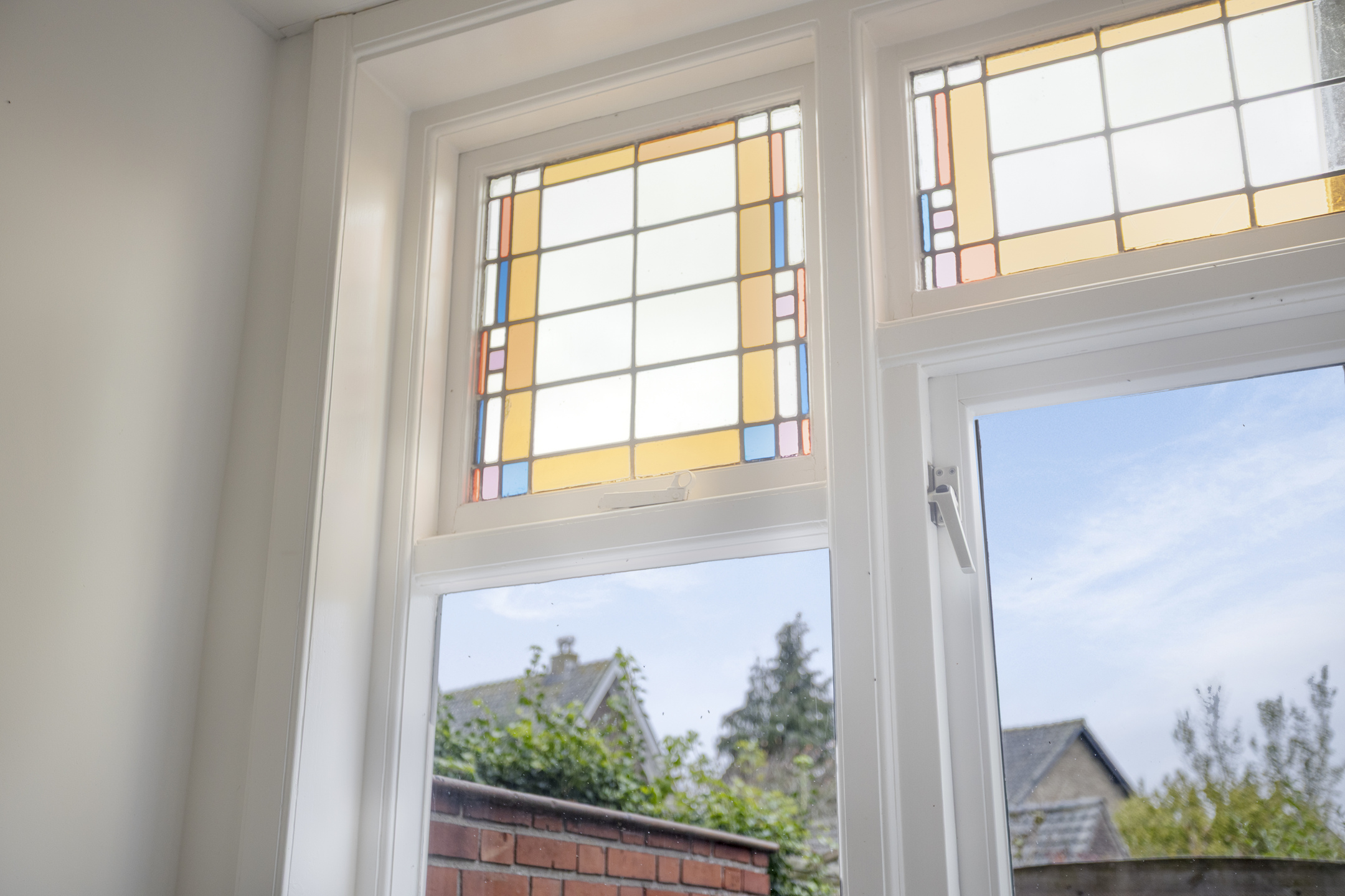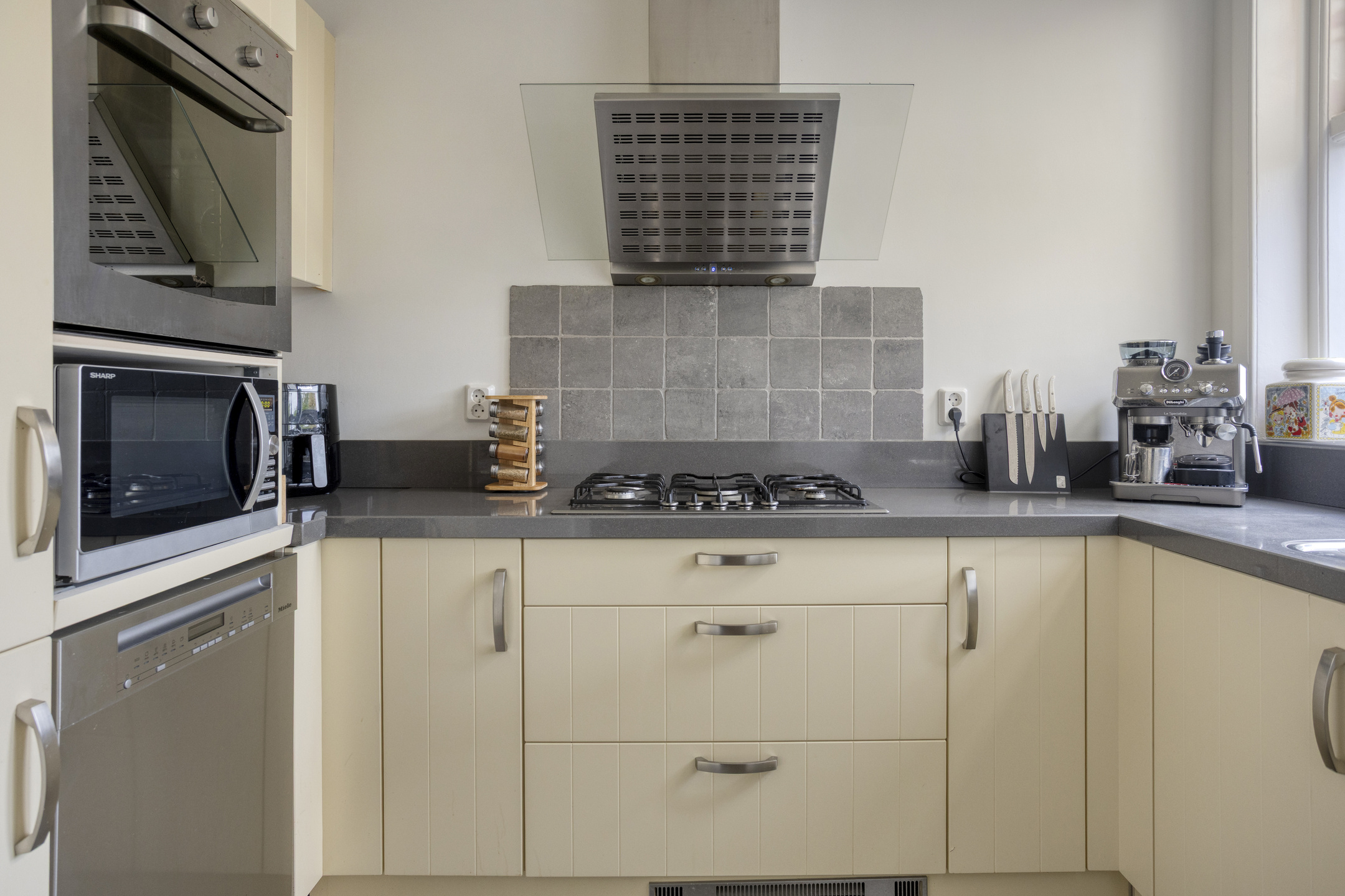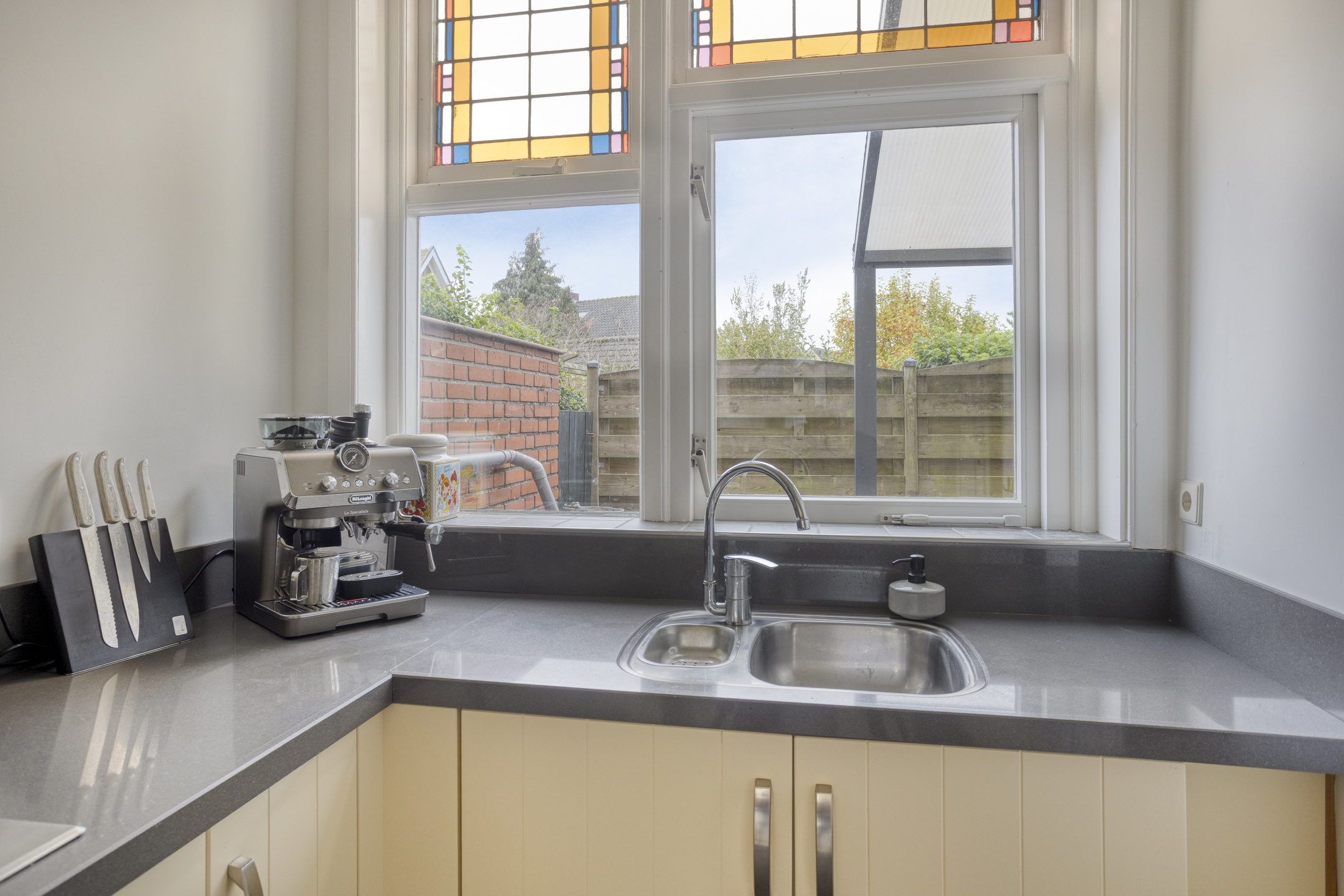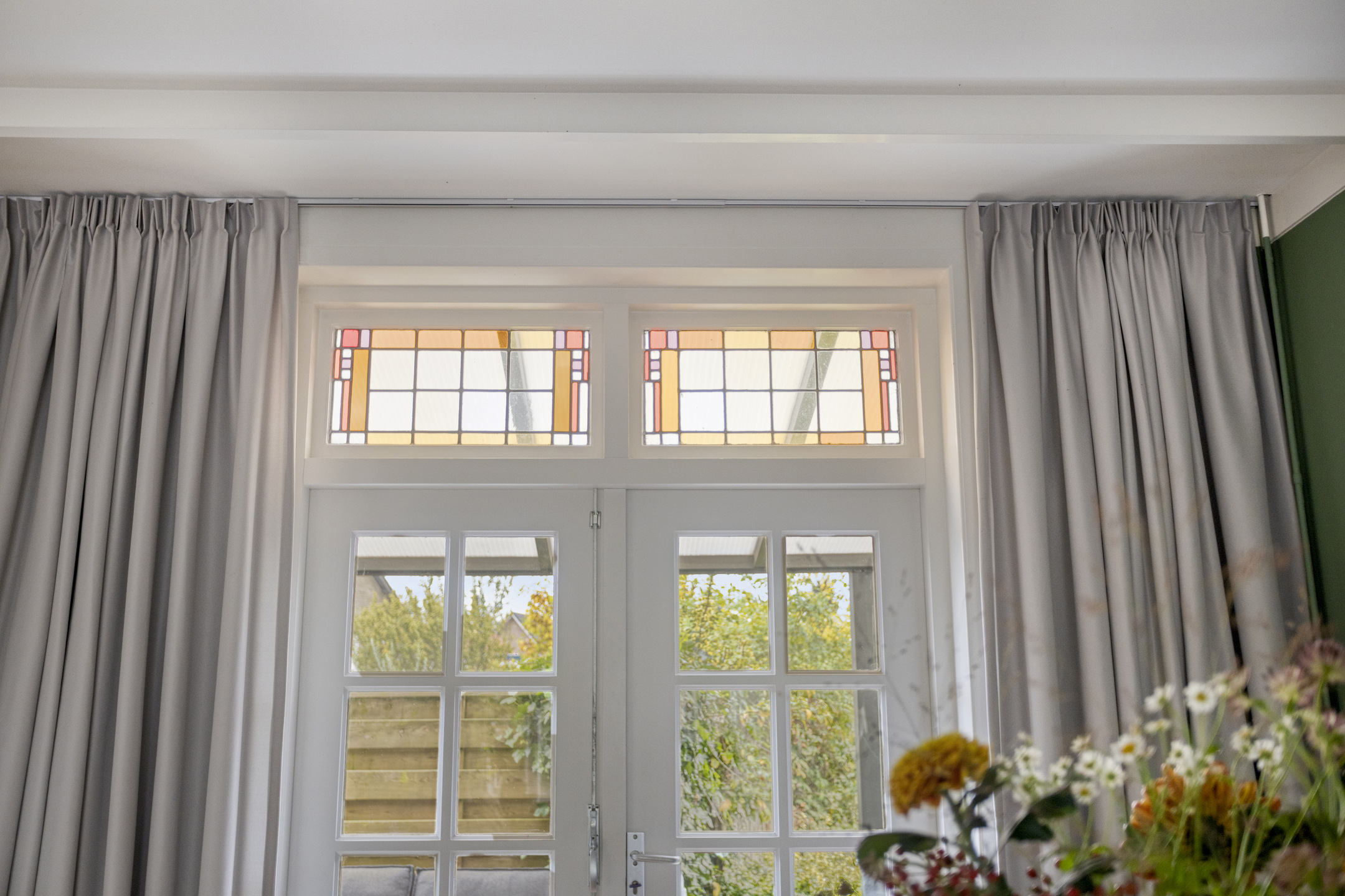 Begane grond: entree met glas-in-loodwerk, ruime hal met toegang tot de kelder, trapopgang naar de 1e verdieping, fonteintje en toilet voorzien van wandcloset. Keurig afgewerkte doorzonwoonkamer, met erker aan de voorzijde en openslaande deuren aan de achterzijde naar het terras. Dichte keuken voorzien van 5-pits gaskookplaat, afzuigkap, oven, koel-vriescombinatie en vaatwasser.