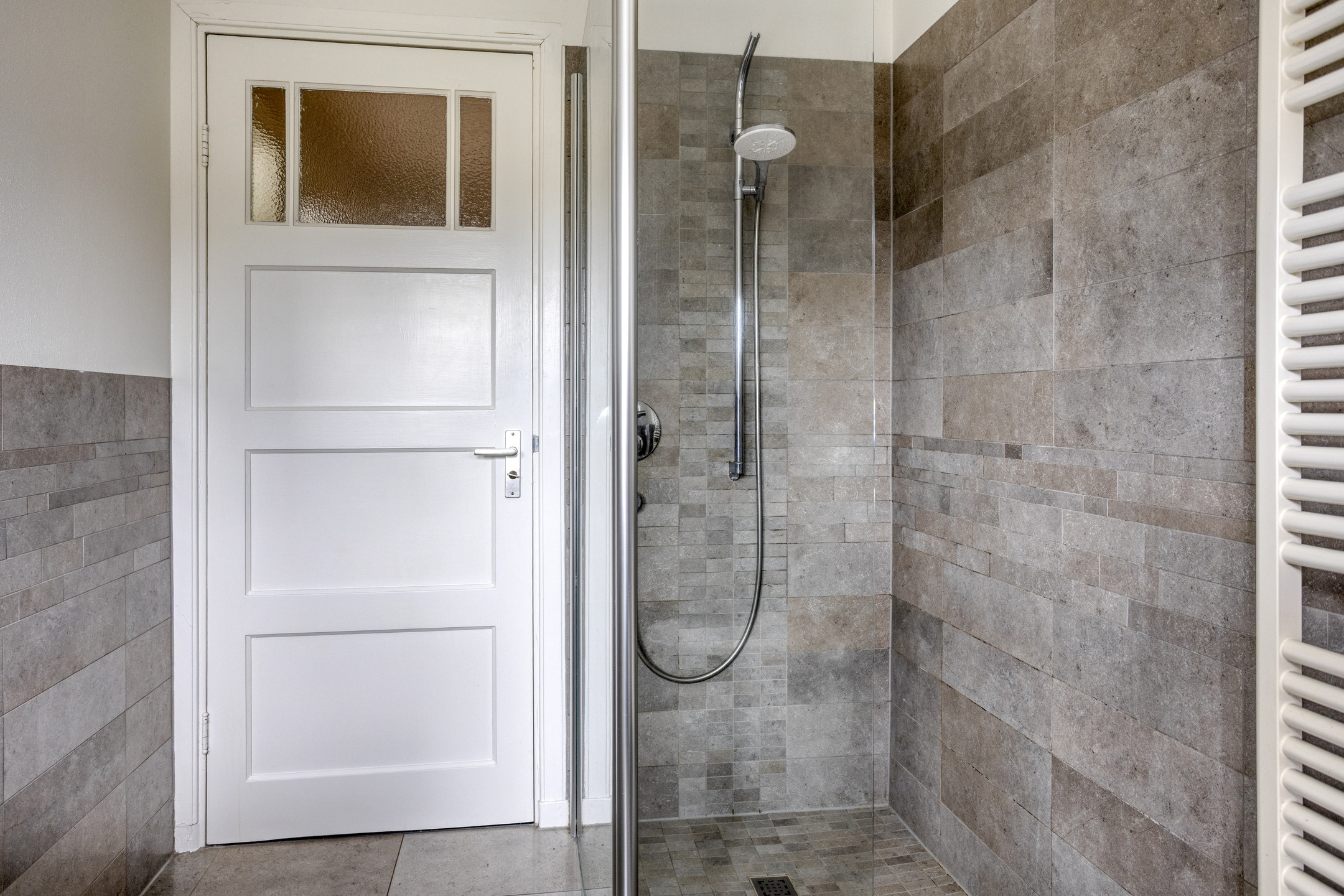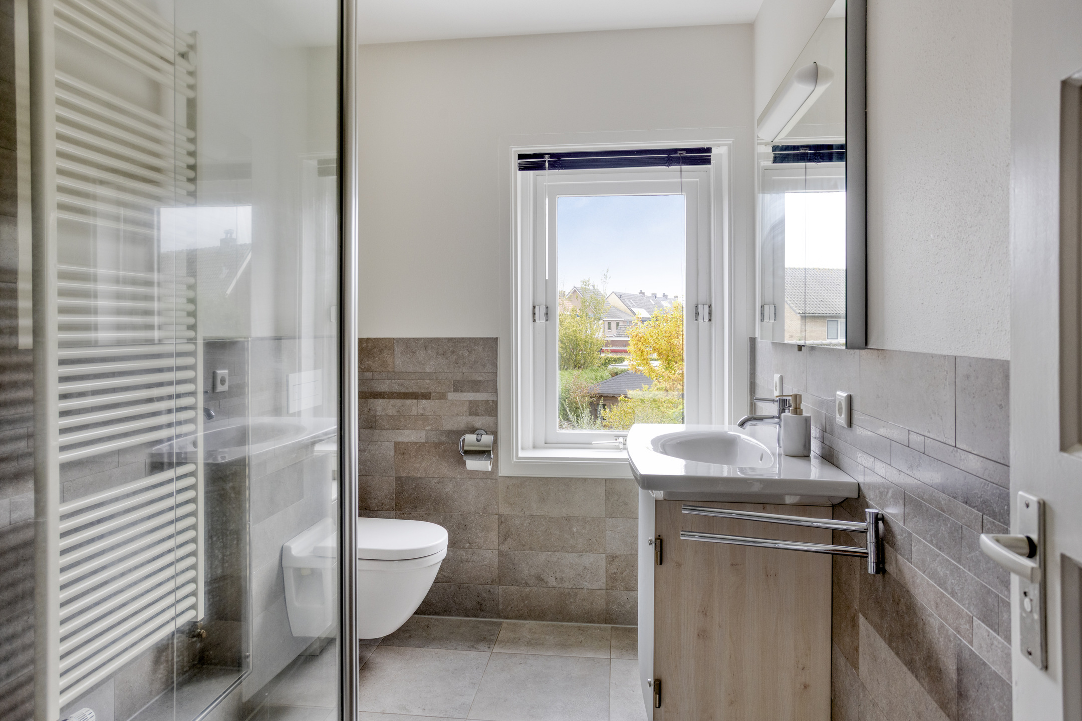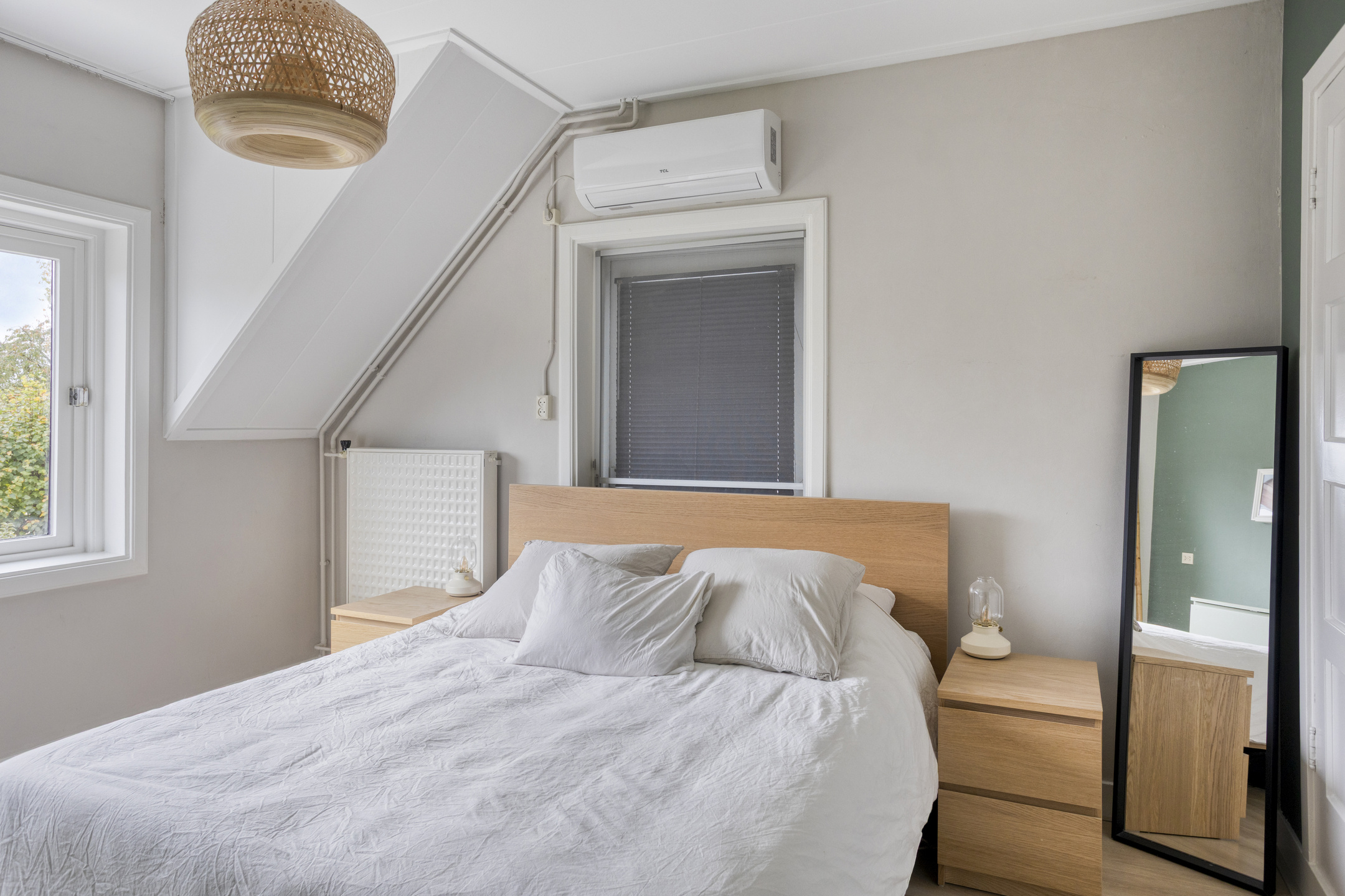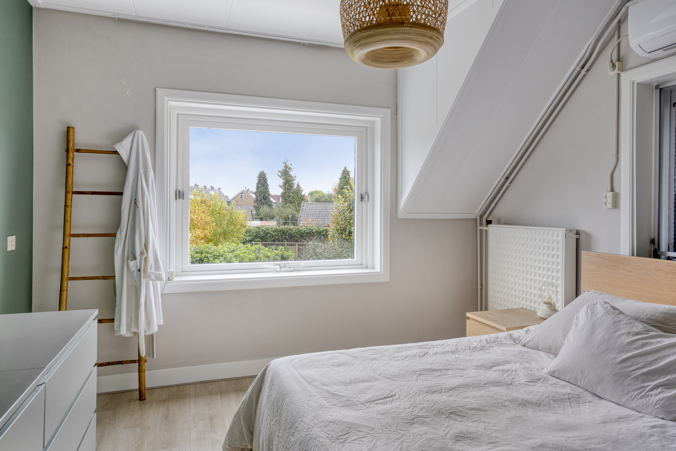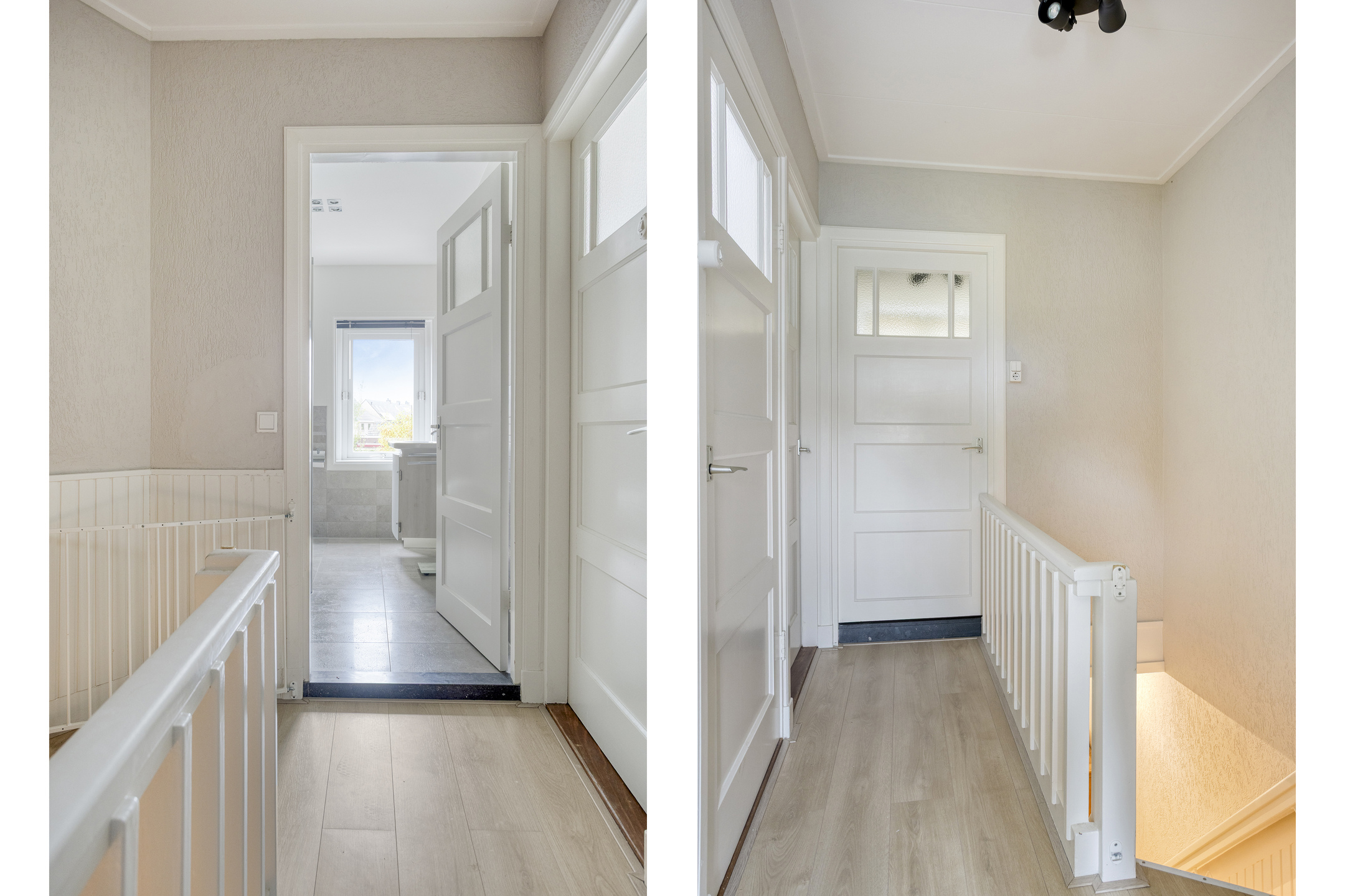 1e Verdieping: overloop. Drie (slaap)kamers ter grootte van circa 3,5 m², 10 m² en 13 m², allen keurig afgewerkt, waarvan de twee grootste slaapkamers zijn voorzien van vaste kasten. De ouder slaapkamer is tevens voorzien van airconditioning! Moderne badkamer met wastafelmeubel, inloopdouche, wandcloset en handdoekenradiator.