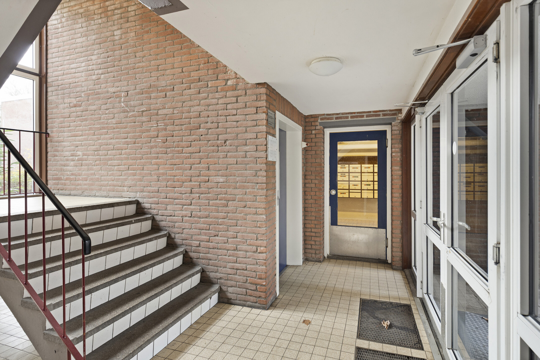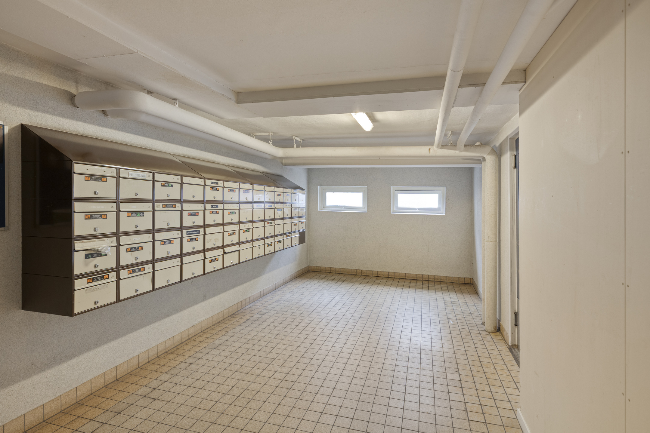 Begane grond: gemeenschappelijke entree met brievenbussen, lift, trappenhuis en toegang tot de (privé)berging in de onderbouw.