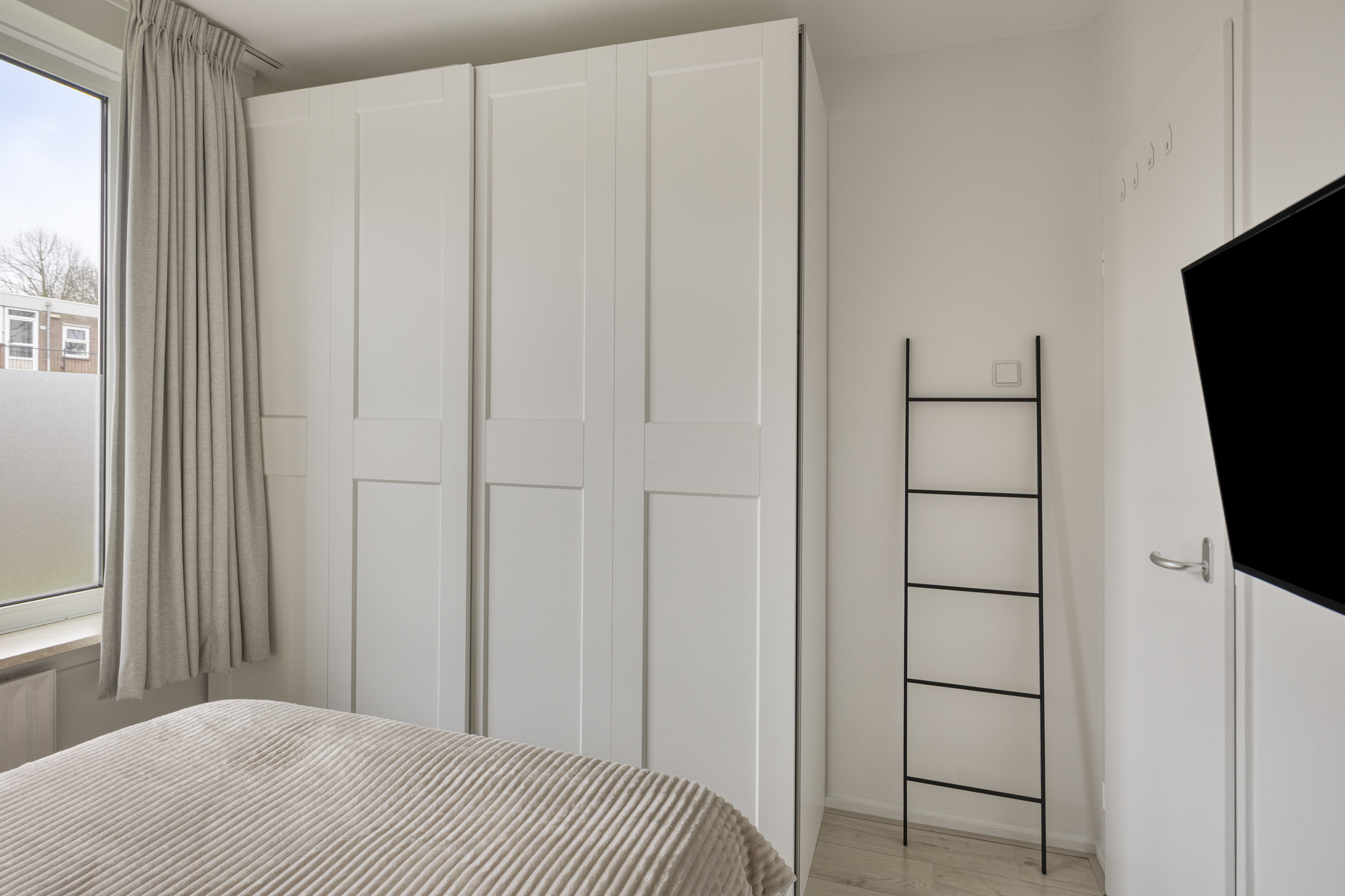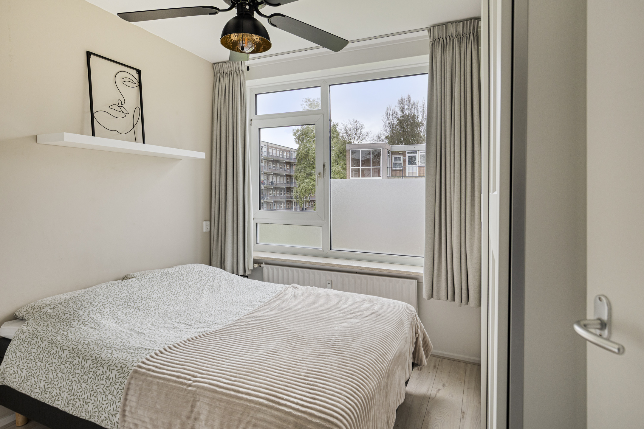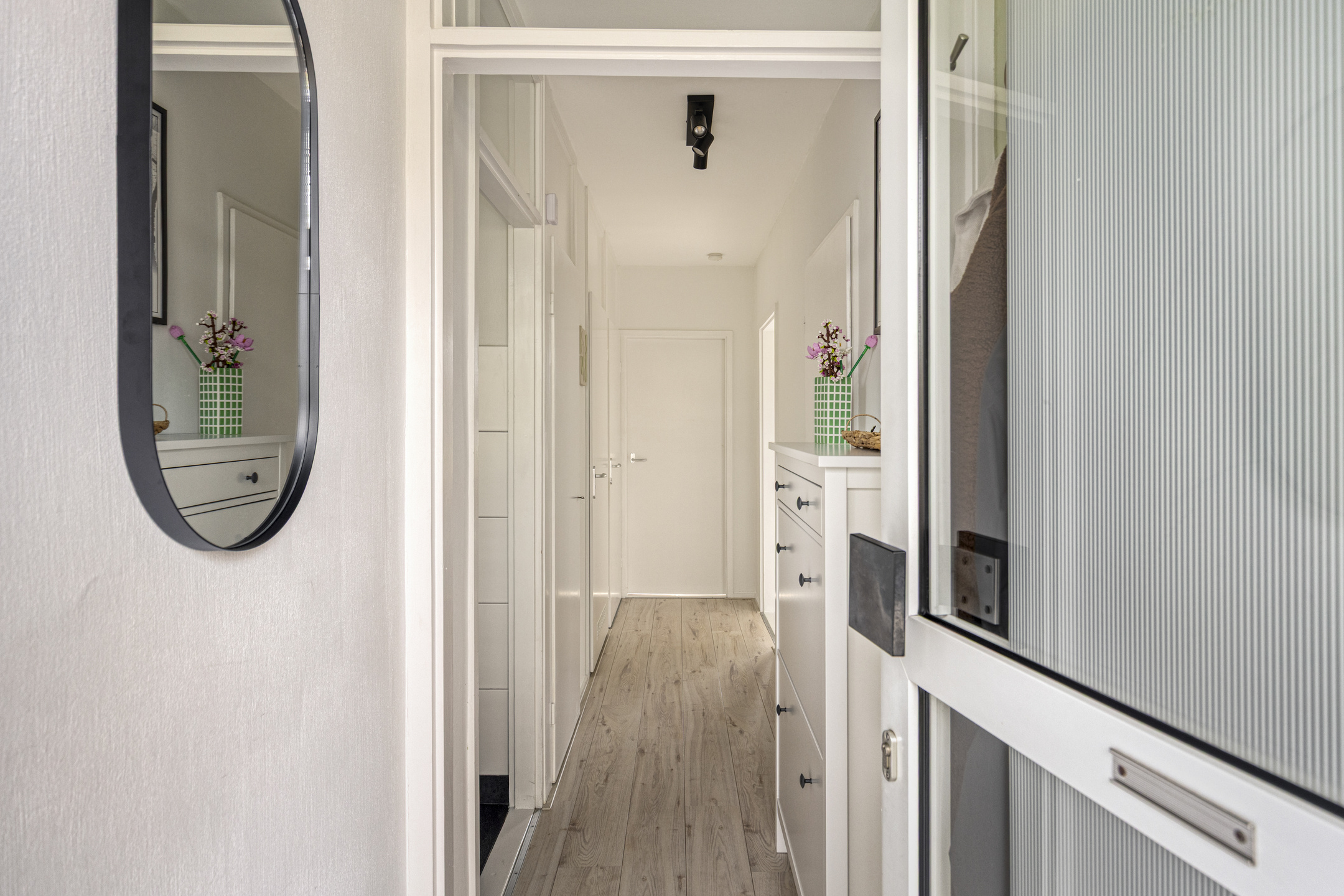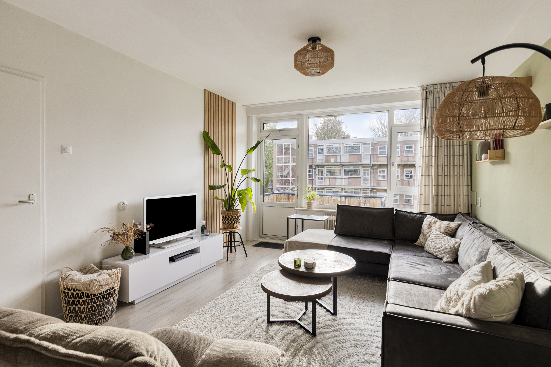 Woonverdieping (2e verdieping): entree, nette hal met vaste kast, trapkast en toilet voorzien van wandcloset. Keurig afgewerkte woonkamer met eethoek aan de voorzijde met vaste kast en zitkamer aan de achterzijde met toegang tot het op het zuiden gelegen balkon. Moderne keuken voorzien van 4-pits gaskookplaat, afzuigkap, combi-oven, vaatwasser, wasmachine-aansluiting en vaste kast t.b.v. de warmwatervoorziening. Slaapkamer ter grootte van circa 8,5 m², voorzien van vaste kast. Compacte badkamer met inloopdouche en wastafelmeubel.