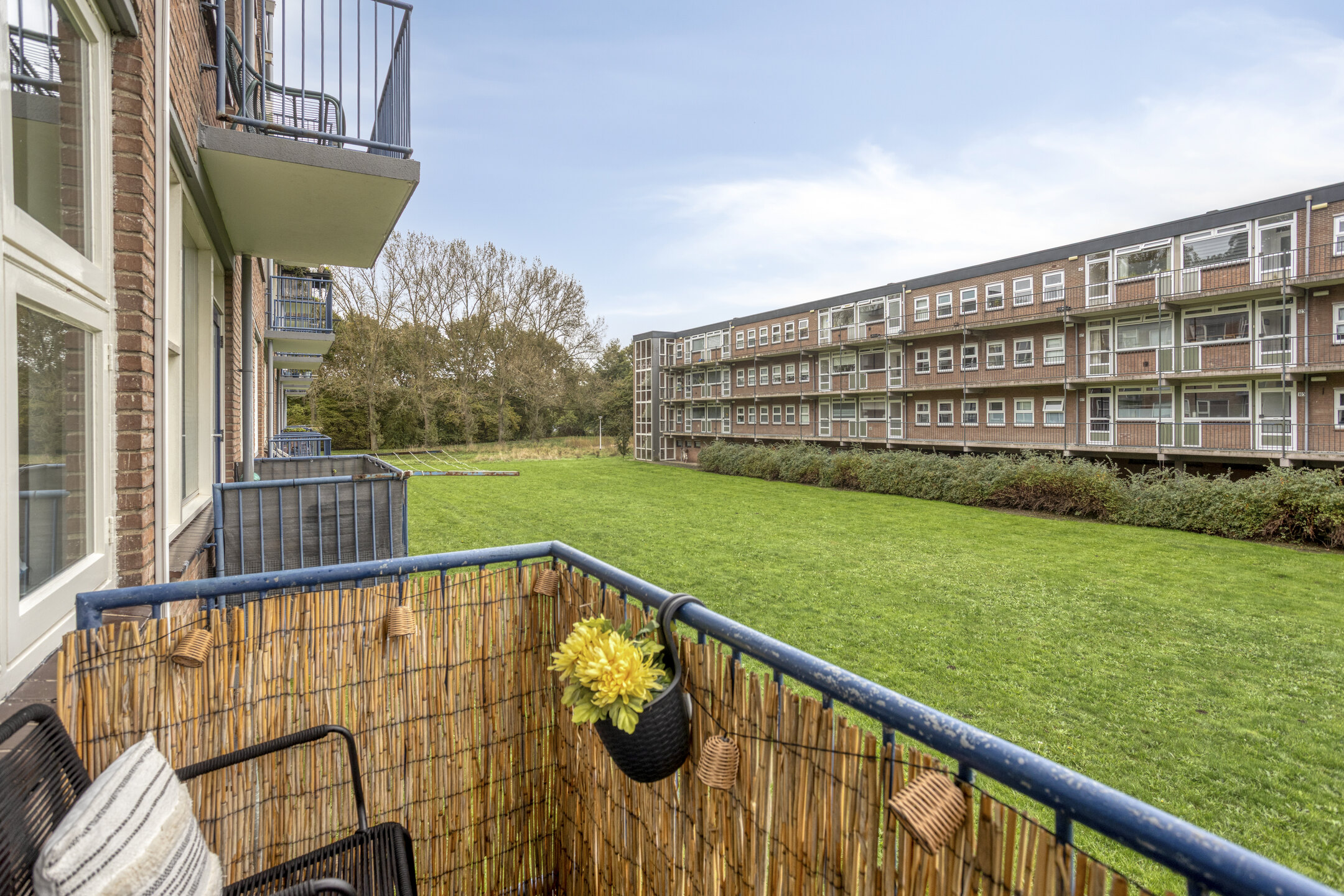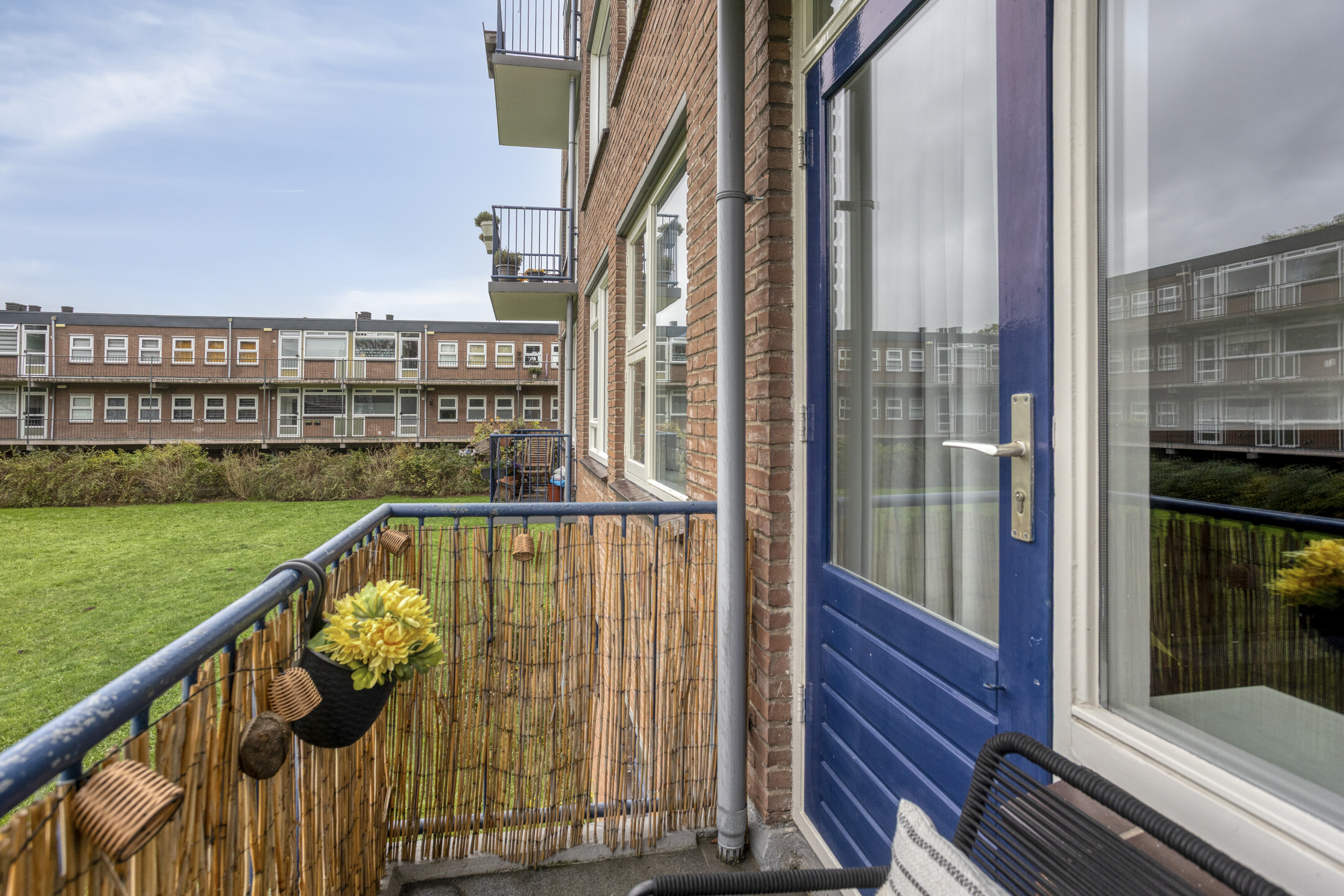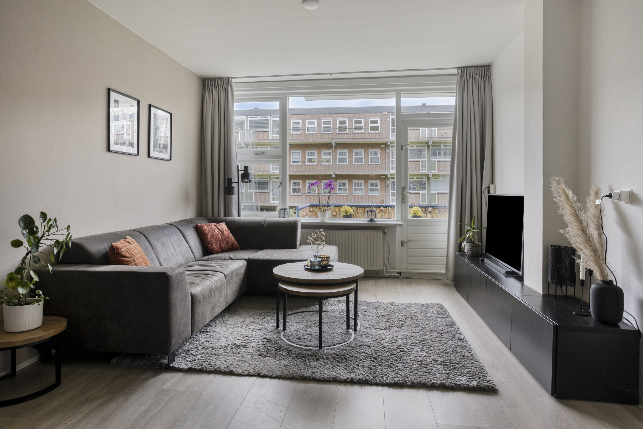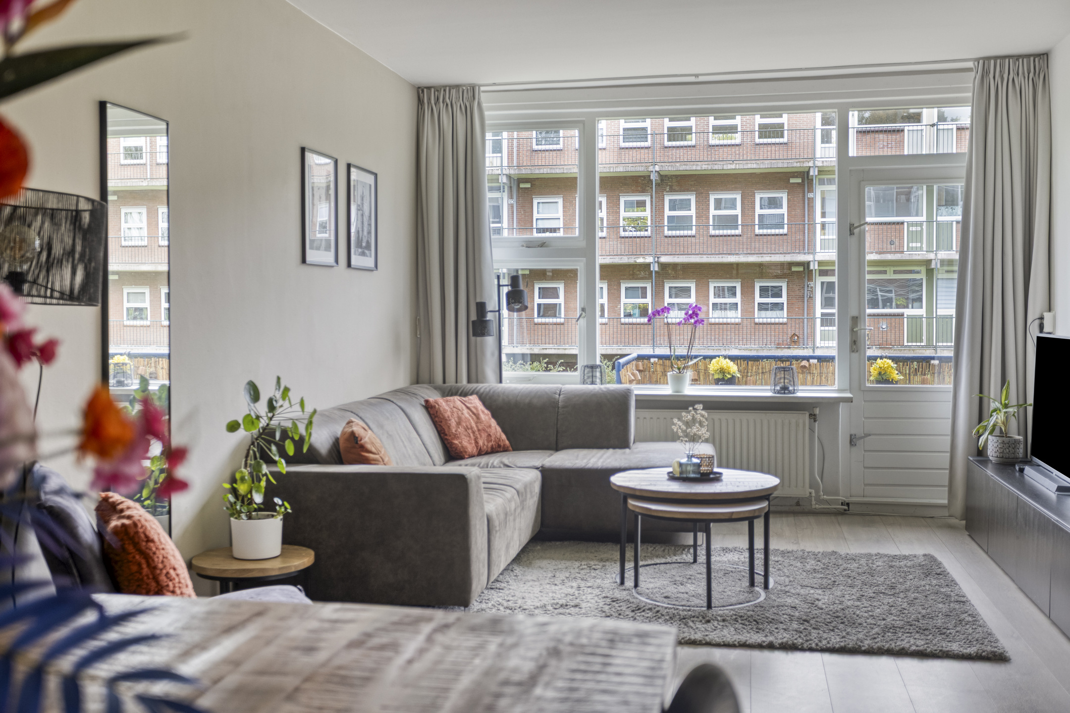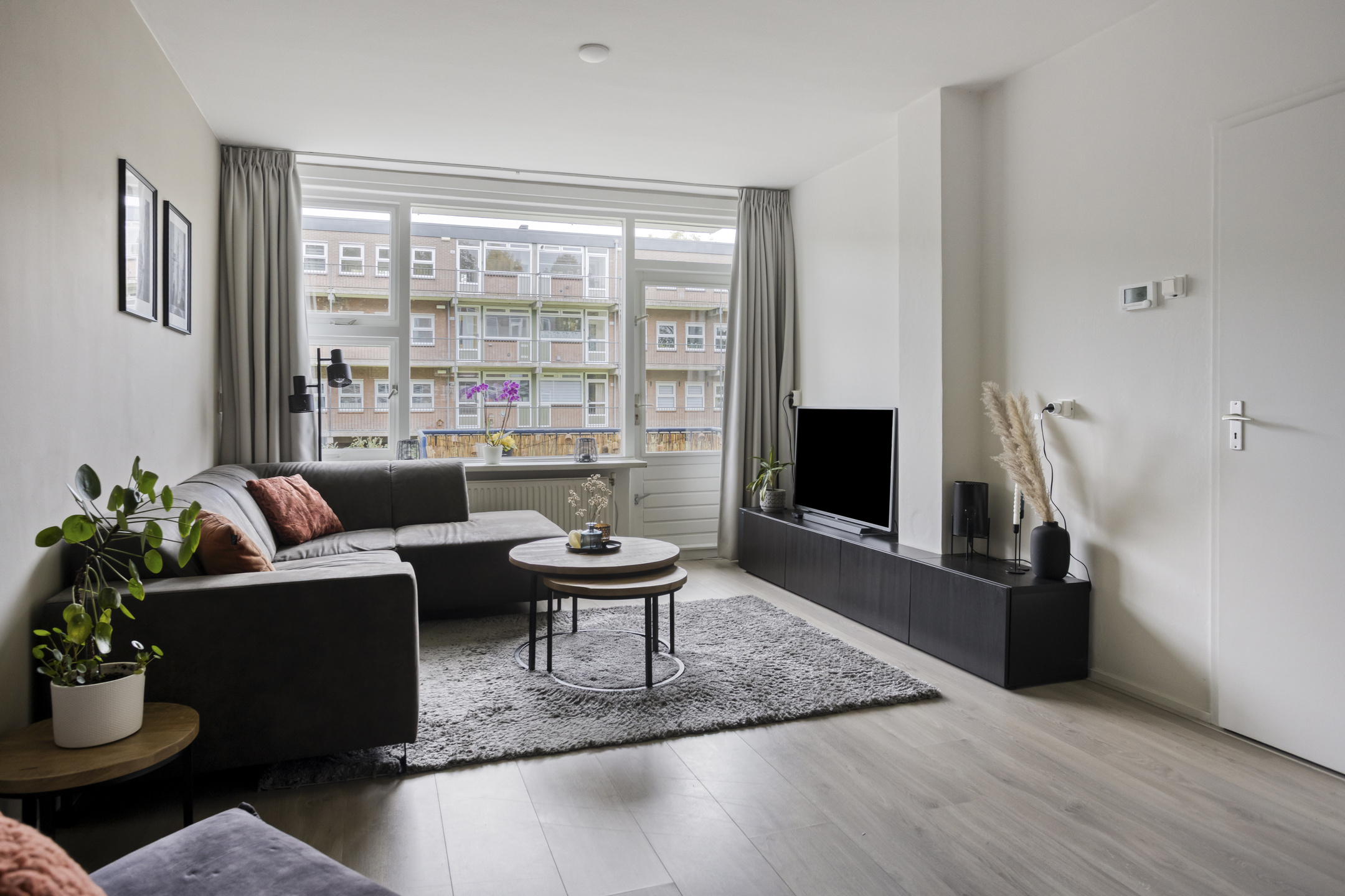 1e (Woon)verdieping: entree, hal met vaste kast, meterkast en toilet voorzien van wandcloset. Ruime, strak afgewerkte doorzonwoonkamer met aparte eet- en zithoek en toegang tot het zonnige balkon. Nette keuken voorzien van 4-pits gaskookplaat, afzuigkap, koelkast en vaste kast t.b.v. van wasapparatuur. Nette slaapkamer ter grootte van circa 8,5 m² met vaste kast. Nette badkamer met wastafel en inloop regendouche.