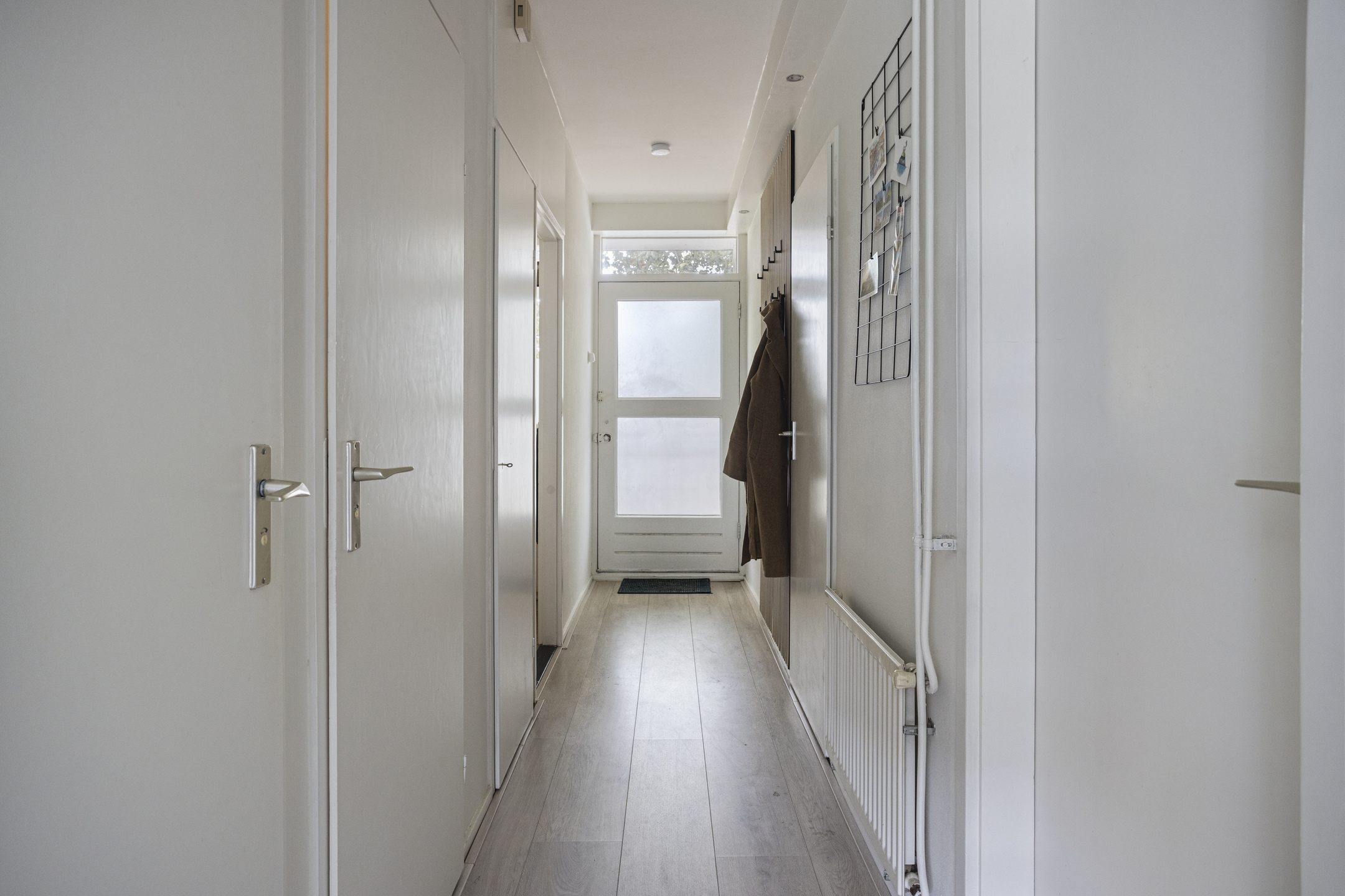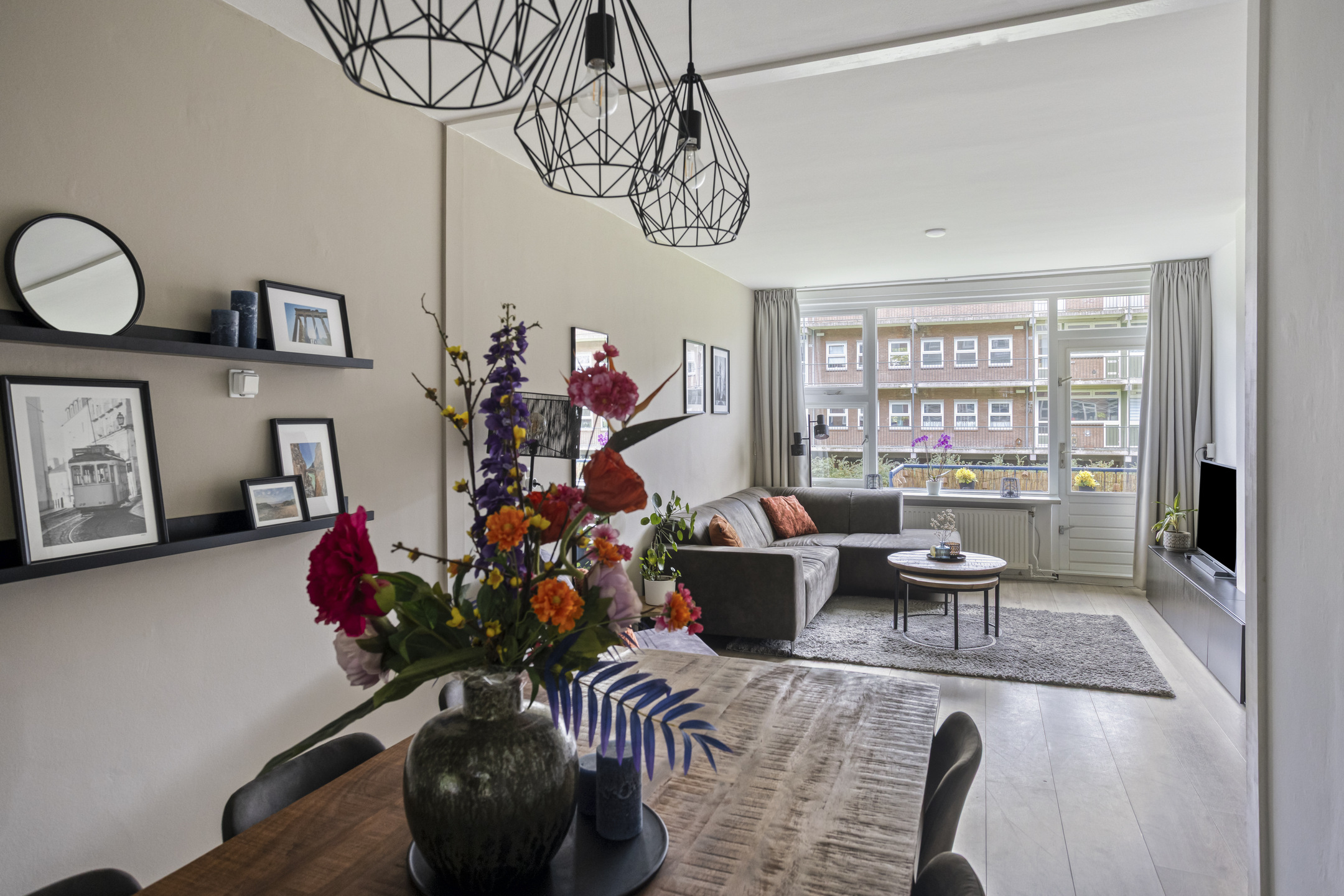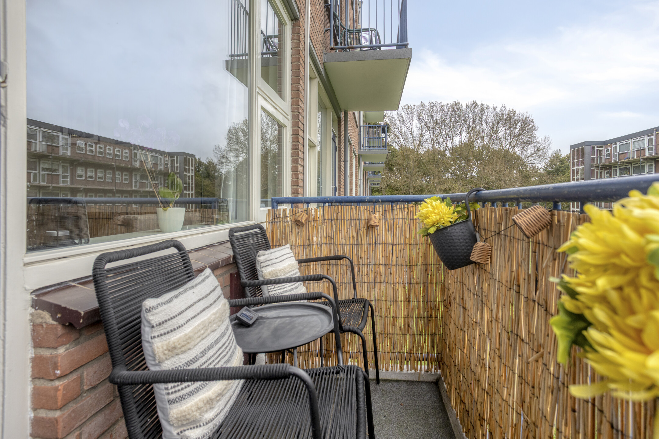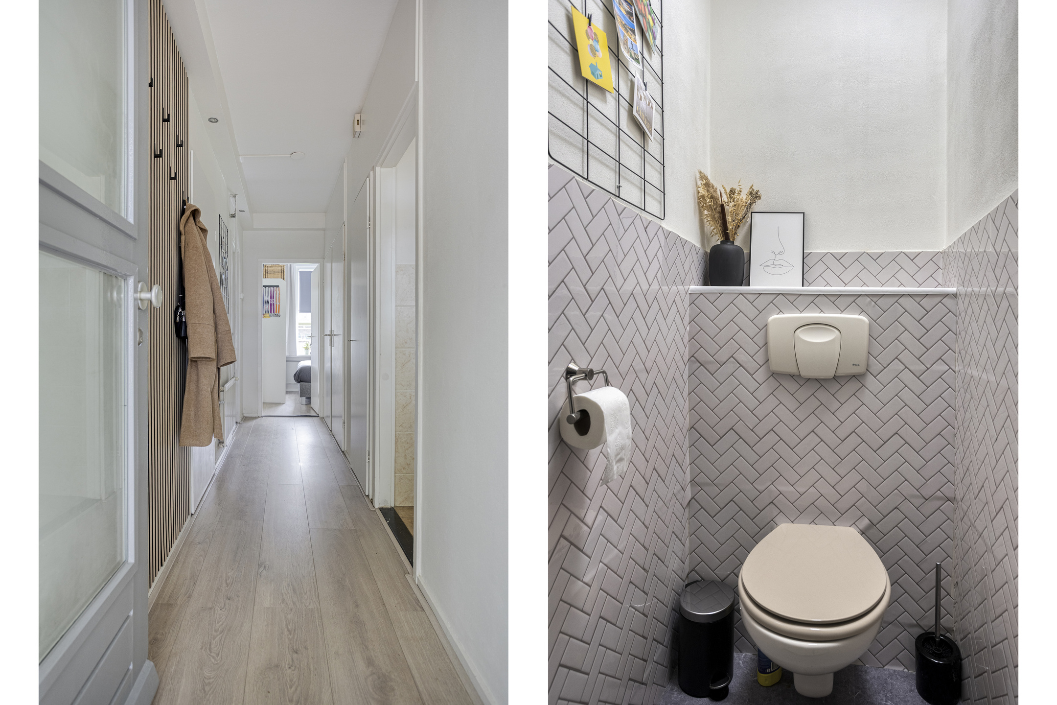 1e (Woon)verdieping: entree, hal met vaste kast, meterkast en toilet voorzien van wandcloset. Ruime, strak afgewerkte doorzonwoonkamer met aparte eet- en zithoek en toegang tot het zonnige balkon. Nette keuken voorzien van 4-pits gaskookplaat, afzuigkap, koelkast en vaste kast t.b.v. van wasapparatuur. Nette slaapkamer ter grootte van circa 8,5 m² met vaste kast. Nette badkamer met wastafel en inloop regendouche.