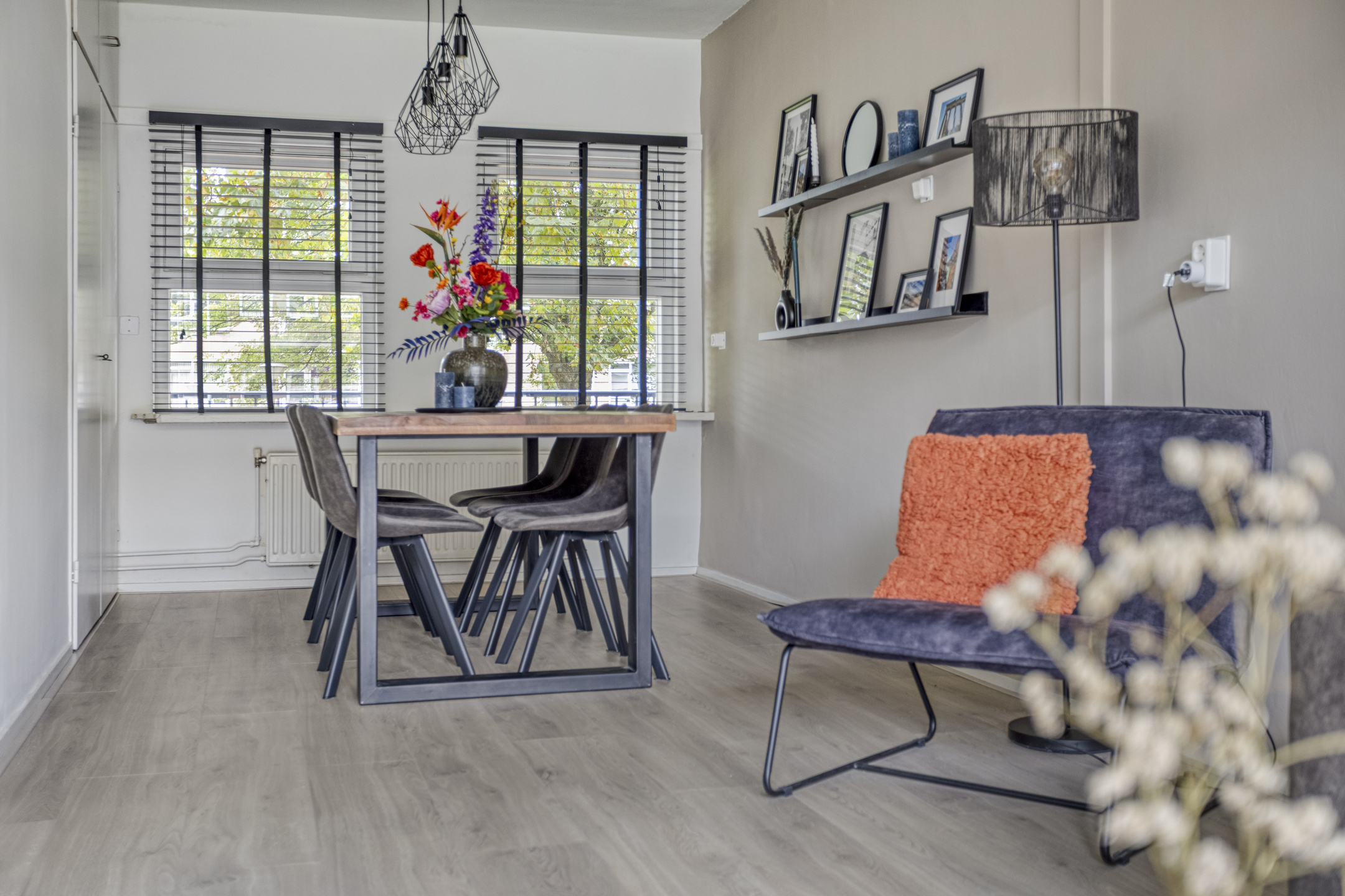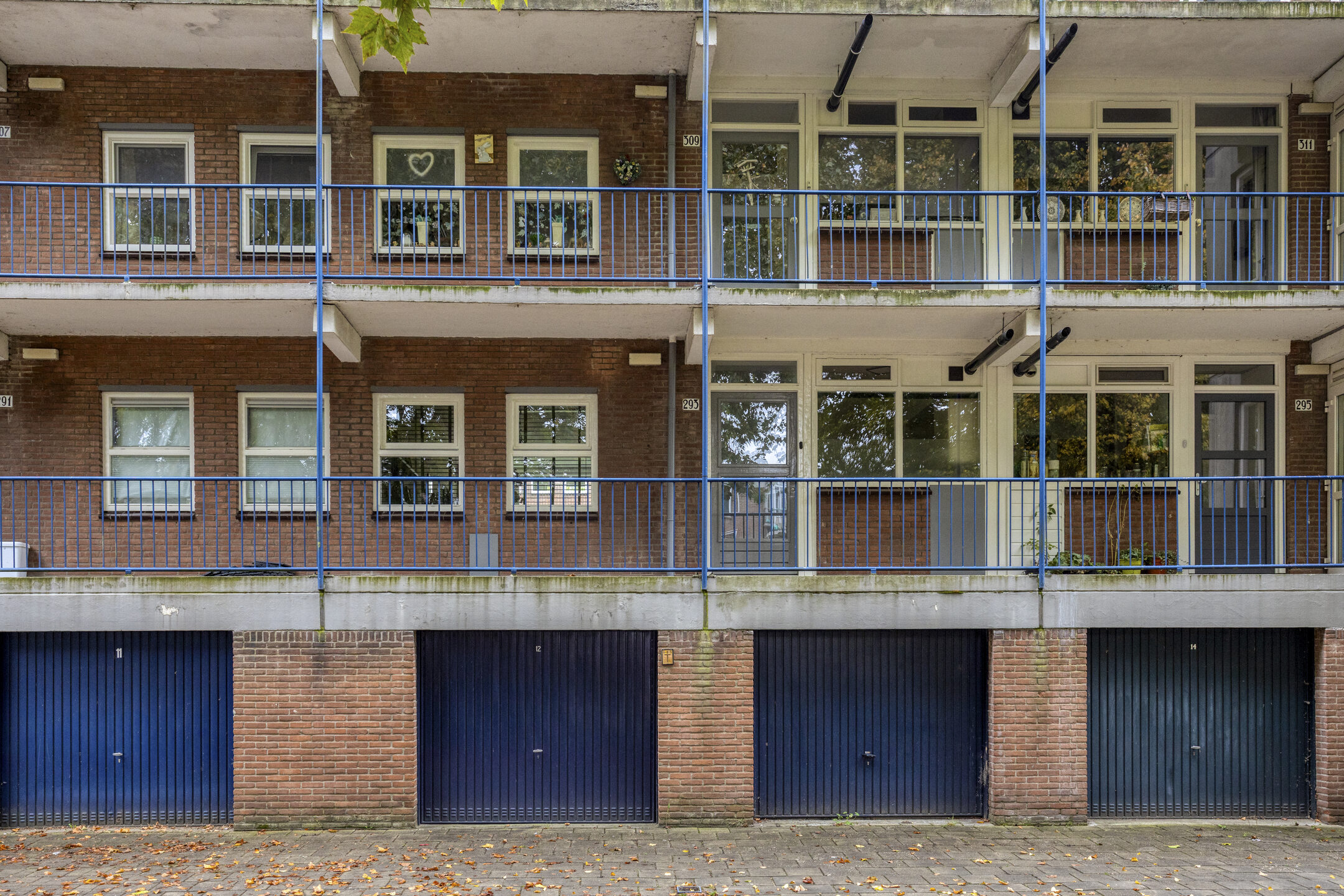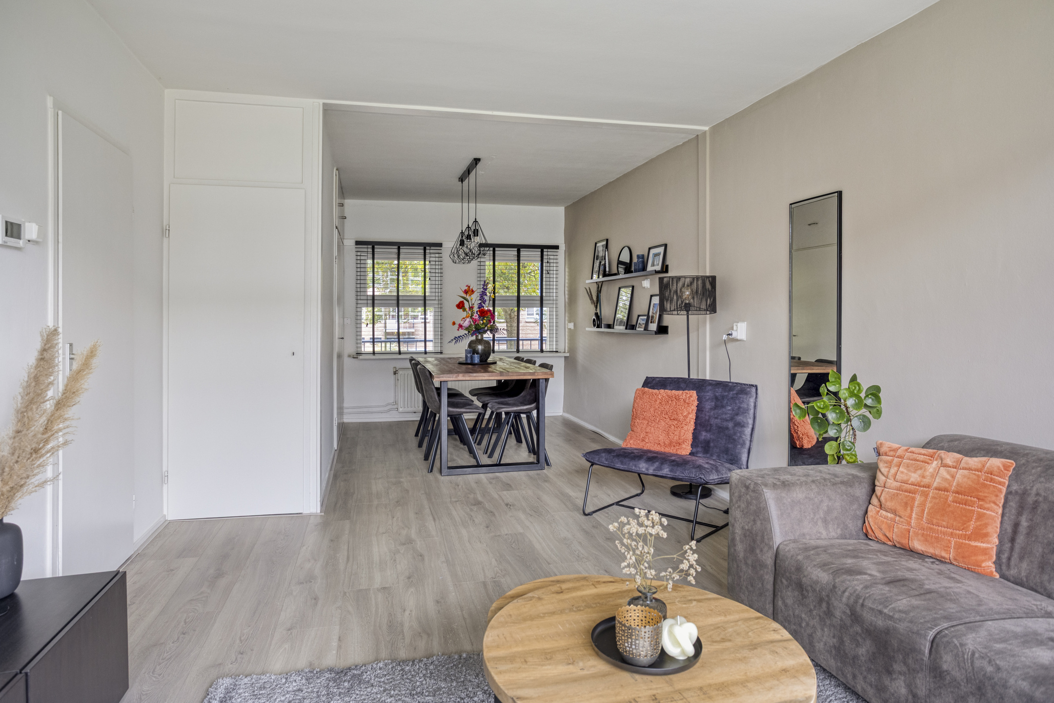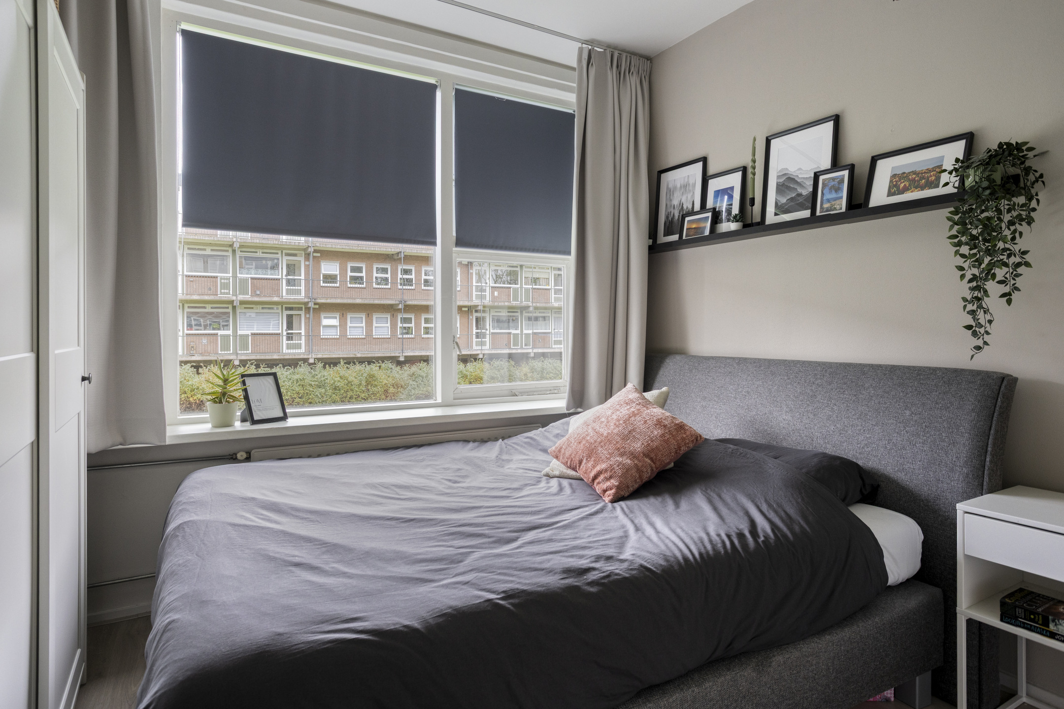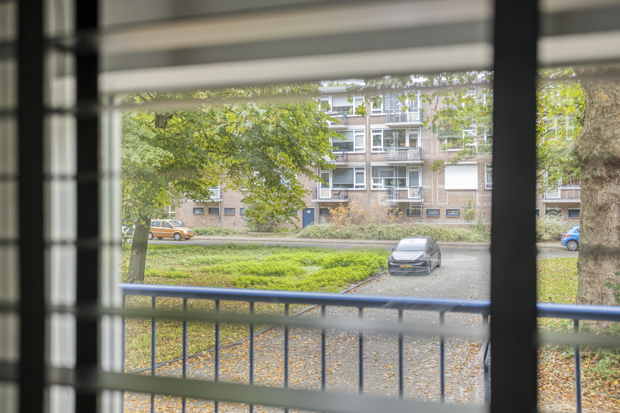 1e (Woon)verdieping: entree, hal met vaste kast, meterkast en toilet voorzien van wandcloset. Ruime, strak afgewerkte doorzonwoonkamer met aparte eet- en zithoek en toegang tot het zonnige balkon. Nette keuken voorzien van 4-pits gaskookplaat, afzuigkap, koelkast en vaste kast t.b.v. van wasapparatuur. Nette slaapkamer ter grootte van circa 8,5 m² met vaste kast. Nette badkamer met wastafel en inloop regendouche.