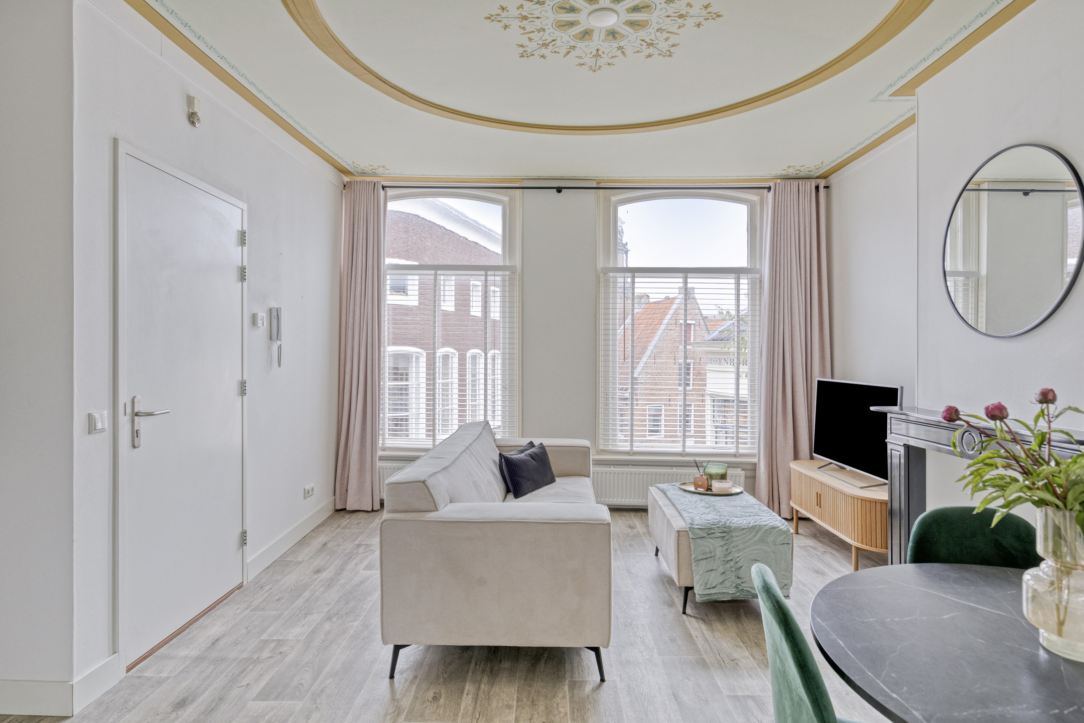 Wat een uitzicht! Vanuit het appartement kijk je fraai op een levendige en karakteristieke omgeving met monumentale panden en de prachtige Wijnhuistoren op de achtergrond.