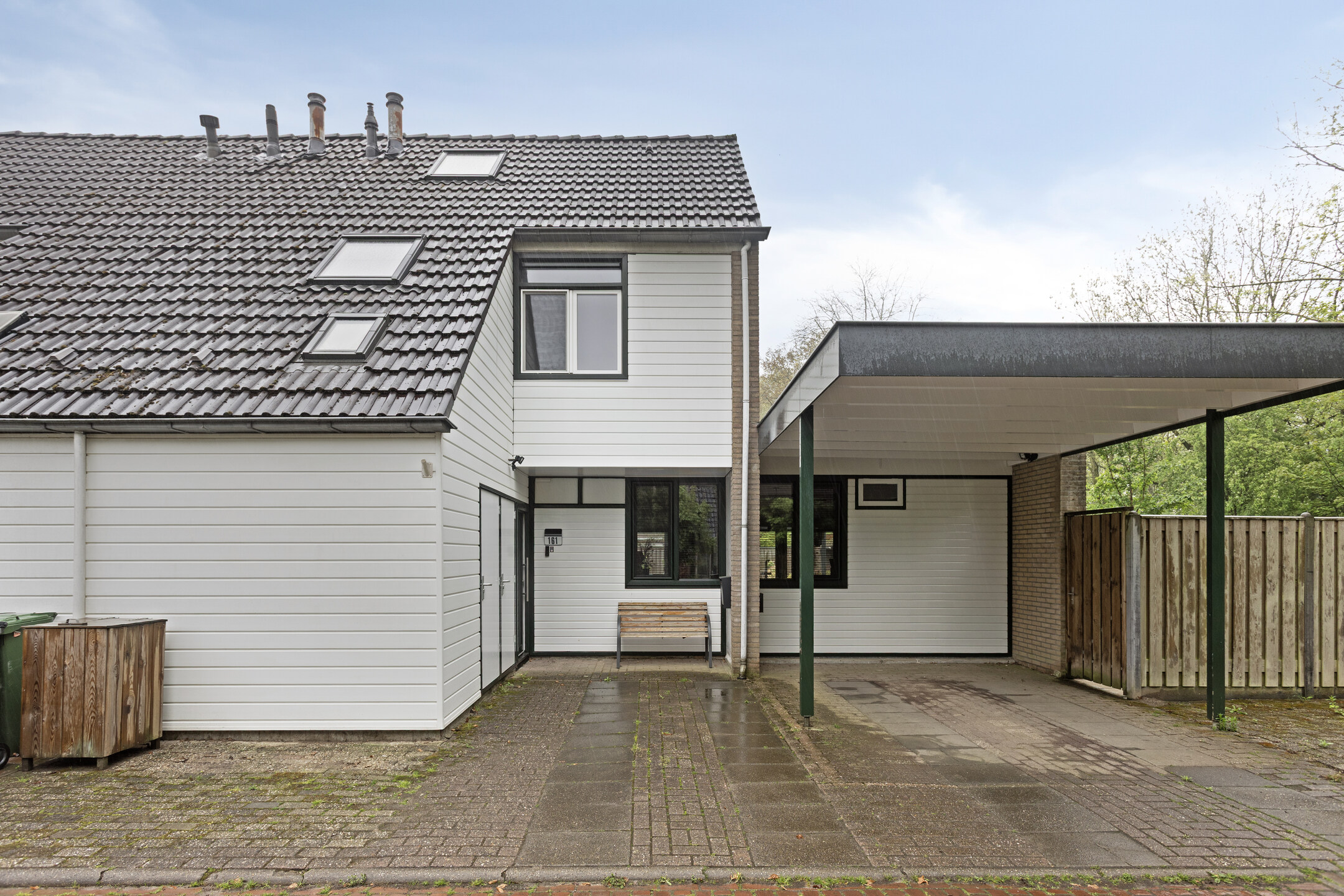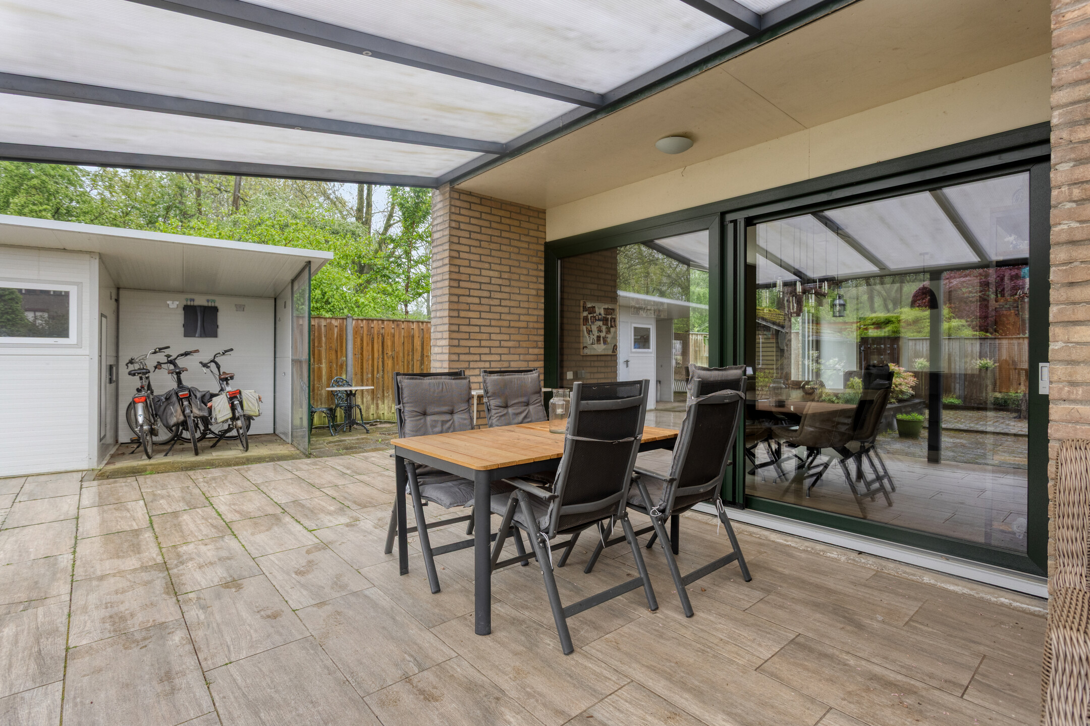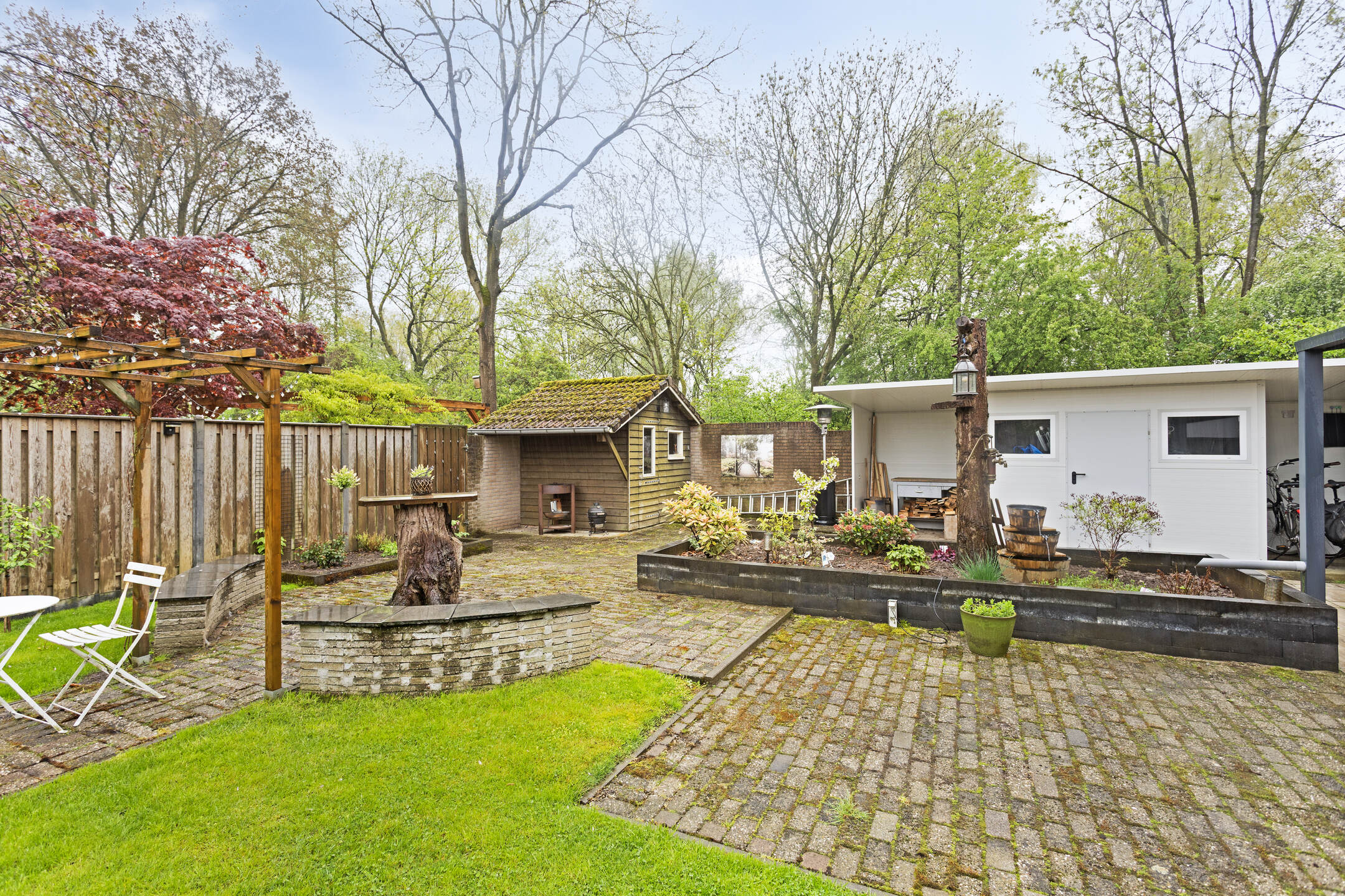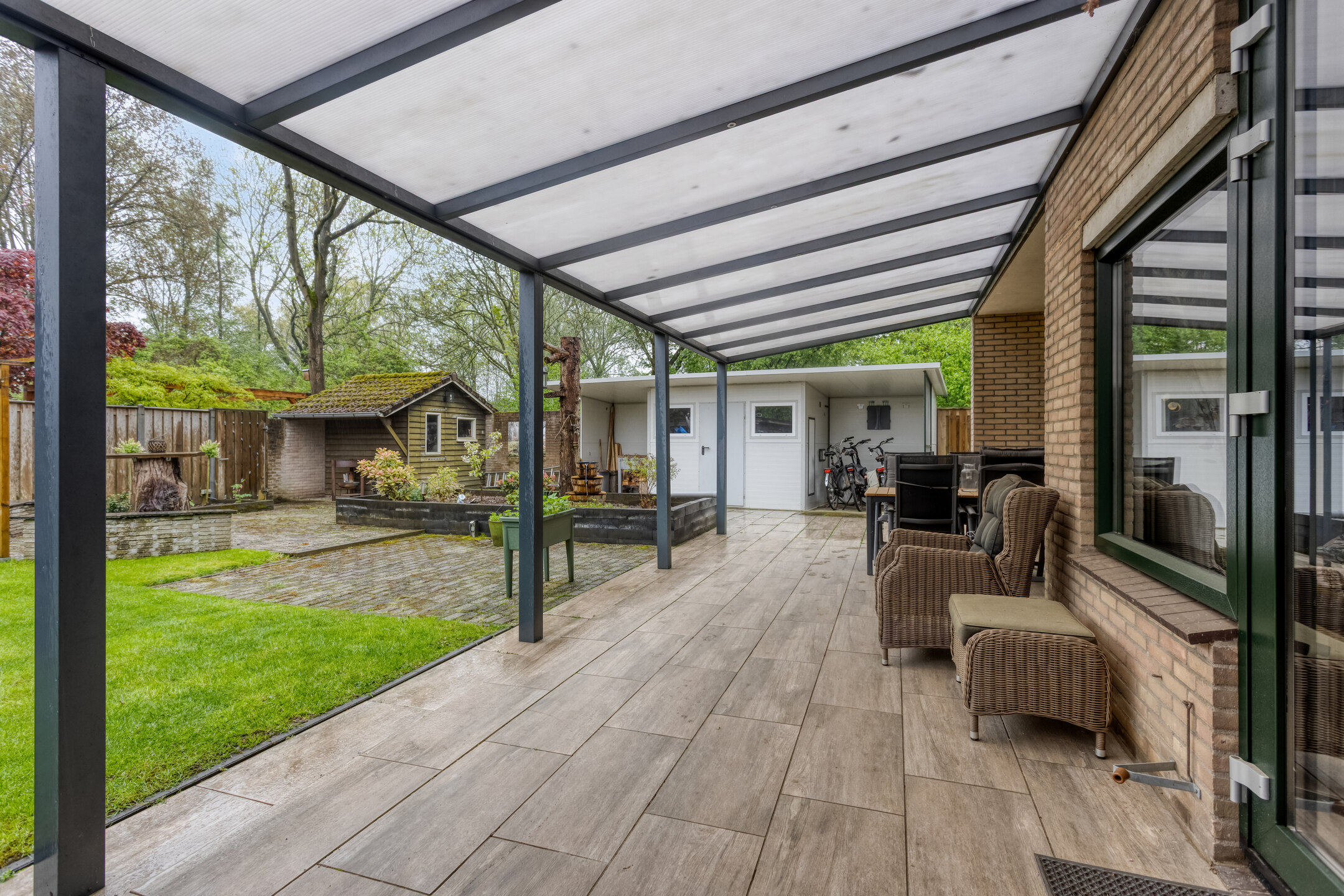 Riante achter-/zijtuin, met overdekt terras aan de achtergevel, gazon, sierbestrating, borders, twee bergingen en achterom. Voor het huis is parkeerruimte op eigen terrein voor drie personenauto’s waarvan één onder de carport!