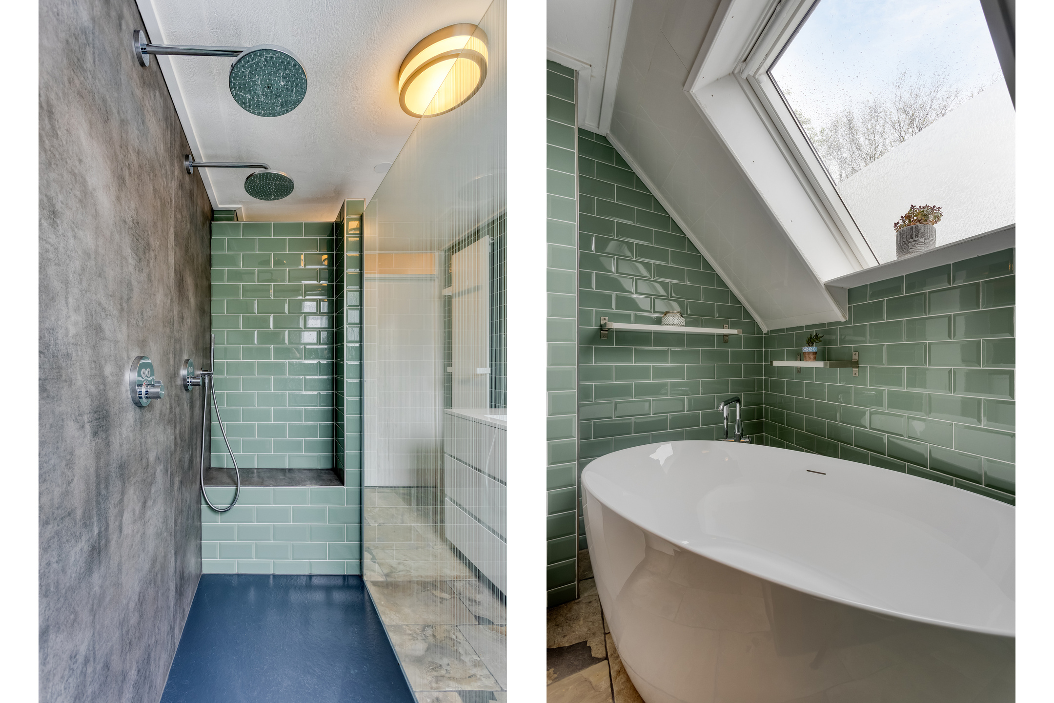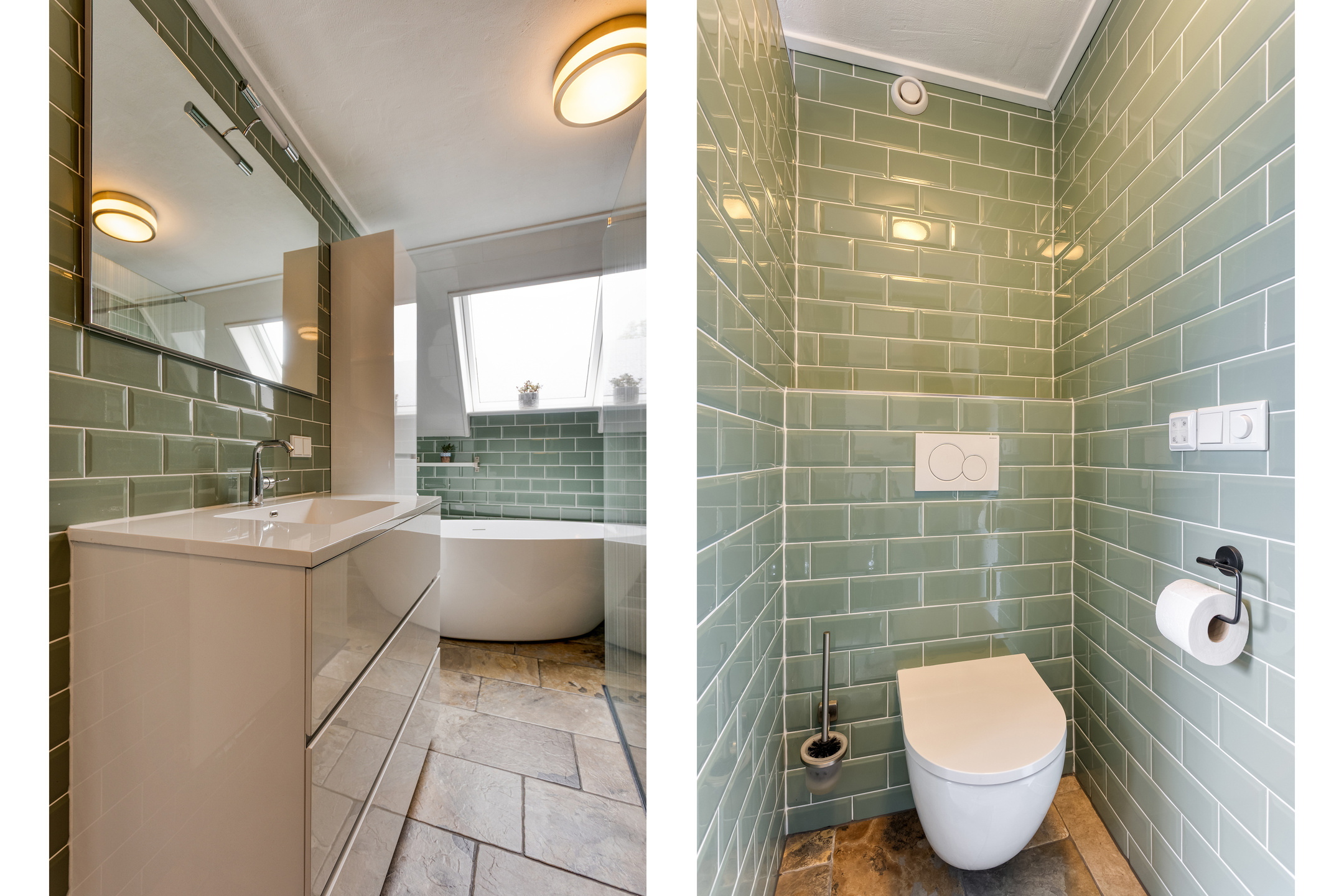 1e Verdieping: overloop. Twee ruime slaapkamers ter grootte van circa 13 m² en 22 m². Het is mogelijk om een derde slaapkamer te realiseren. Luxe badkamer voorzien van dubbele regendouche, wastafelmeubel, ligbad en wastafelmeubel.