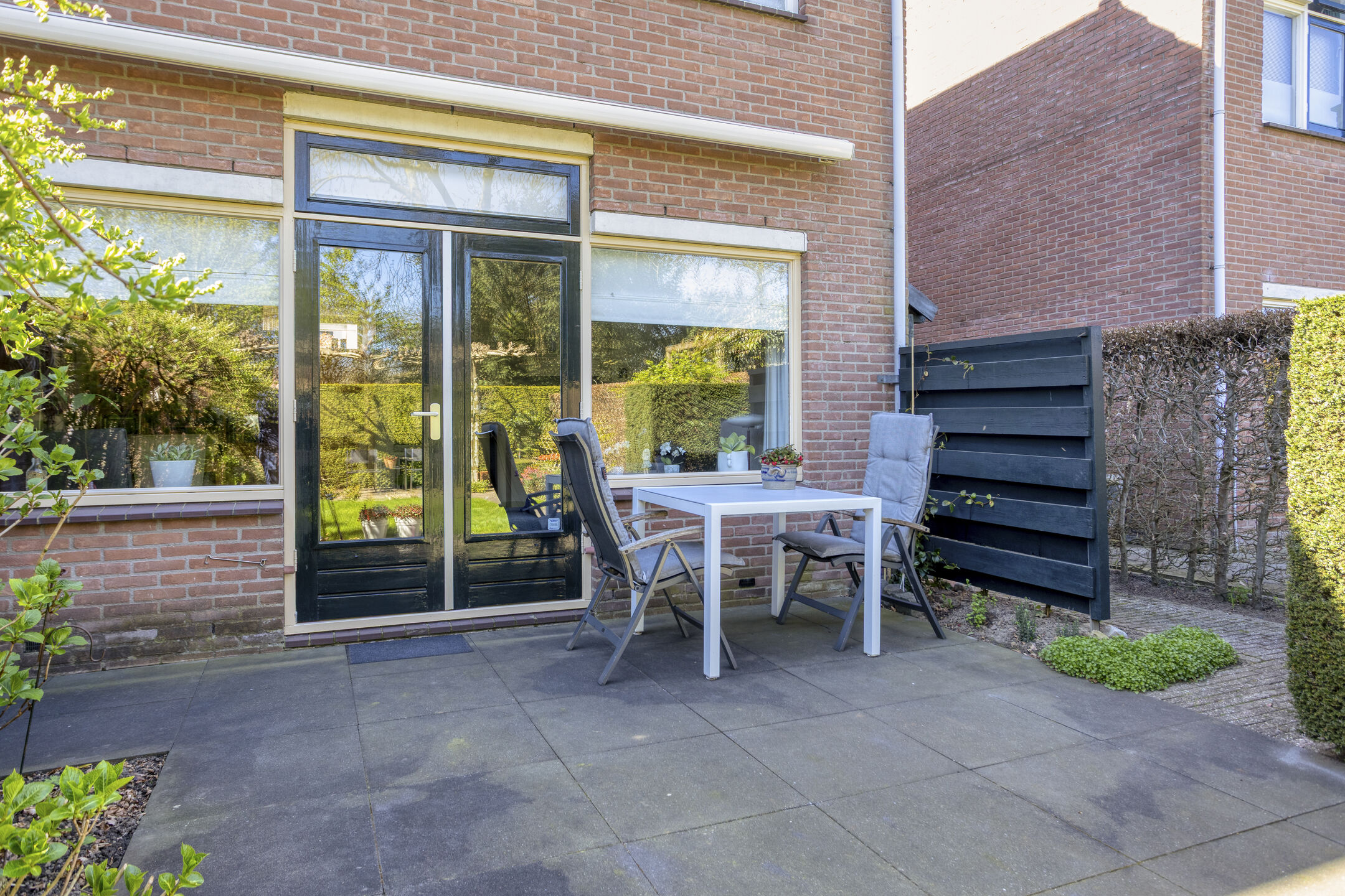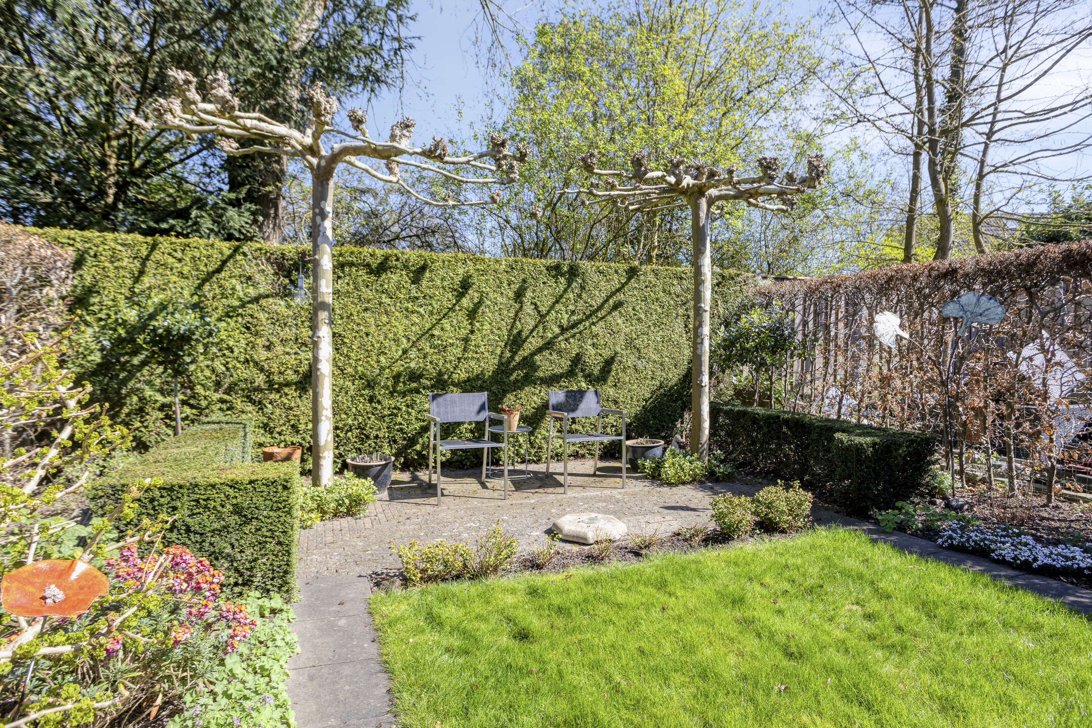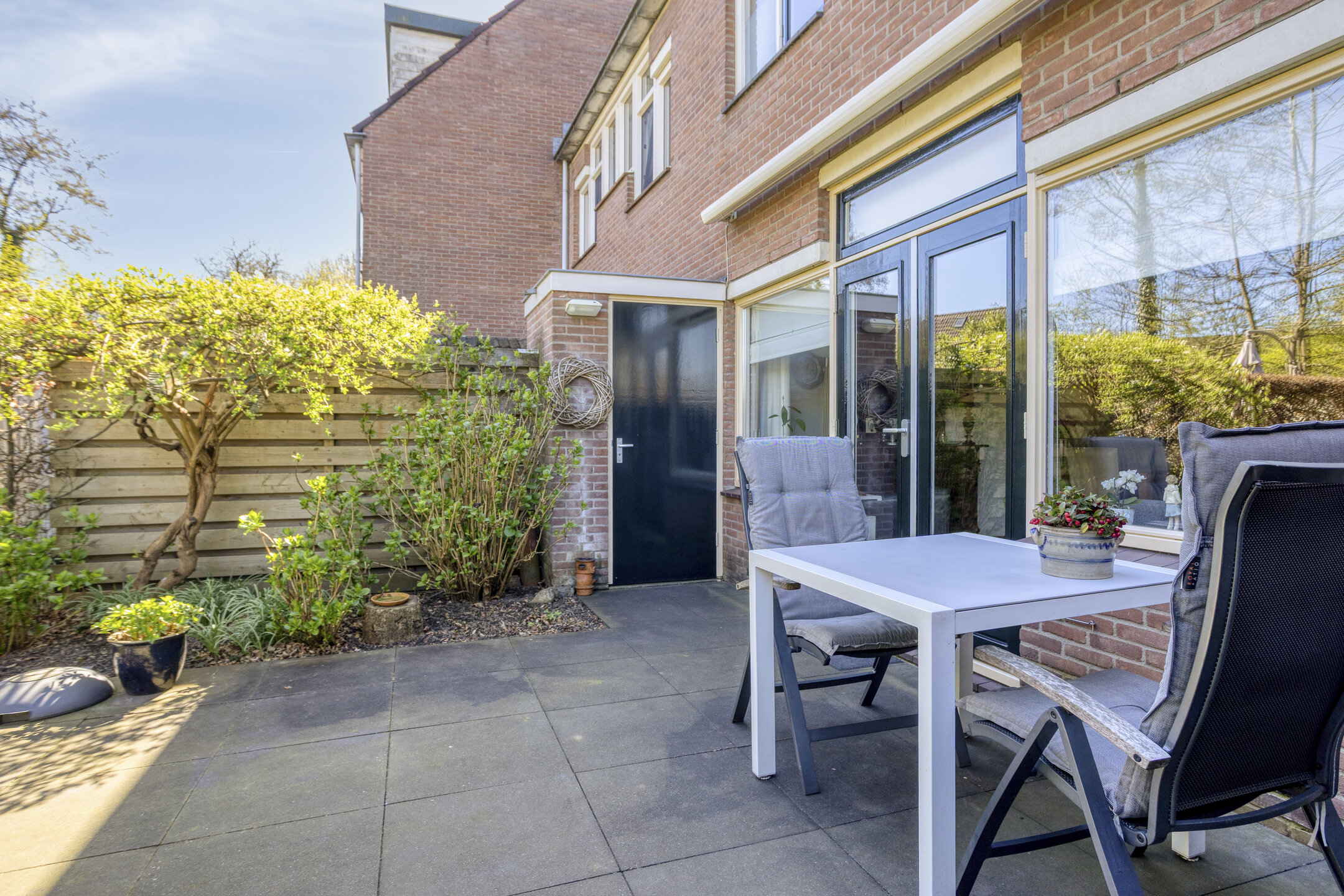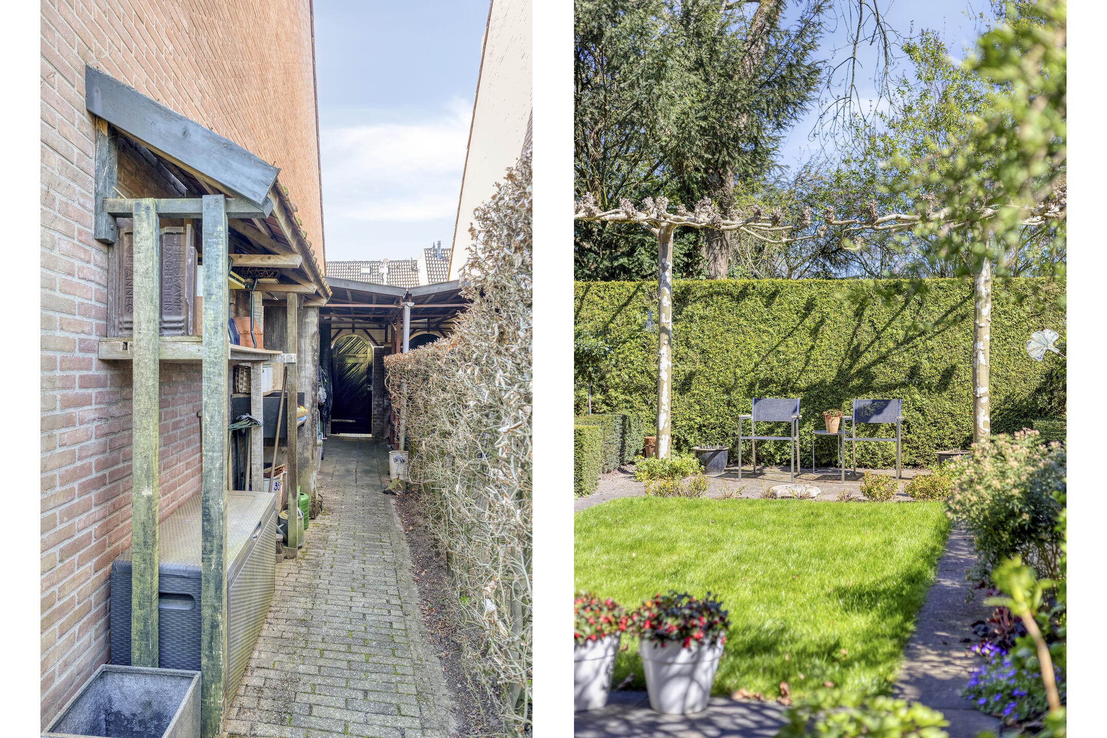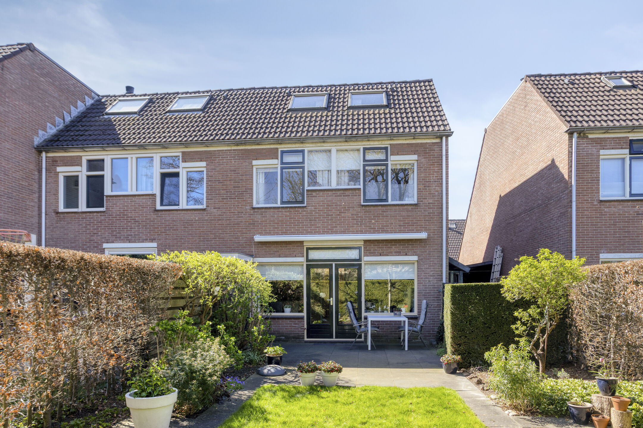 Keurig aangelegde achtertuin op het oosten met terras tegen de achtergevel voorzien van elektrisch zonnescherm, gazon, meerdere borders en een gezellig zitje onder de dakplataan. De tuin is achterom te bereiken langs de woning. Aan de voorzijde is parkeerruimte voor één personenauto op eigen terrein.
