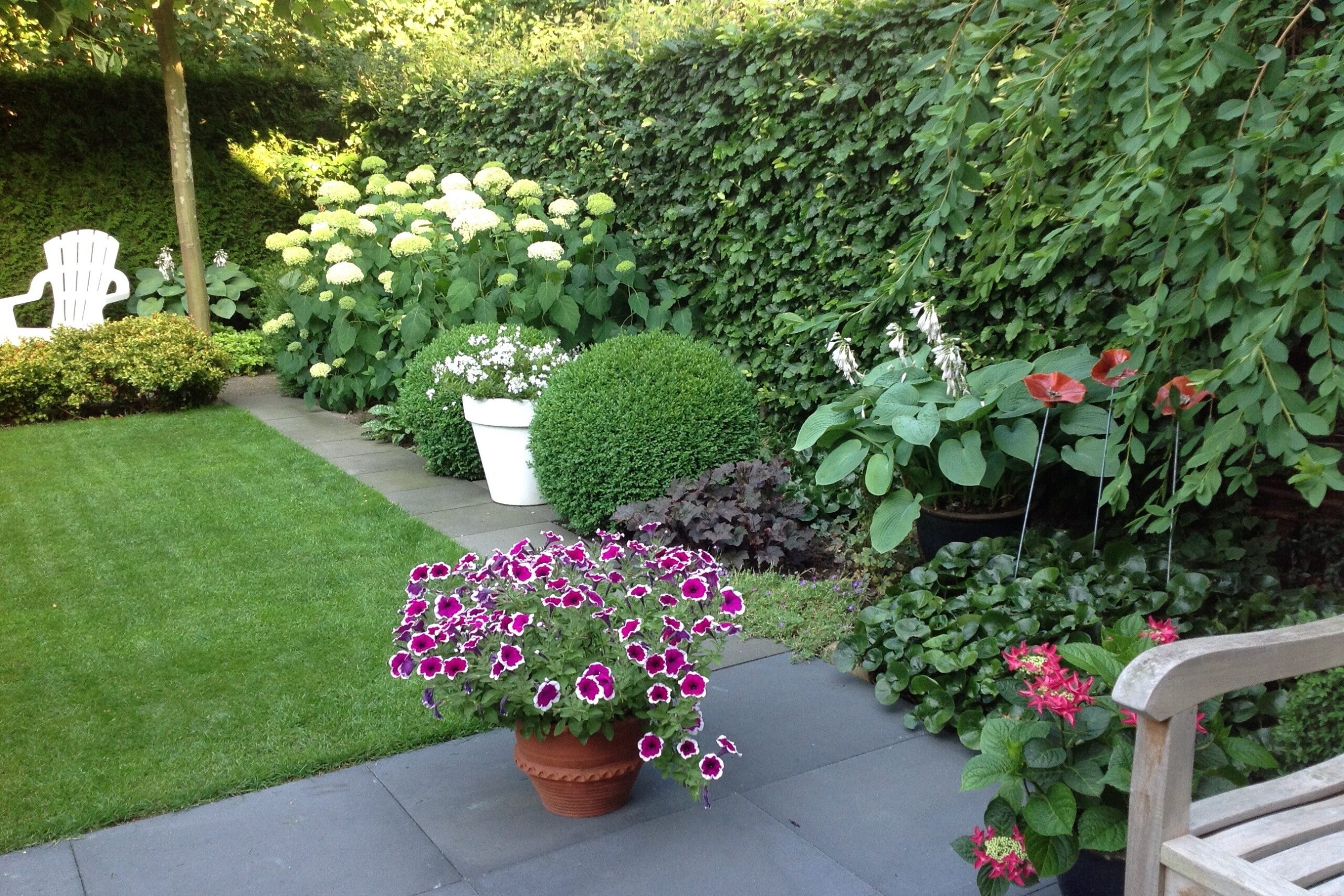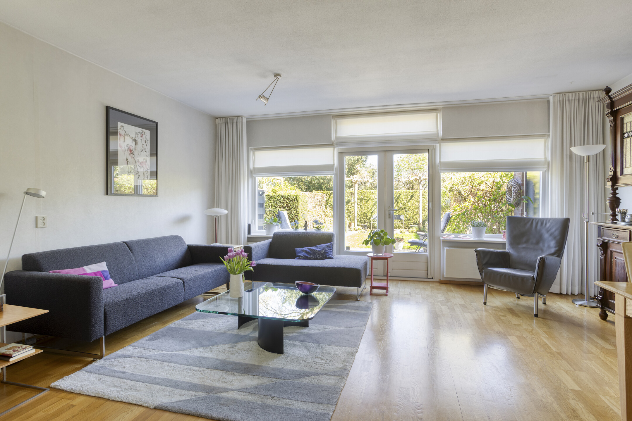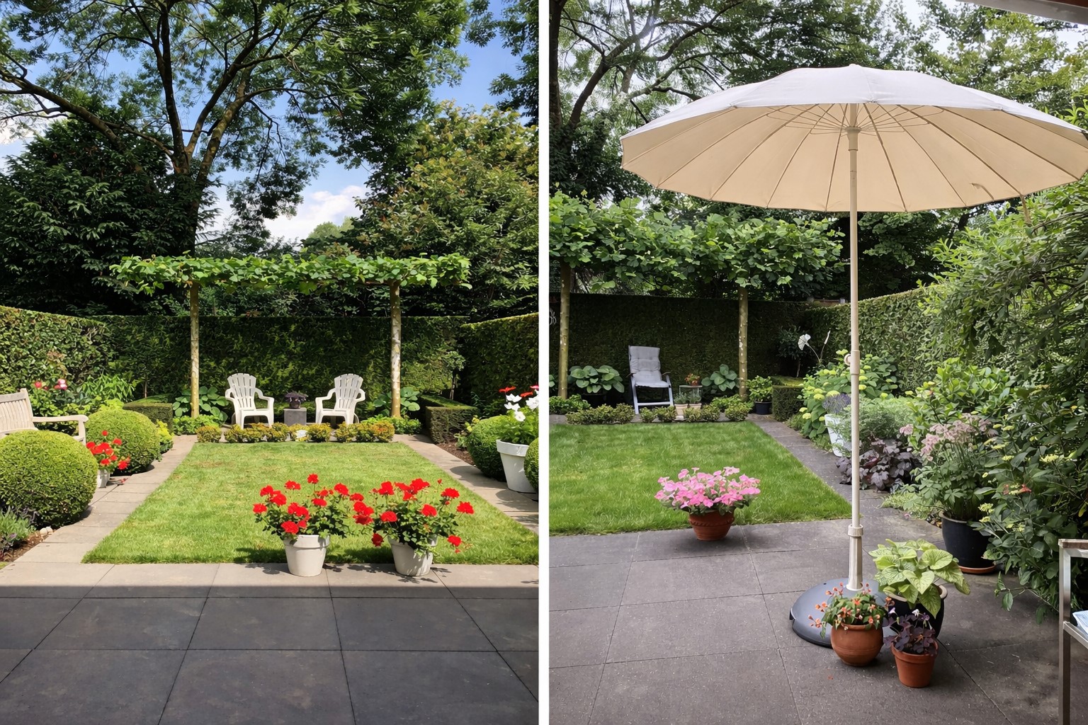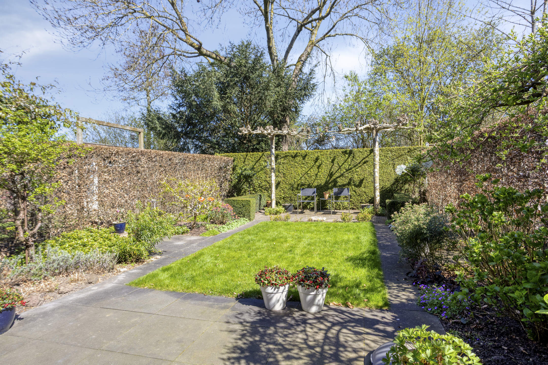 Keurig aangelegde achtertuin op het oosten met terras tegen de achtergevel voorzien van elektrisch zonnescherm, gazon, meerdere borders en een gezellig zitje onder de dakplataan. De tuin is achterom te bereiken langs de woning. Aan de voorzijde is parkeerruimte voor één personenauto op eigen terrein.