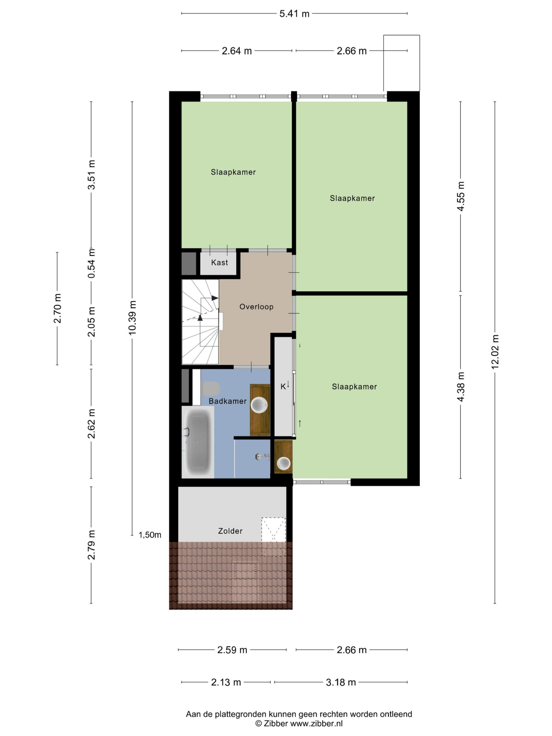 1e Verdieping: overloop. Drie slaapkamers waarvan één ter grootte van circa 9,5 m² en twee ter grootte van circa 12 m². Twee van de kamers beschikken over een vaste kast. Ruime badkamer voorzien van wandcloset, ligbad, douche en wastafel.