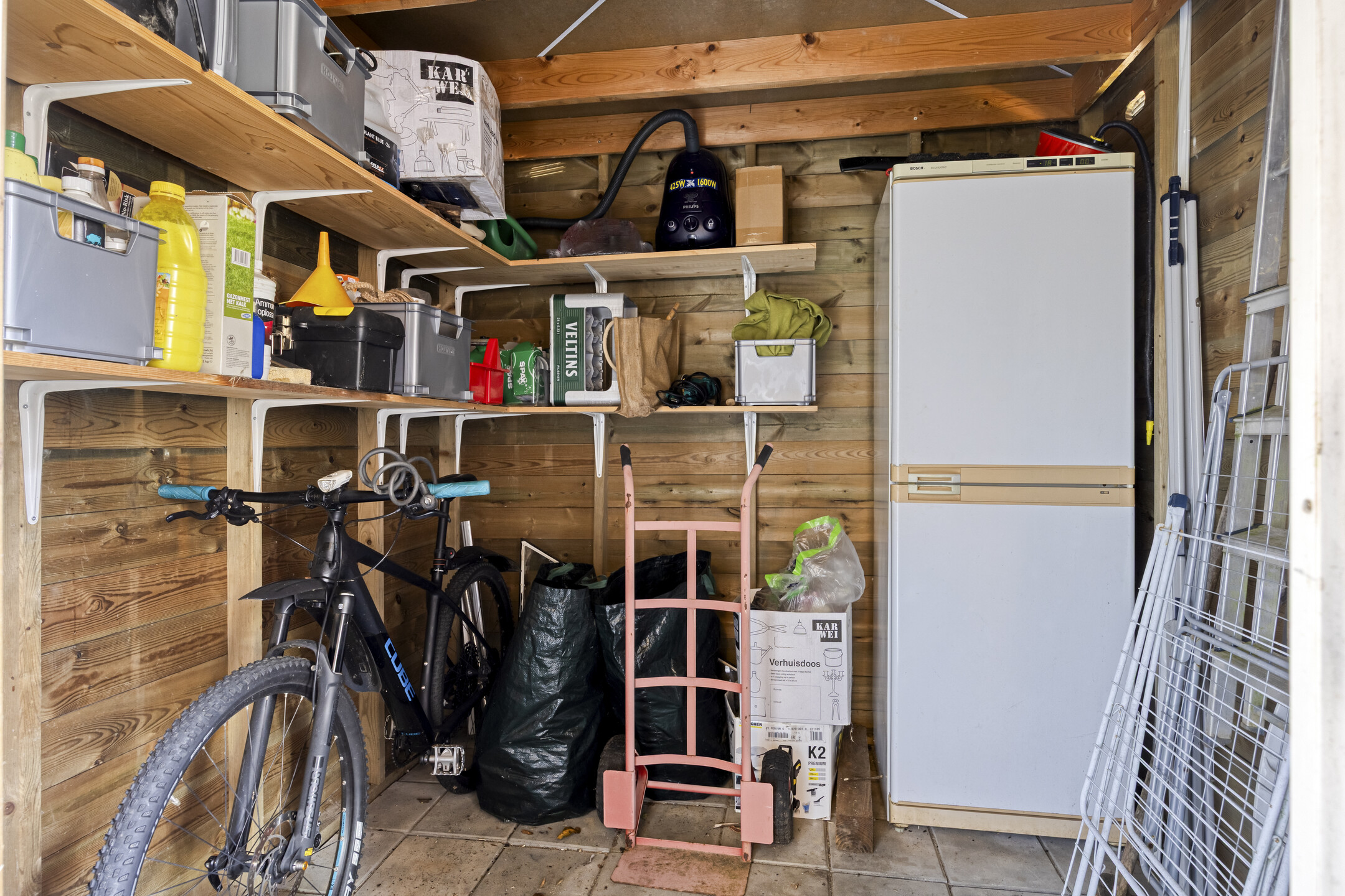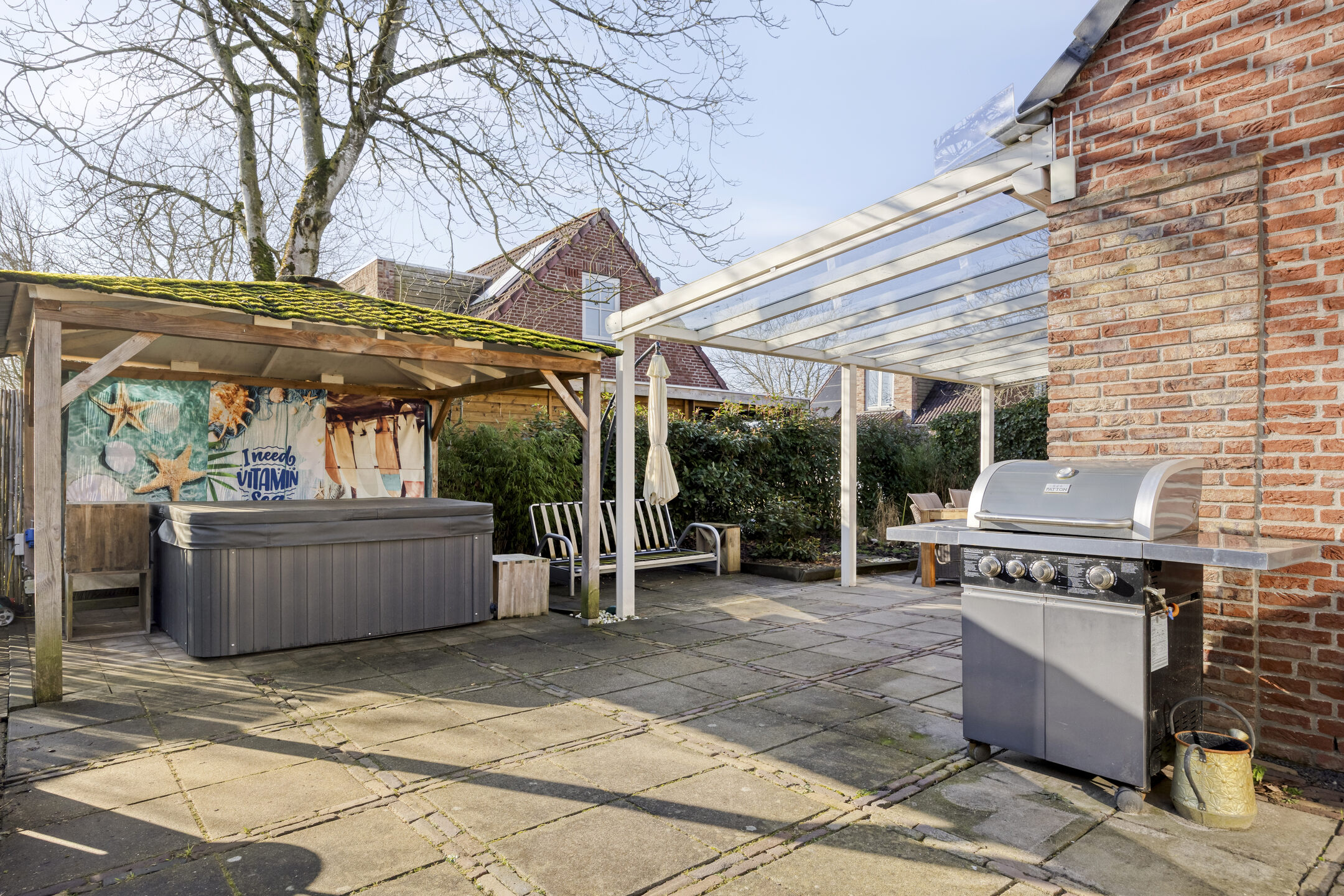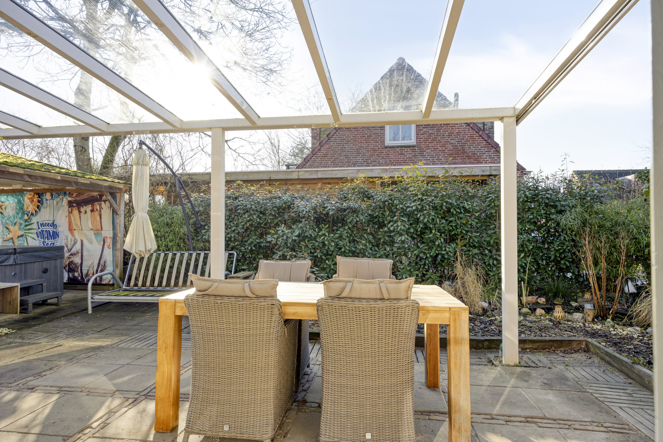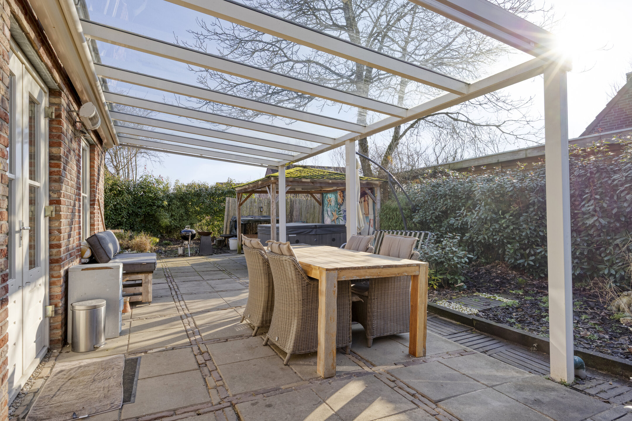 Fraai aangelegde tuin rondom met gazon, riante veranda, overkapping met jacuzzi (ter overname), zonneterras, borders en houten berging met carport. Aan de zuidoost kant van het perceel is een strook grond van ca. 75 m² in bruikleen en door verkoper aangeplant. Er is parkeerruimte voor drie personenauto’s op eigen terrein.