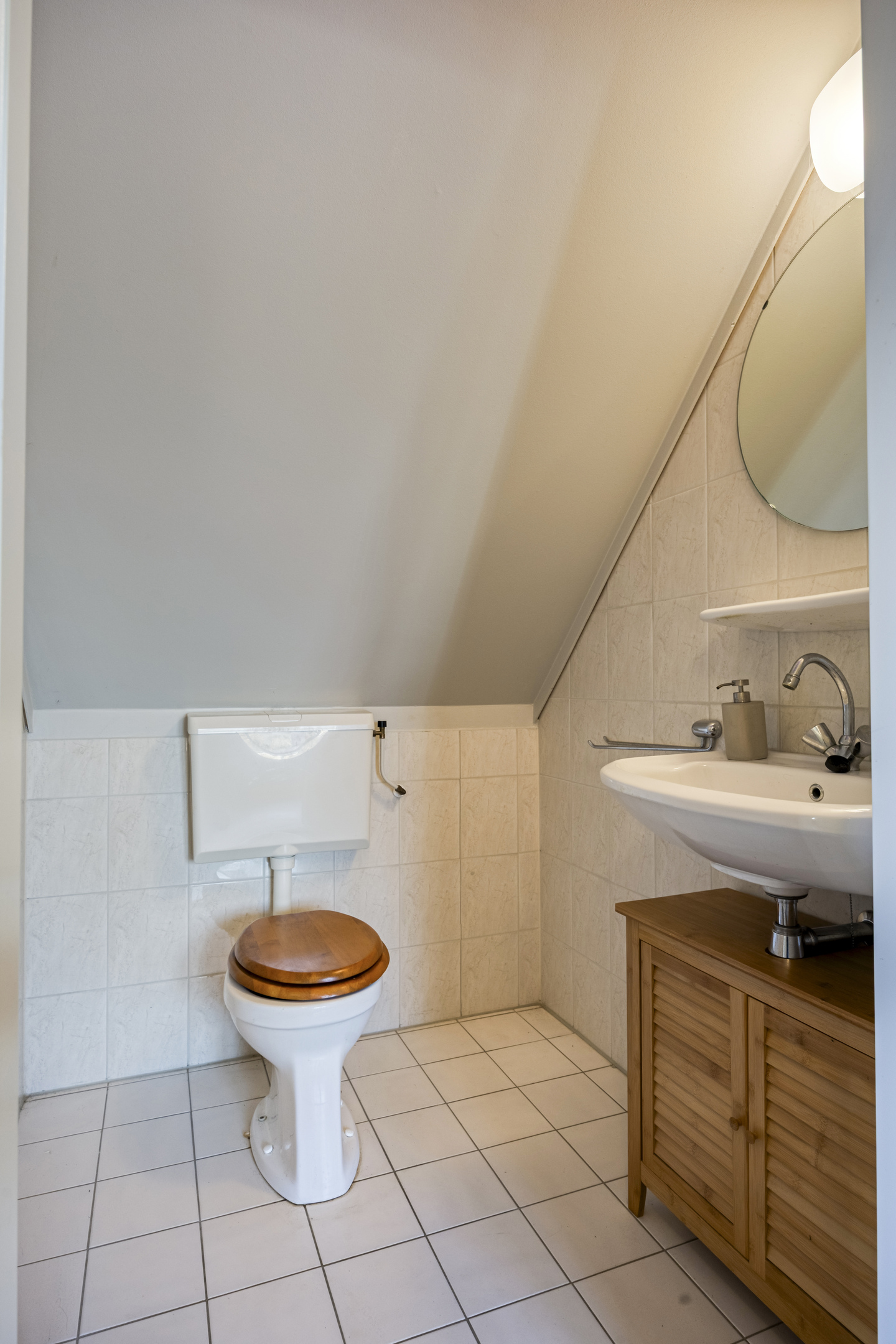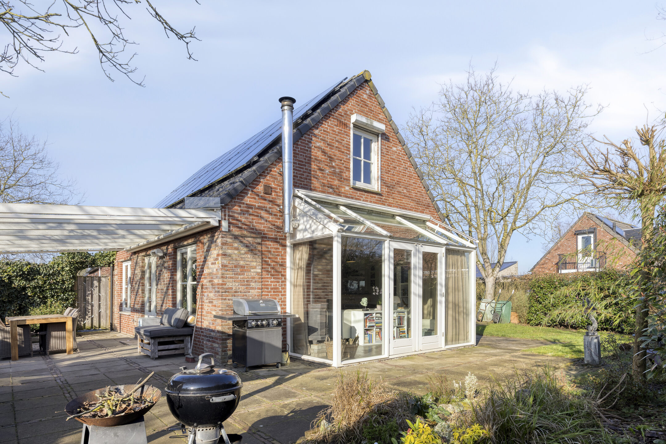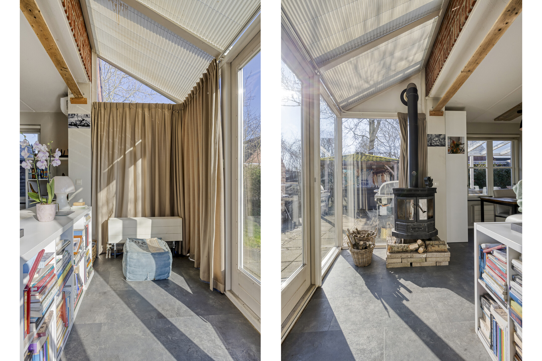 Begane grond: entree, hal met trapopgang naar de 1e verdieping, toilet voorzien van wandcloset en fonteintje en toegang tot de berging met aansluiting voor de wasapparatuur en tuindeur. Lichte woonkamer met houtkachel, gashaard, airconditioning en serre voorzien van openslaande tuindeuren en elektrische zonnewering. Open keuken in L-opstelling met openslaande deuren naar veranda, voorzien van 4-pits gaskookplaat, afzuigkap, combi-oven, koel-vriescombinatie en vaatwasser. Slaap/werkkamer ter grootte van circa 6 m². Badkamer voorzien van ligbad met douche en wastafelmeubel.