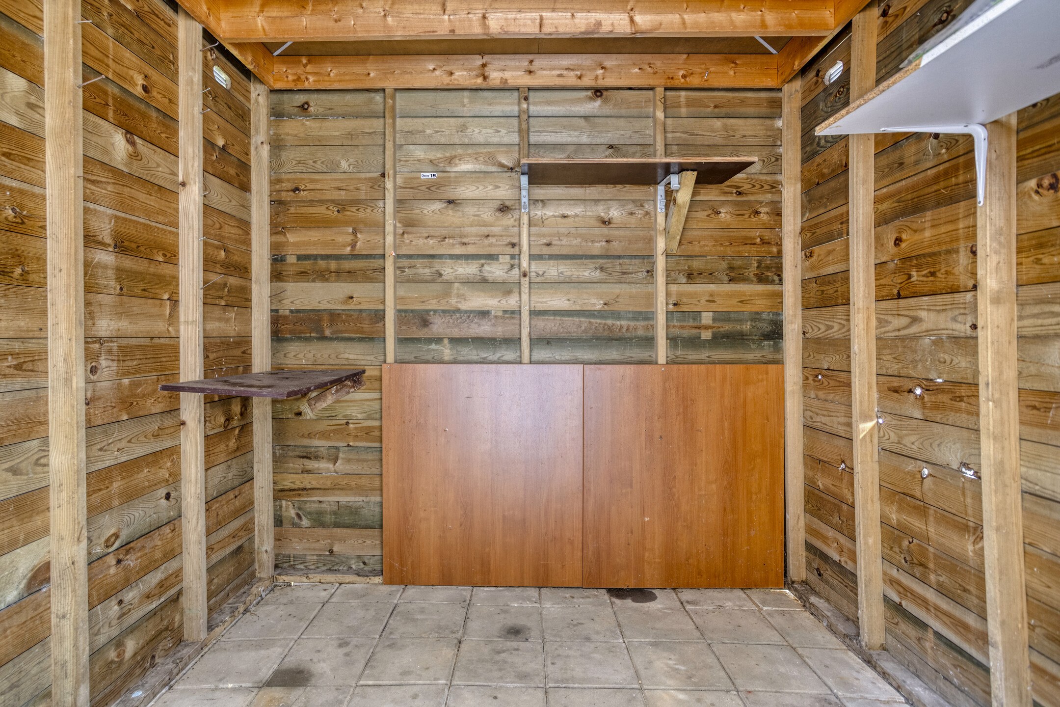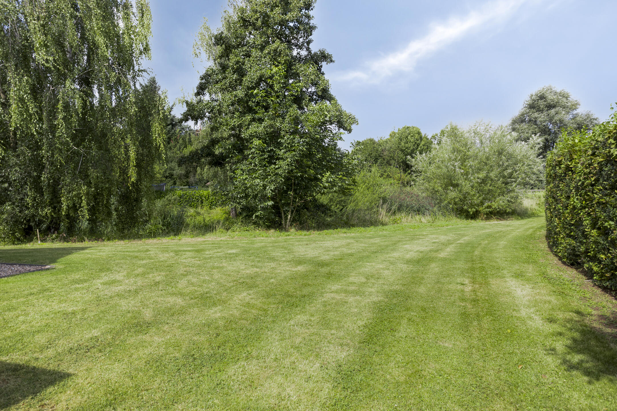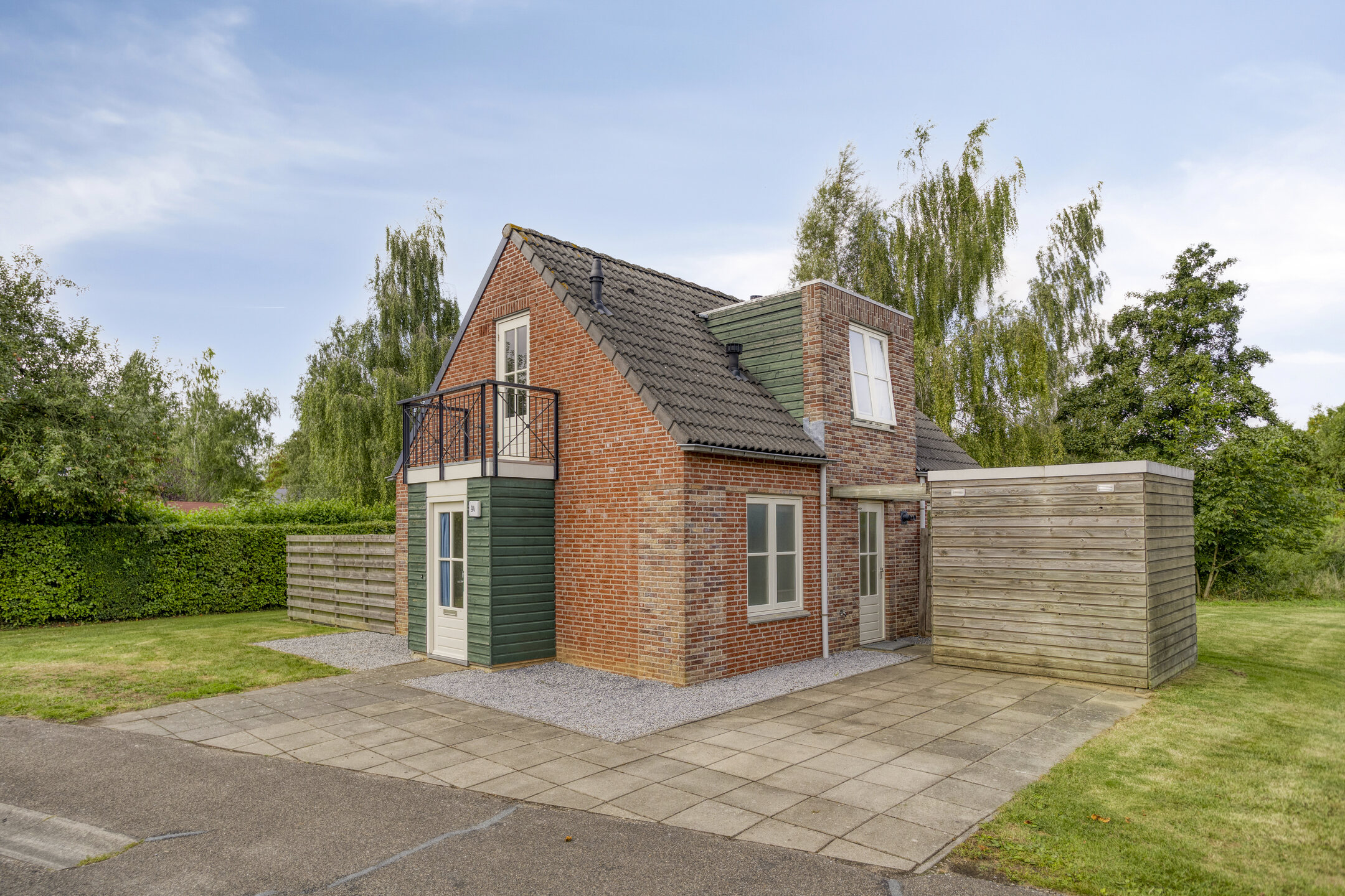 De woning beschikt over een riante tuin rondom met veel gazon, bestraat terras bij de keuken, houten bergschuur en oprit voor één personenauto. Aan de achterzijde van het perceel stroomt de beek.