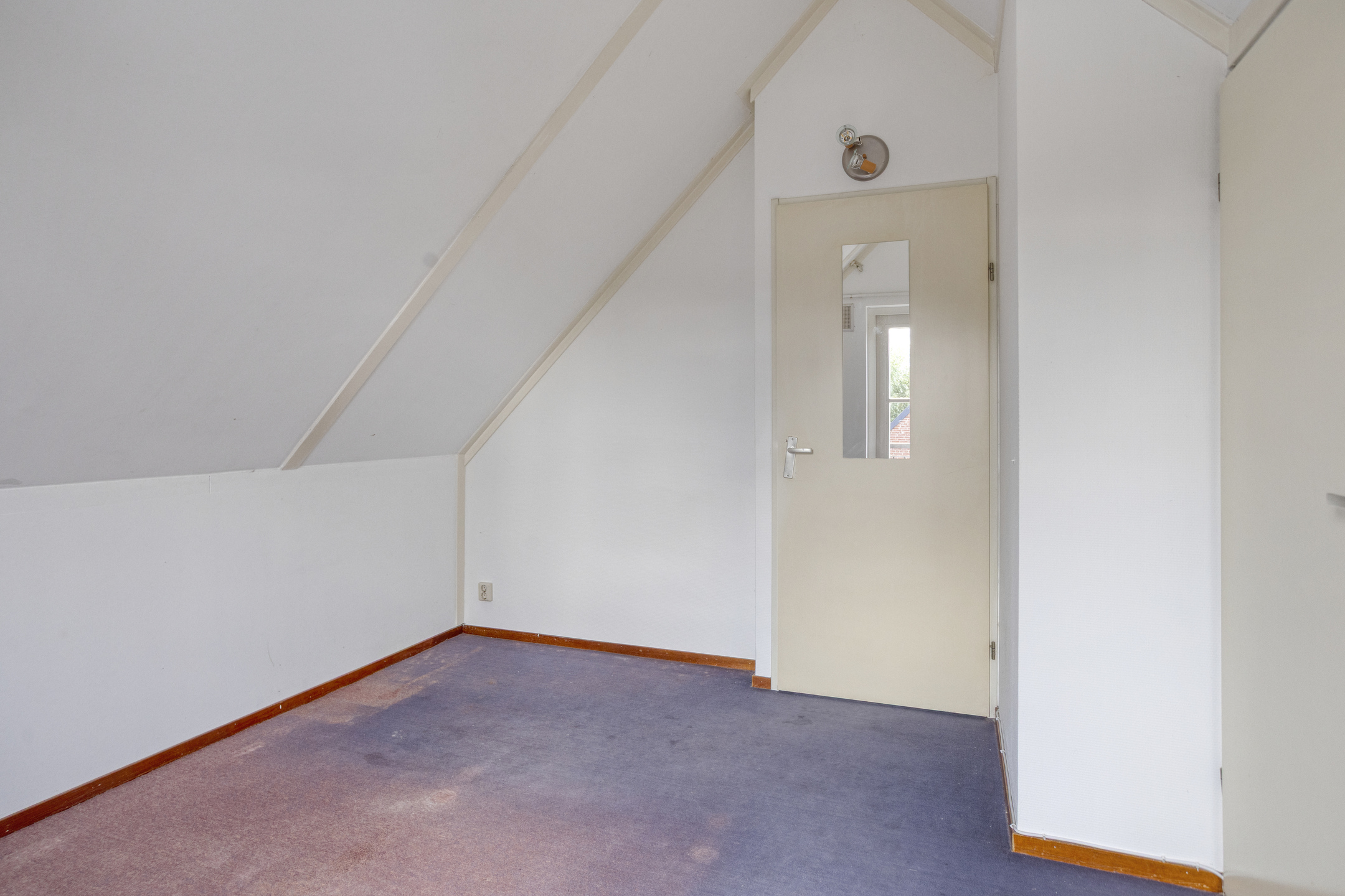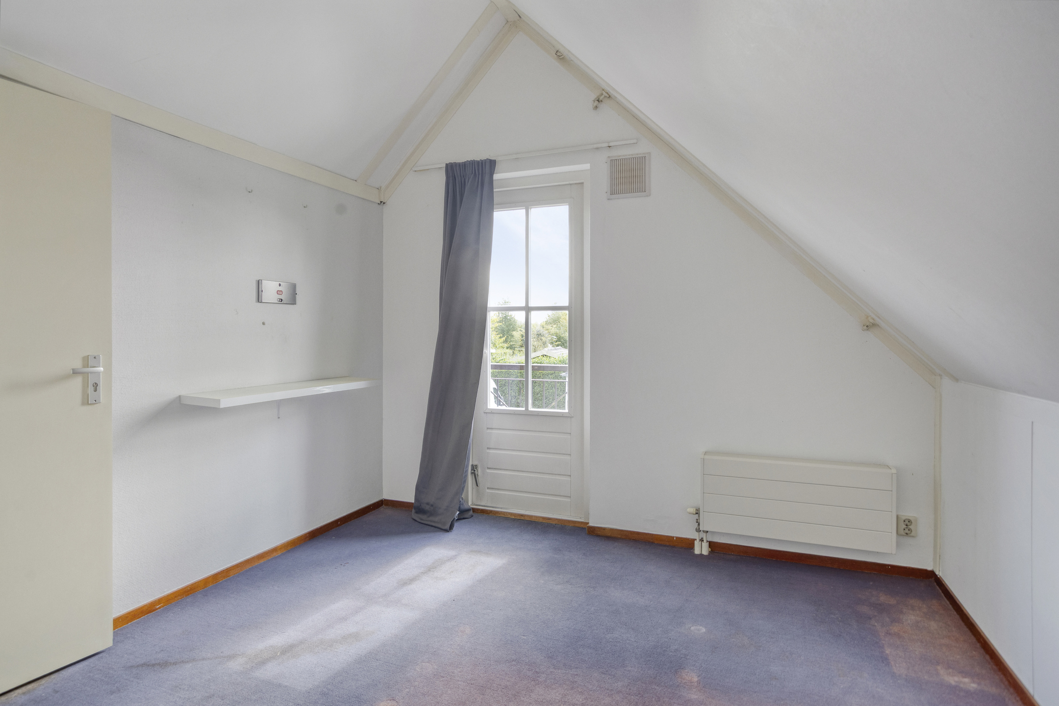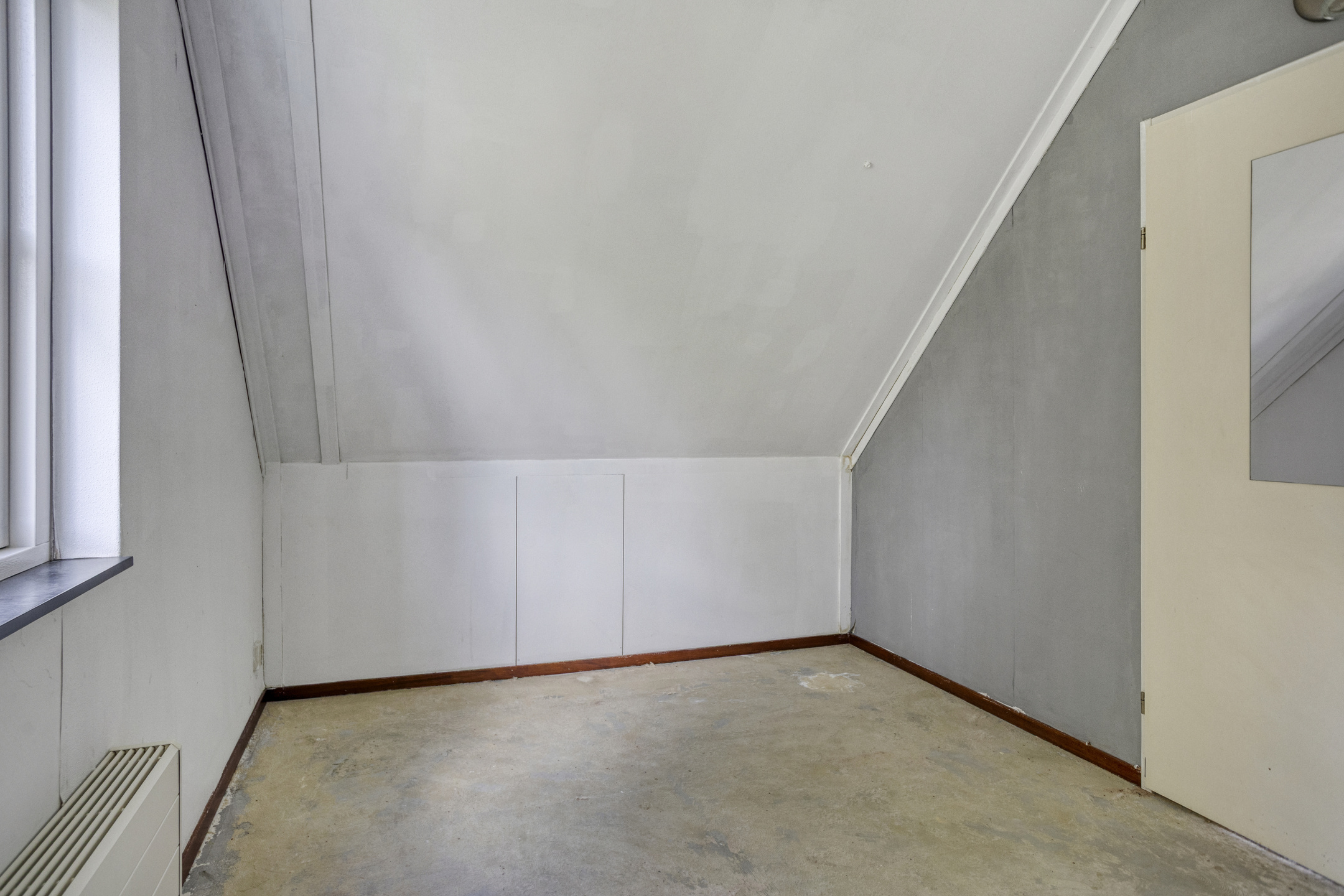 1e Verdieping: overloop met raam en toegang tot het 2e toilet voorzien van fonteintje. Twee slaapkamers ter grootte van circa 9,5 m² en 10 m², beiden voorzien van bergruimte achter de knieschotten. De slaapkamer aan de voorzijde biedt tevens toegang tot de installatieruimte (o.a. cv-ketel, mechanische ventilatie, zonneboiler en omvormer) en het balkon.