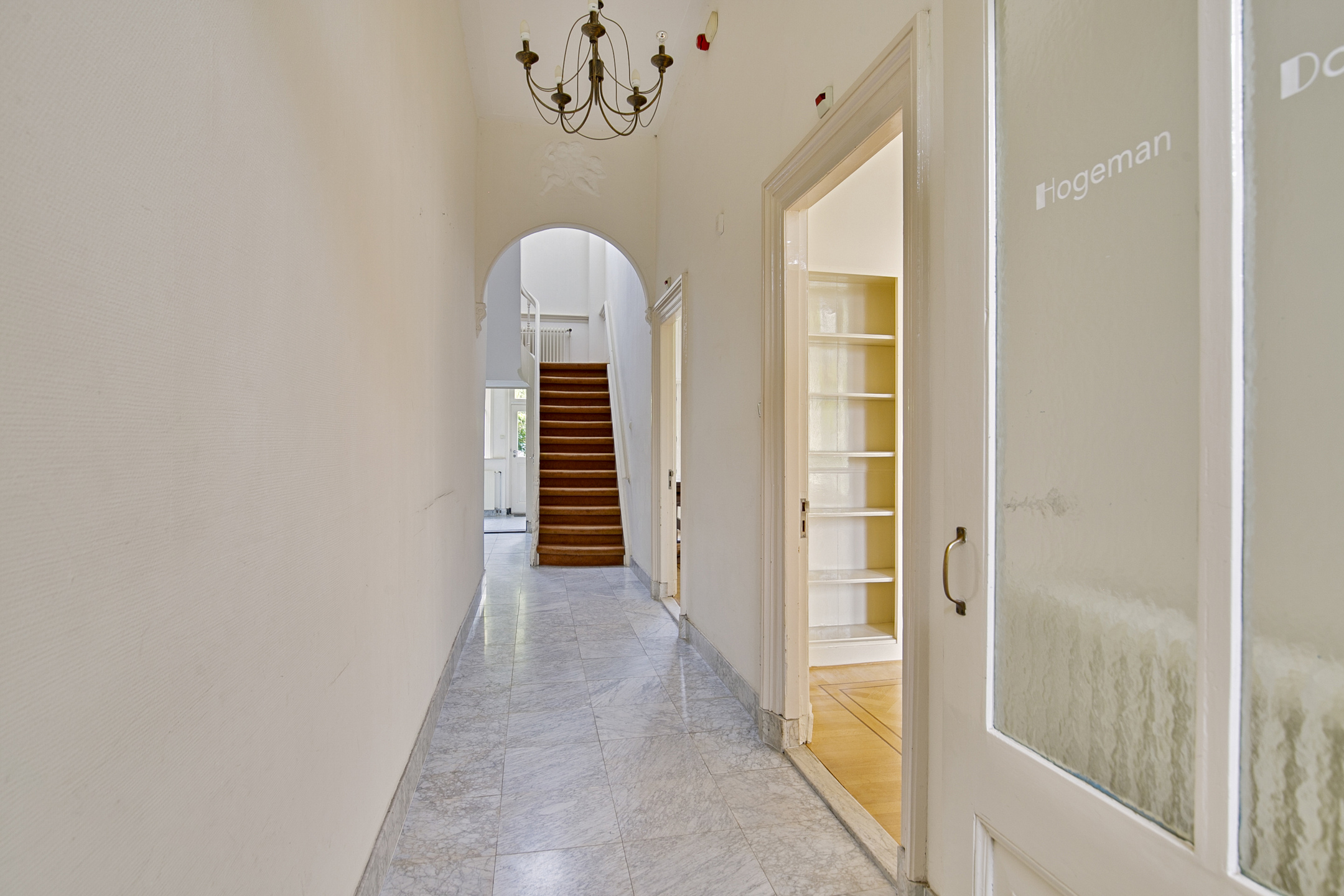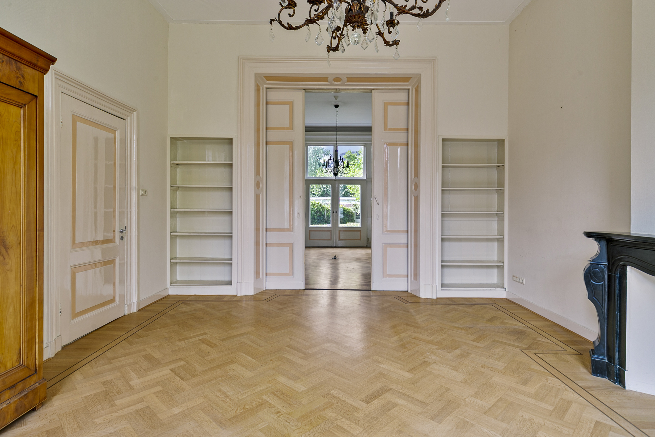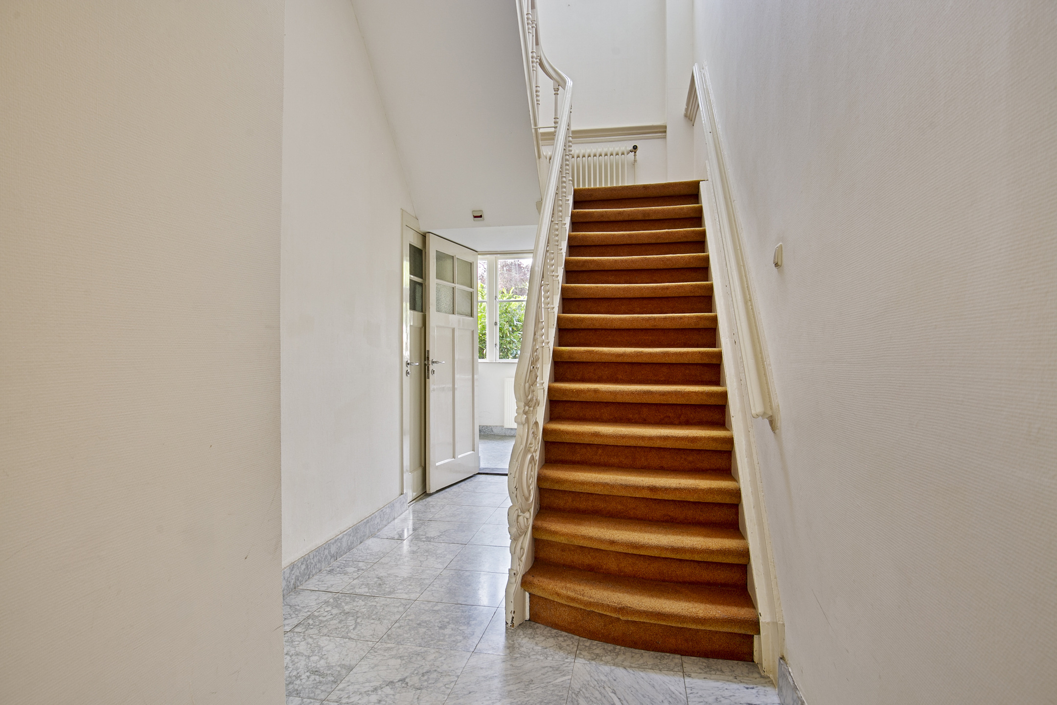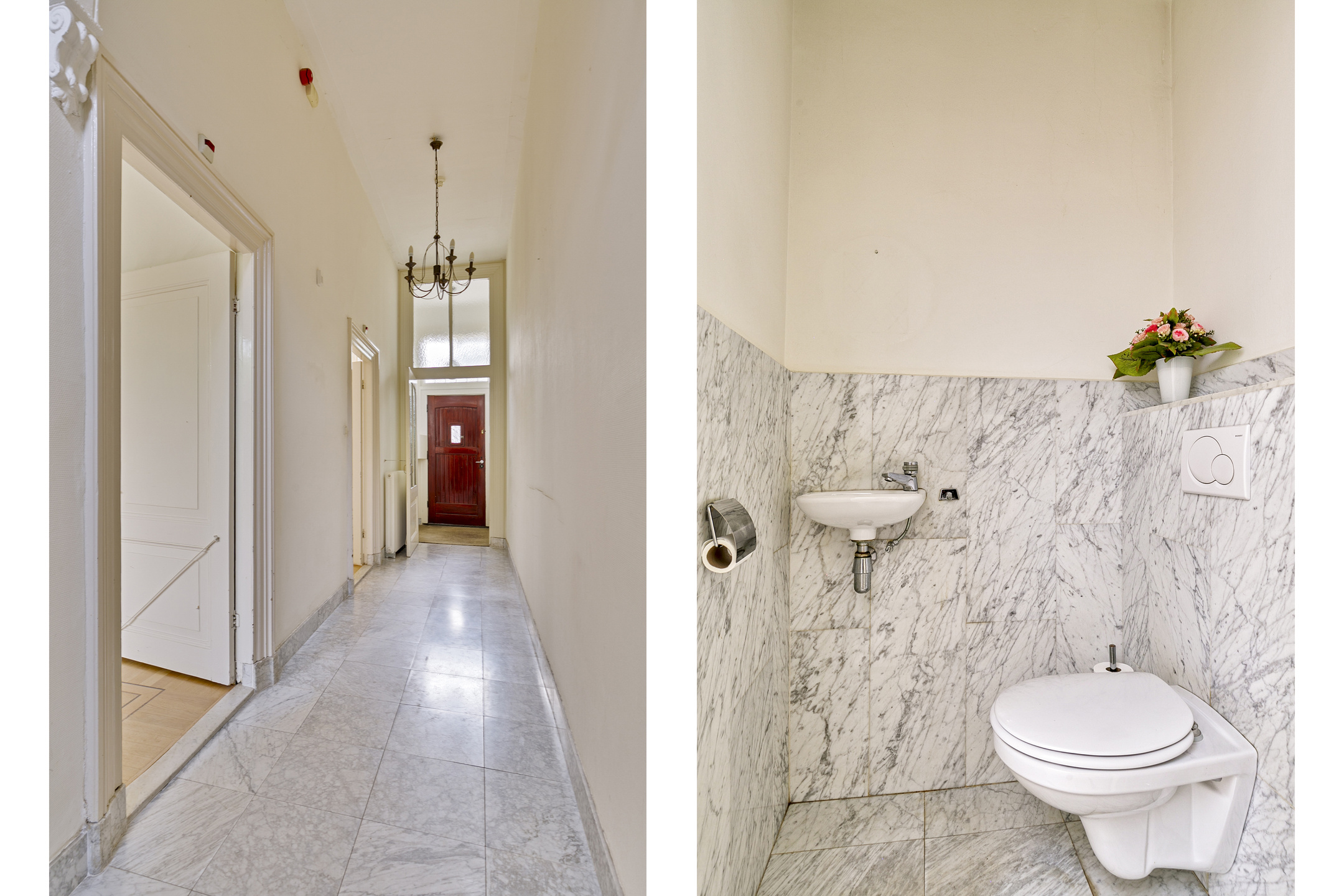 Begane grond: Entree, vestibule, lange hal met marmeren vloer, trapopgang naar de 1e verdieping, hangend toilet met fonteintje en toegang tot de kelder. Woonkamer-en-suite met visgraat parketvloer, vaste kasten, stucplafonds, schouw en openslaande tuindeuren. Dichte keuken met marmeren vloer en tuindeur.