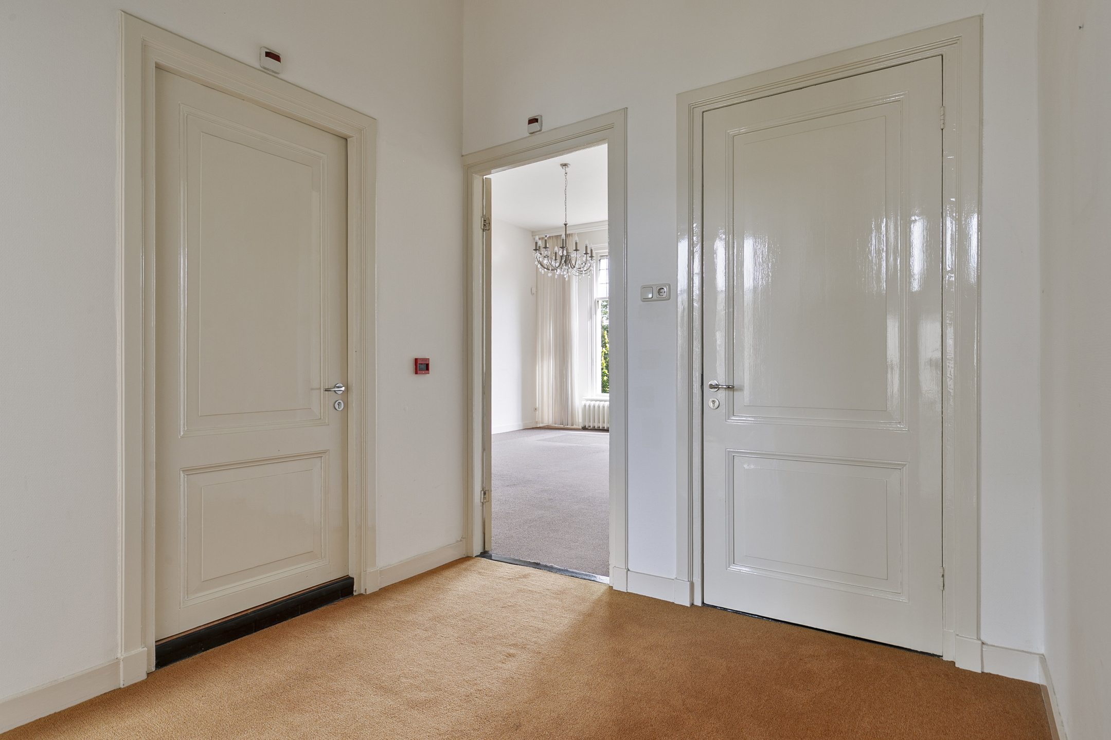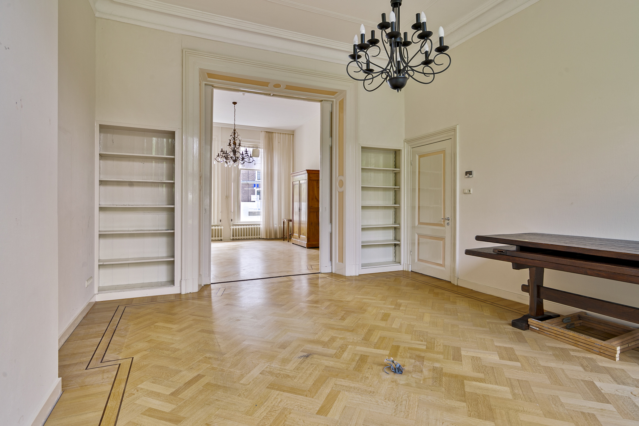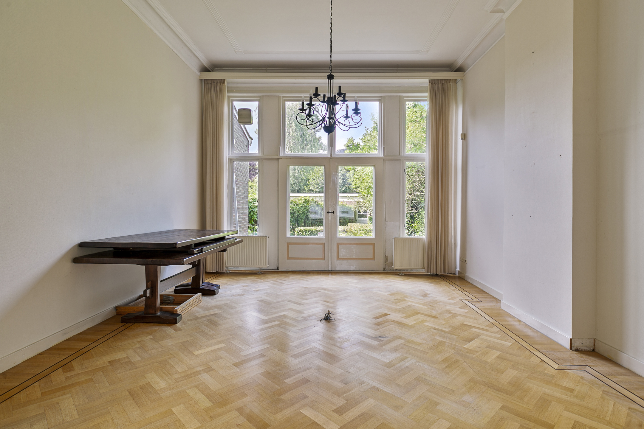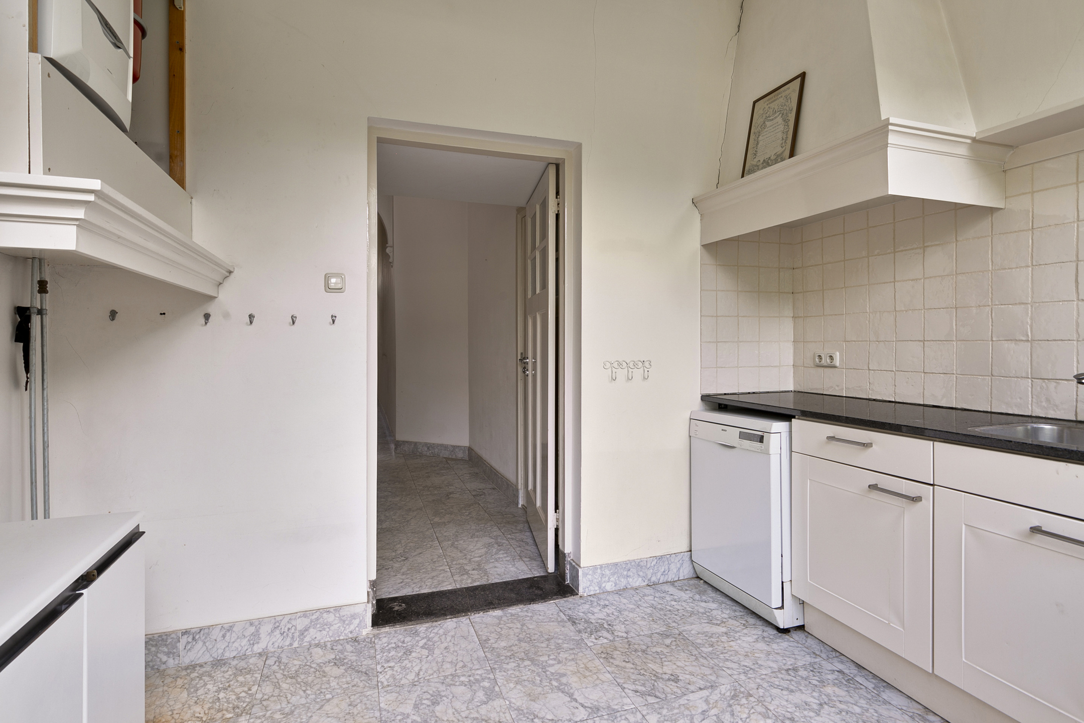 Begane grond: Entree, vestibule, lange hal met marmeren vloer, trapopgang naar de 1e verdieping, hangend toilet met fonteintje en toegang tot de kelder. Woonkamer-en-suite met visgraat parketvloer, vaste kasten, stucplafonds, schouw en openslaande tuindeuren. Dichte keuken met marmeren vloer en tuindeur.