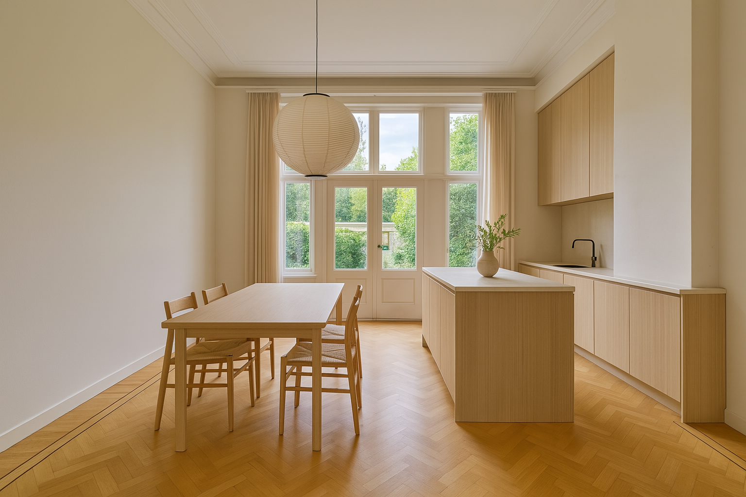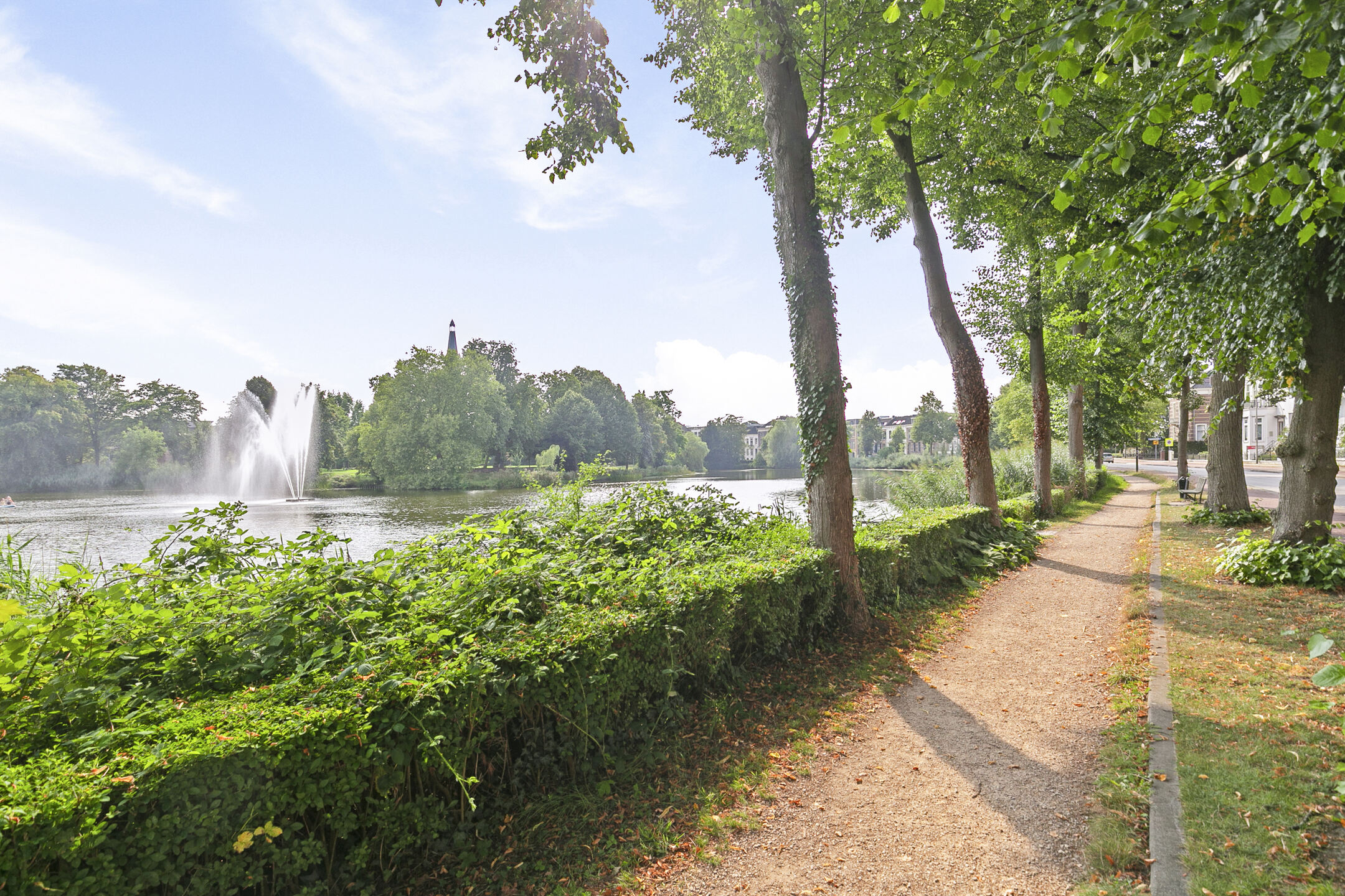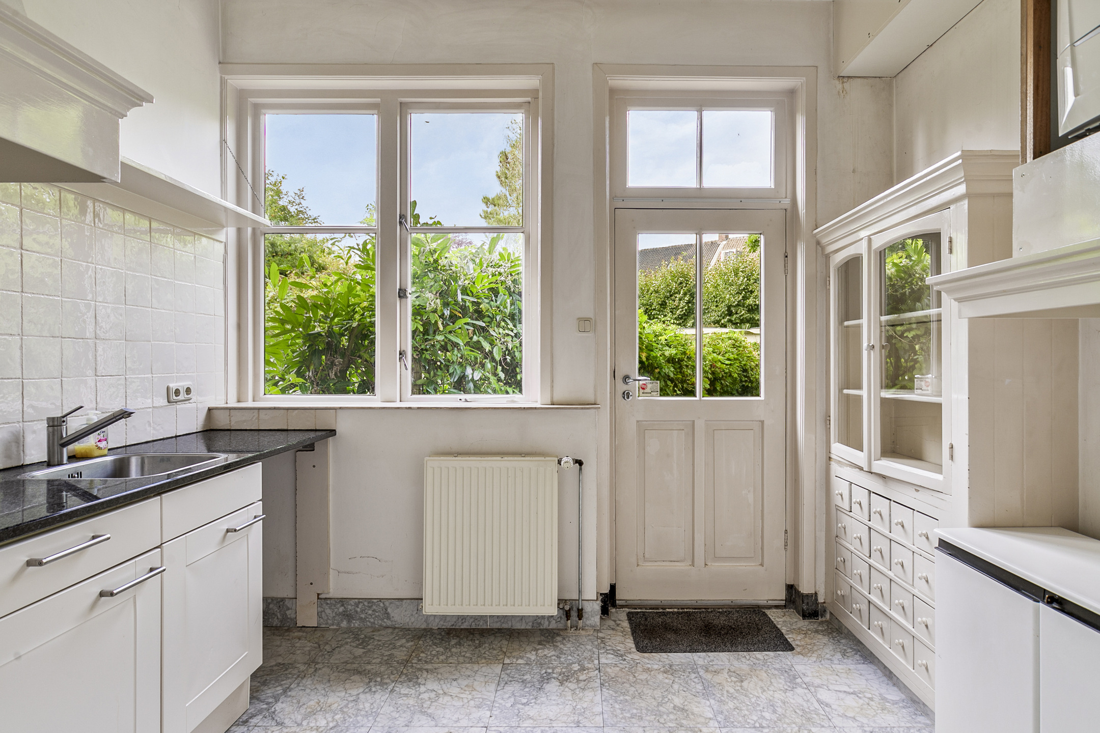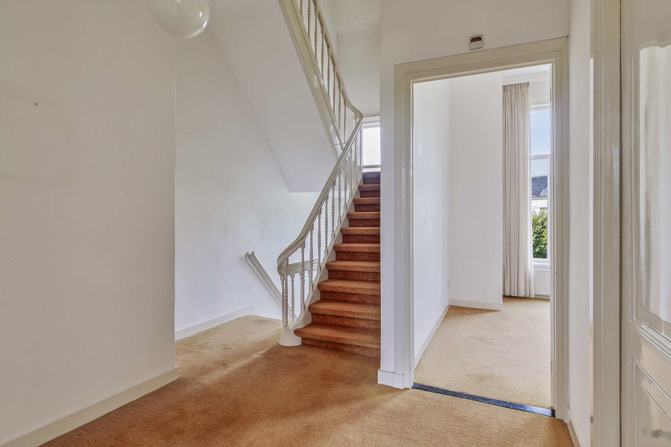 Begane grond: Entree, vestibule, lange hal met marmeren vloer, trapopgang naar de 1e verdieping, hangend toilet met fonteintje en toegang tot de kelder. Woonkamer-en-suite met visgraat parketvloer, vaste kasten, stucplafonds, schouw en openslaande tuindeuren. Dichte keuken met marmeren vloer en tuindeur.