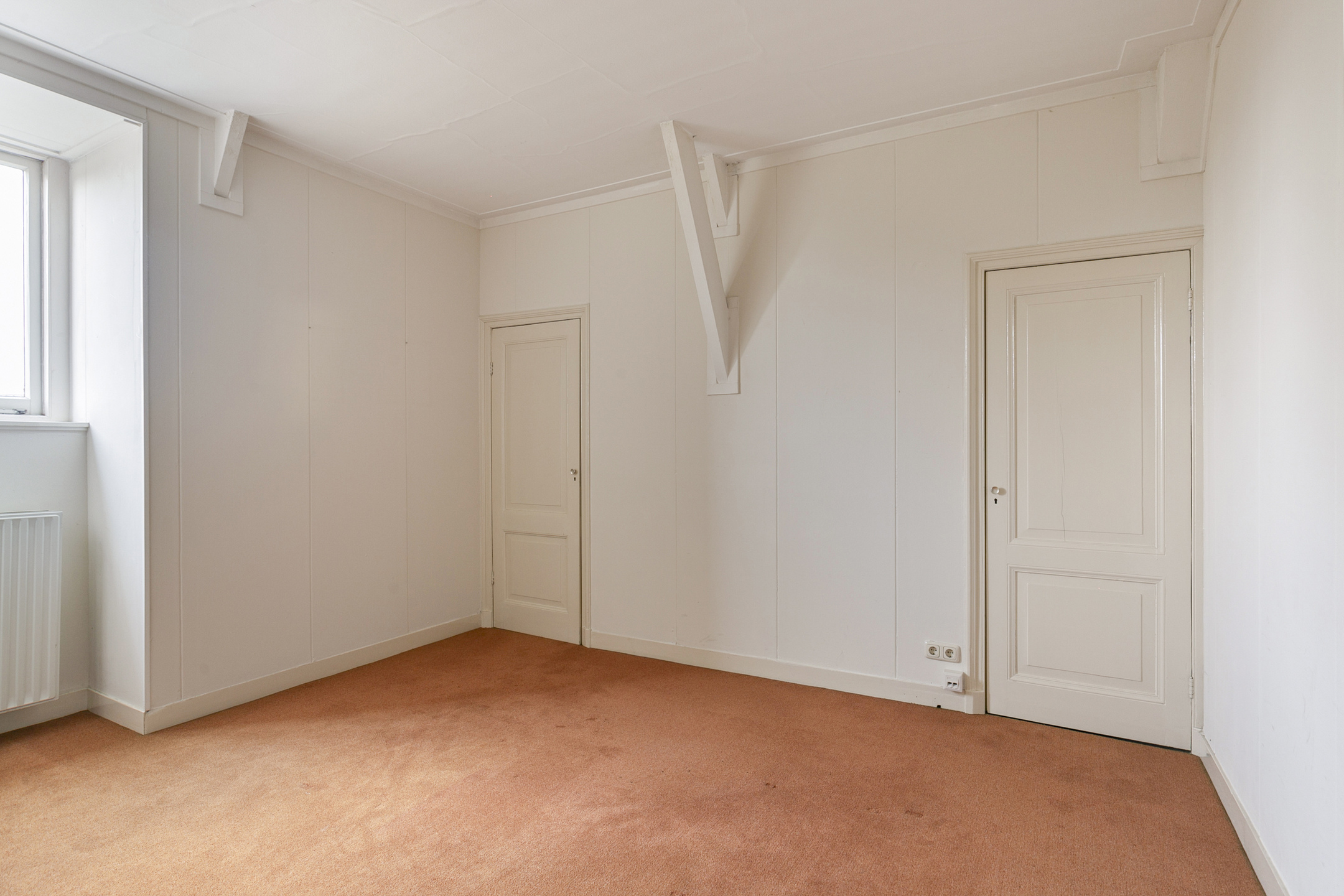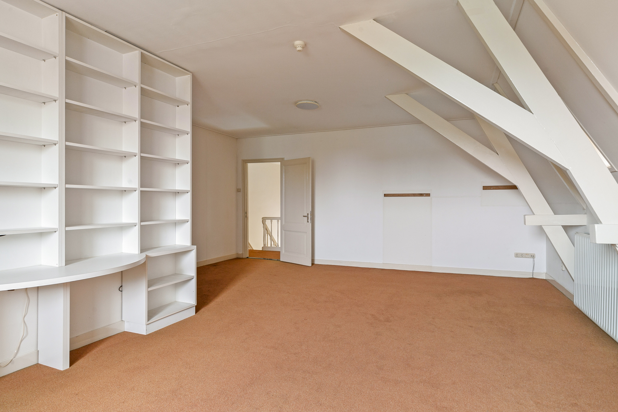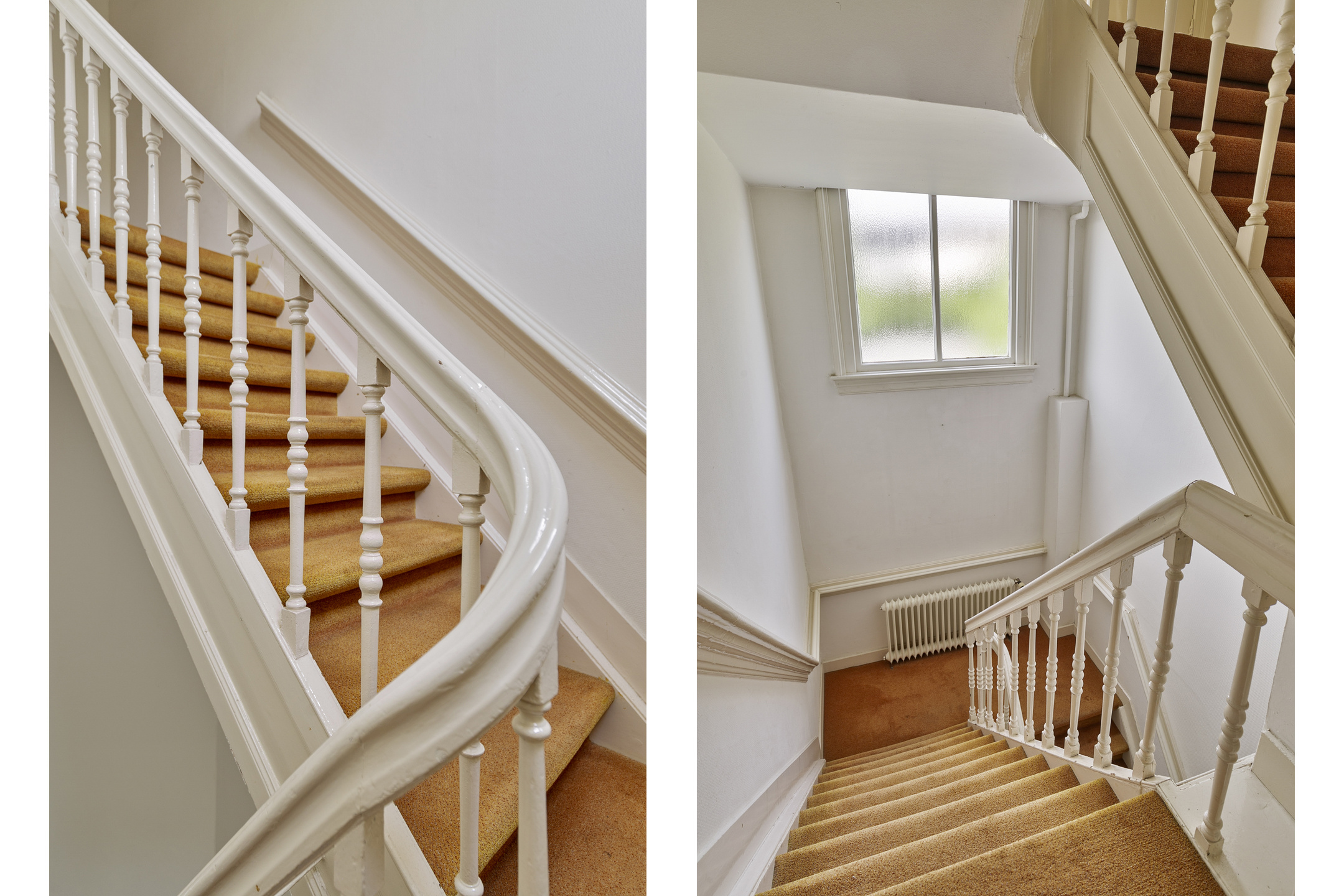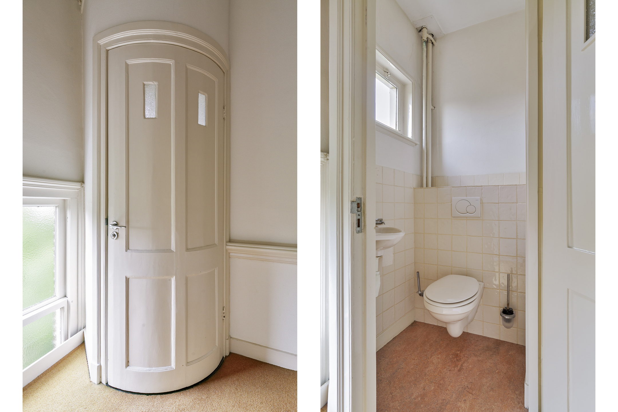 2e Verdieping: Bordestrap naar 2e verdieping met tweede toilet voorzien van fonteintje op het bordes met stijlvolle ronde deur. Technische ruimte (eventueel geschikt om hierin een badkamer te realiseren) en twee ruime slaapkamers ter grootte van 15 m² en 38 m² met vaste kasten.