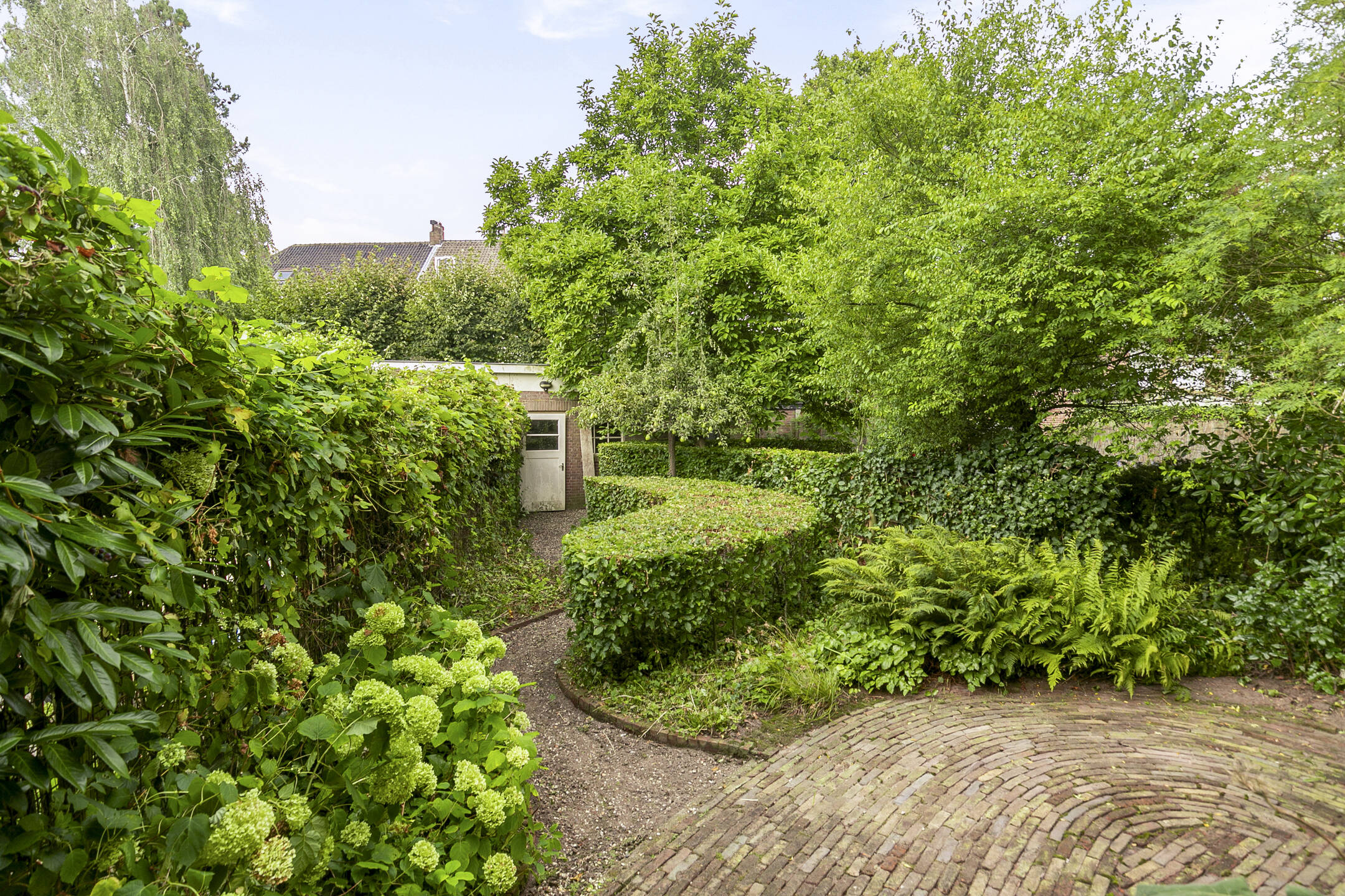 Achtertuin op het noorden voorzien van terras tegen de achtergevel, meerdere borders en stenen berging achterin de tuin. Voortuin met siergrind en bestrating.
