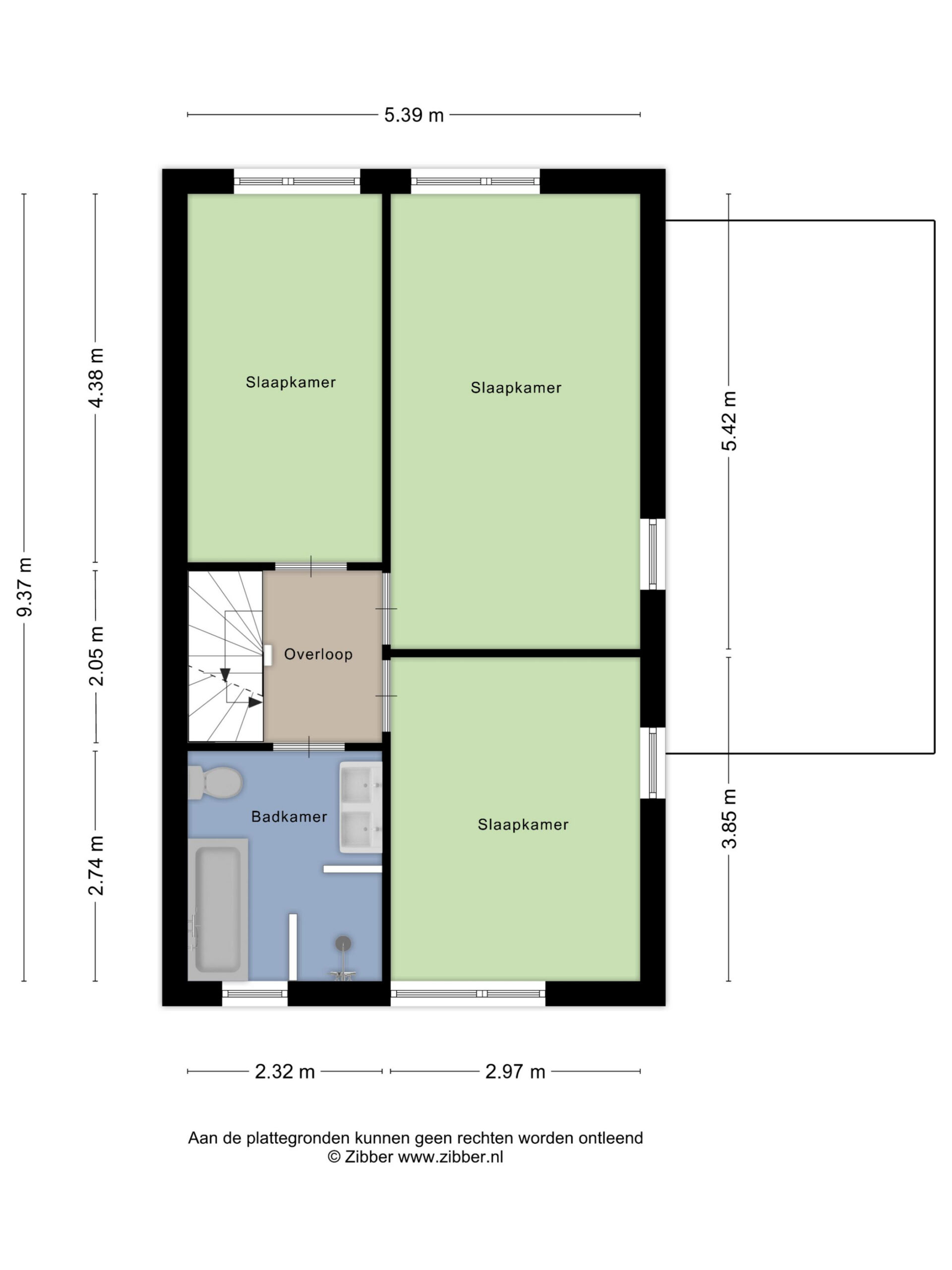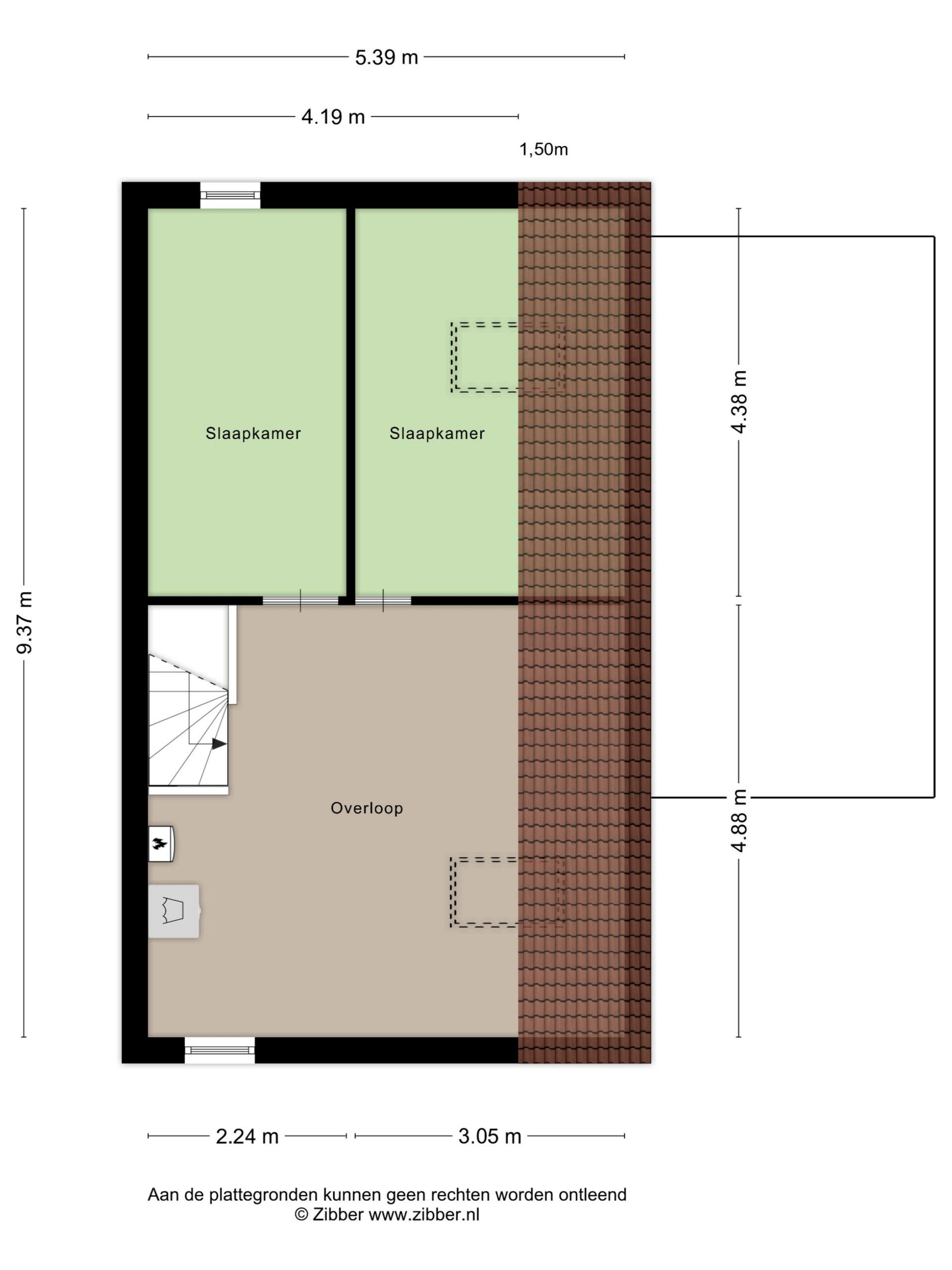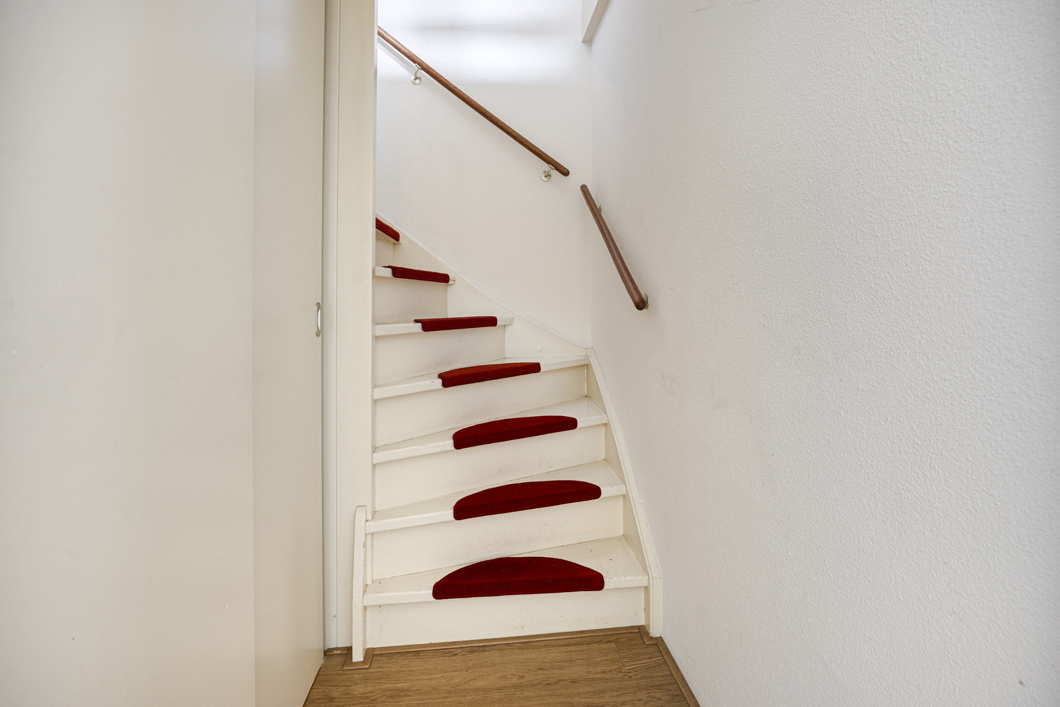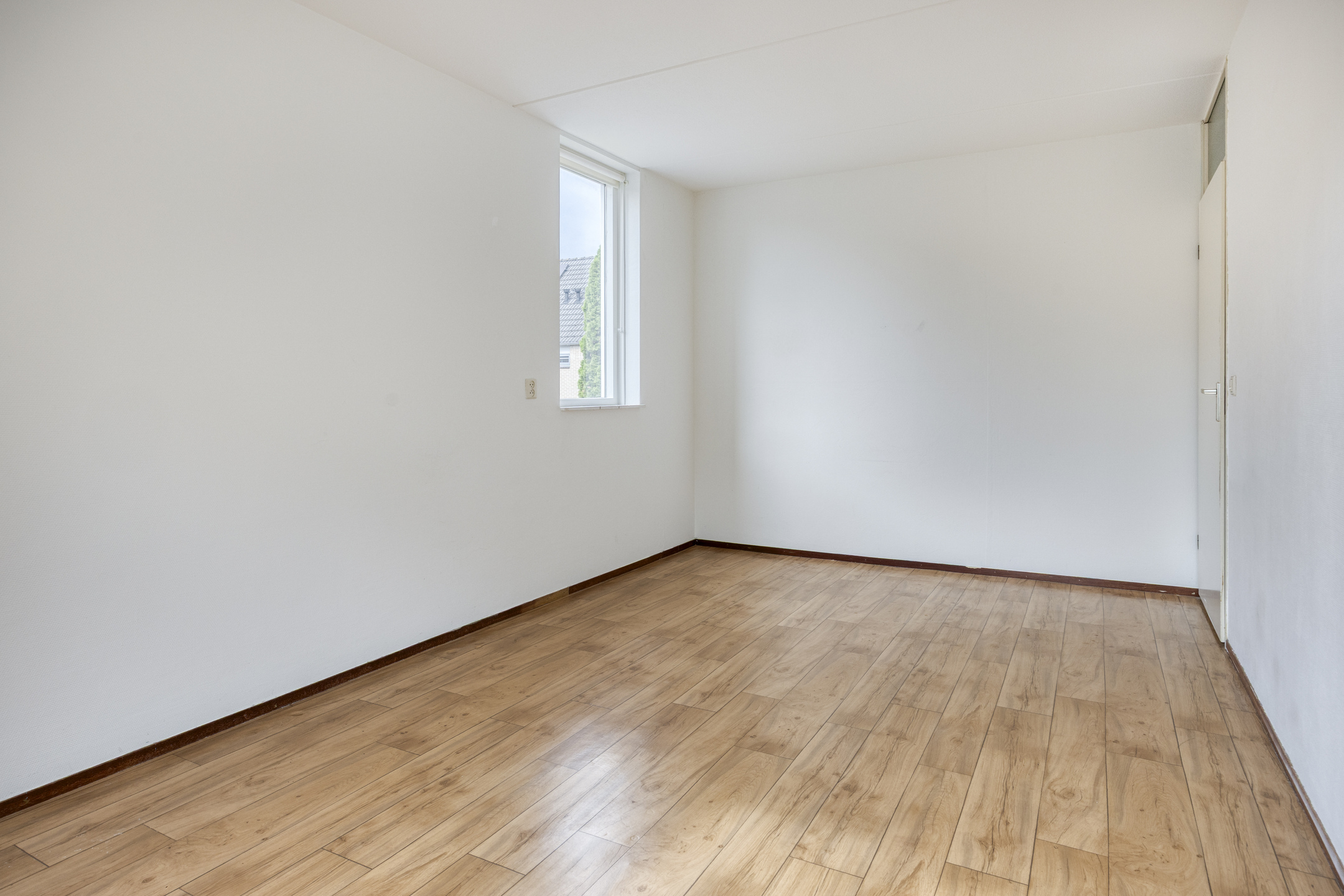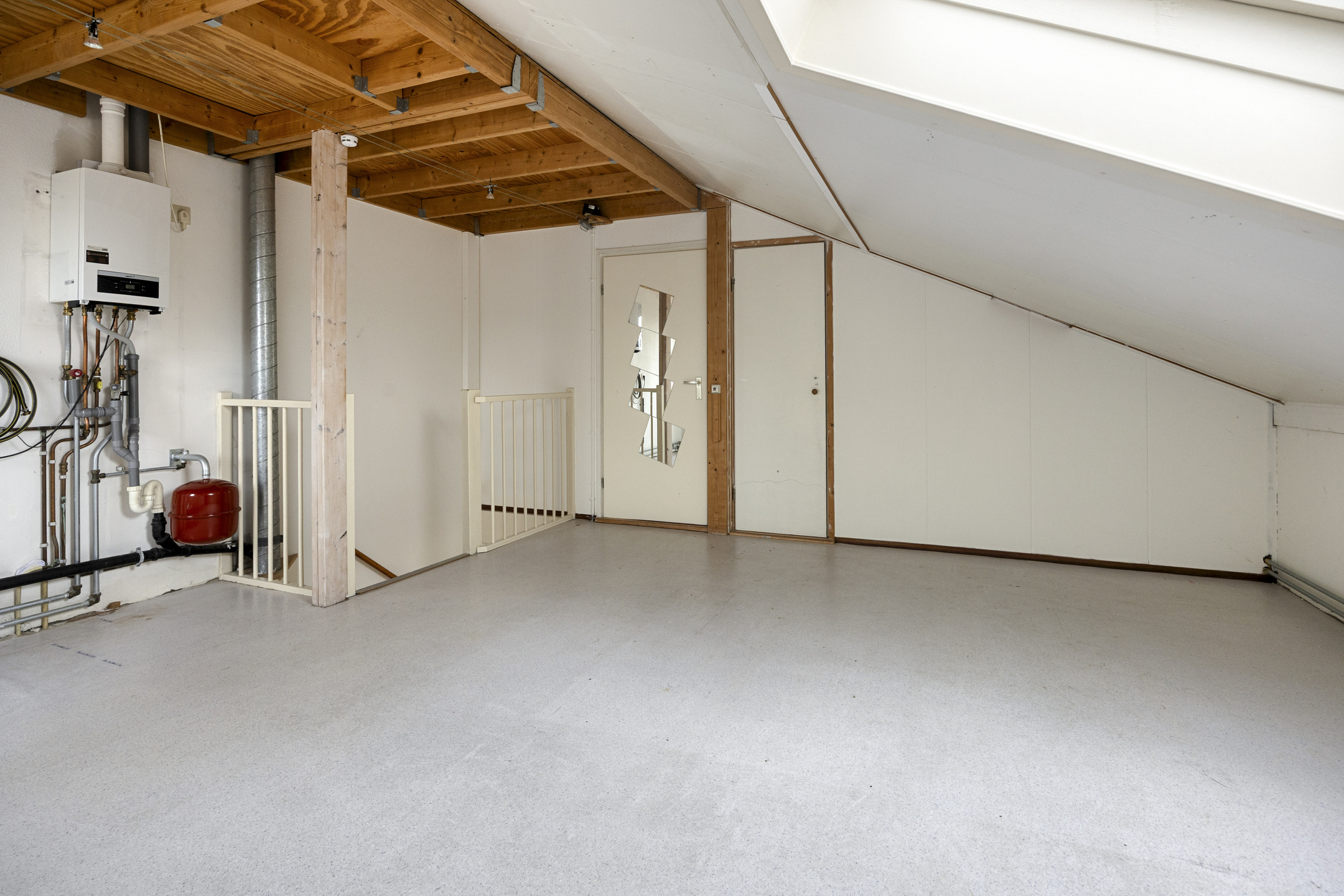 2e Verdieping: riante open zolderruimte/overloop met dakraam, cv-opstelplaats en aansluiting voor de wasapparatuur. Twee slaapkamers ter grootte van circa 8 m² en 10 m², beiden voorzien van laminaatvloer.