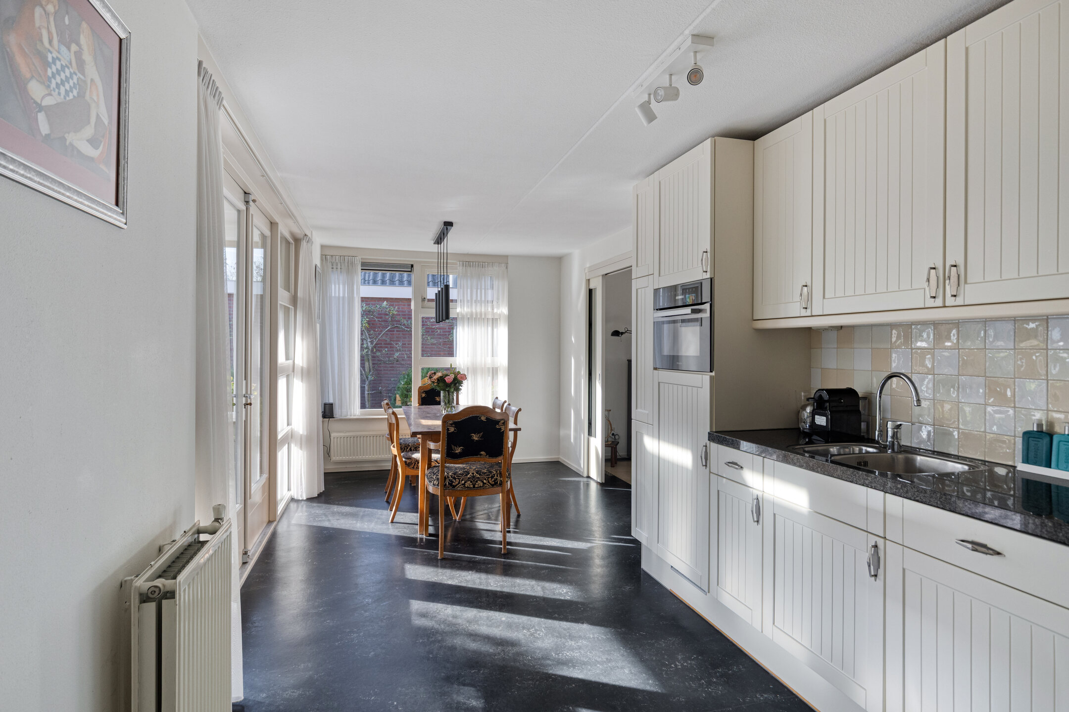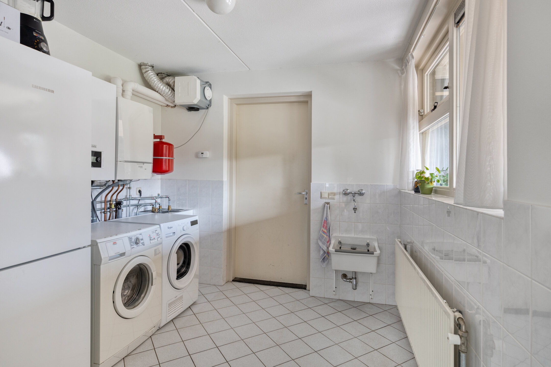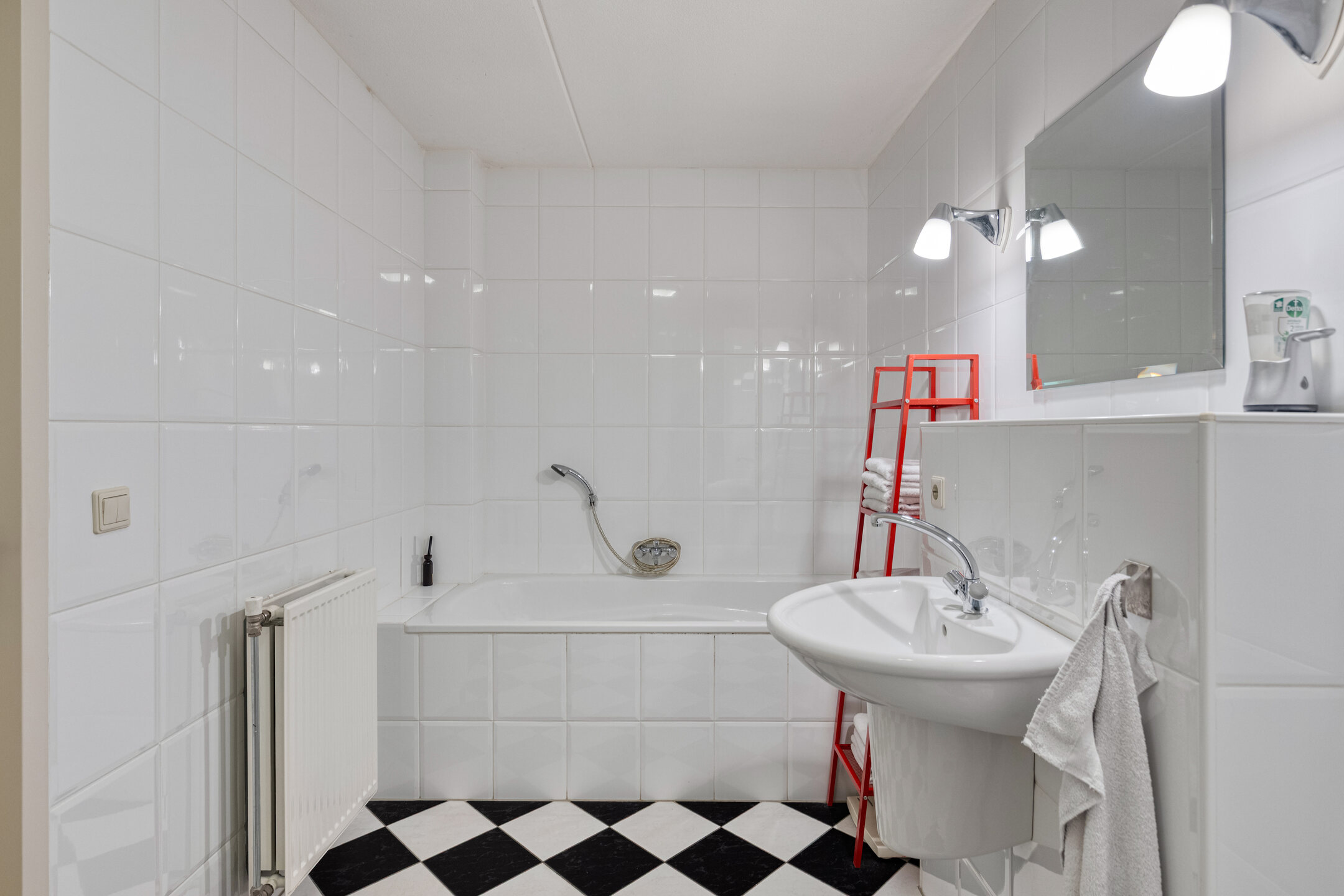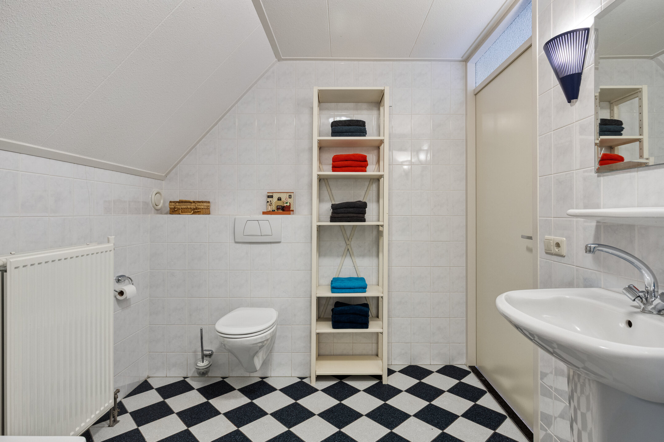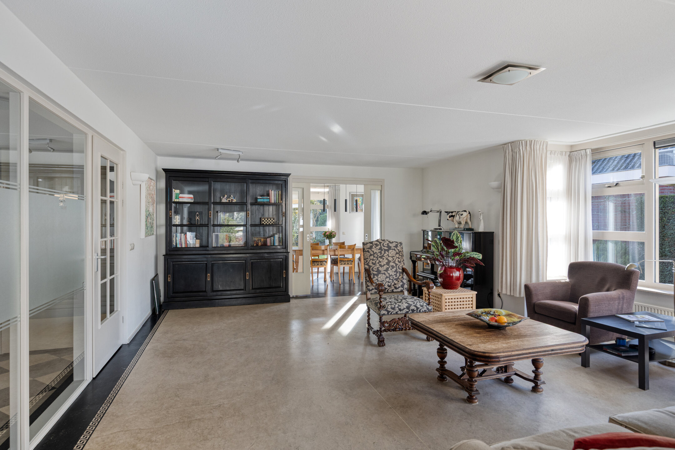 Begane grond: entree met meterkast. Ruime hal met trapopgang naar de 1e verdieping en (gasten-)toilet voorzien van wandcloset en fonteintje. Riante woonkamer met veel ramen, voorzien van elektrische screens en en-suite deuren naar de woonkeuken. Woonkeuken met eethoek met openslaande deuren naar de veranda in de achtertuin en keuken in L-opstelling, voorzien van inductiekookplaat, afzuigkap, combi-oven, koelkast en vaatwasser. Bijkeuken met cv-opstelplaats, gootsteen, aansluiting voor de wasapparatuur en deur naar de aangebouwde garage ter grootte van circa 26,5 m², welke beschikt over een deur naar de achtertuin. Slaapkamer ter grootte van circa 15 m², met ruime badkamer-en-suite voorzien van ligbad, wastafel, inloopdouche en wandcloset.