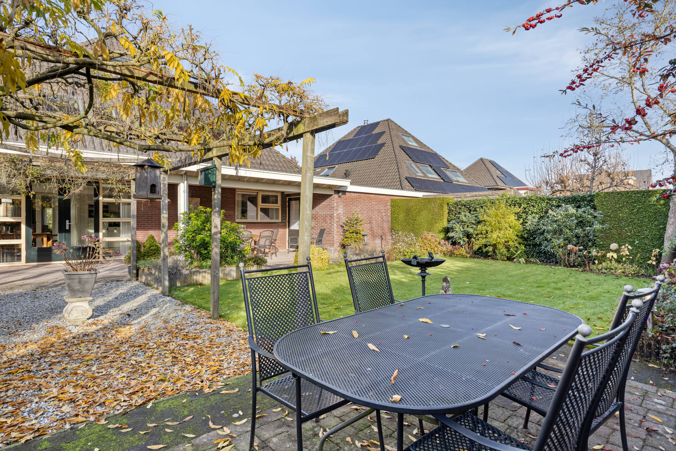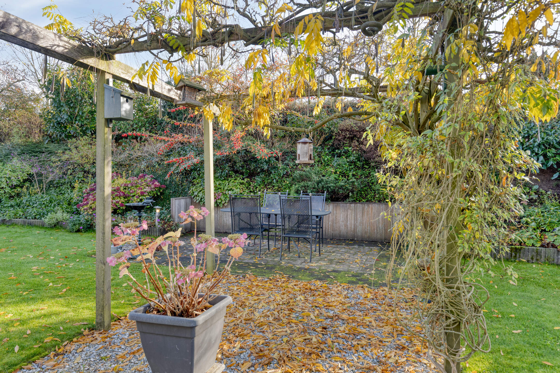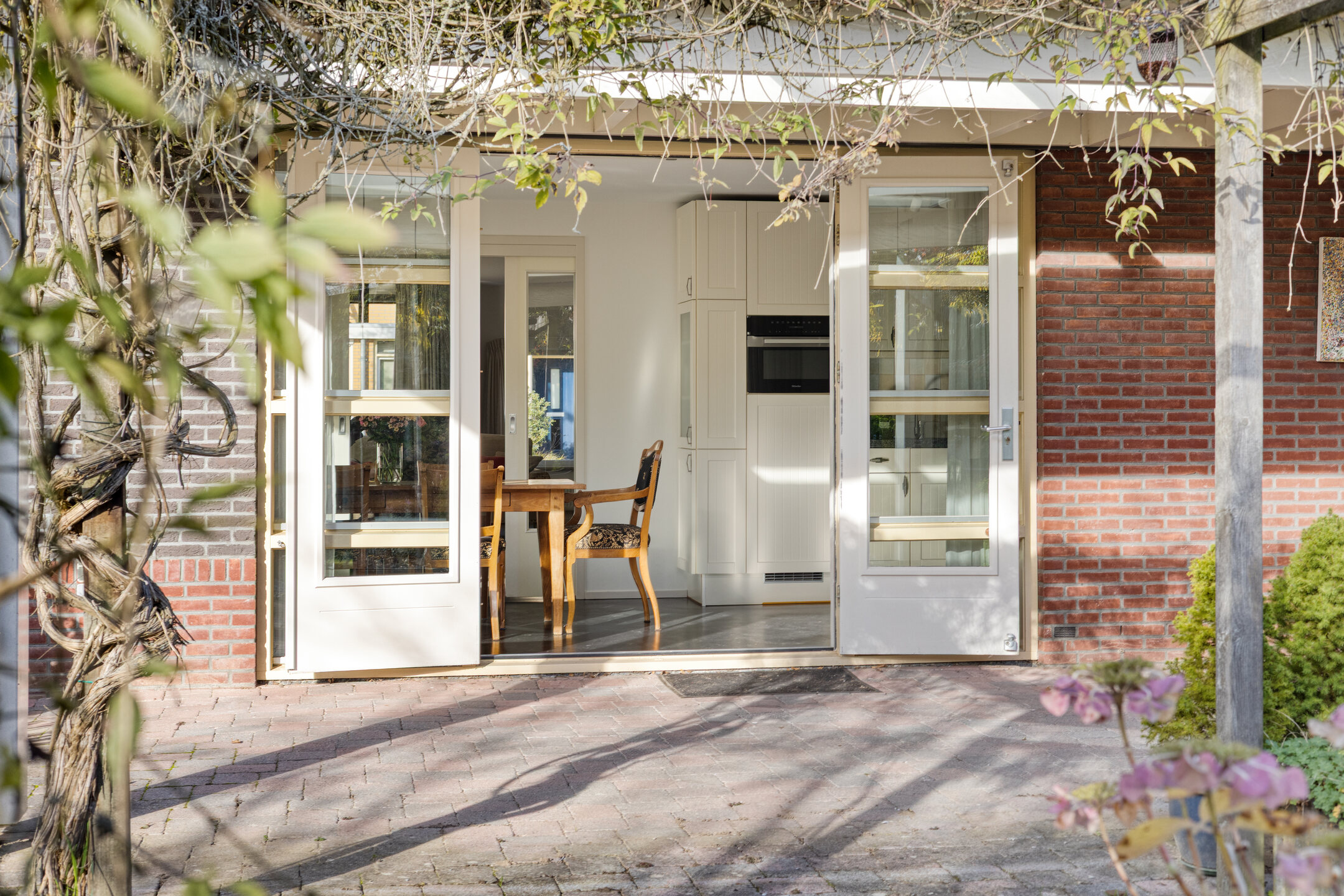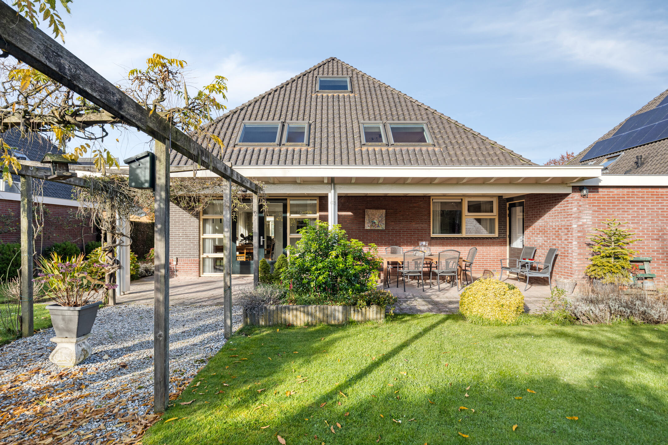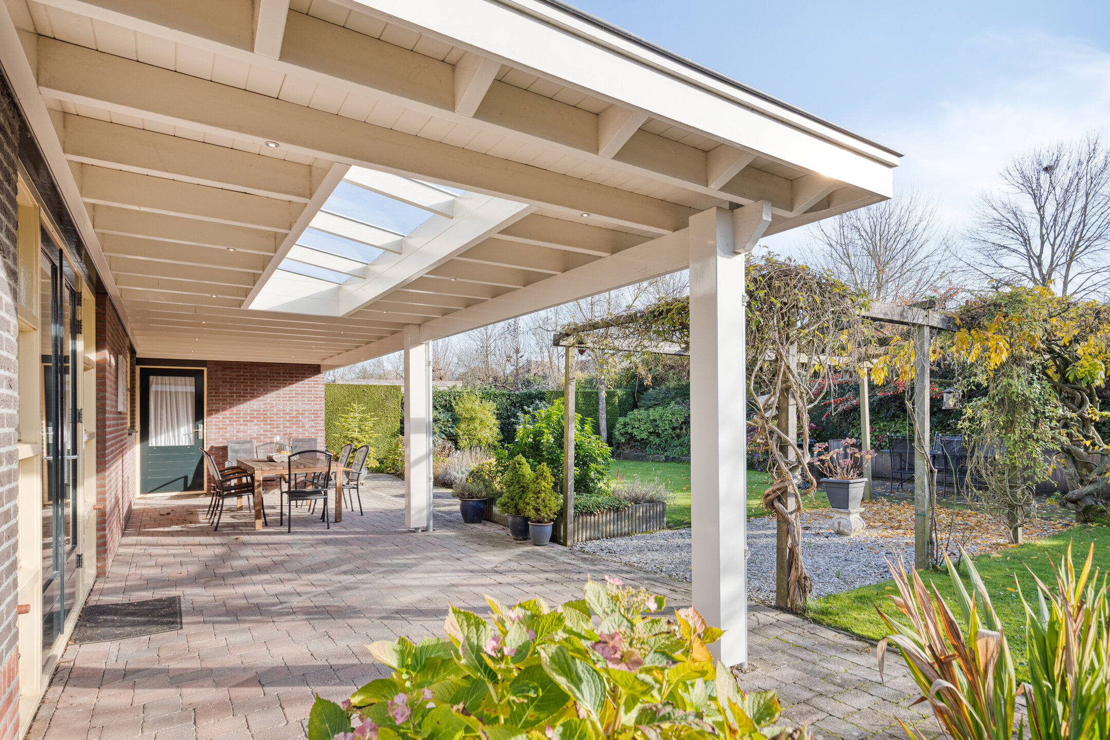 De woning biedt een fraai aangelegde, vrij gelegen achtertuin op het zuidoosten met riante (overdekte)veranda tegen de achtergevel, veel gazon, meerdere borders en pergola. Aan de voorzijde is een oprit aanwezig met parkeerruimte voor twee personenauto’s op eigen terrein.