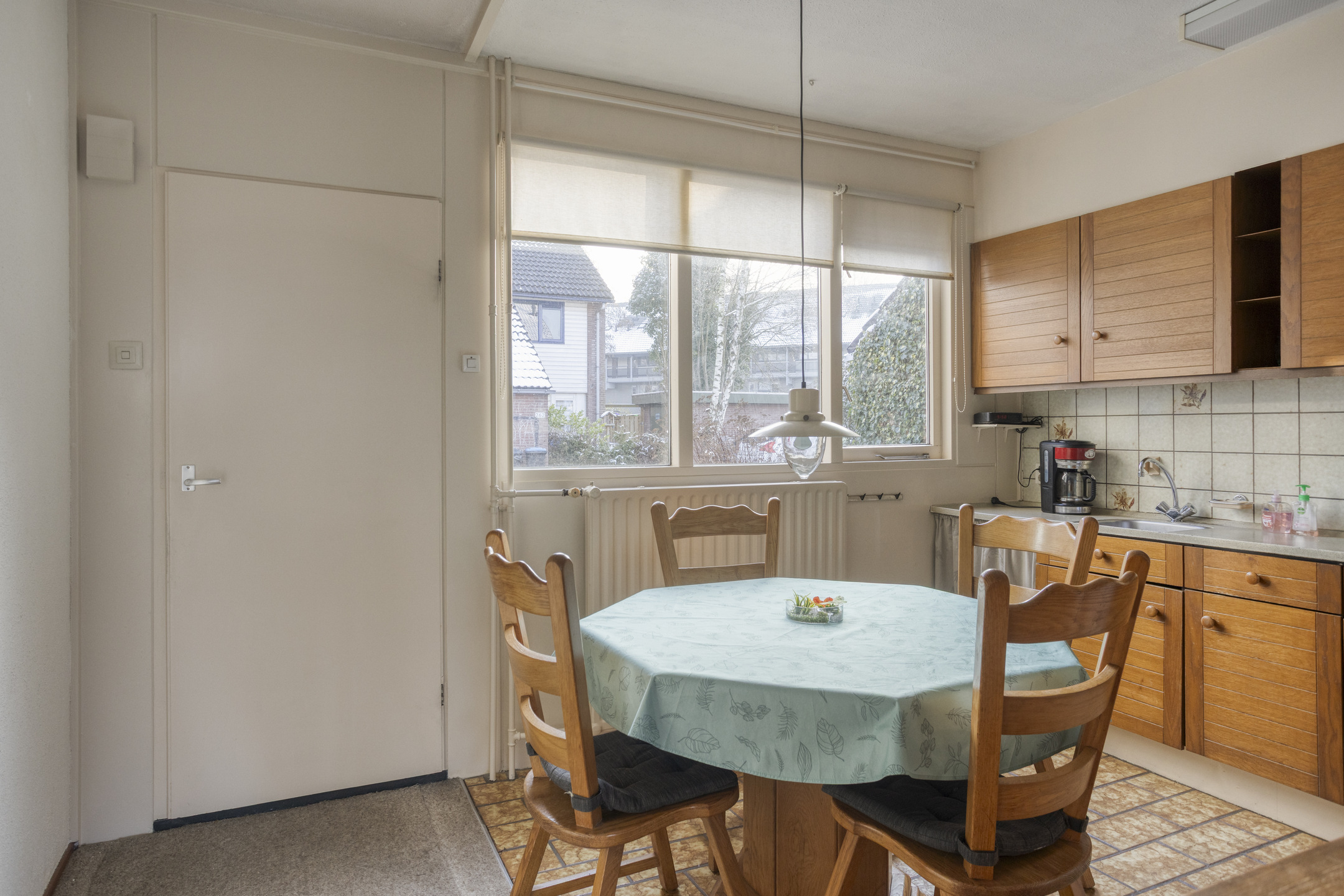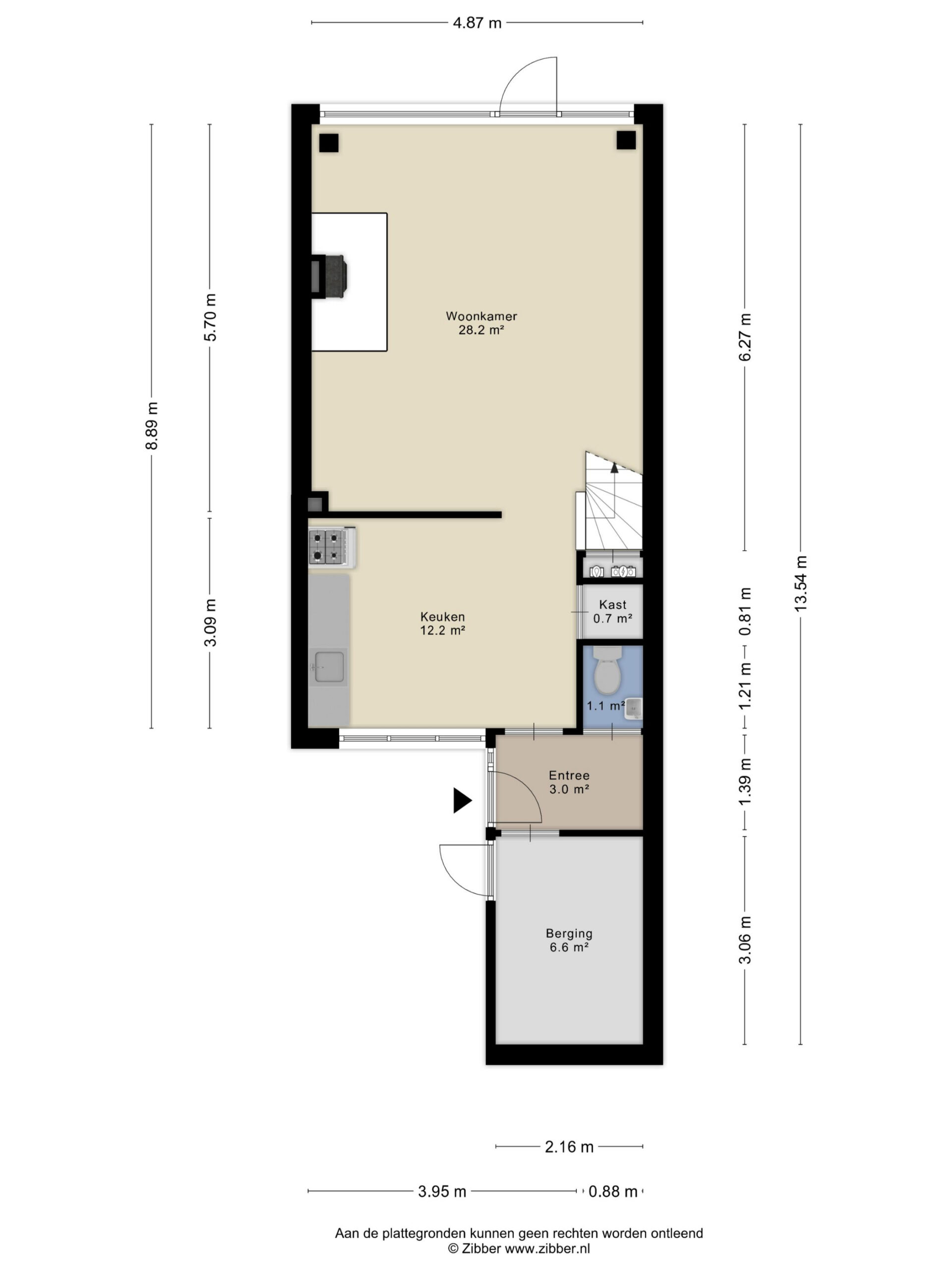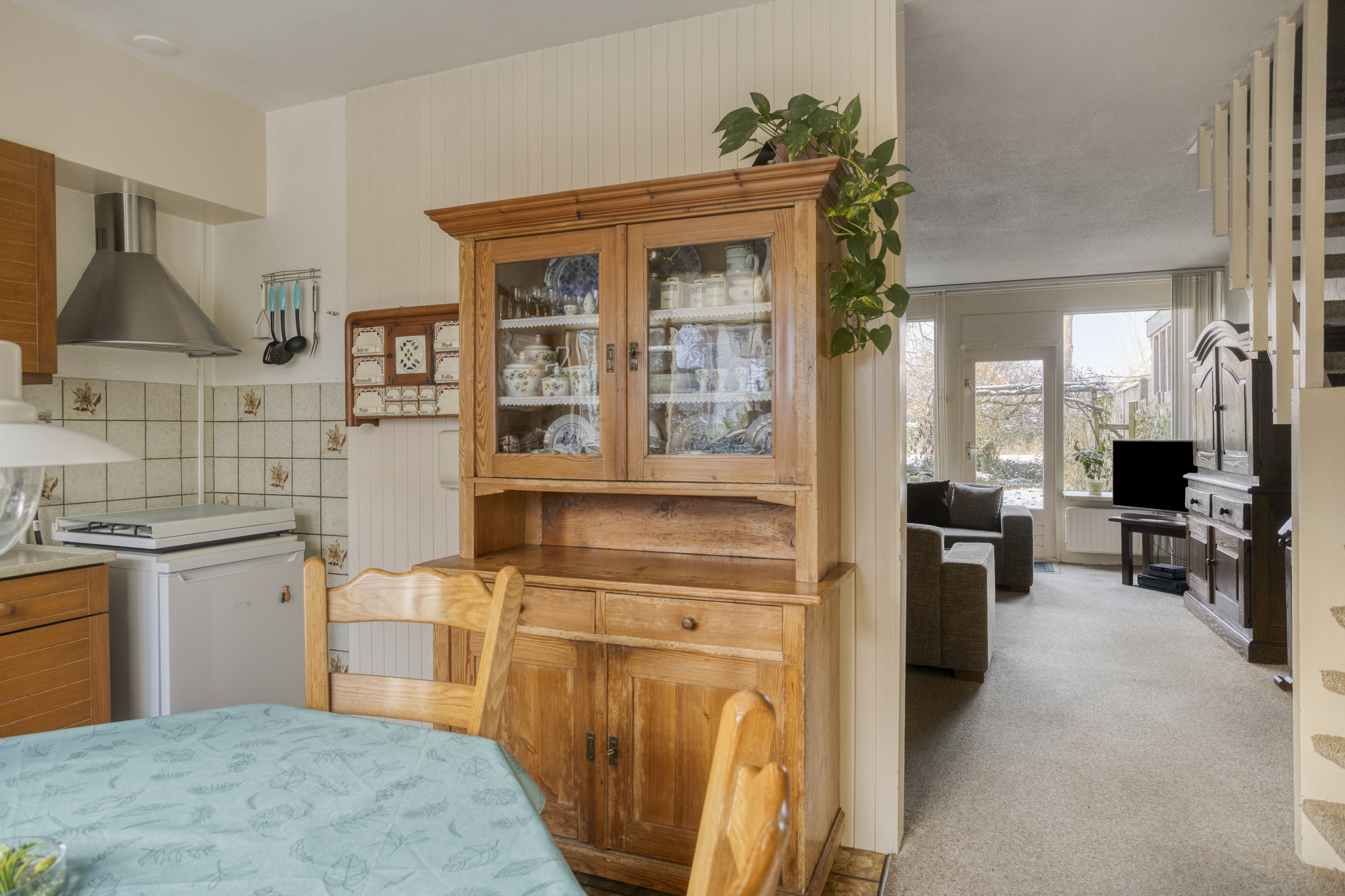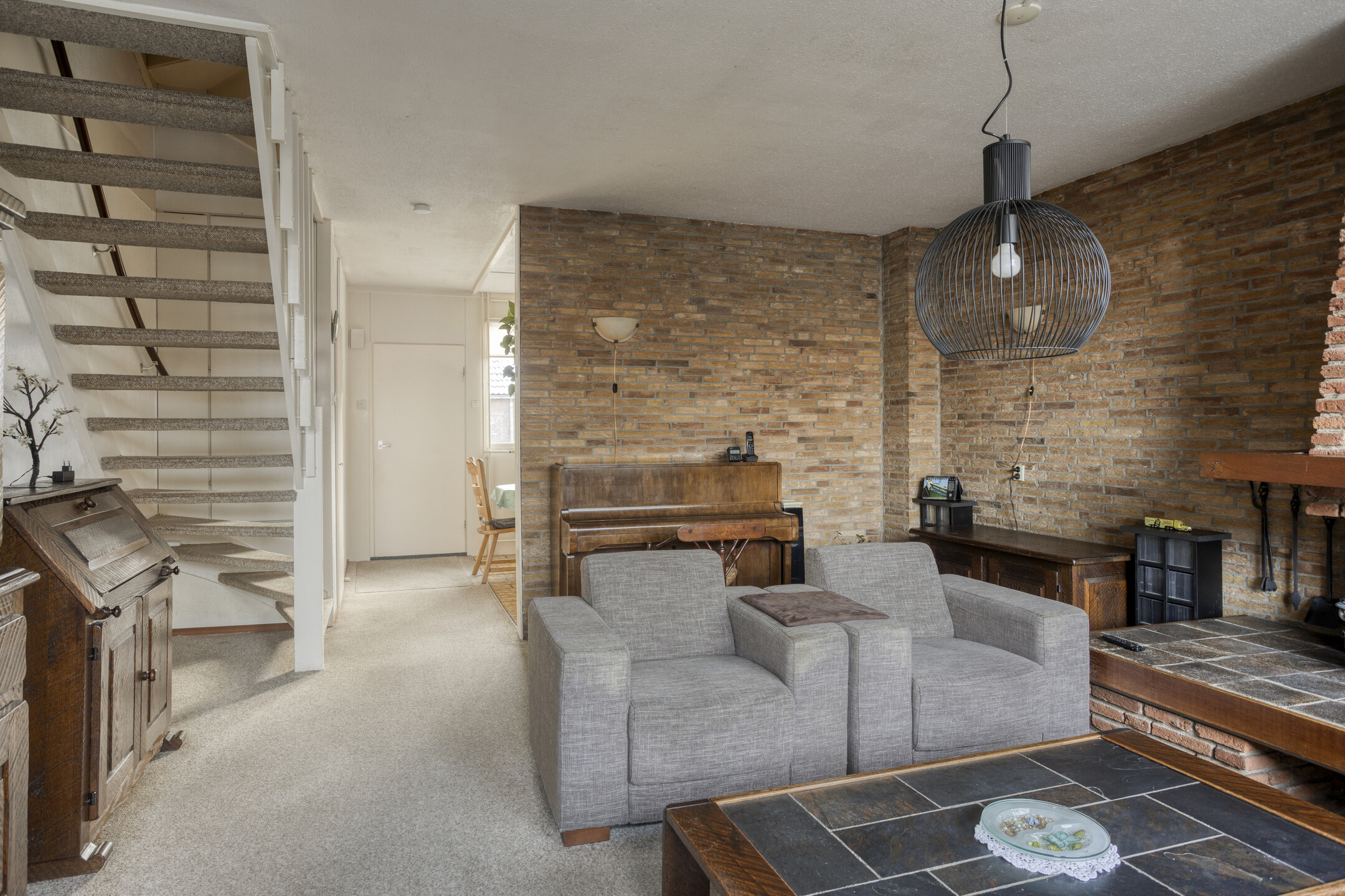 Begane grond: entree, hal met toilet voorzien van fonteintje en toegang tot de inpandige berging. Ruime, tuingerichte woonkamer met deur naar de achtertuin, trapopgang naar de 1e verdieping en schouw met open haard. Half open woonkeuken aan de voorzijde met keukenblok en ruimte voor de eettafel.