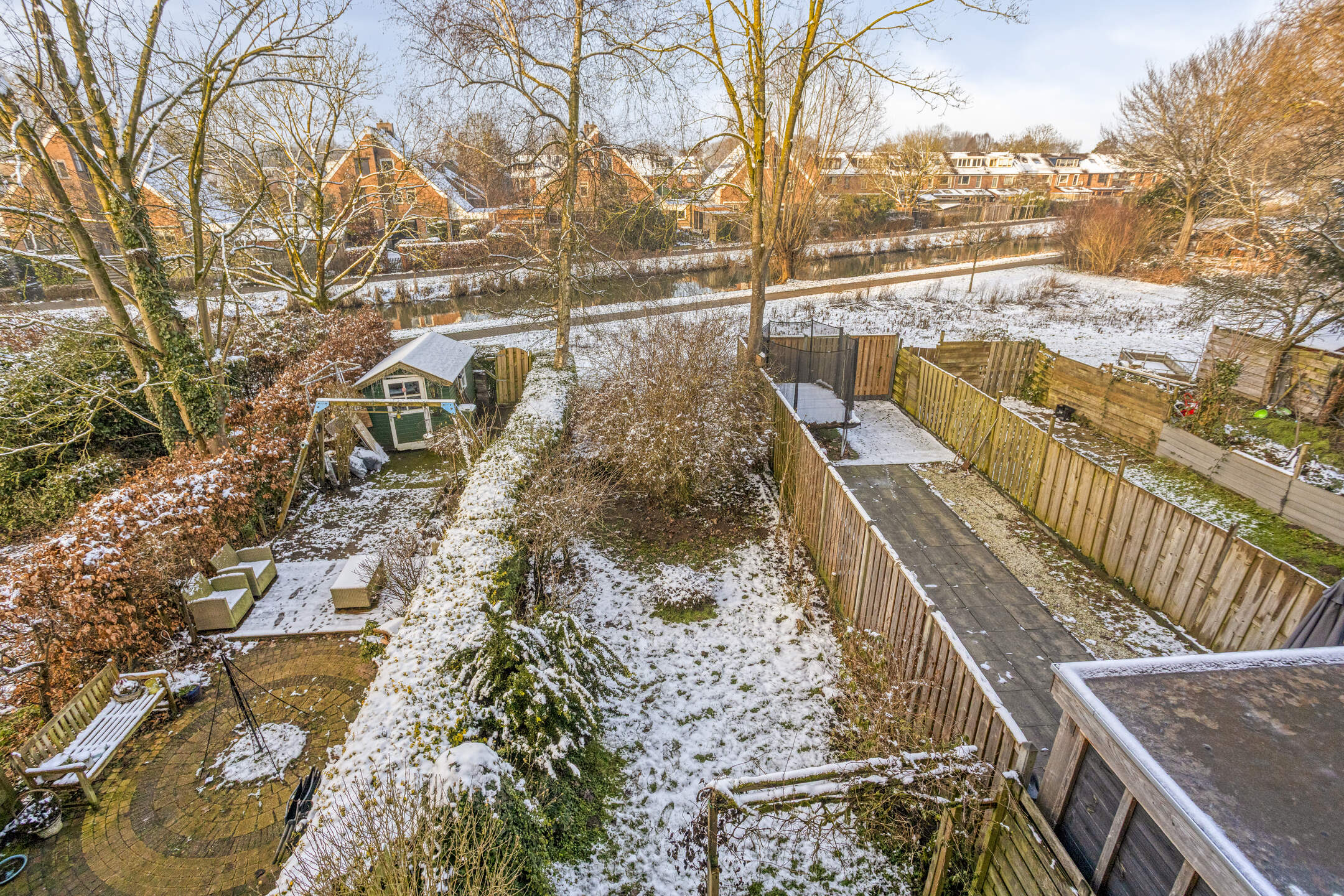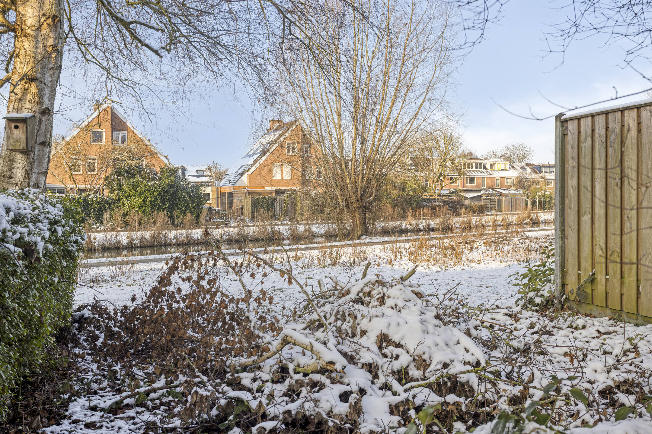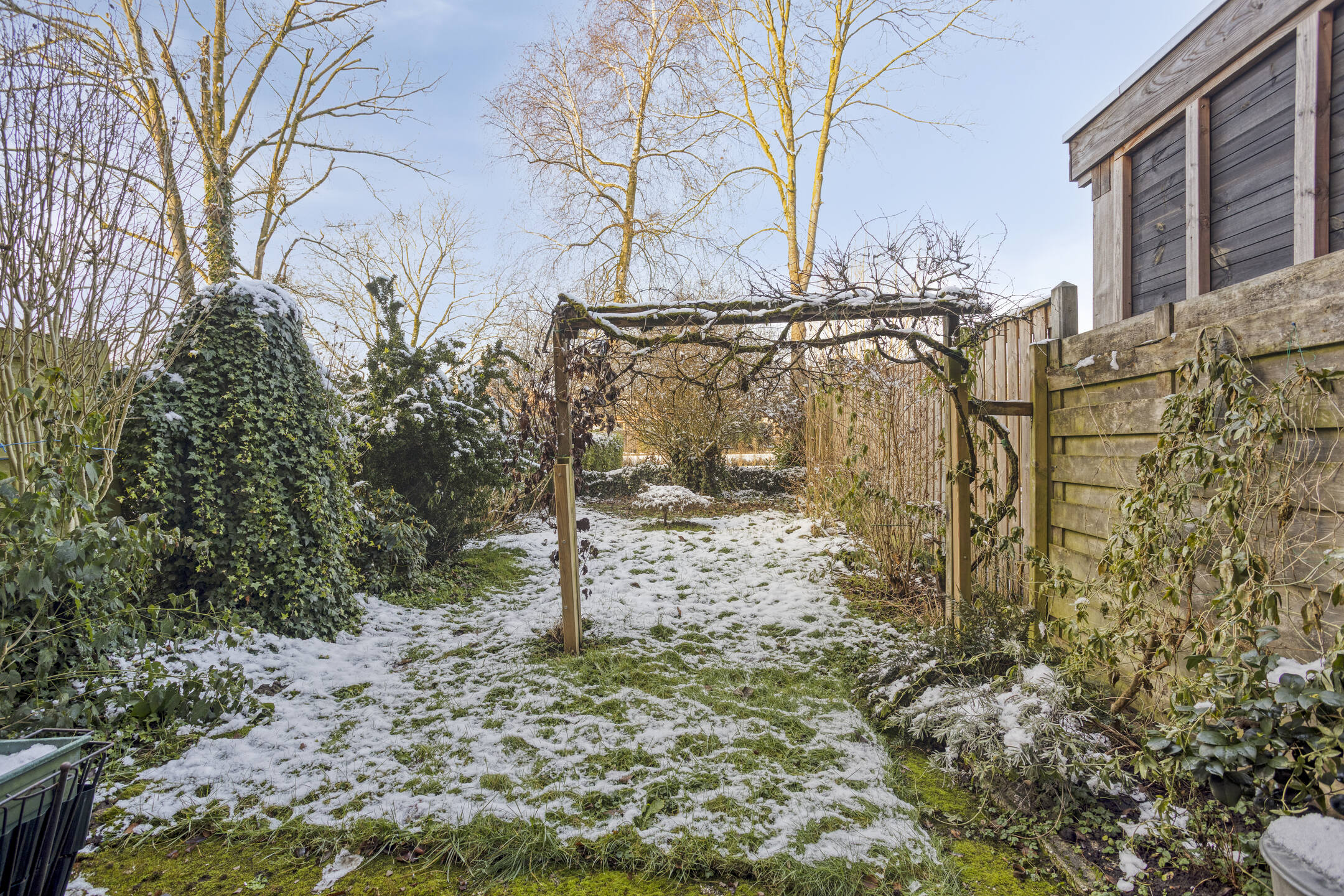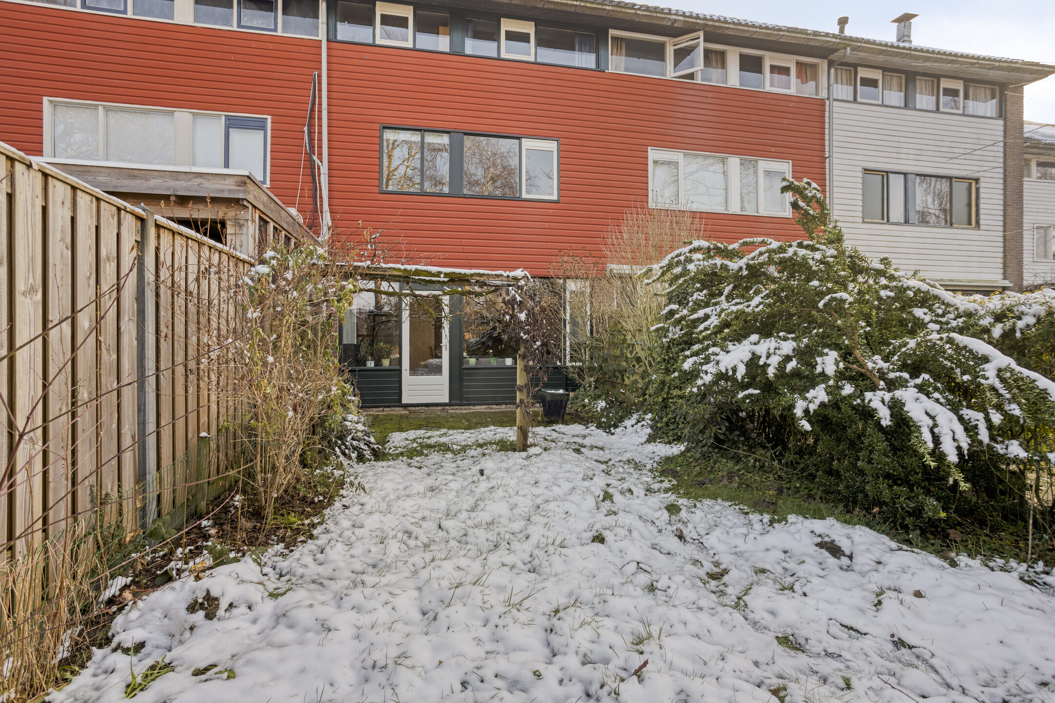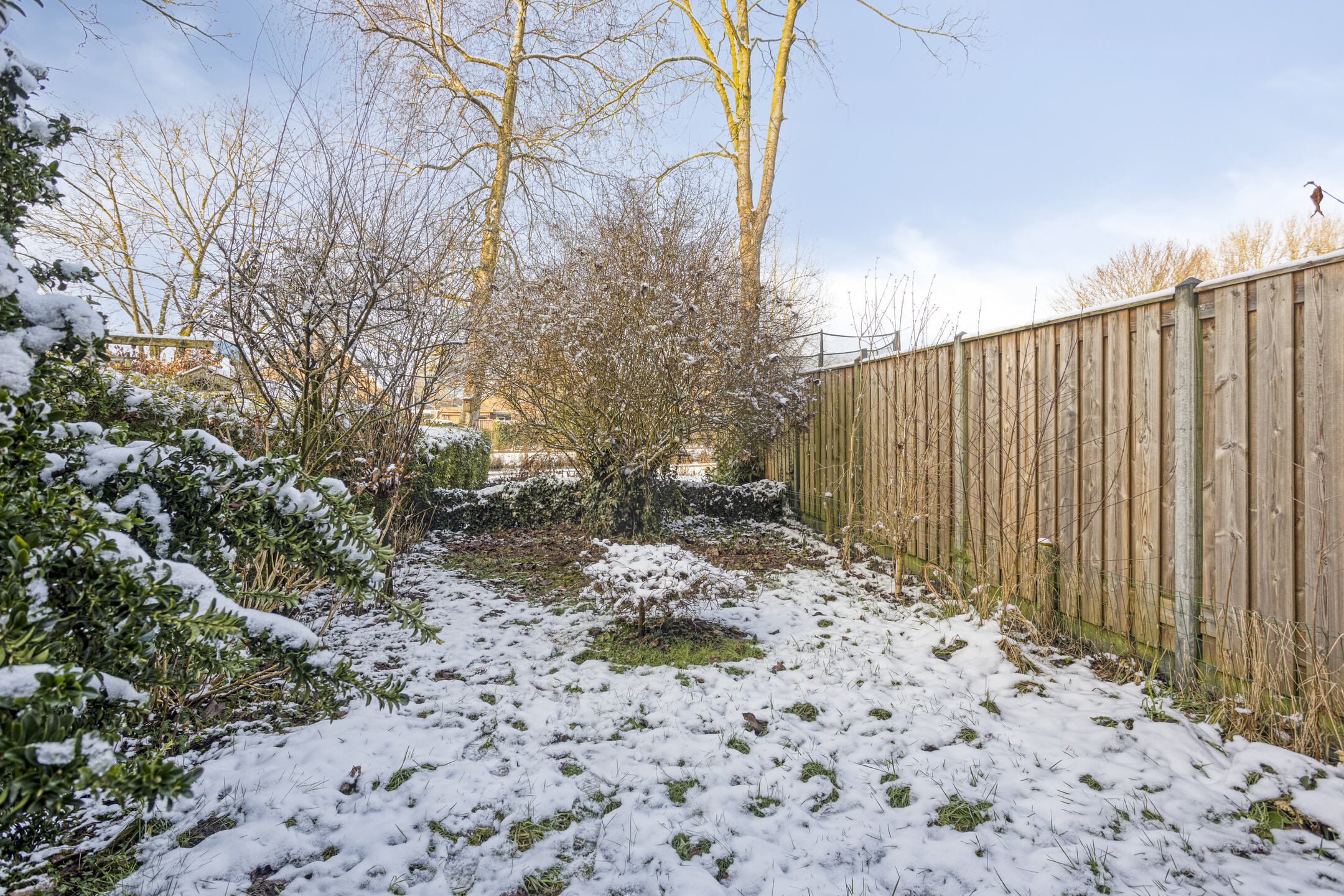 Groene achtertuin op het westen met borders, gazon en terras aan de achtergevel. Parkeren is mogelijk op de openbare parkeervoorzieningen in de straat.
