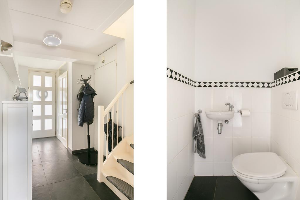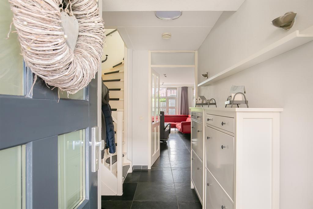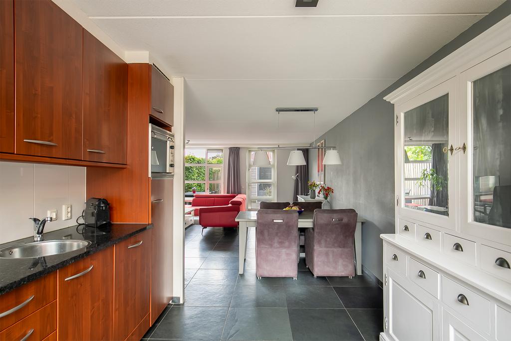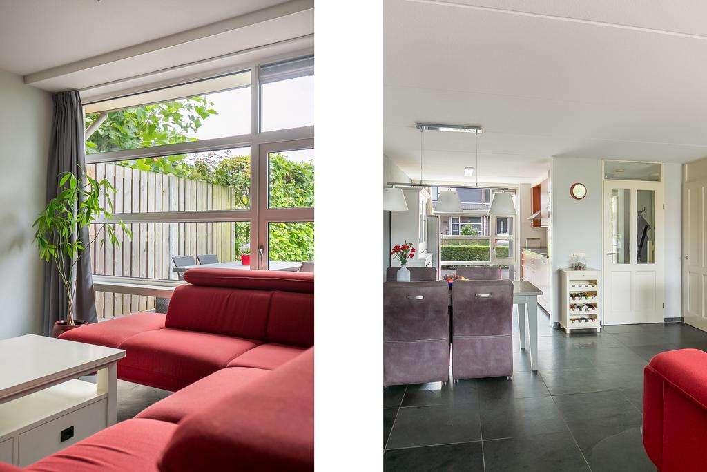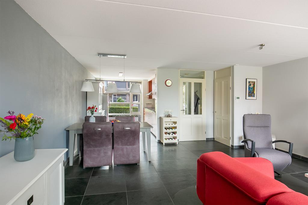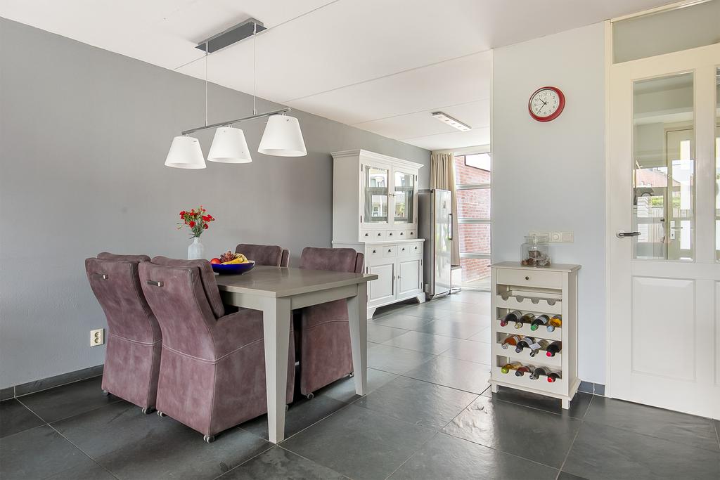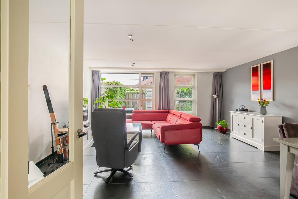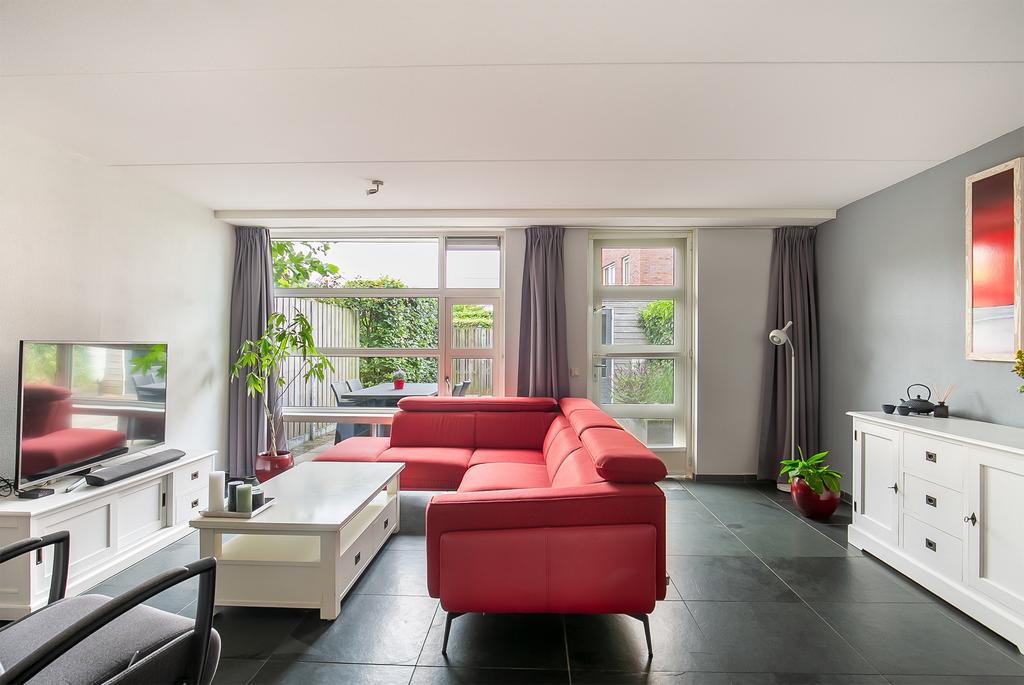 Begane grond: Overdekte entree, naast de entree bevindt zich een kast met de CV ketel, hal, meterkast, toilet (hangend) met fonteintje, trapopgang en toegang tot de woonkamer. De woonkamer en de open keuken zijn voorzien van een fraaie leistenen vloer met vloerverwarming en grote raampartijen vullen de ruimte met natuurlijk licht. De open keuken is voorzien van diverse inbouwapparatuur waaronder een koelkast, vaatwasser, combi-oven/magnetron, inductiekookplaat en afzuigkap.