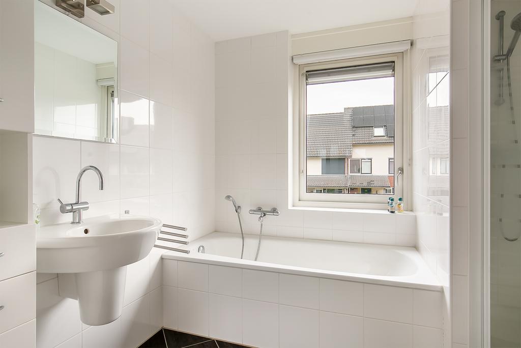 1e Verdieping: Overloop, 3 slaapkamers van ca. 15, 9 en 8 m². De volledig betegelde badkamer is voorzien van vloerverwarming, een douche, 2e toilet en een wastafel.