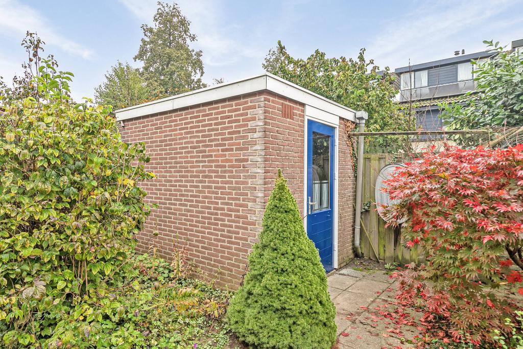 Achtertuin op het oosten met terras aan de achtergevel, meerdere borders en stenen bergschuur. Aan de voorzijde is een carport aanwezig met parkeerruimte voor één personenauto.