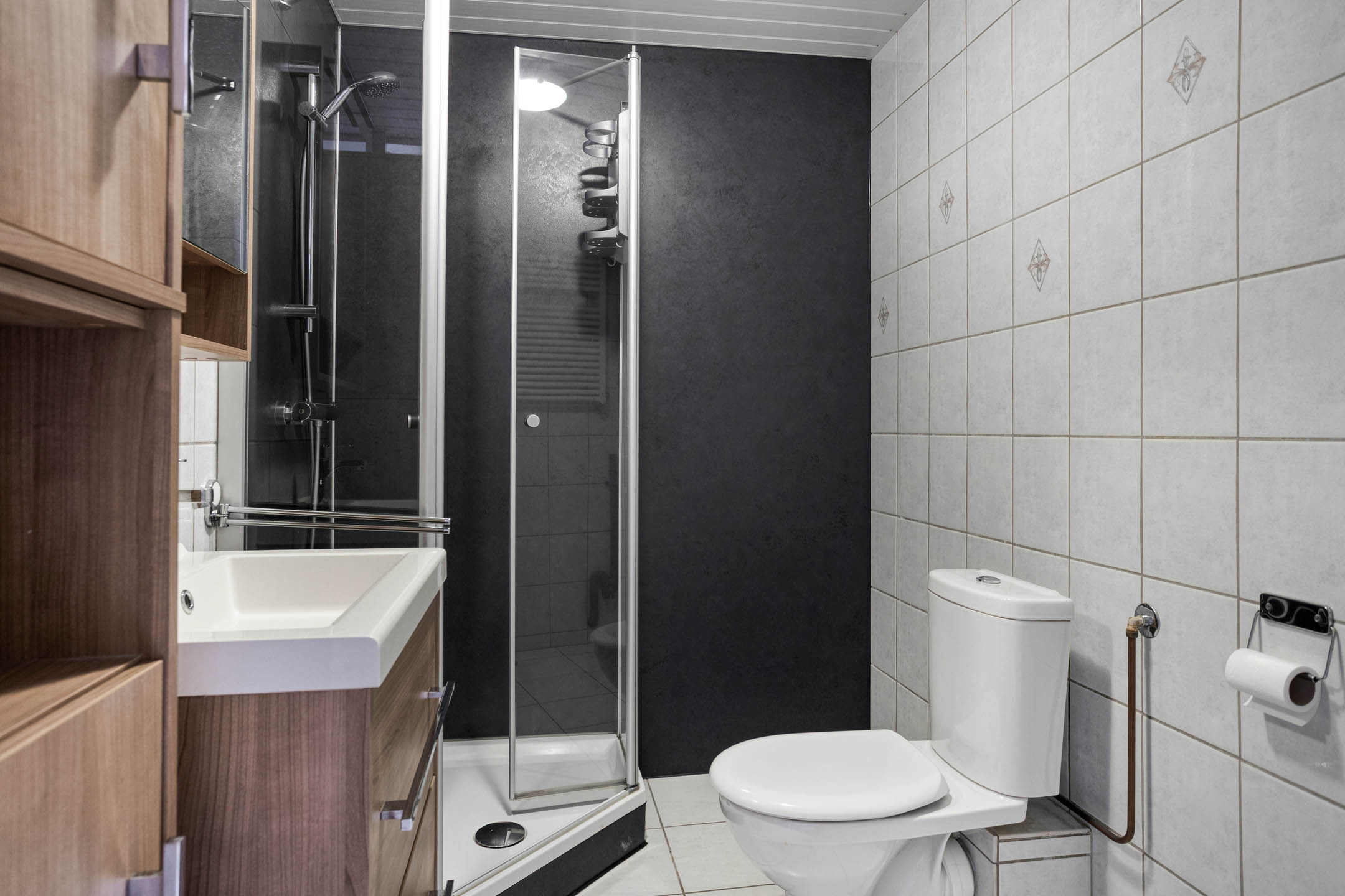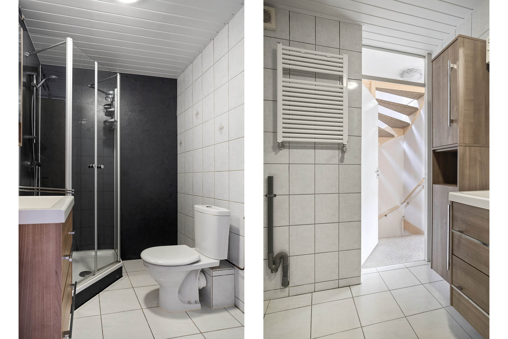 1e Verdieping: overloop. Drie slaapkamers ter grootte van circa 9 m², 9,5 m² en 14 m², allen voorzien van vloerbedekking. Inpandige badkamer met douche, wasmachine-aansluiting, wastafelmeubel, toilet en handdoekenradiator.