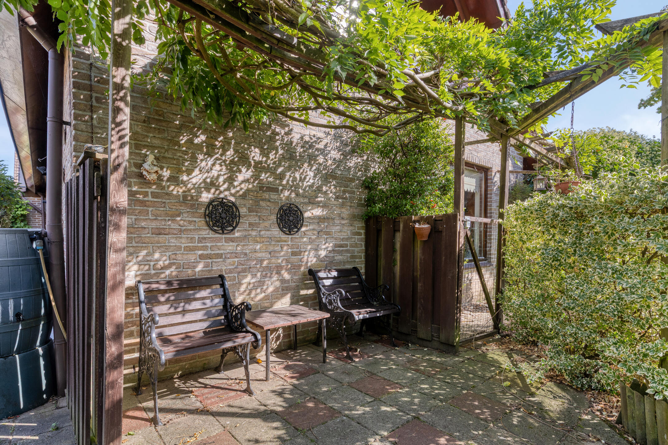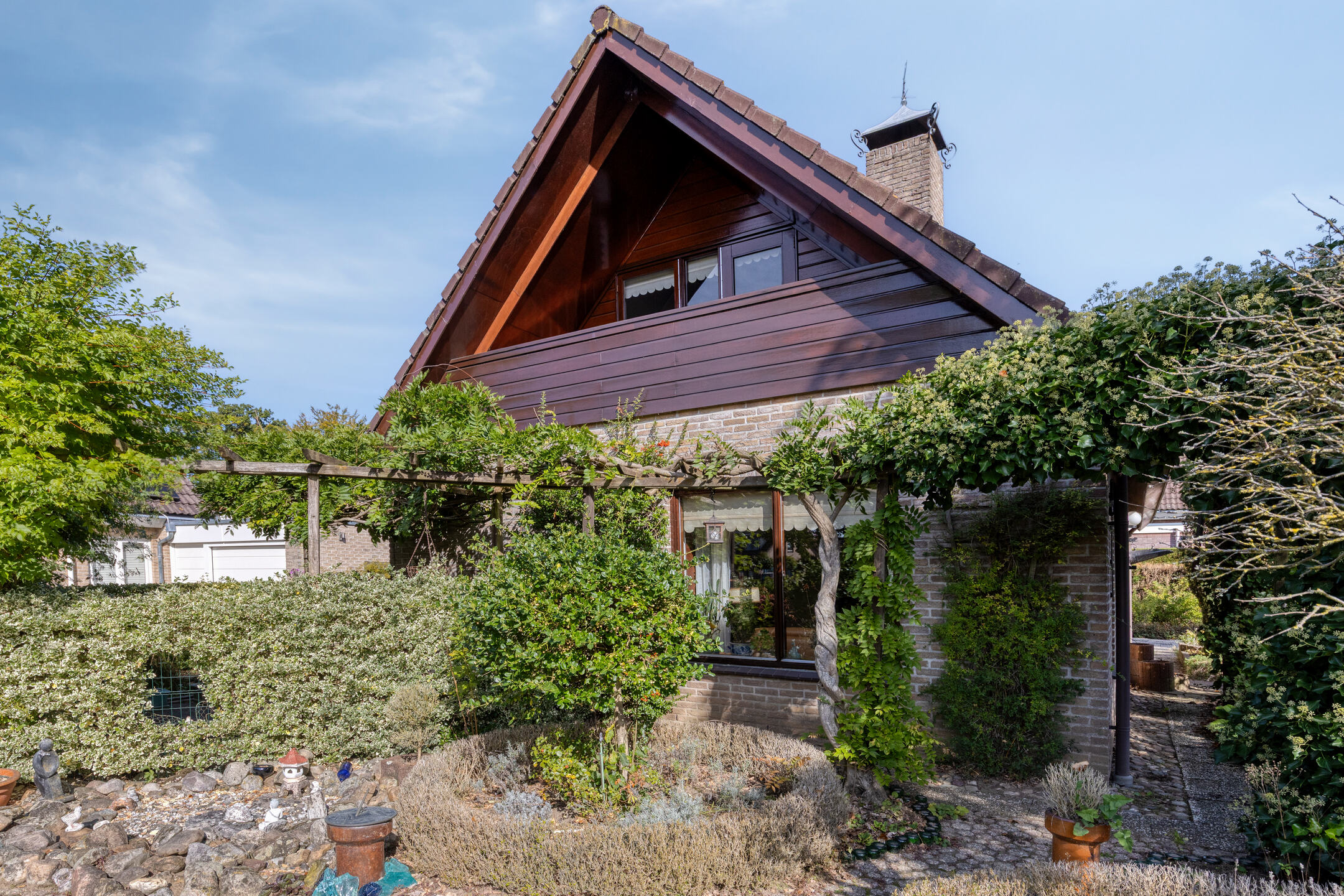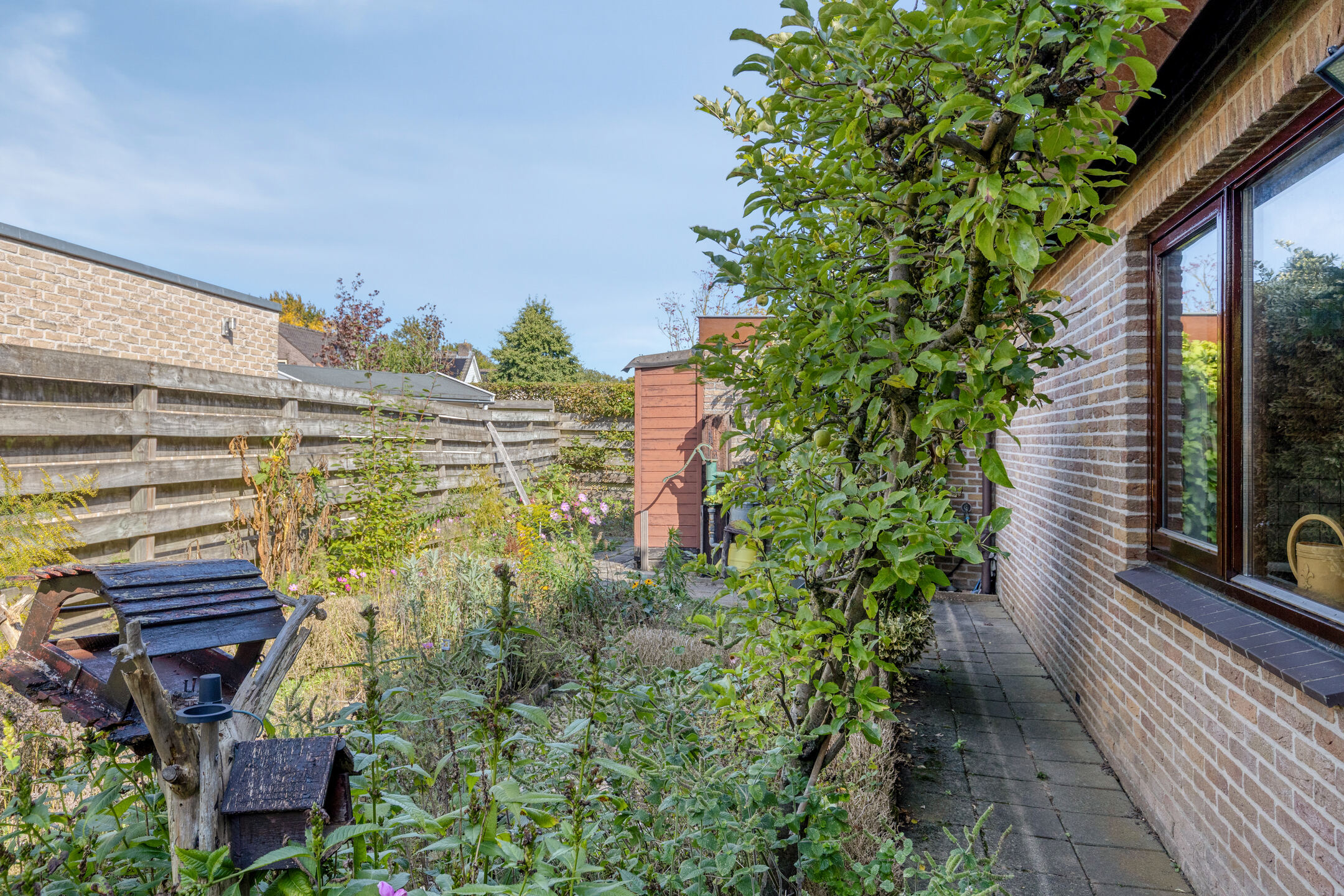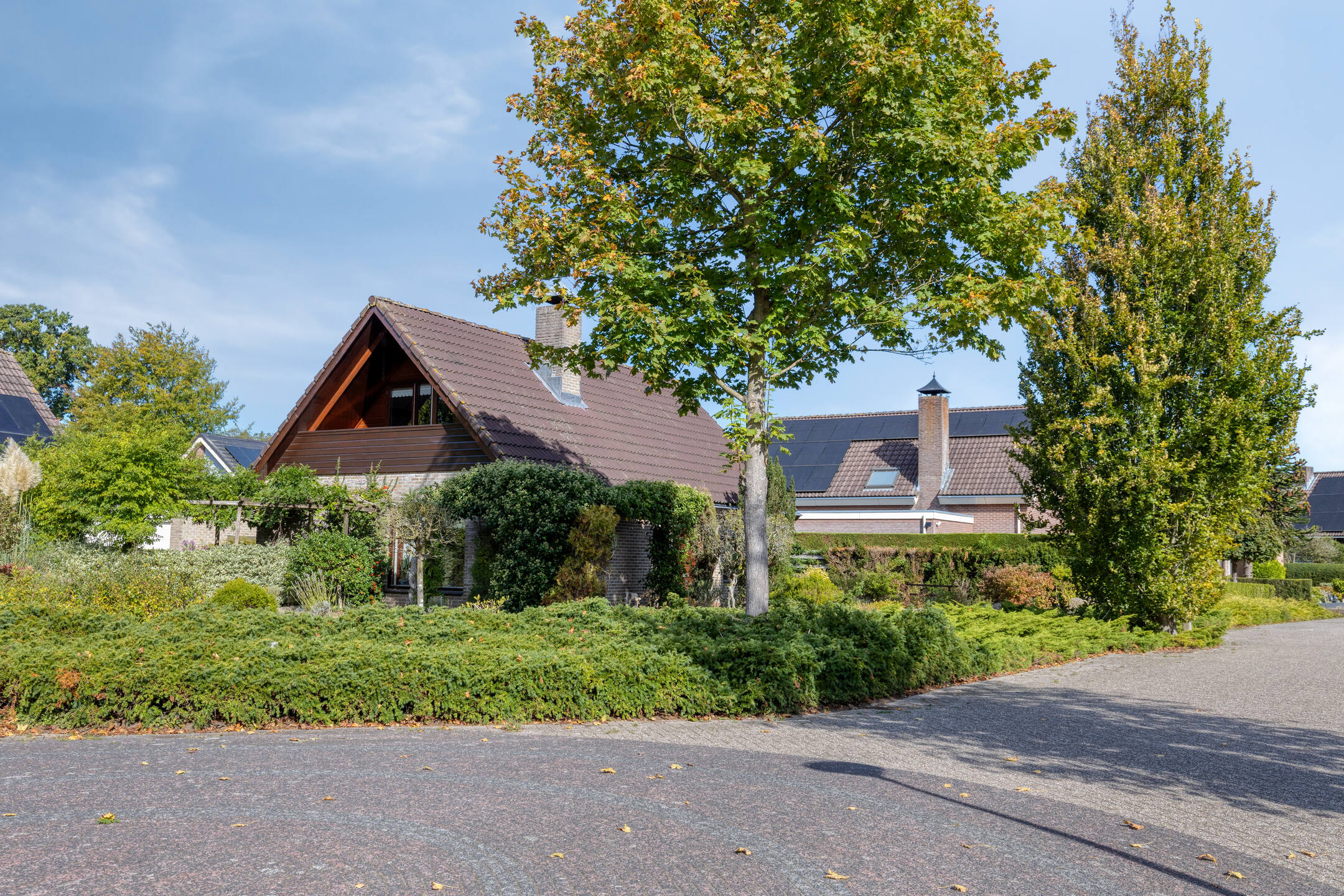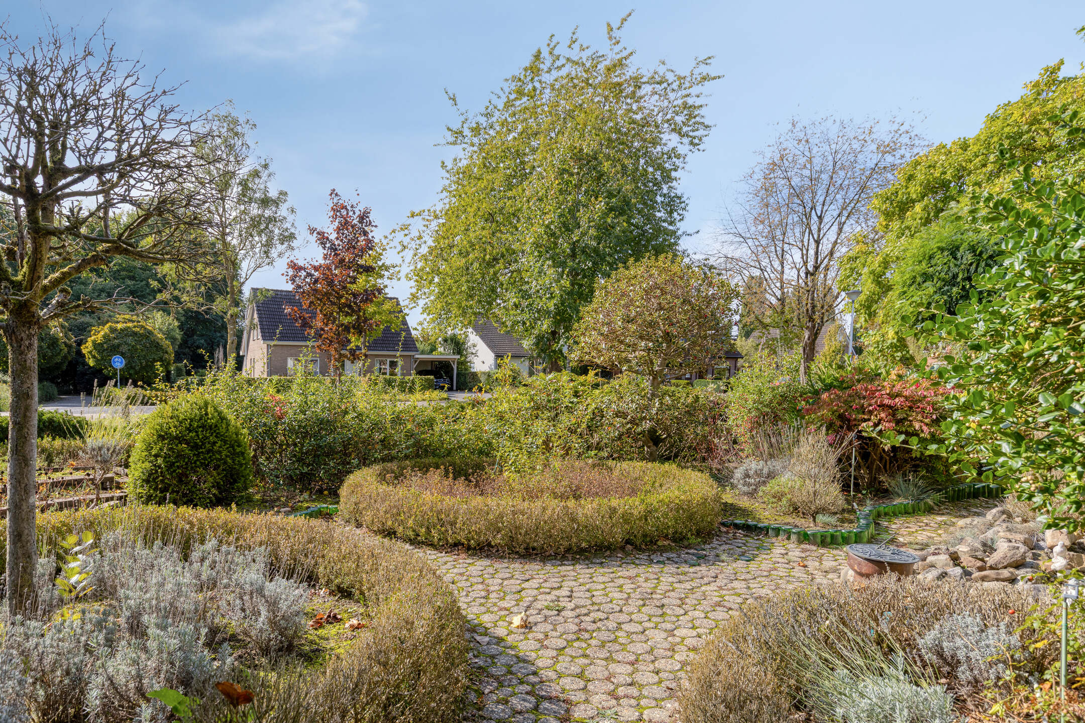 De woning biedt een riante tuin rondom met fraai aangelegde borders, sierbestrating, zitjes en een oprit voor de garage met parkeerruimte voor twee personenauto’s op eigen terrein.