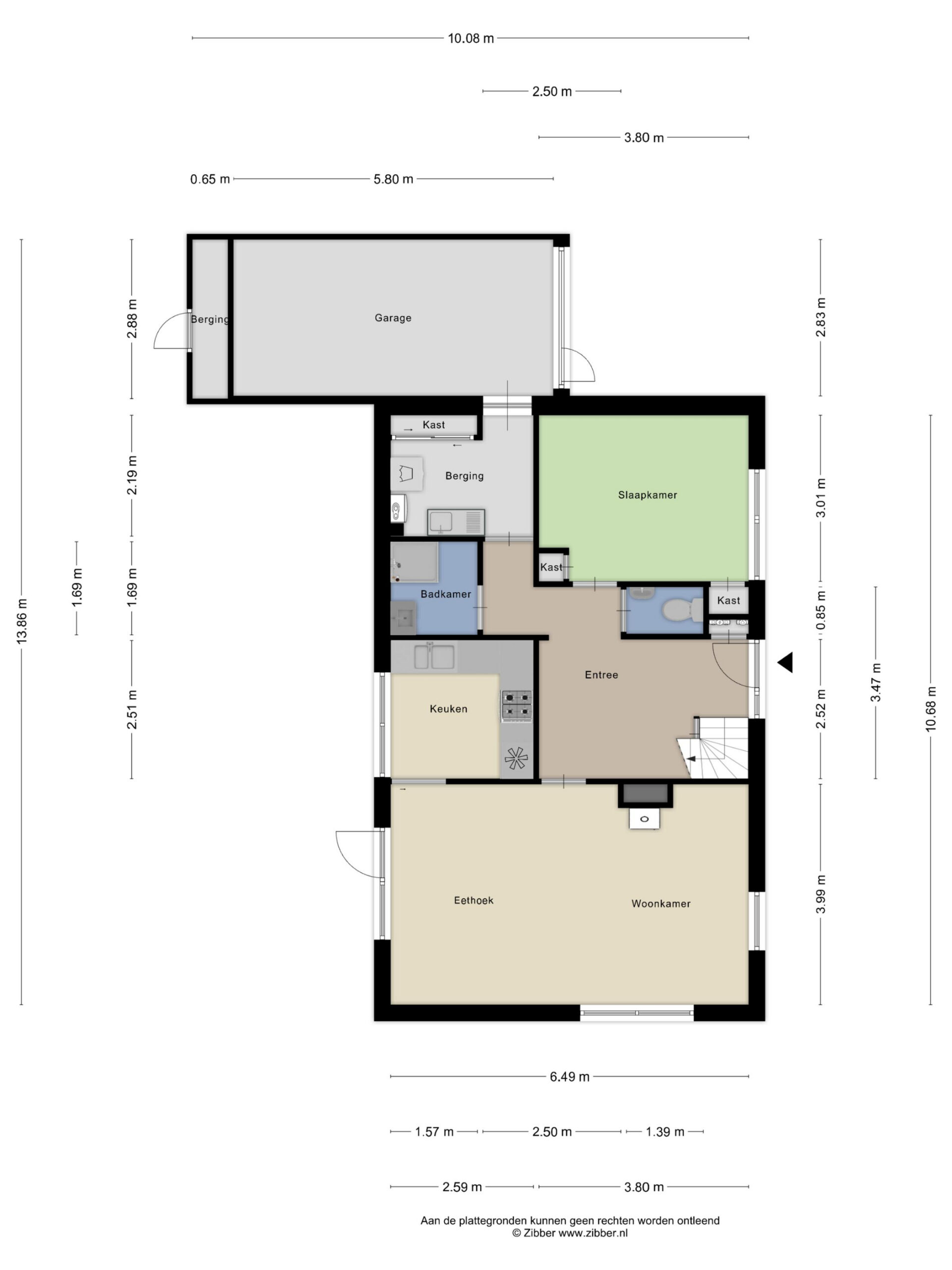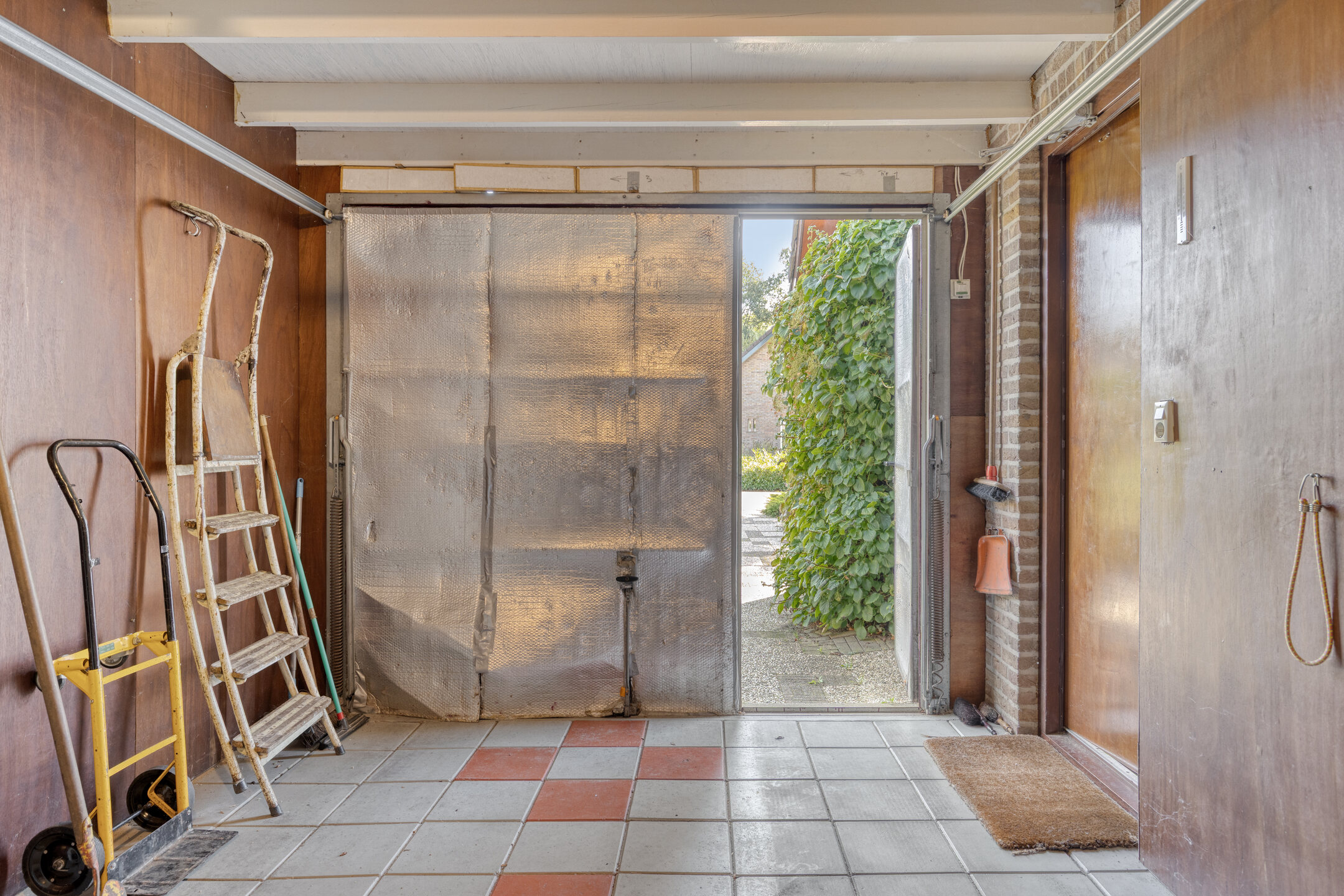 Begane grond: entree, ruime hal met trapopgang naar de 1e verdieping, meterkast en (gasten) toilet met fonteintje. Woonkamer met zithoek voorzien van gashaard en tuindeur bij de eethoek. Dichte keuken voorzien van oven, 5-pits gaskookplaat, afzuigkap en koel-/vriescombinatie. Slaapkamer ter grootte van circa 11 m², voorzien van vaste kast. Compacte badkamer met wastafelmeubel en douche. Bijkeuken met pantry, wasmachine-aansluiting, verwarmingsopstelling, vaste kast en toegang tot de aangebouwde garage (van circa 16 m²).