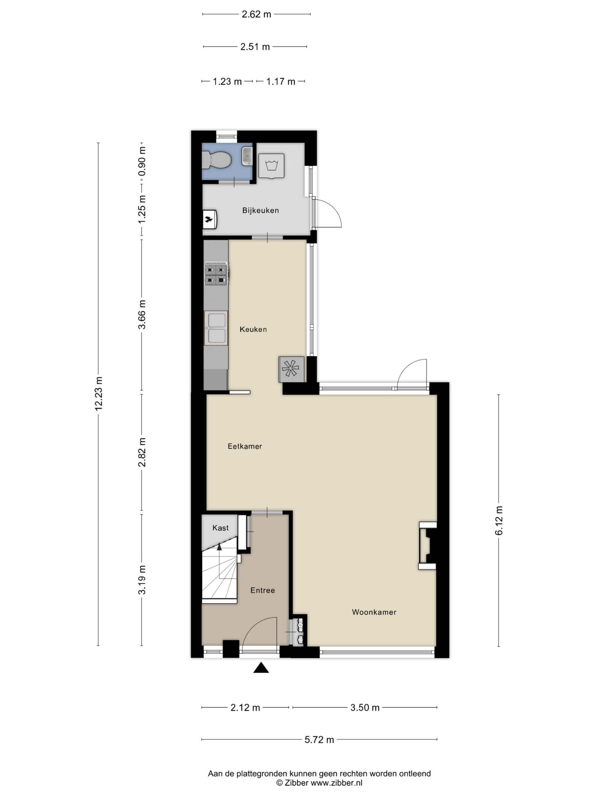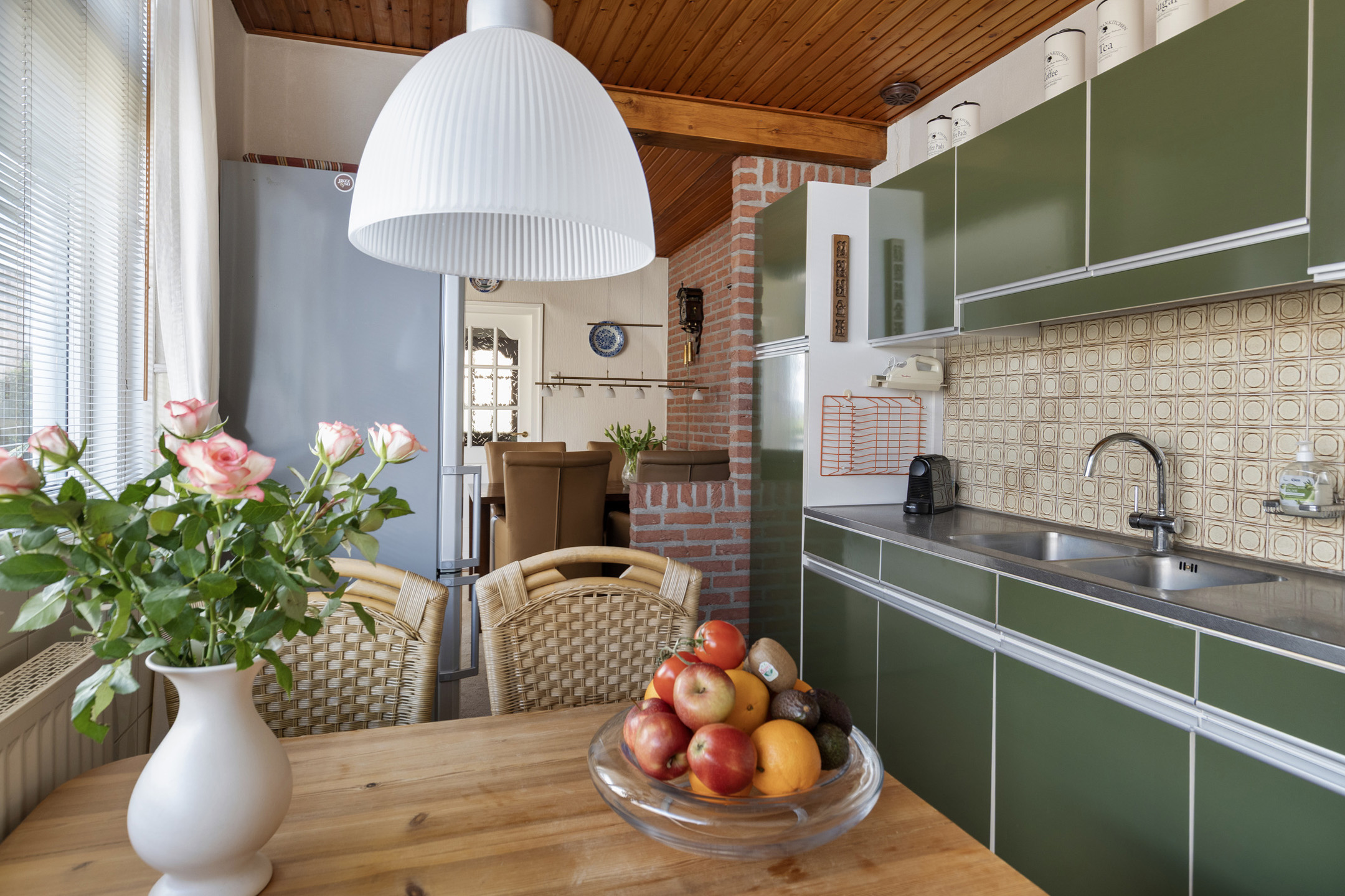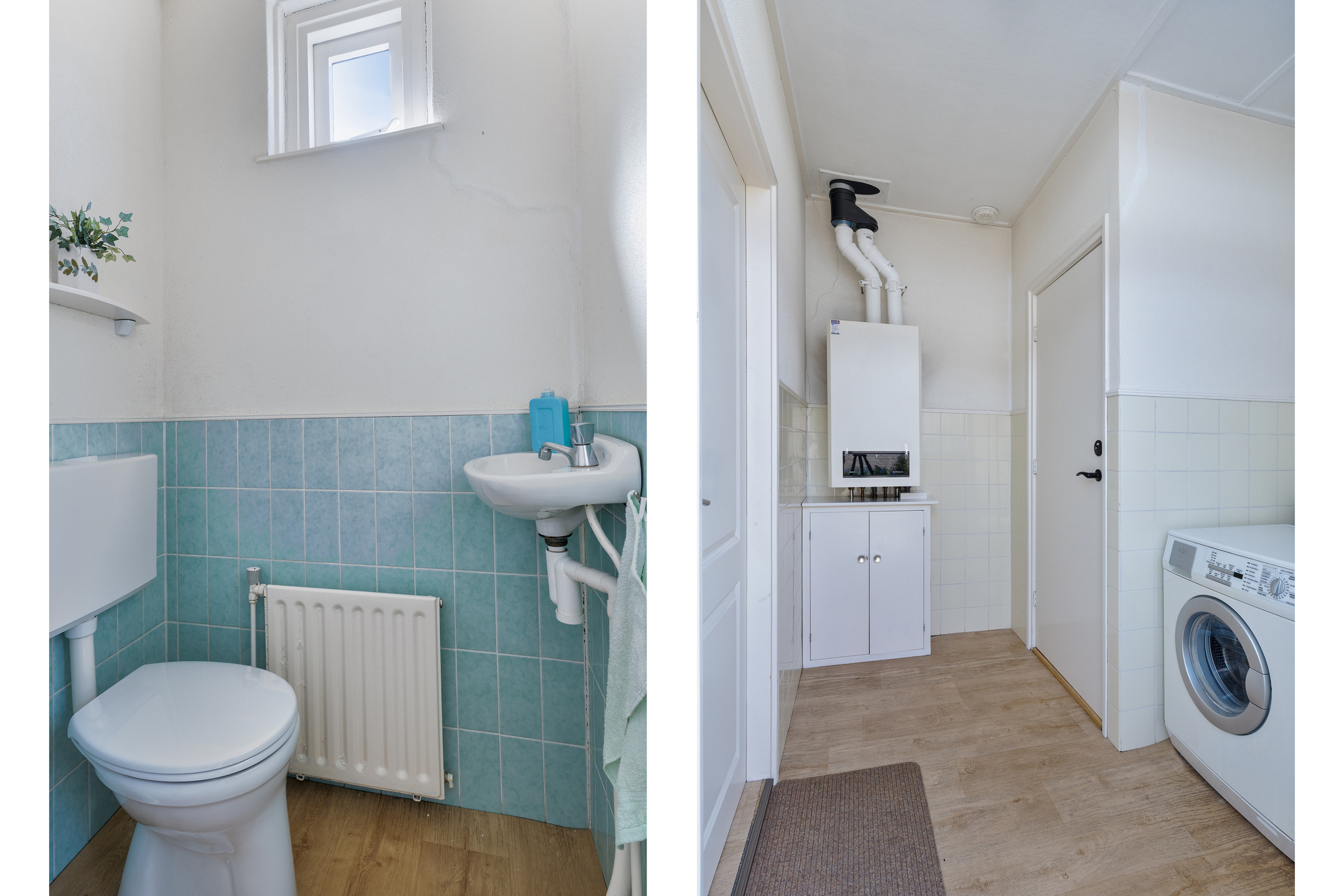 Begane grond: entree, hal met meterkast, trapopgang naar de 1e verdieping en kelderkast. Doorzonwoonkamer met eethoek, voorzien van schouw met gashaard en deur naar de tuin. Half open keuken in de aanbouw, voorzien van 4-pits gaskookplaat en afzuigkap. Bijkeuken met wasmachine-aansluiting, cv-opstelplaats en tuindeur. Toilet voorzien van fonteintje.