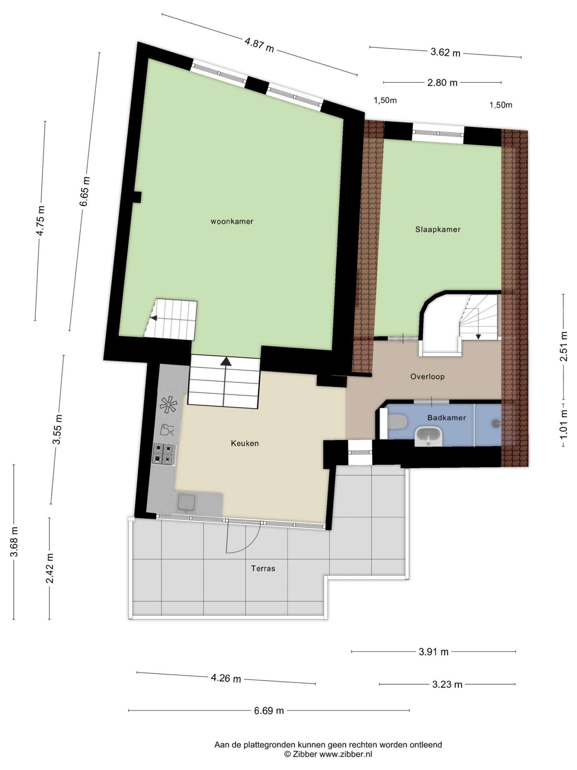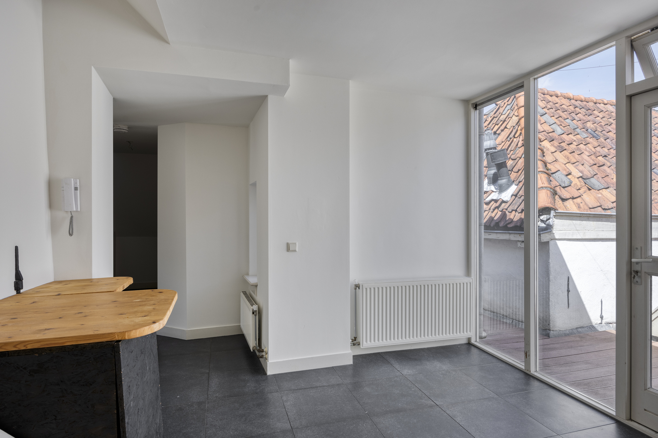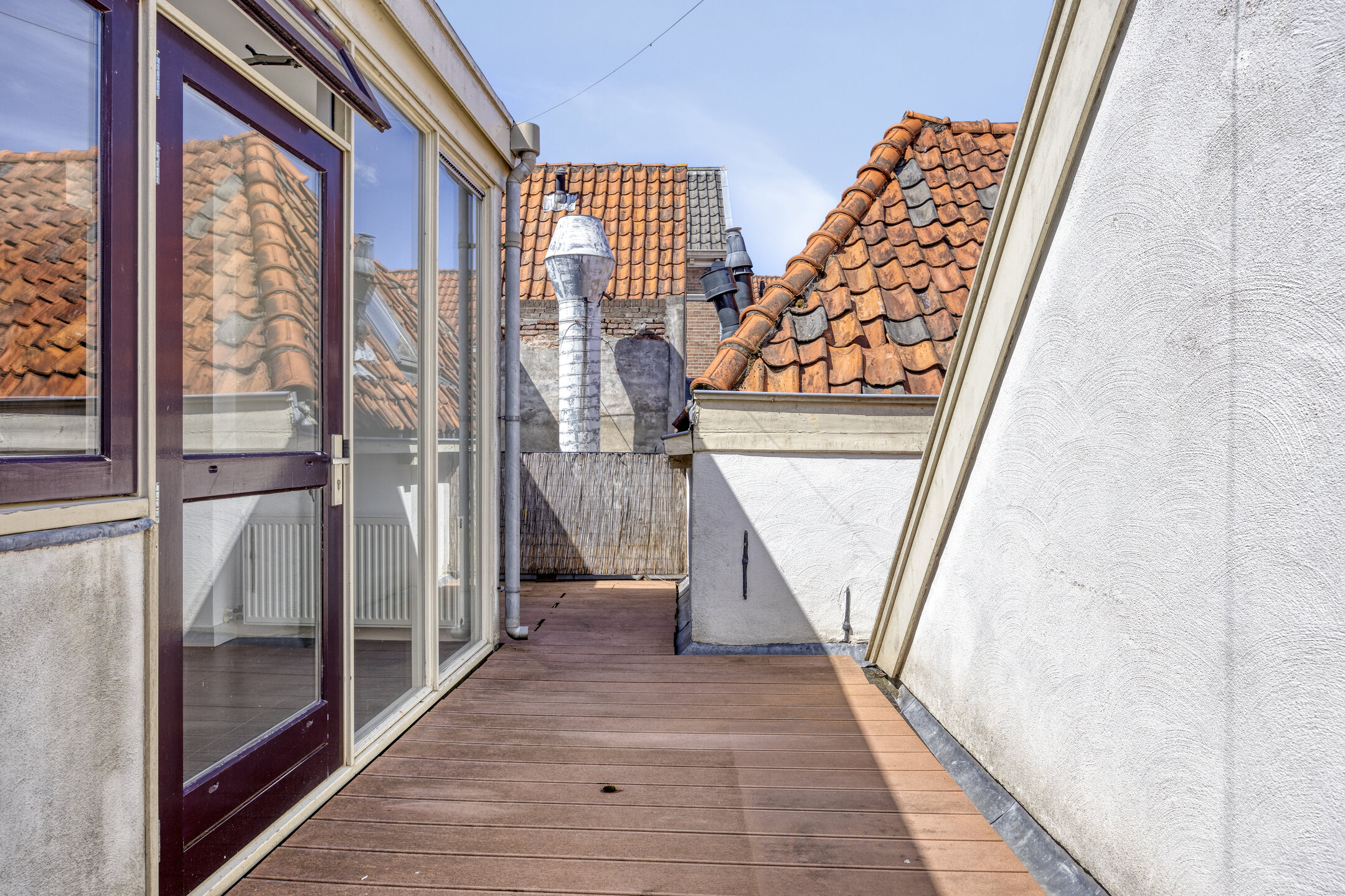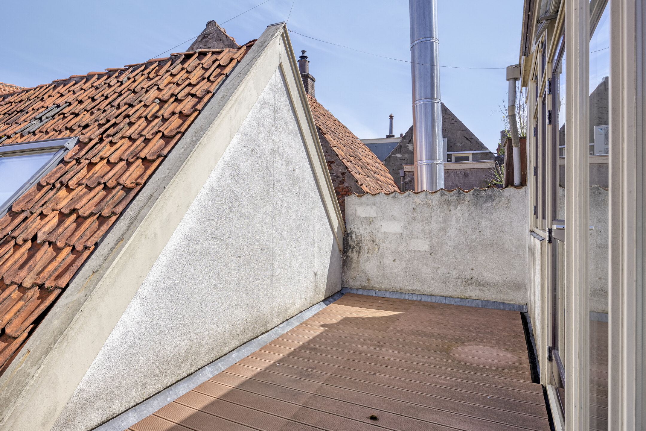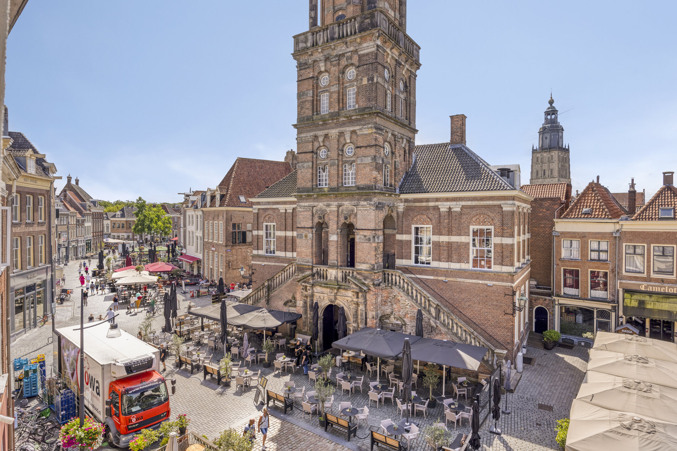 1e (Woon)verdieping: overloop met doorloop naar de half open keuken, voorzien van 4-pits gaskookplaat, afzuigkap, vaatwasser, koelakst, oven en (ontbijt)barretje. Vanuit de keuken is tevens het dakterras te bereiken welke leuk verscholen licht tussen de oude gevels van de omliggende panden. Ruime woonkamer aan de voorzijde met zicht over de markt. Slaapkamer ter grootte van circa 11,5 m², keurig afgewerkt. Compacte badkamer voorzien van wandcloset, douche en wastafel.
