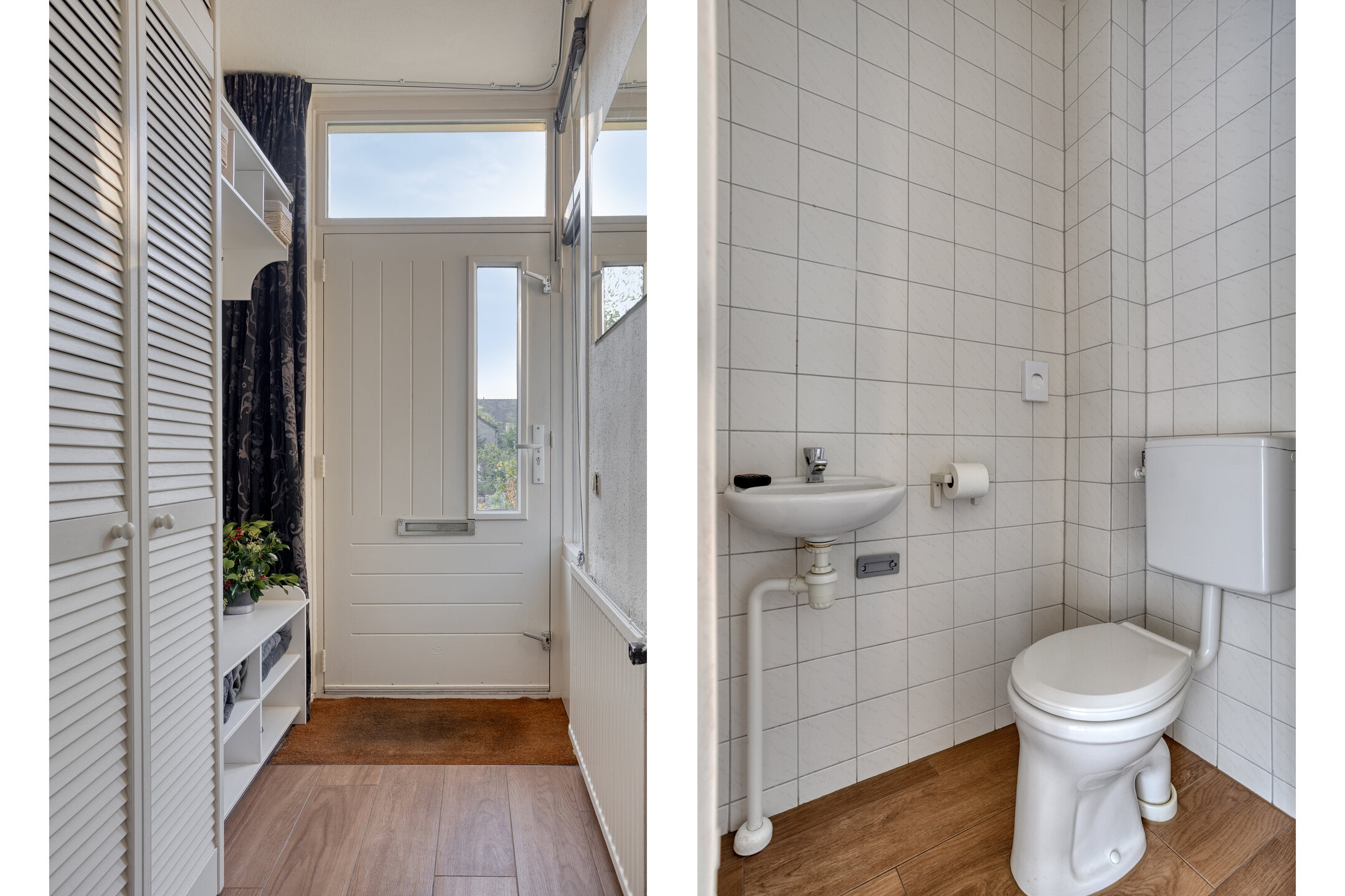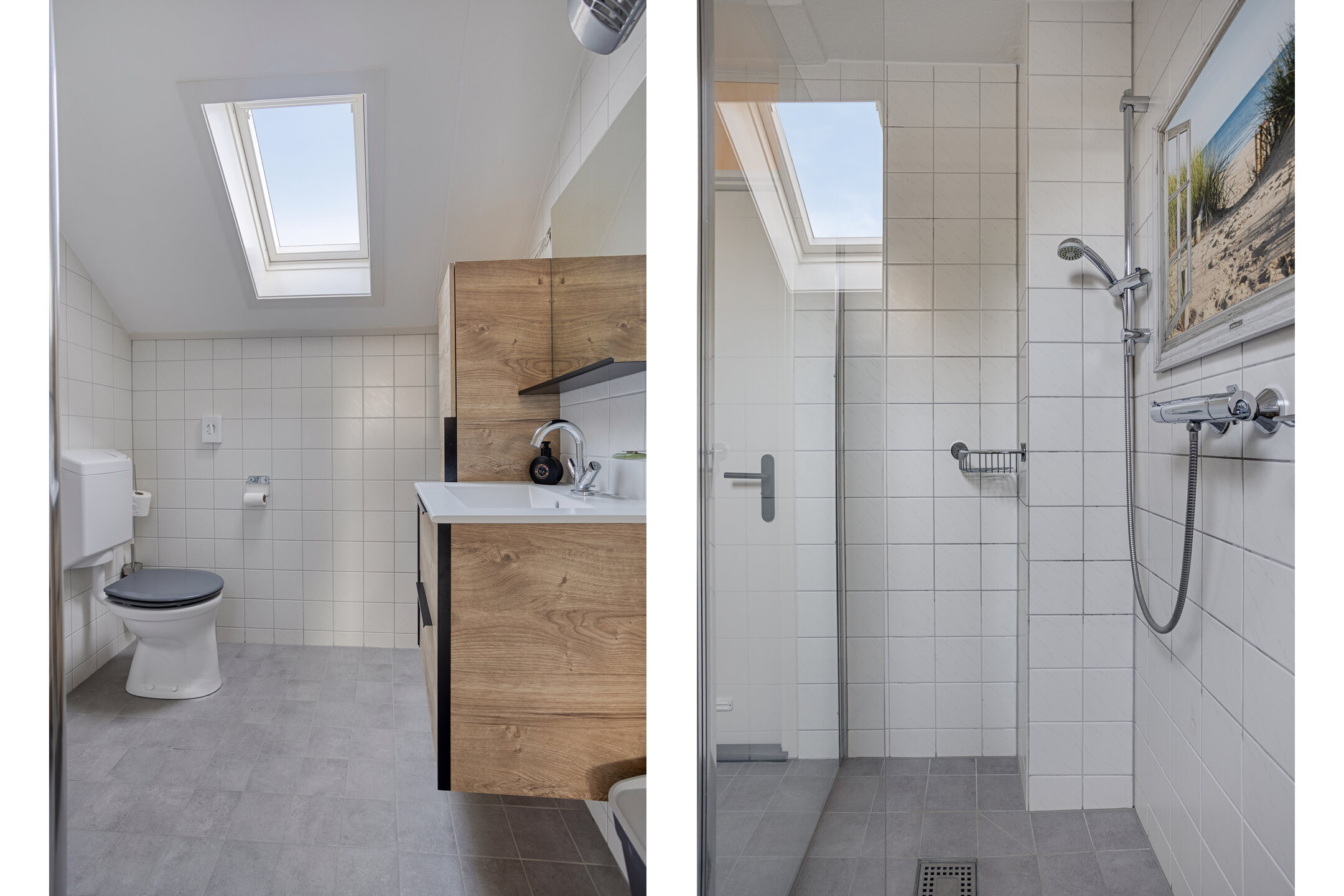 1e Verdieping: ruime overloop met toegang tot drie slaapkamers ter grootte van circa 5,5 m², 12 m² en nogmaals 12 m², allen voorzien van laminaatvloer. Recentelijk deels gerenoveerde badkamer met toilet, douche en wastafelmeubel.