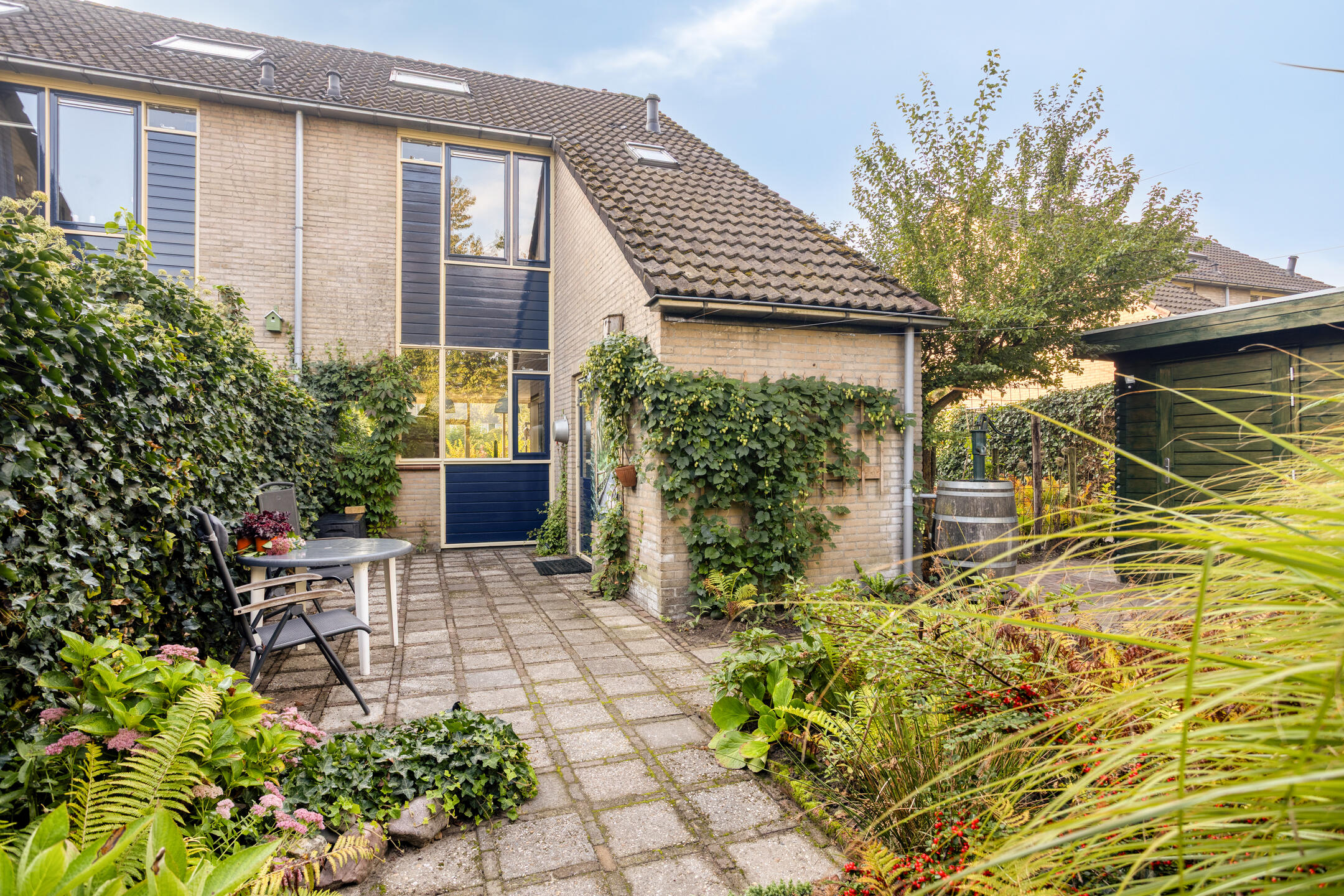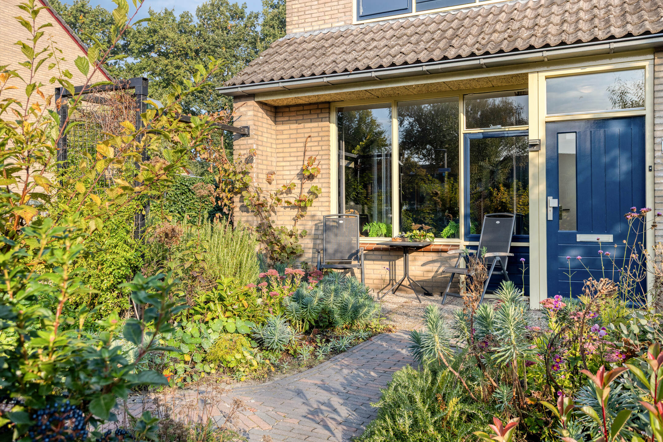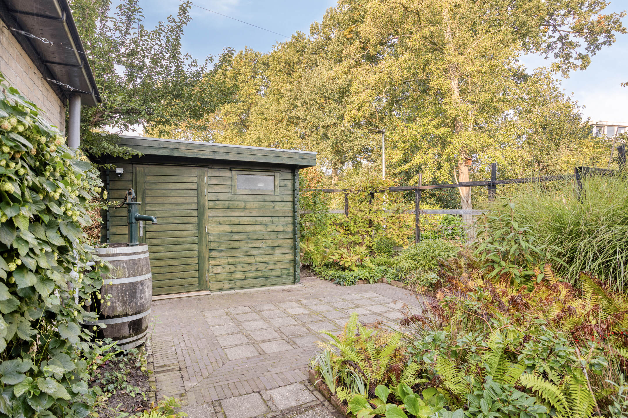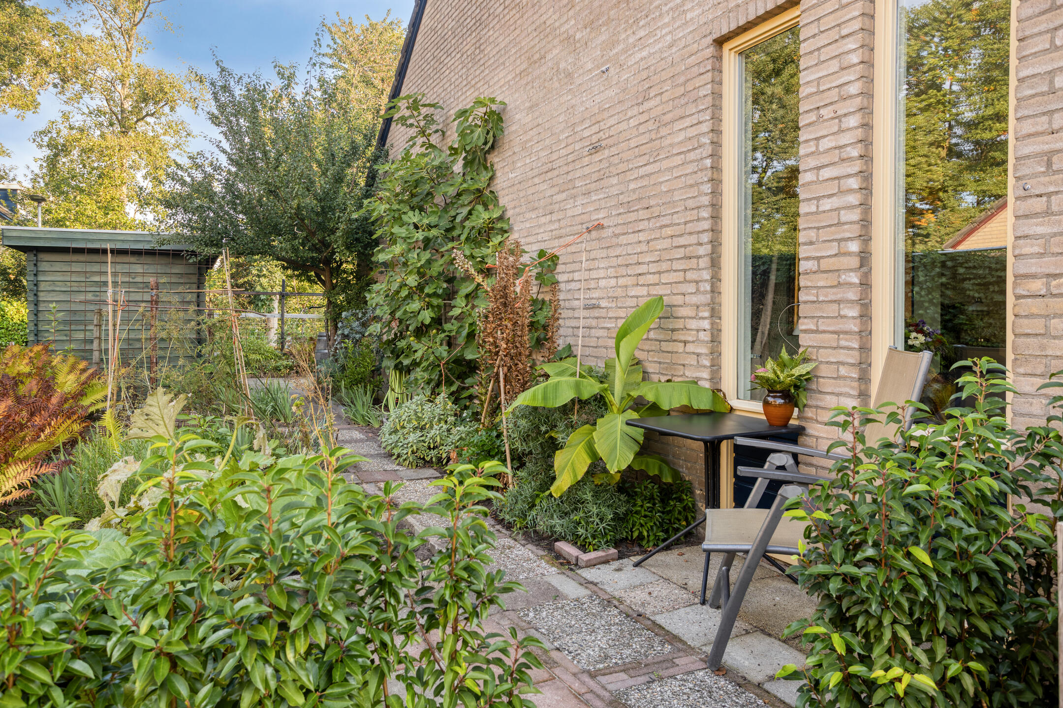Onderhoudsvriendelijke achtertuin op het noorden met terras tegen de achtergevel en veel groen. Ruime zij-tuin gedeeltelijk ingericht als moestuin en een fraai aangelegde voortuin. Eigen oprit voor minimaal twee personenauto’s en een vrijstaande houten berging met elektra.