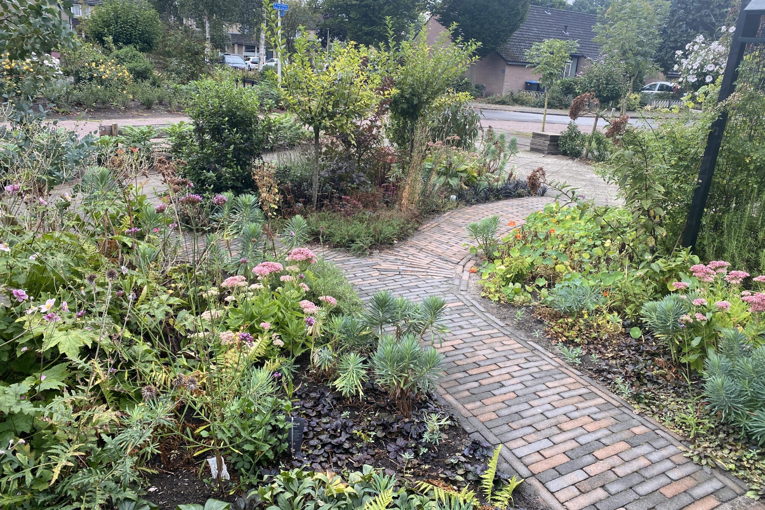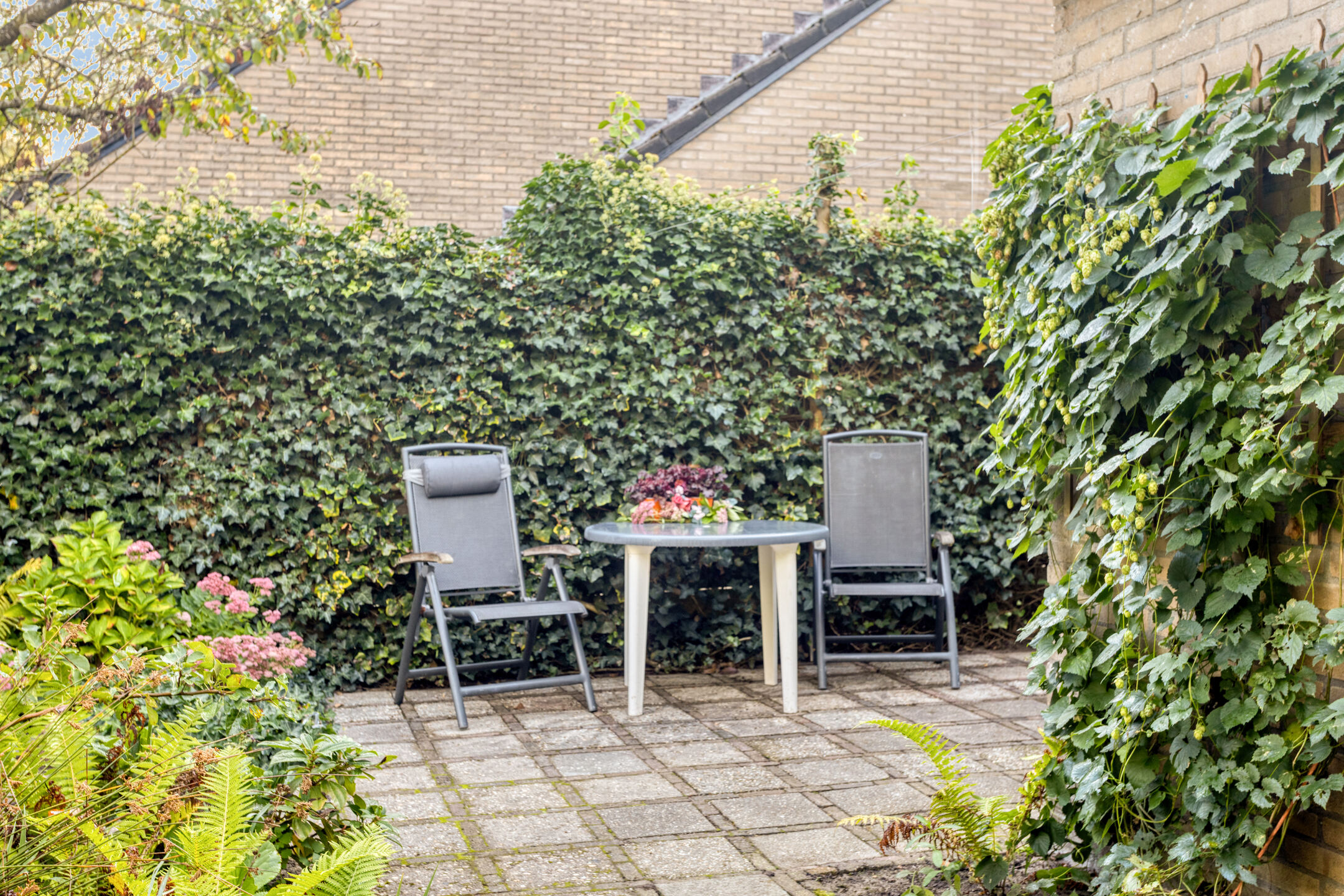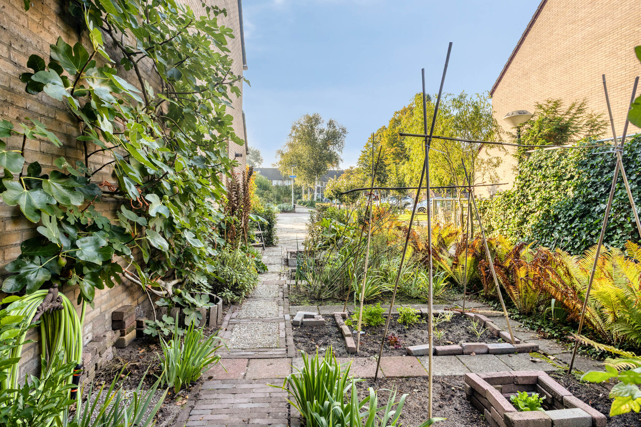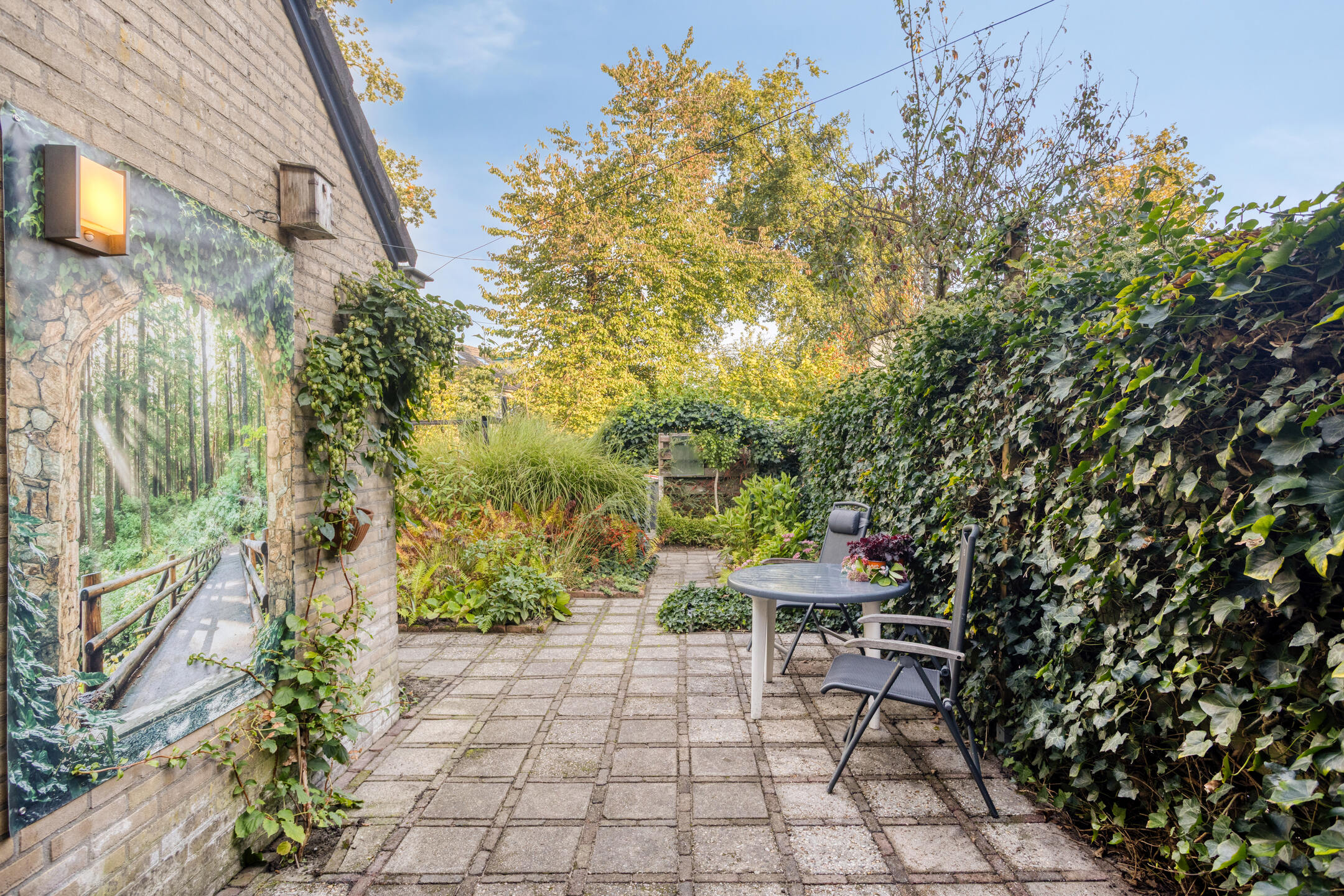 Onderhoudsvriendelijke achtertuin op het noorden met terras tegen de achtergevel en veel groen. Ruime zij-tuin gedeeltelijk ingericht als moestuin en een fraai aangelegde voortuin. Eigen oprit voor minimaal twee personenauto’s en een vrijstaande houten berging met elektra.